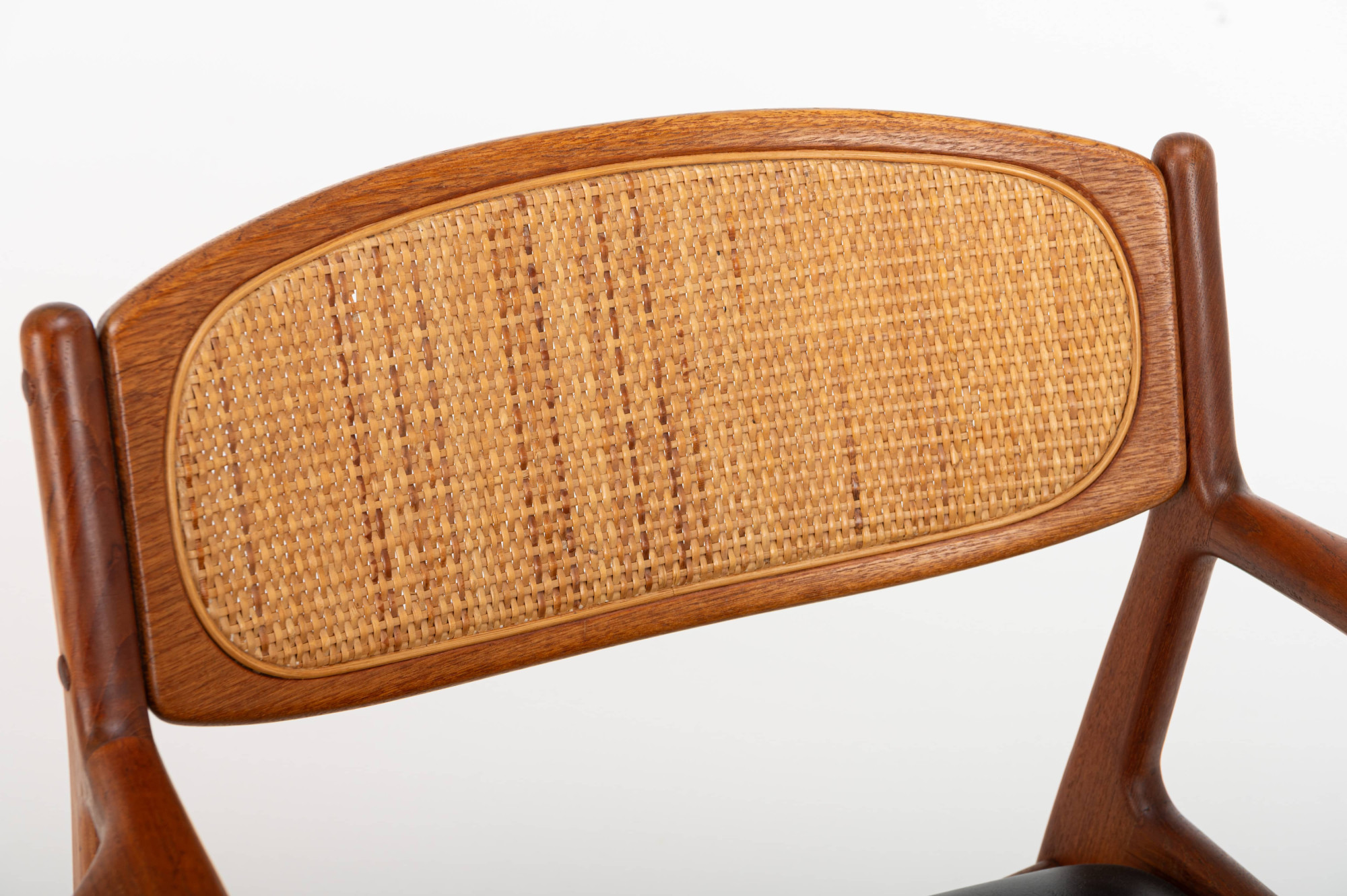 This elegant teak armchair embodies the best of Danish modern design, featuring graceful lines, a beautifully curved frame, and a woven rattan backrest. The seat has its original black leather upholstery, adding a touch of authenticity and vintage character to the piece.