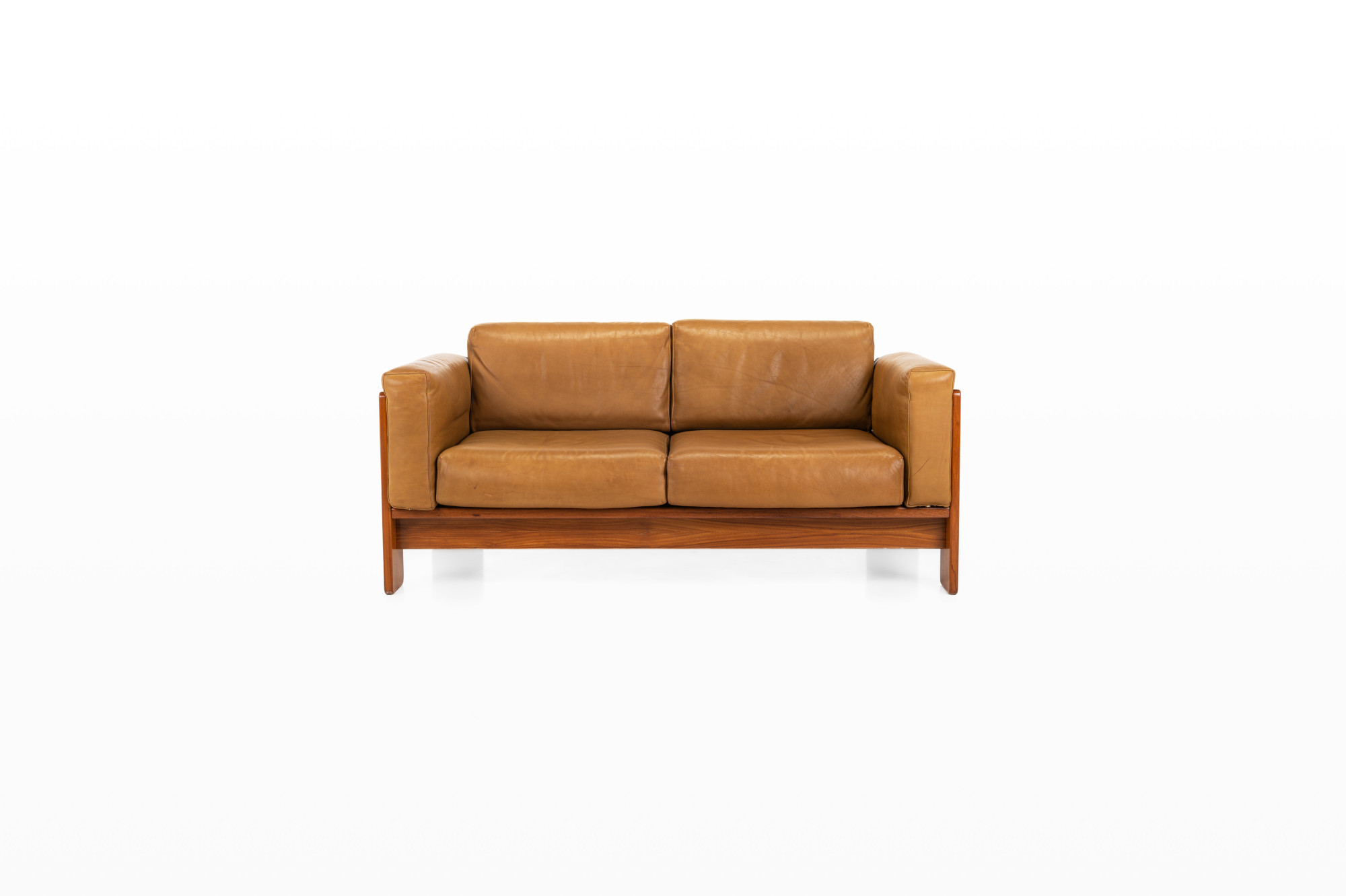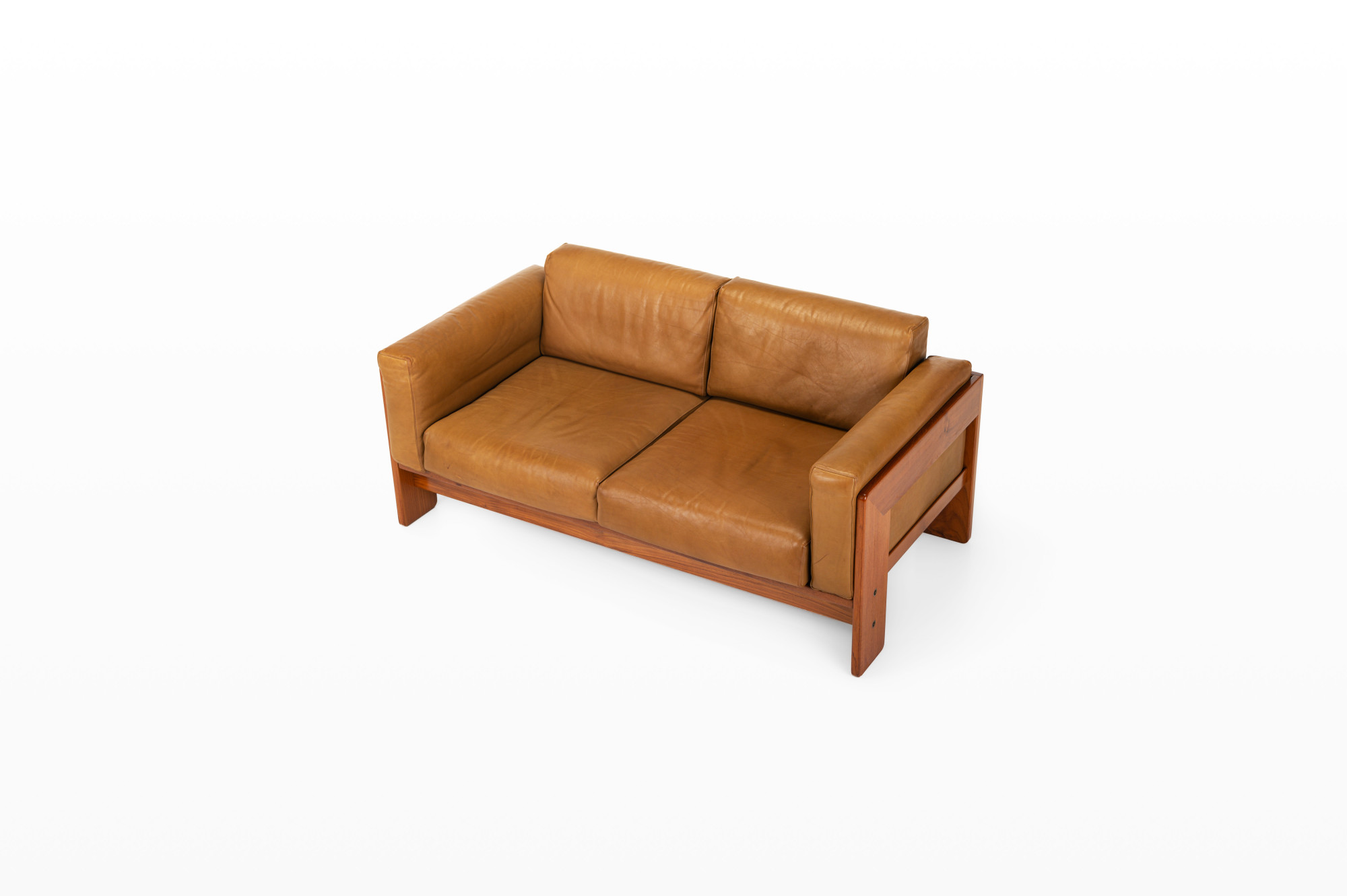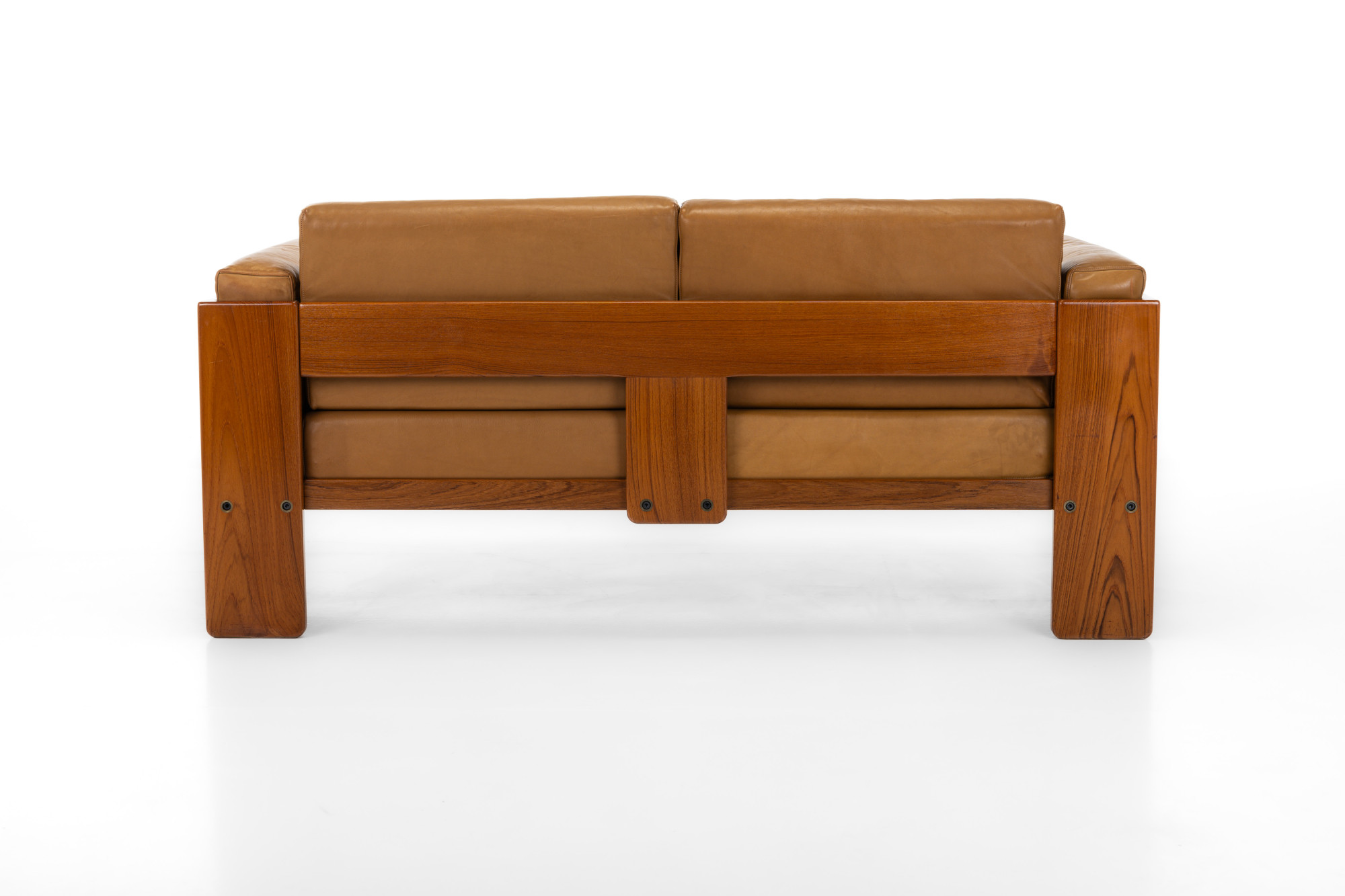 Vintage Bastiano two-seater sofa designed by Tobia and Afra Scarpa for Gavina. This sofa is made of teak wood and cognac brown leather and was produced in Italy in the 1970s. The sofa is still in very nice condition and is marked by the maker.