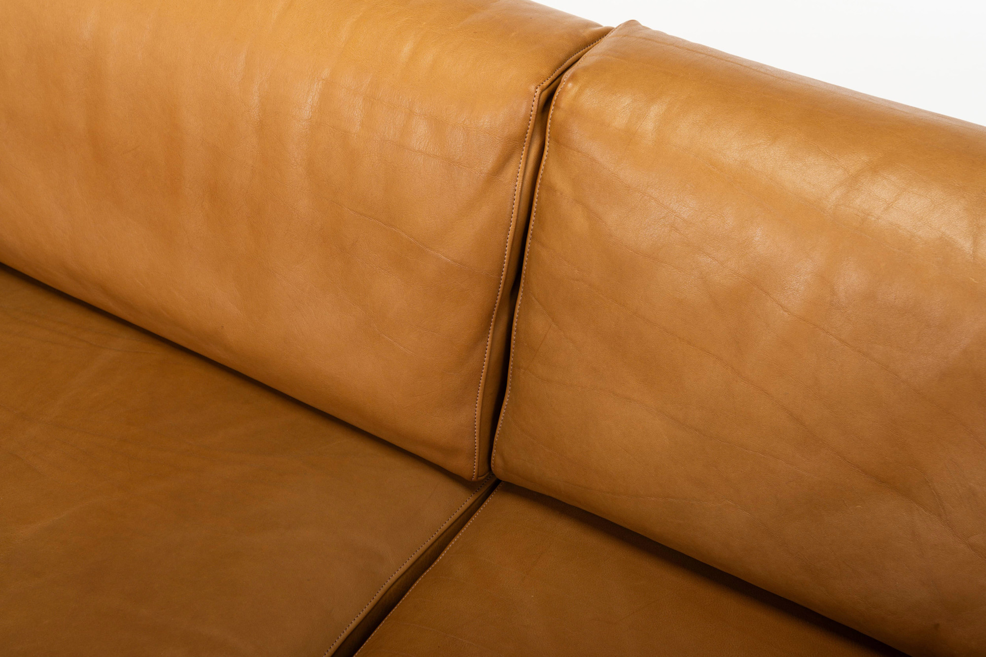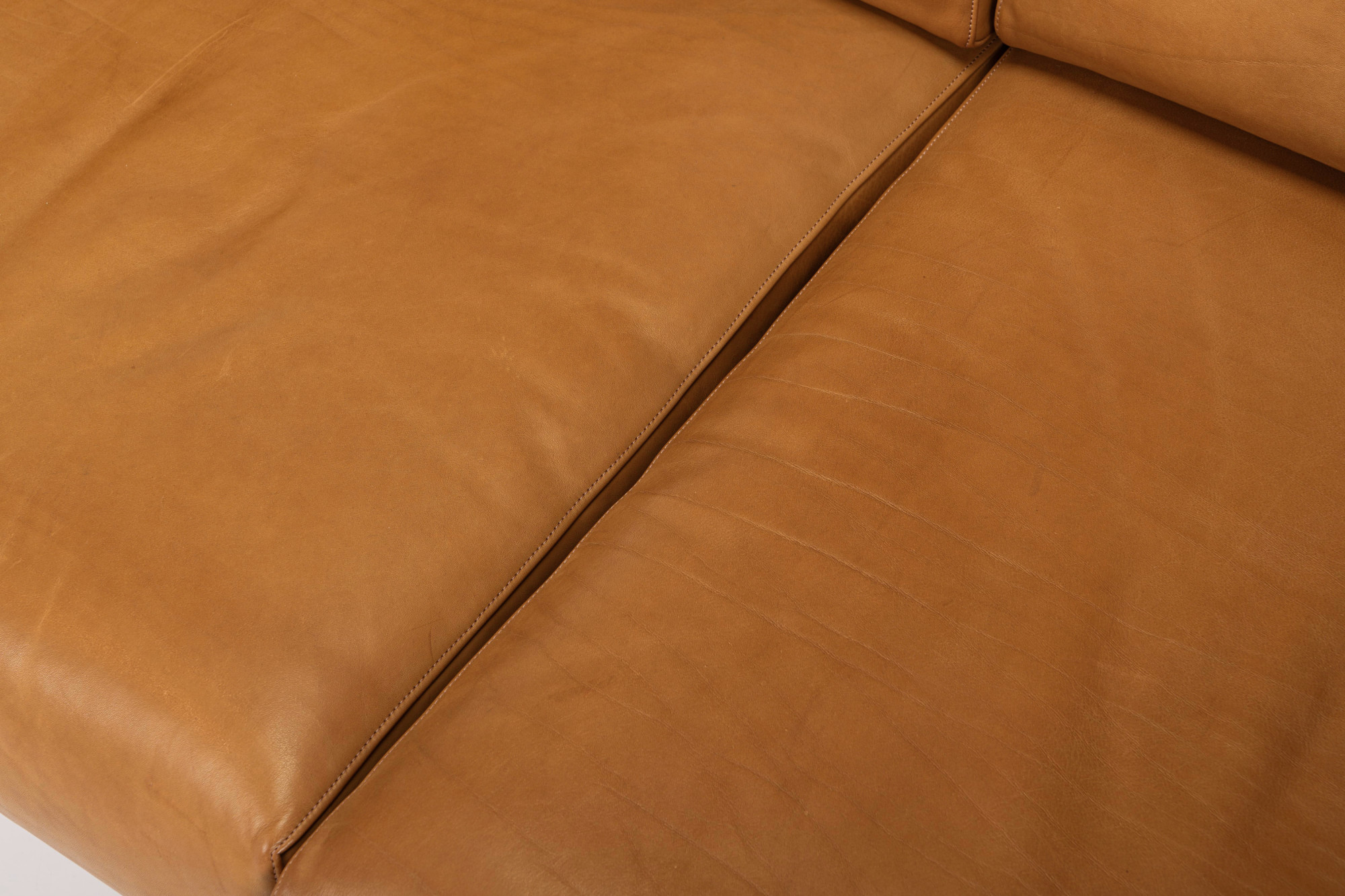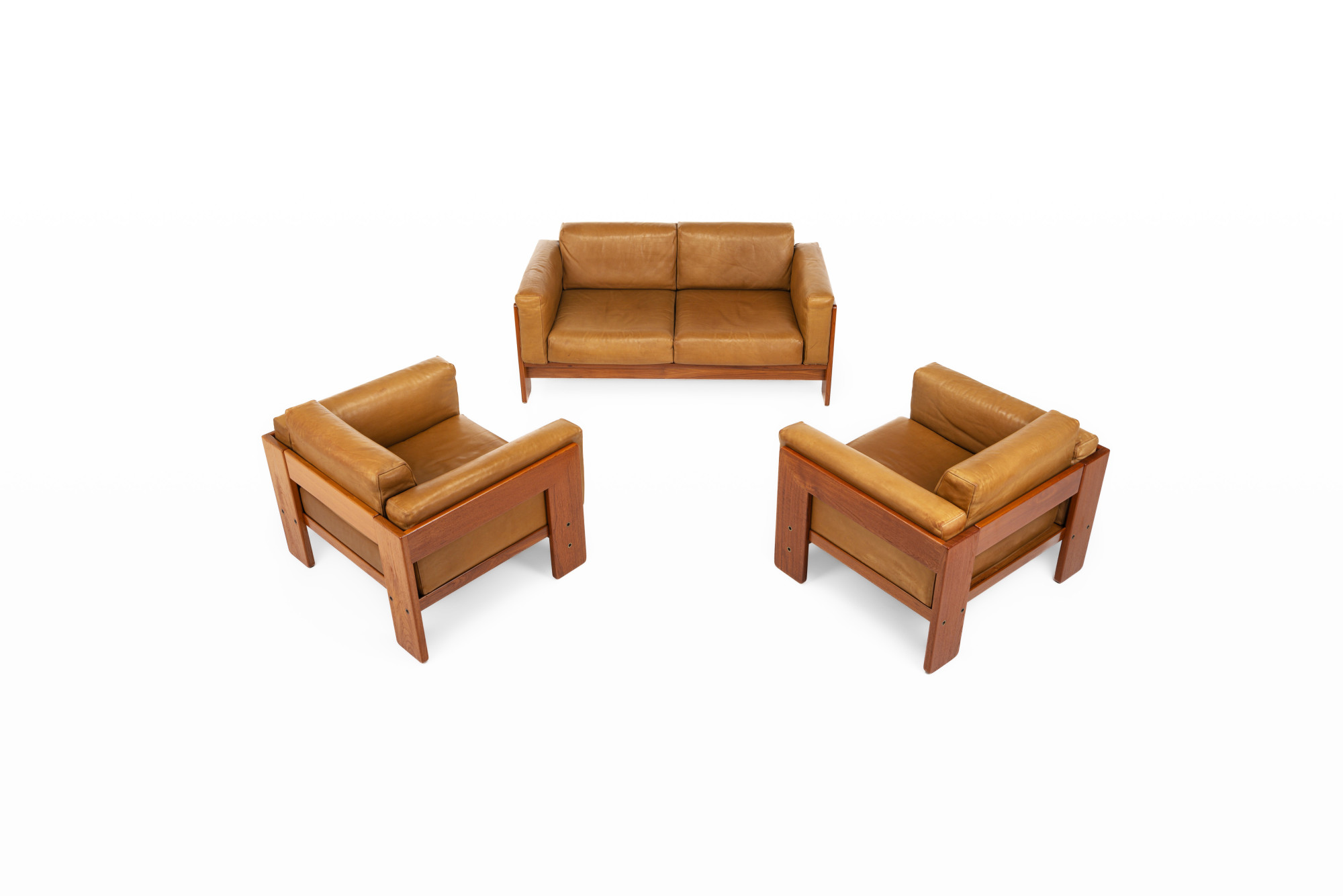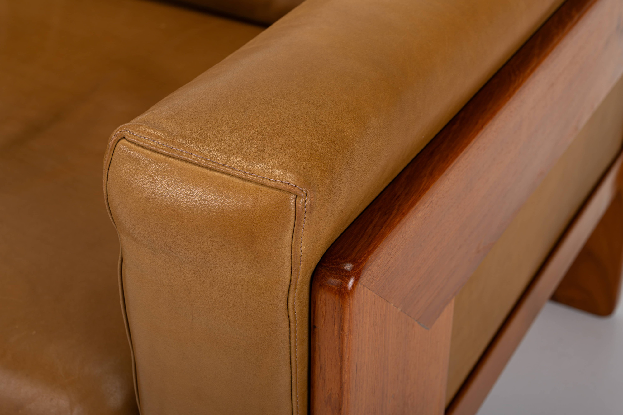 Vintage Bastiano two-seater sofa designed by Tobia and Afra Scarpa for Gavina. This sofa is made of teak wood and cognac brown leather and was produced in Italy in the 1970s. The sofa is still in very nice condition and is marked by the maker.