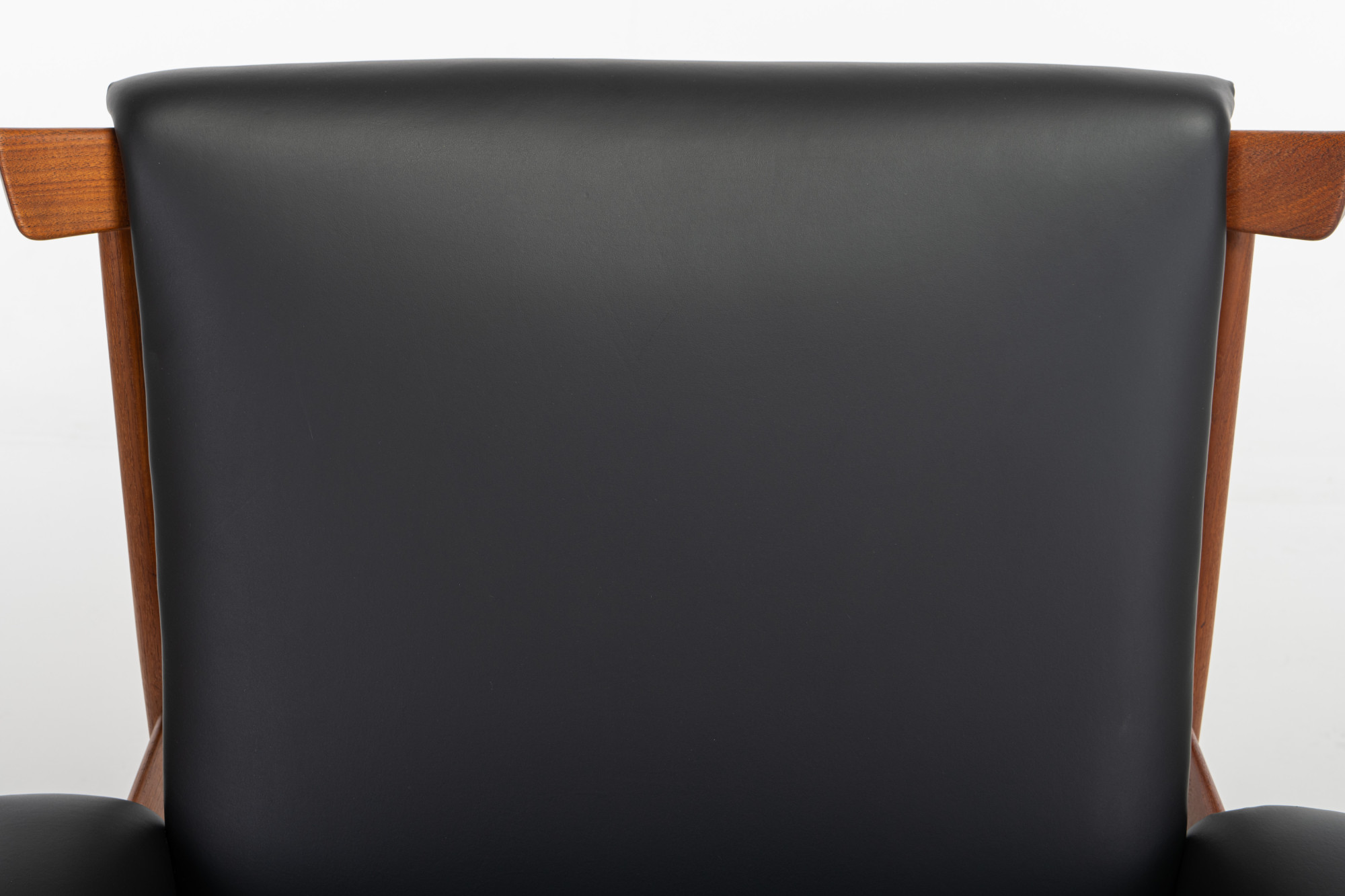 The chair has been completely restored and reupholstered in black leather, making it both comfortable and stylish. It’s a timeless piece that will look great in any living room, office, or lounge.