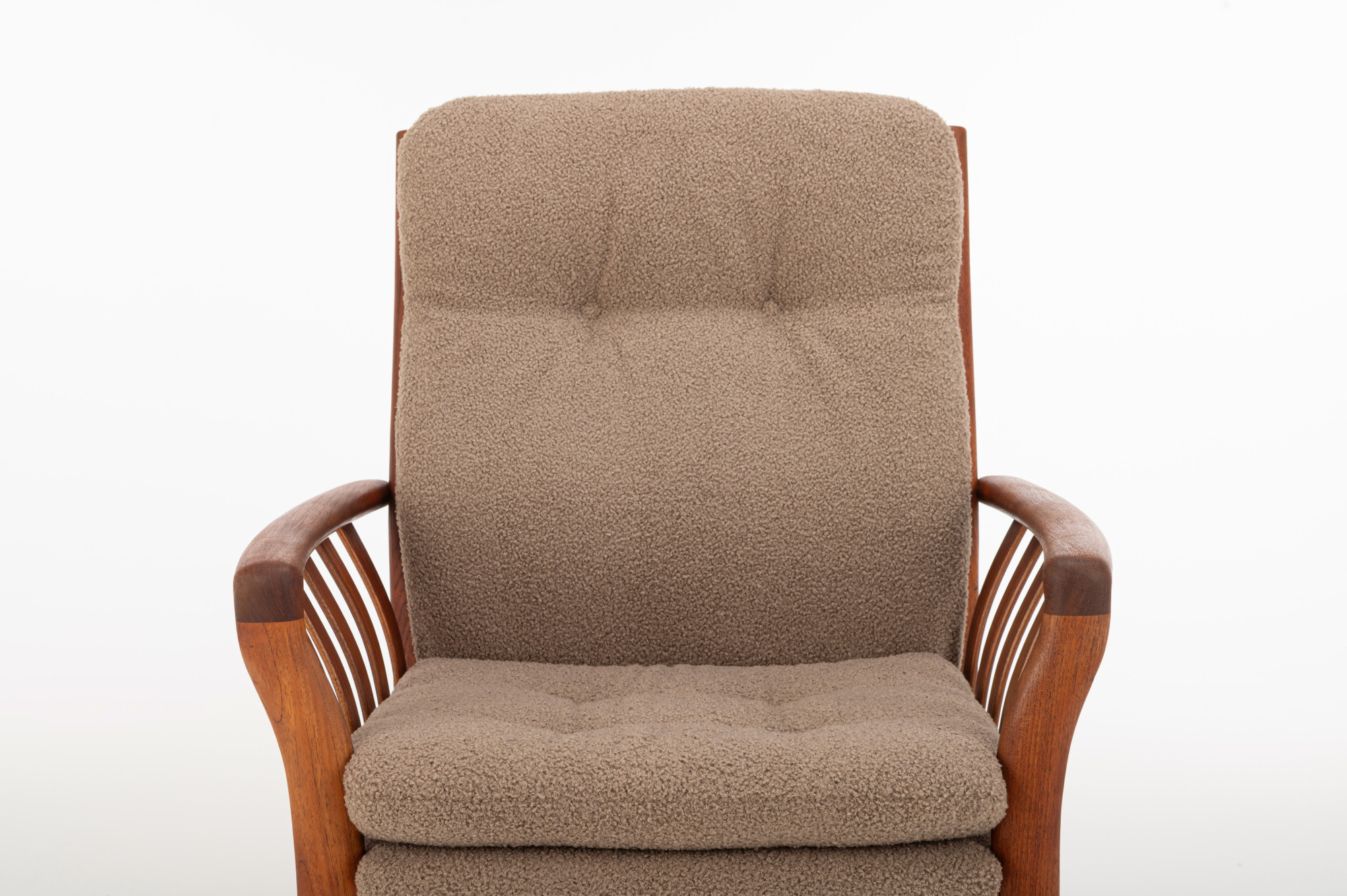 This very comfortable vintage armchair is crafted from teak and is attributed to Schou Andersen. The wood is in excellent condition, and the cushions have been reupholstered in a brown bouclé fabric.