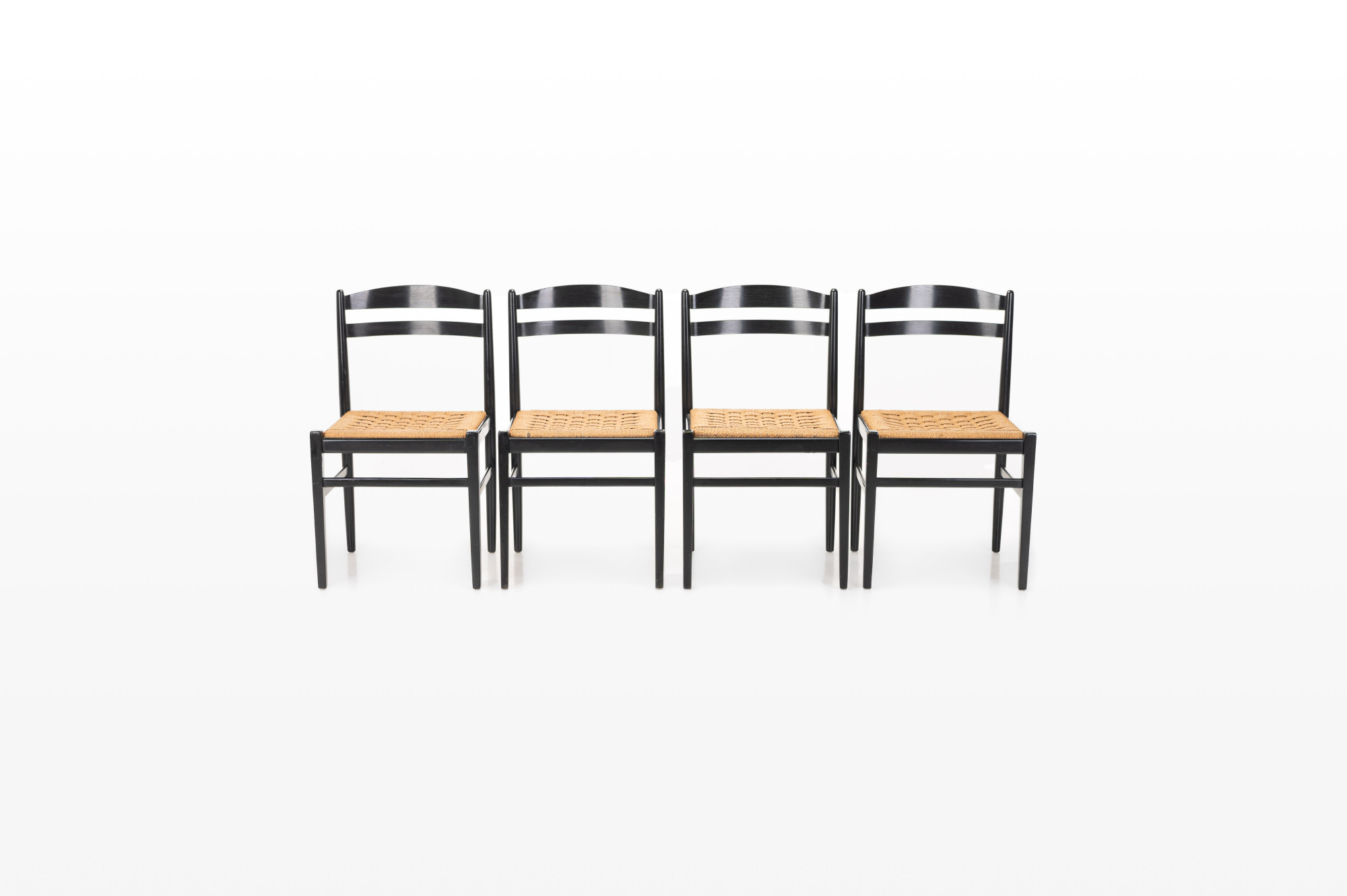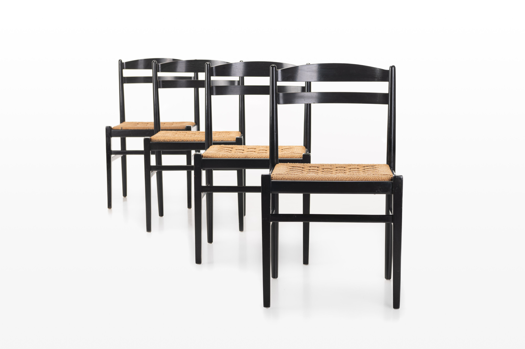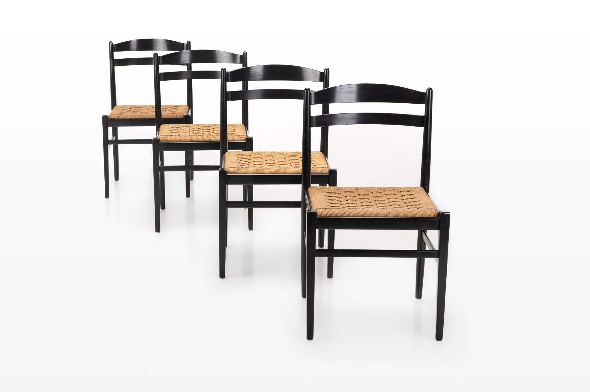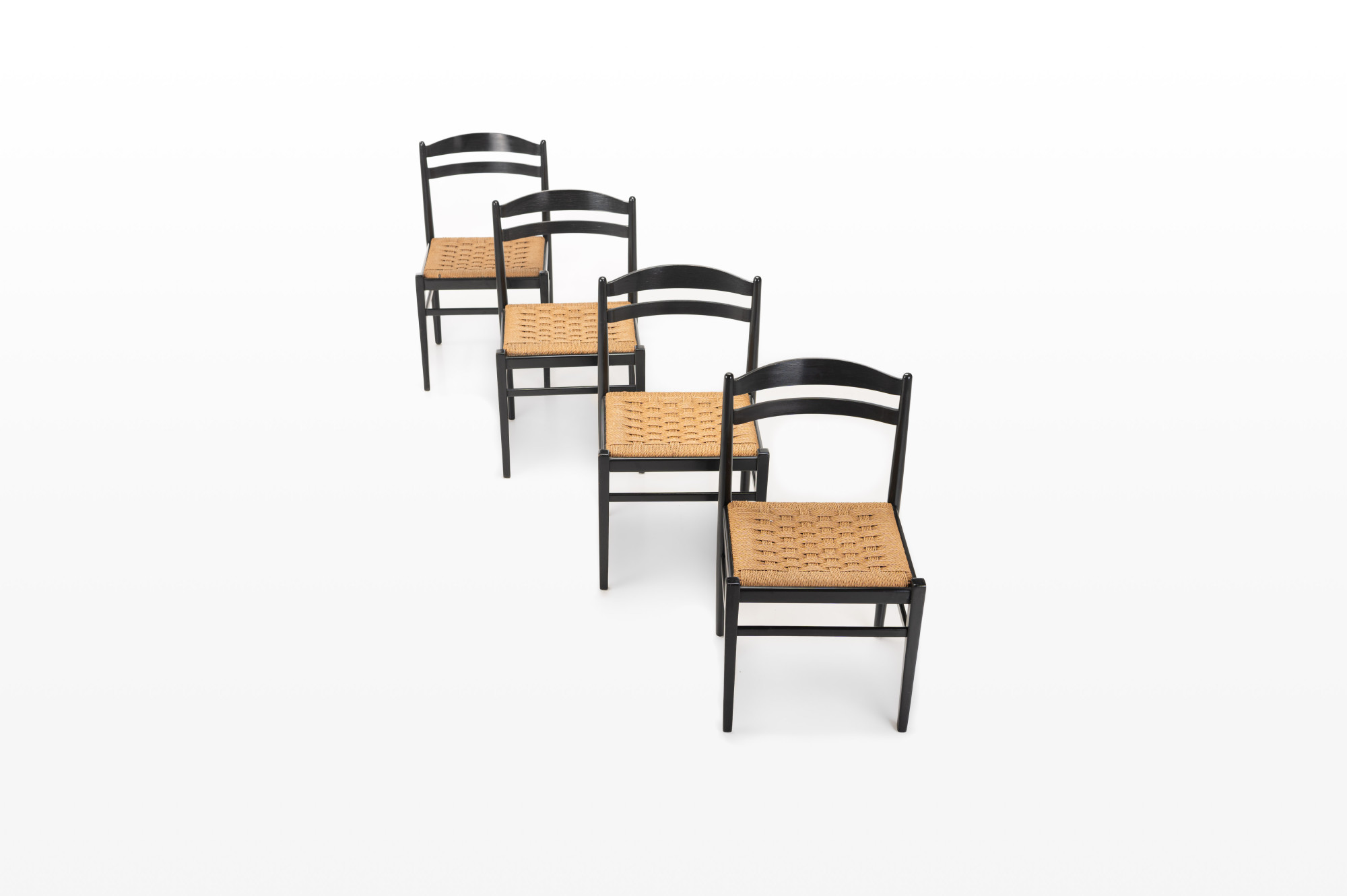 Set of four vintage dining room chairs. The wood is lacquered black and the seats are made with paper cord.