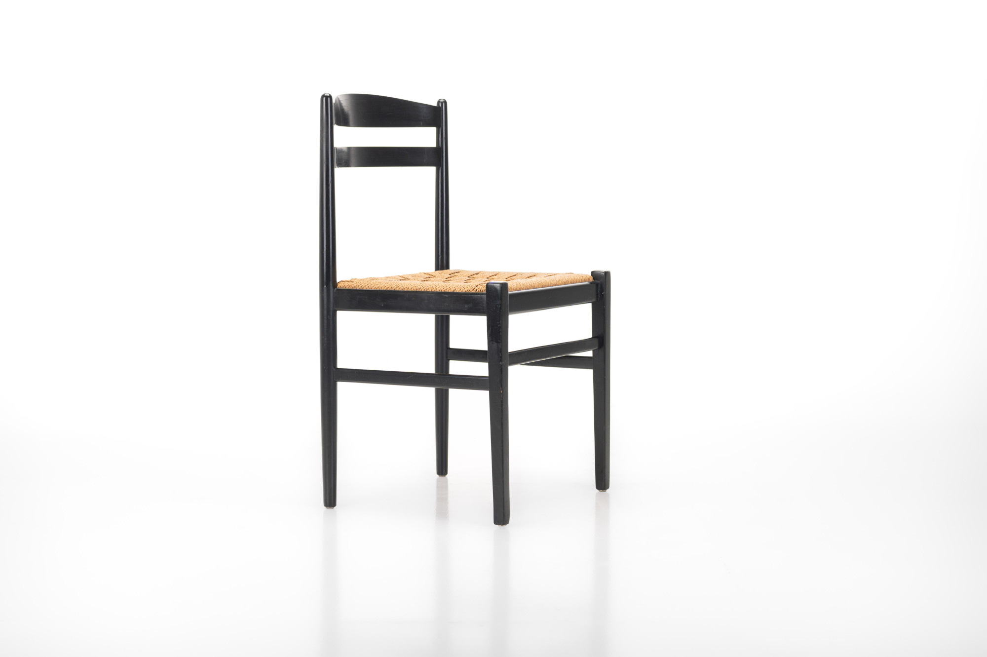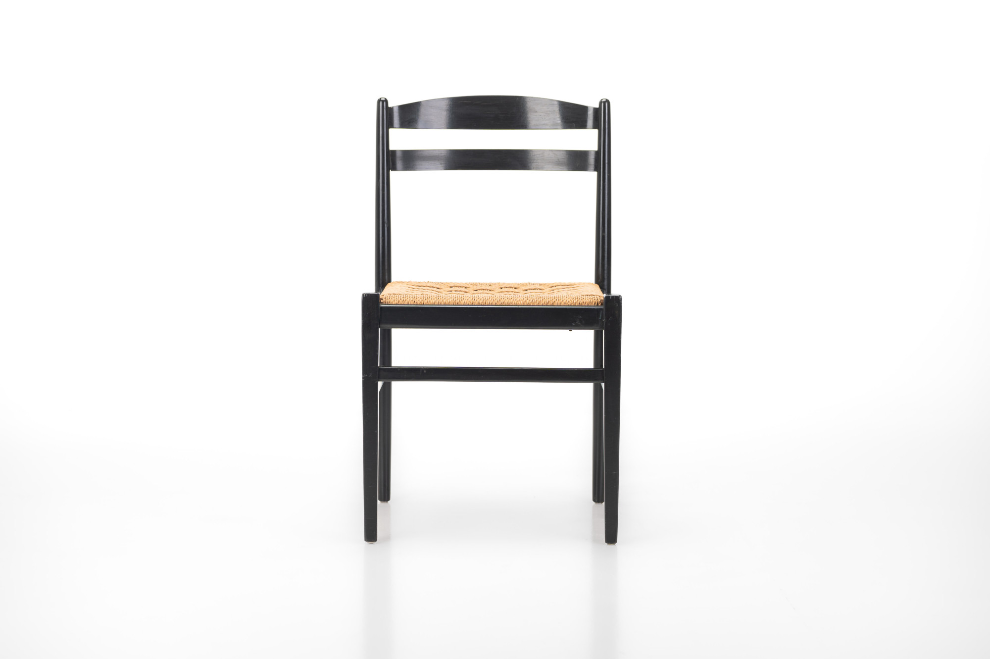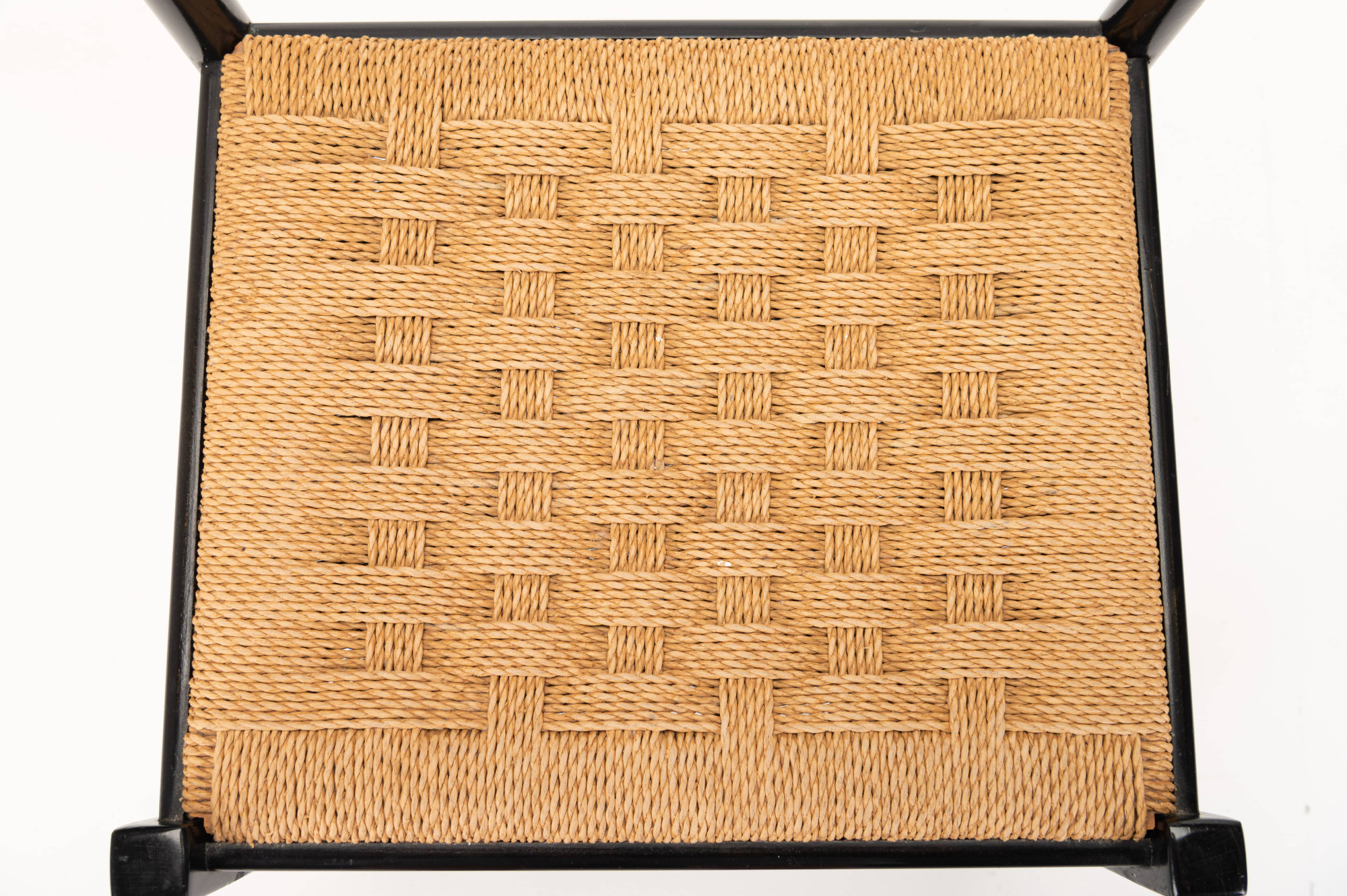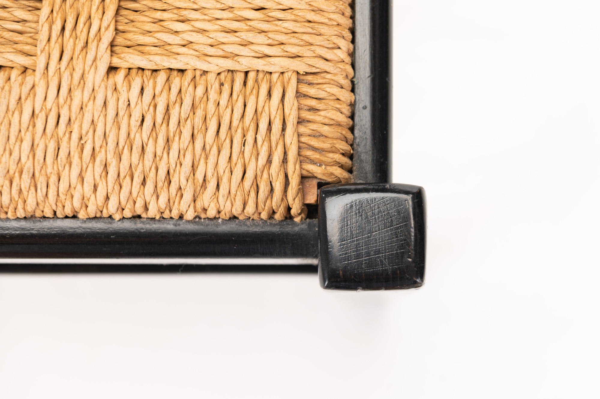 Set of four vintage dining room chairs. The wood is lacquered black and the seats are made with paper cord.