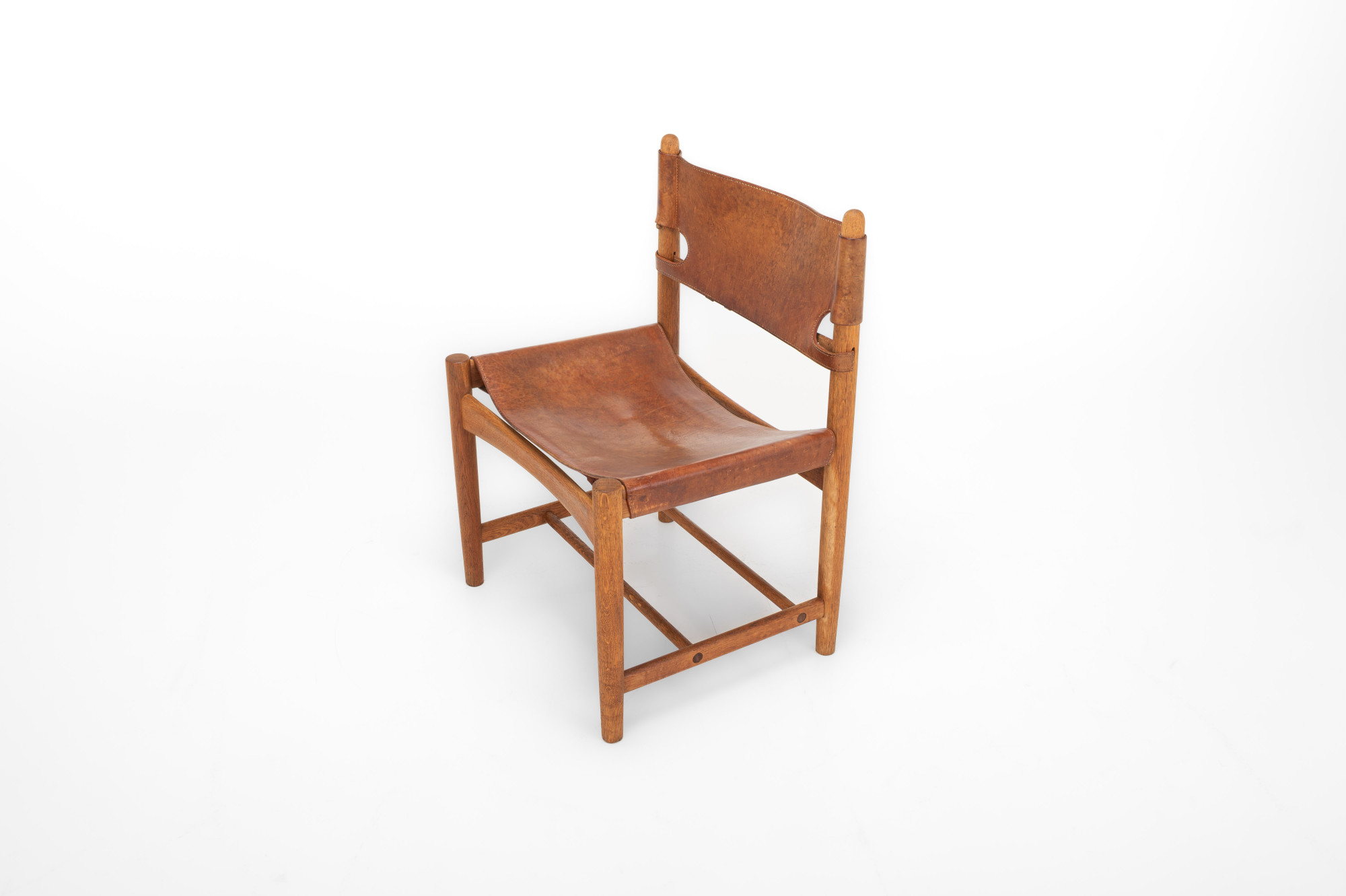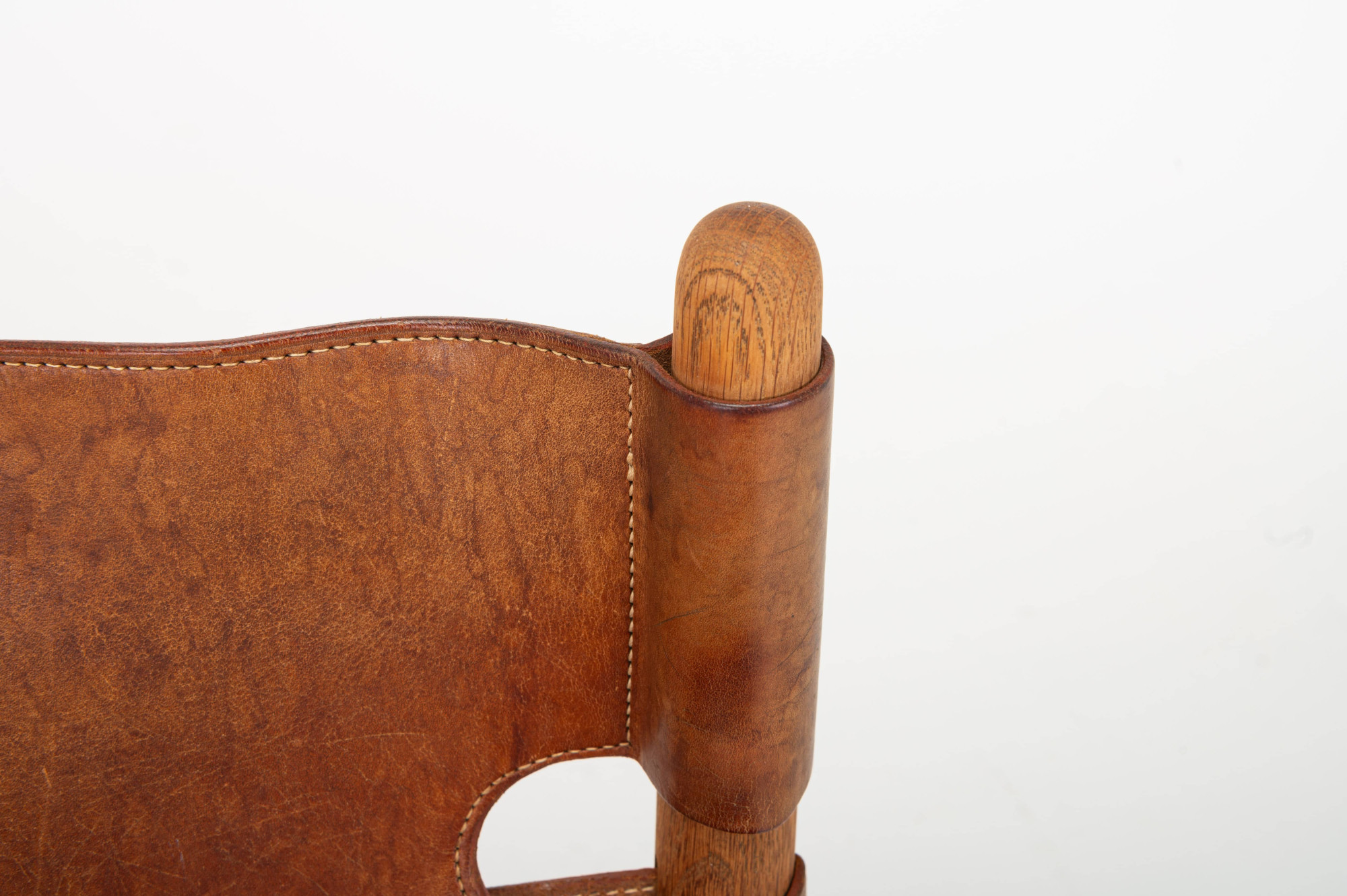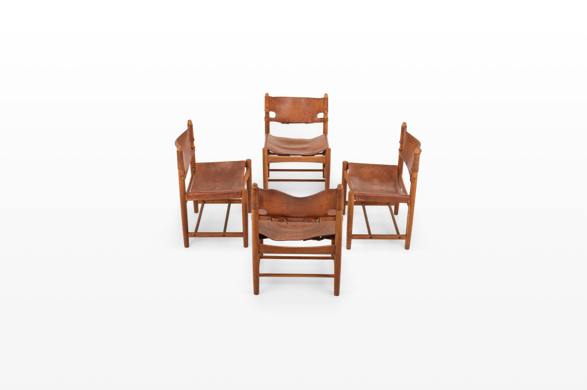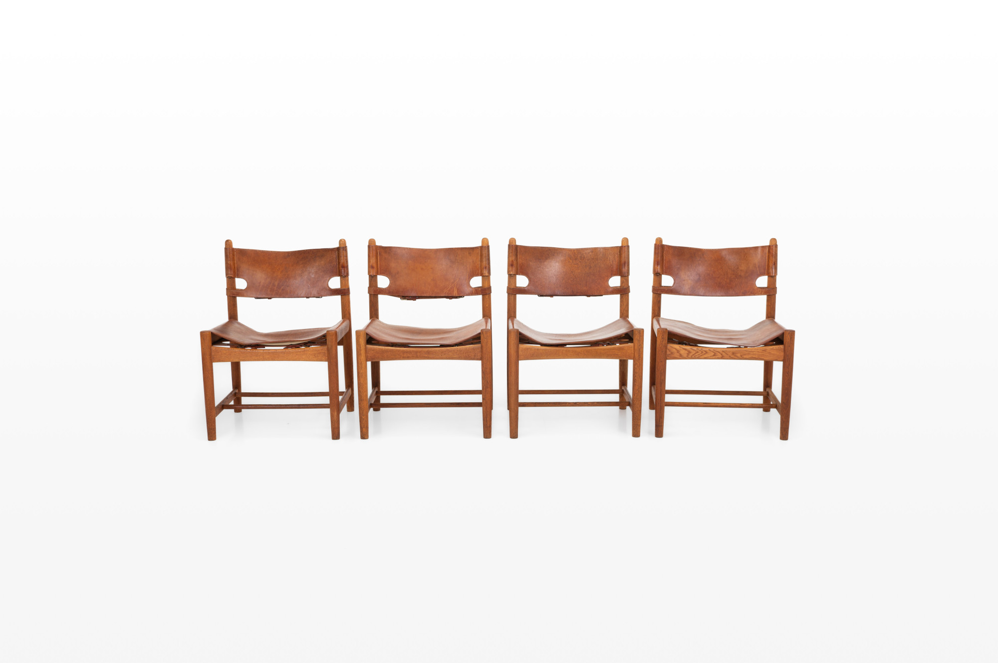 A set of four vintage dining chairs from Denmark. These "Spanish" chairs were designed by Børge Mogensen for Fredericia Stolefabrik in the 1950s. The chairs have an oak frame and a brown leather seat and back. In good condition with signs of wear due to age.