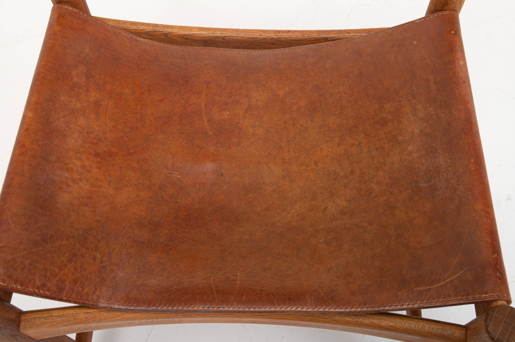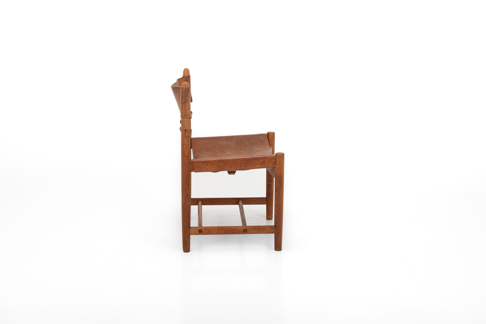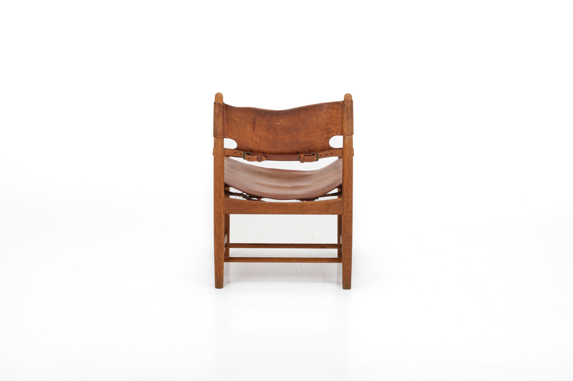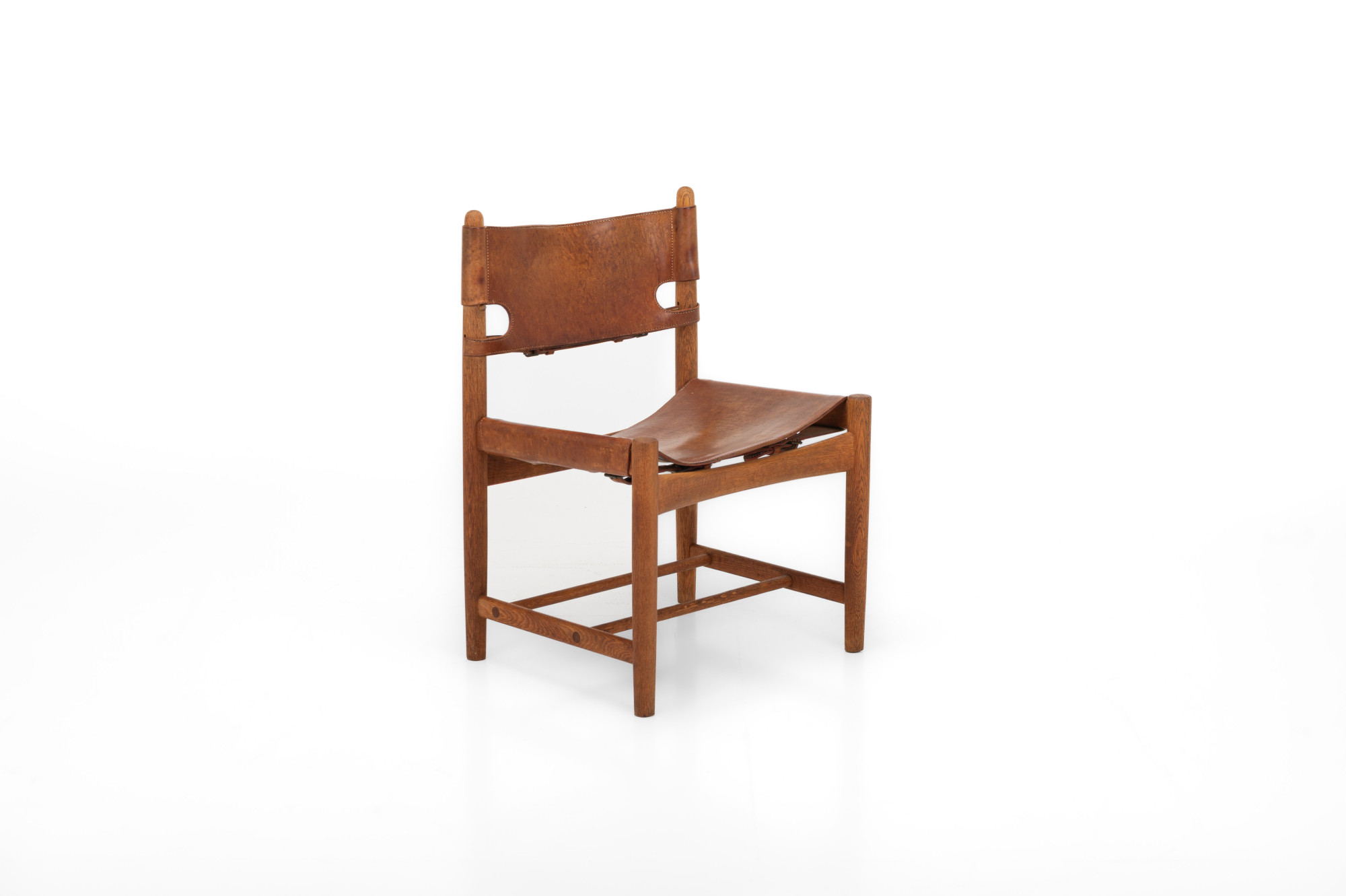 A set of four vintage dining chairs from Denmark. These "Spanish" chairs were designed by Børge Mogensen for Fredericia Stolefabrik in the 1950s. The chairs have an oak frame and a brown leather seat and back. In good condition with signs of wear due to age.