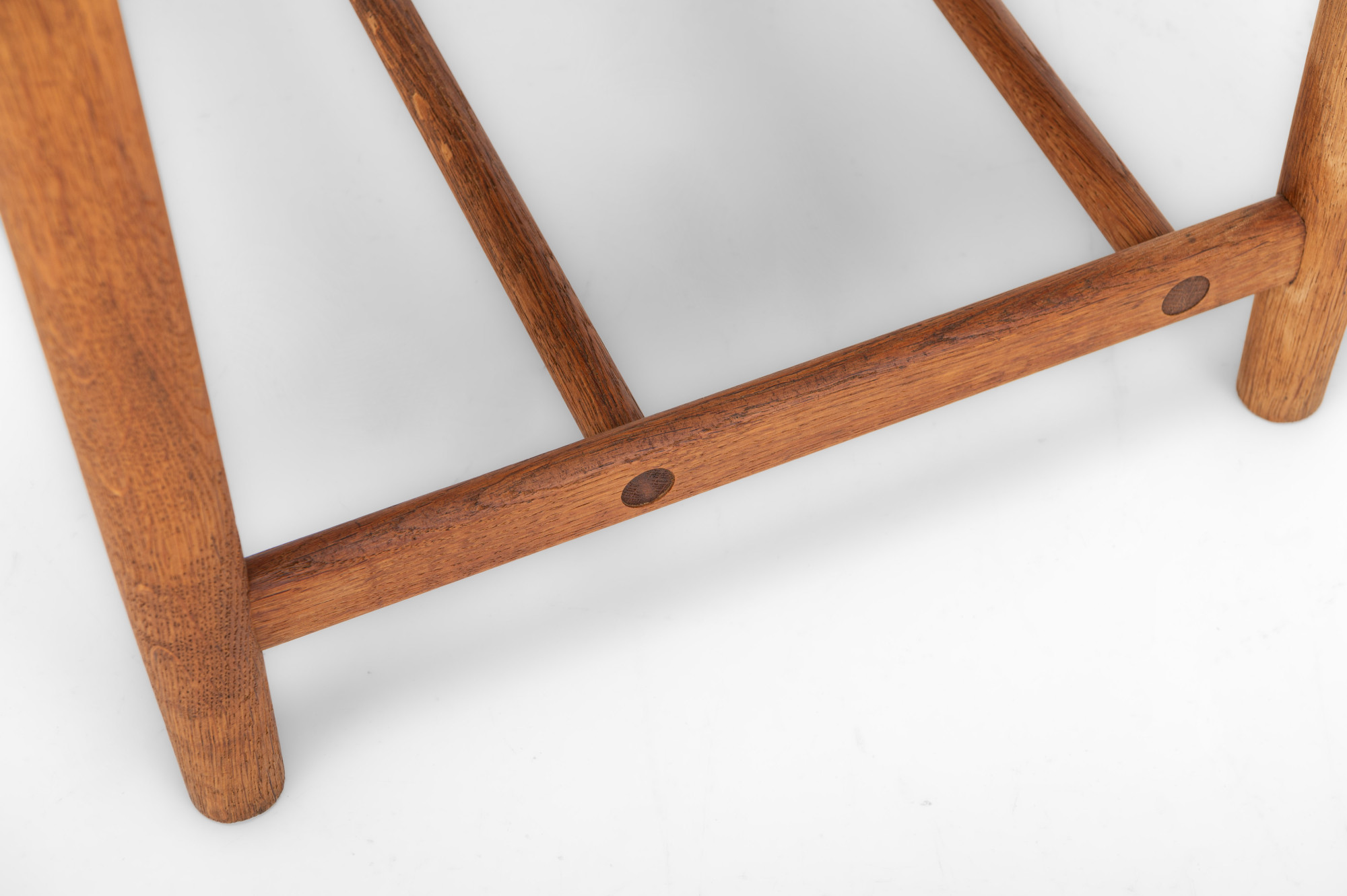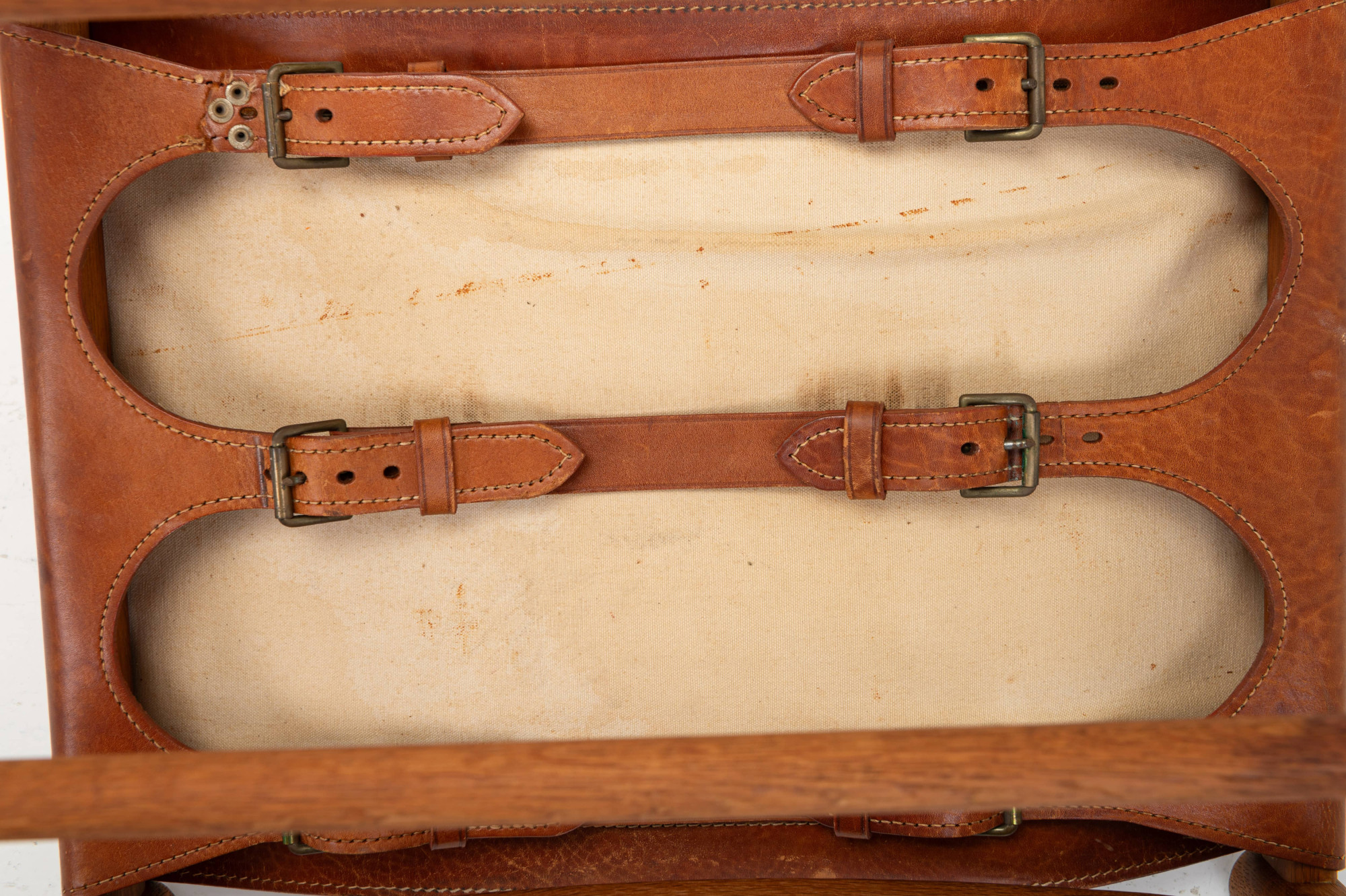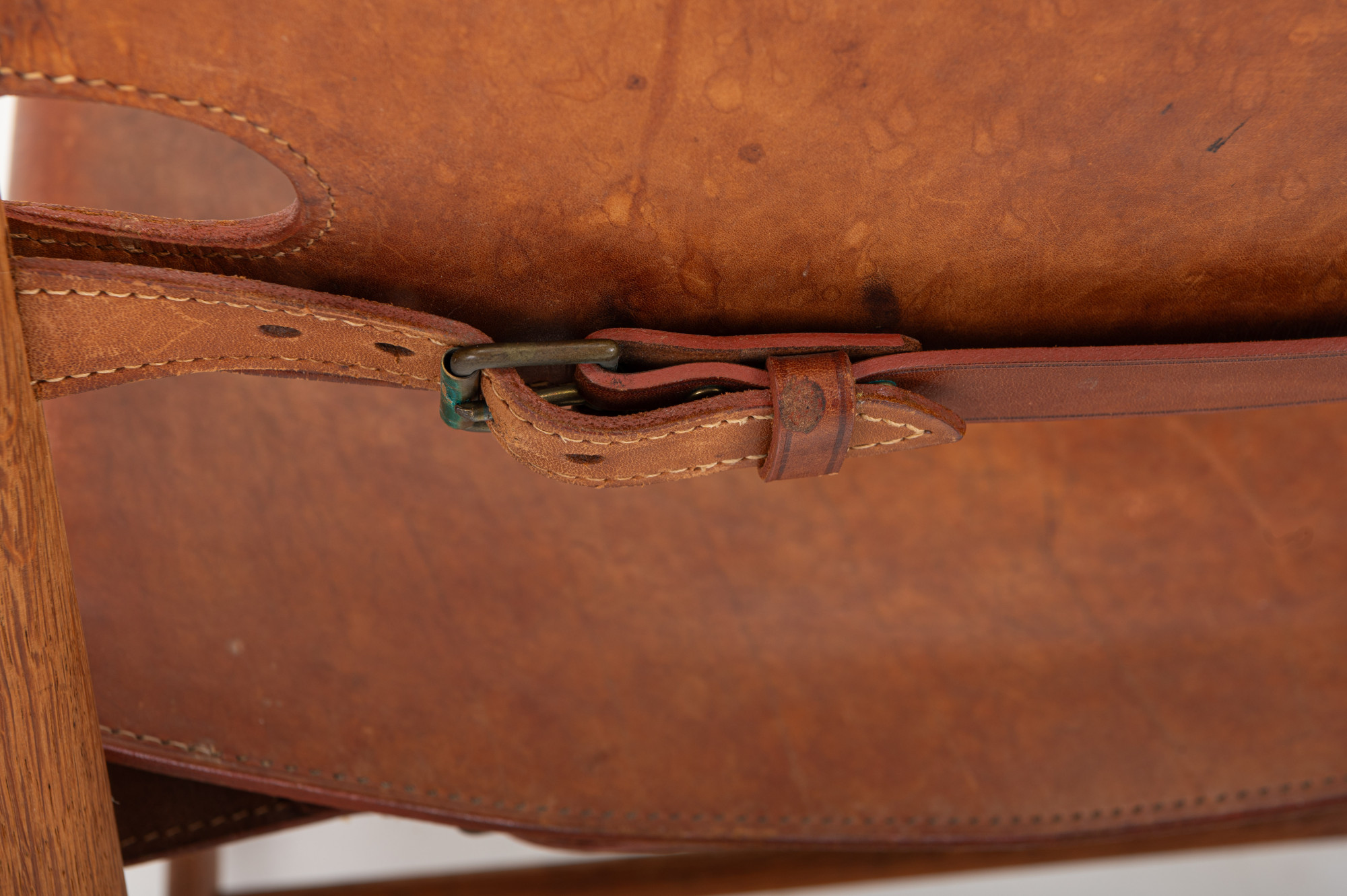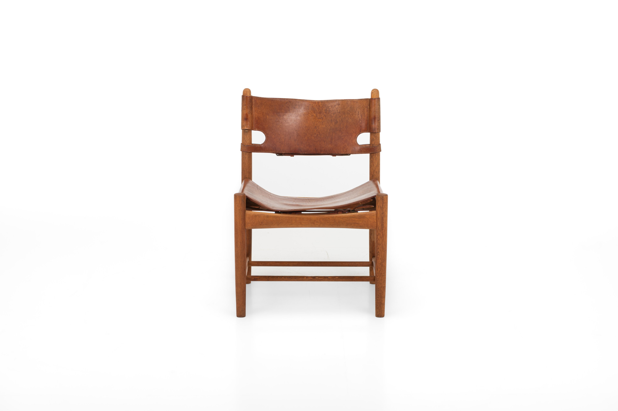 A set of four vintage dining chairs from Denmark. These "Spanish" chairs were designed by Børge Mogensen for Fredericia Stolefabrik in the 1950s. The chairs have an oak frame and a brown leather seat and back. In good condition with signs of wear due to age.