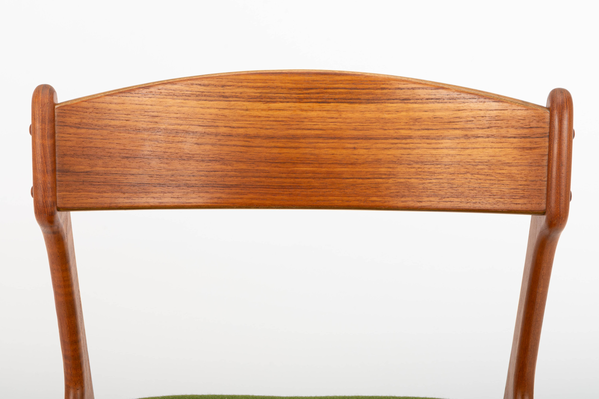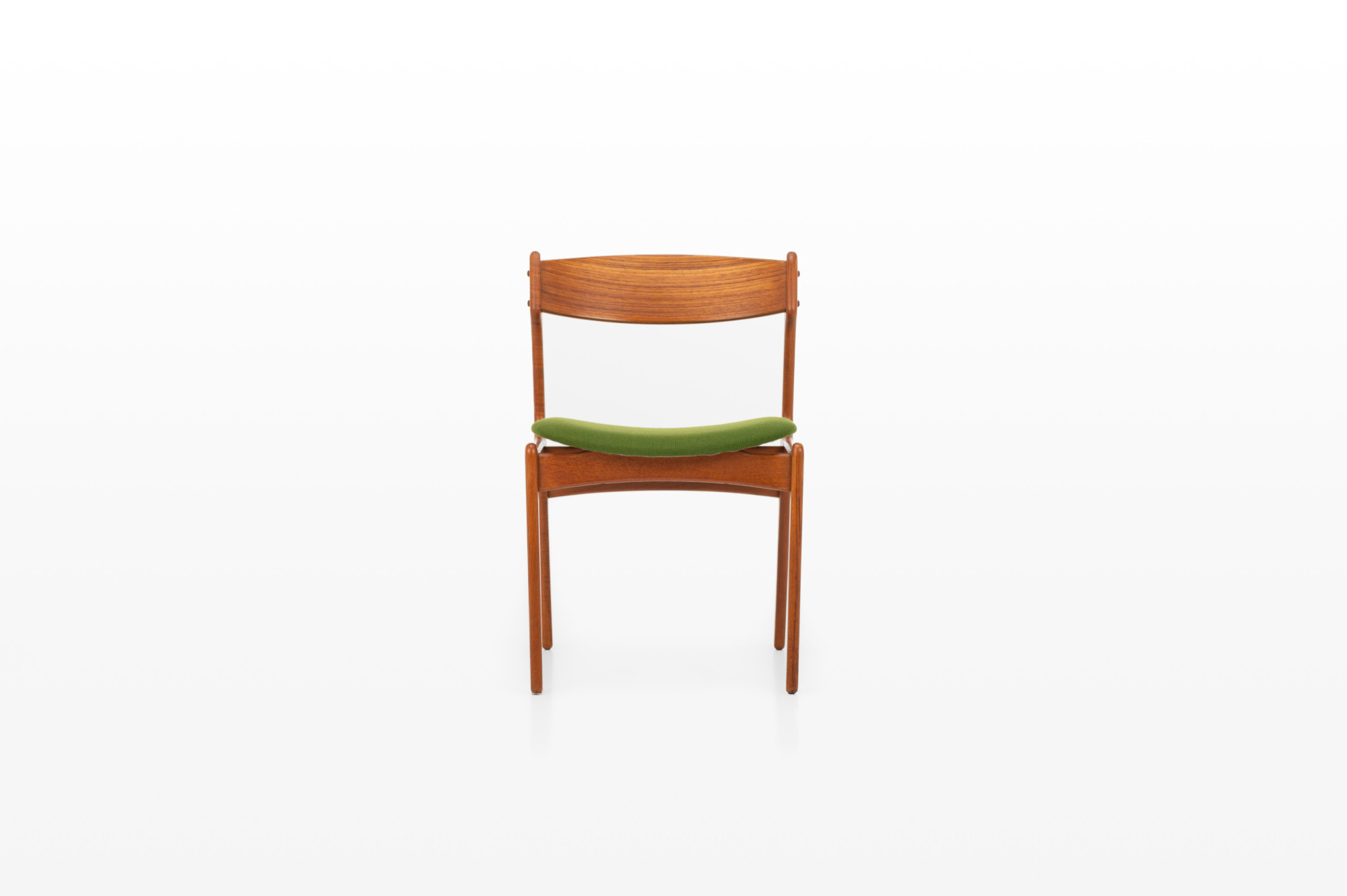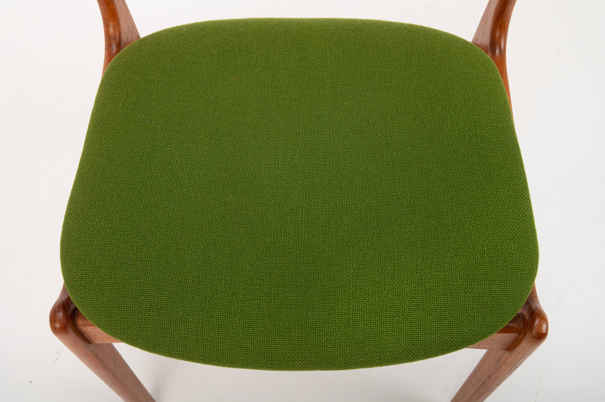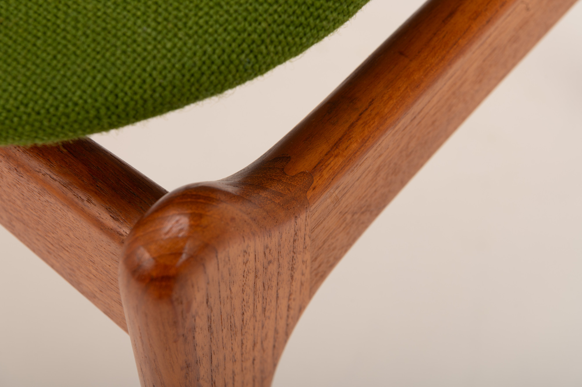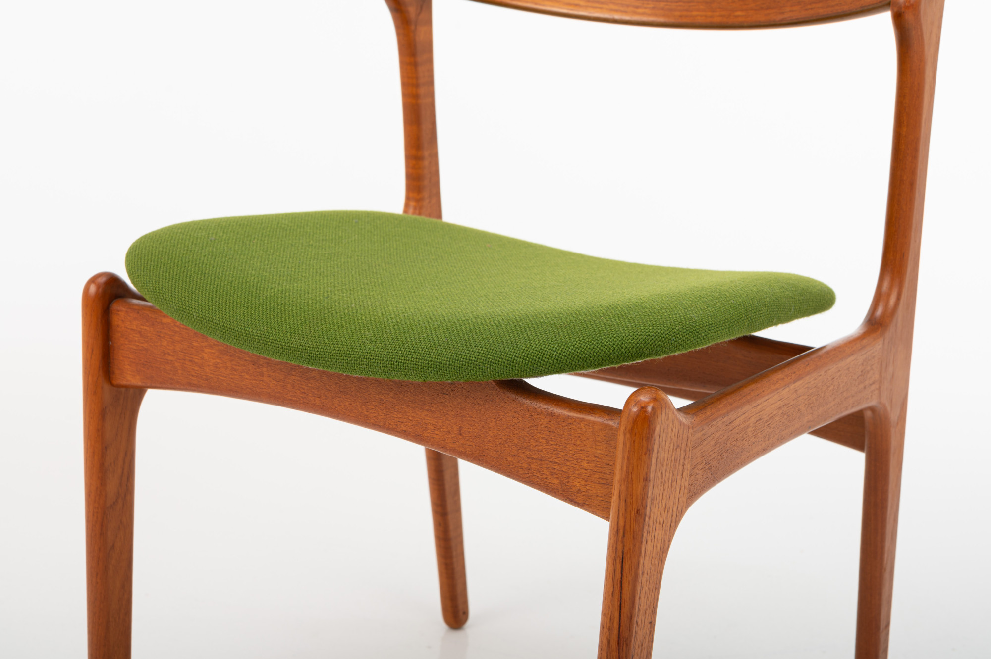 These chairs have a teak frame and their original grass-green upholstery, beautifully preserved. The combination of warm teak and vibrant fabric captures the essence of mid-century Scandinavian craftsmanship and style. Marked by the producer.