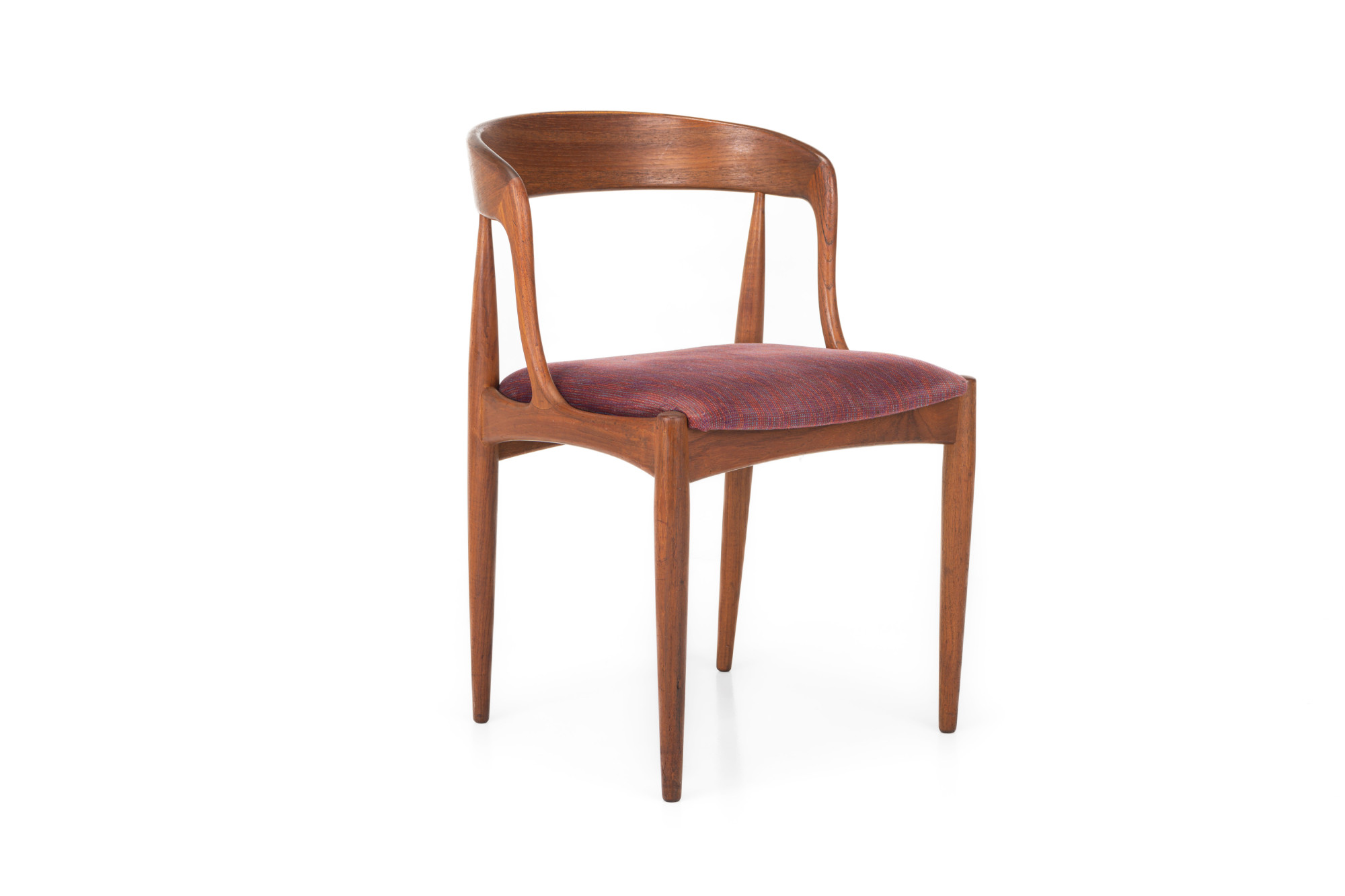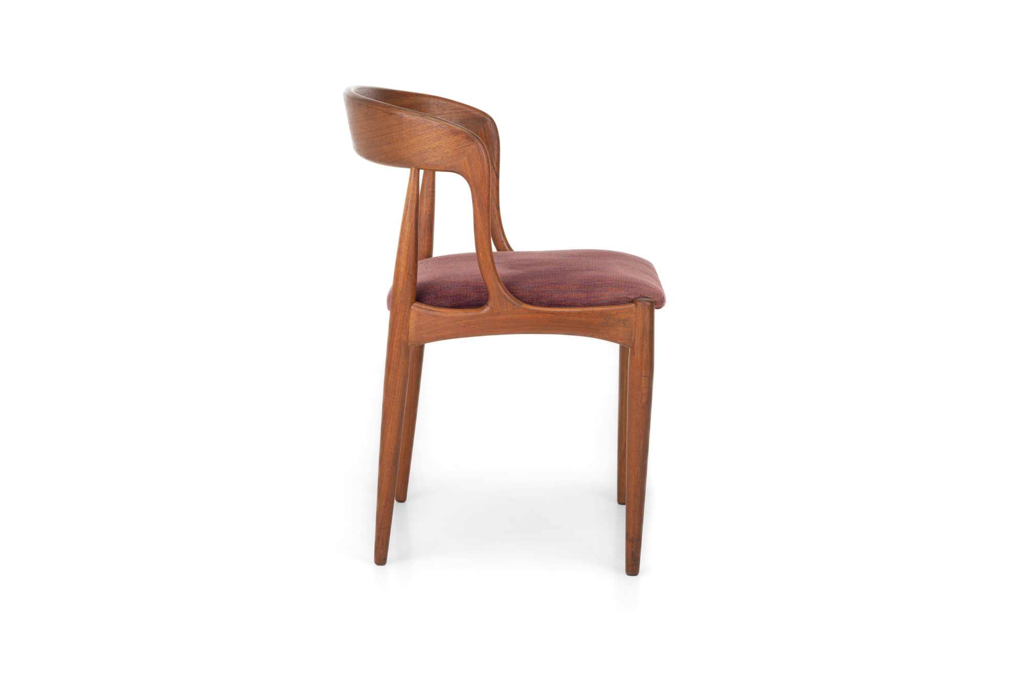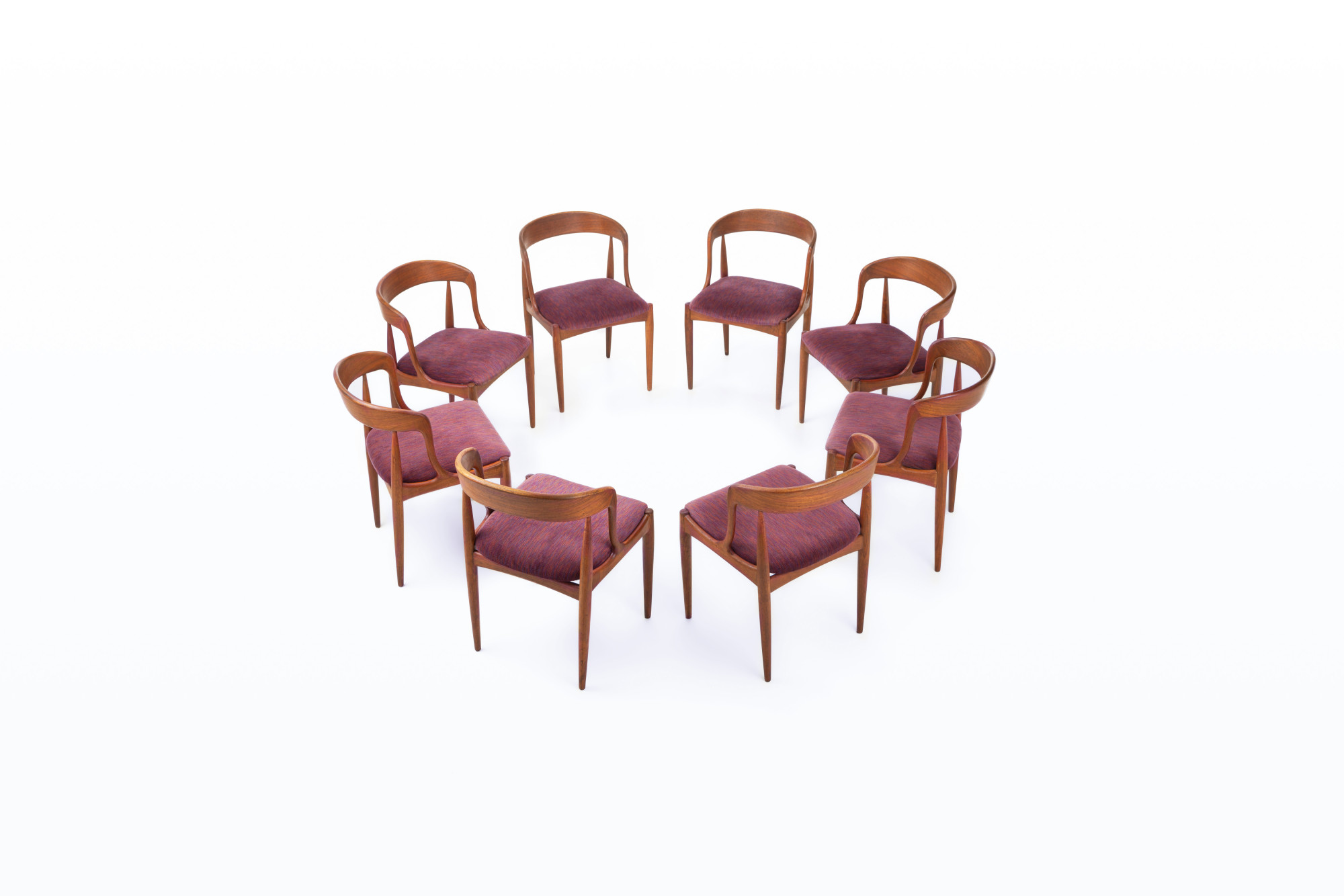 Set of eight vintage 'Model 16' dining room chairs. These chairs are designed by Johannes Andersen for Uldum Møbelfabrik in Denmark. They have a teak frame and a red-purple seat. The chairs are in very good condition.