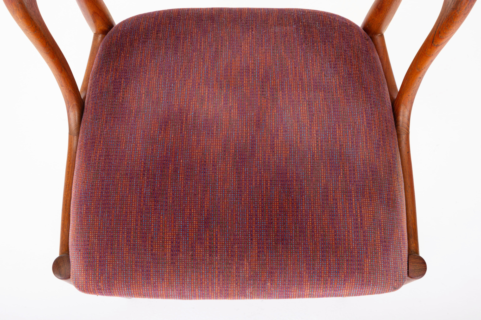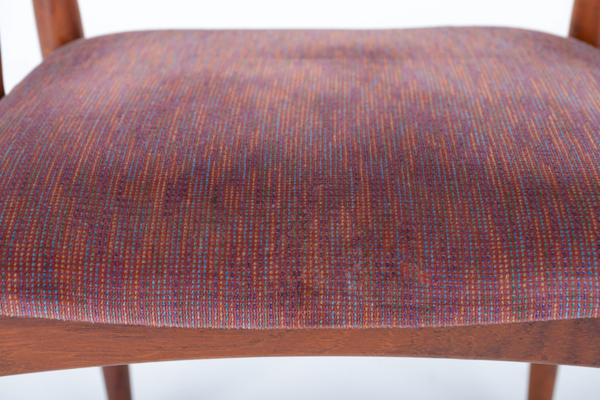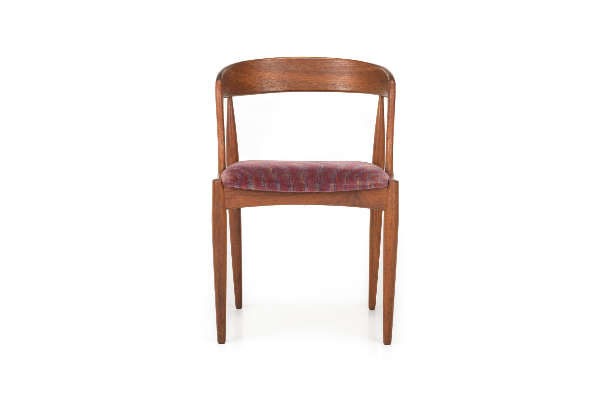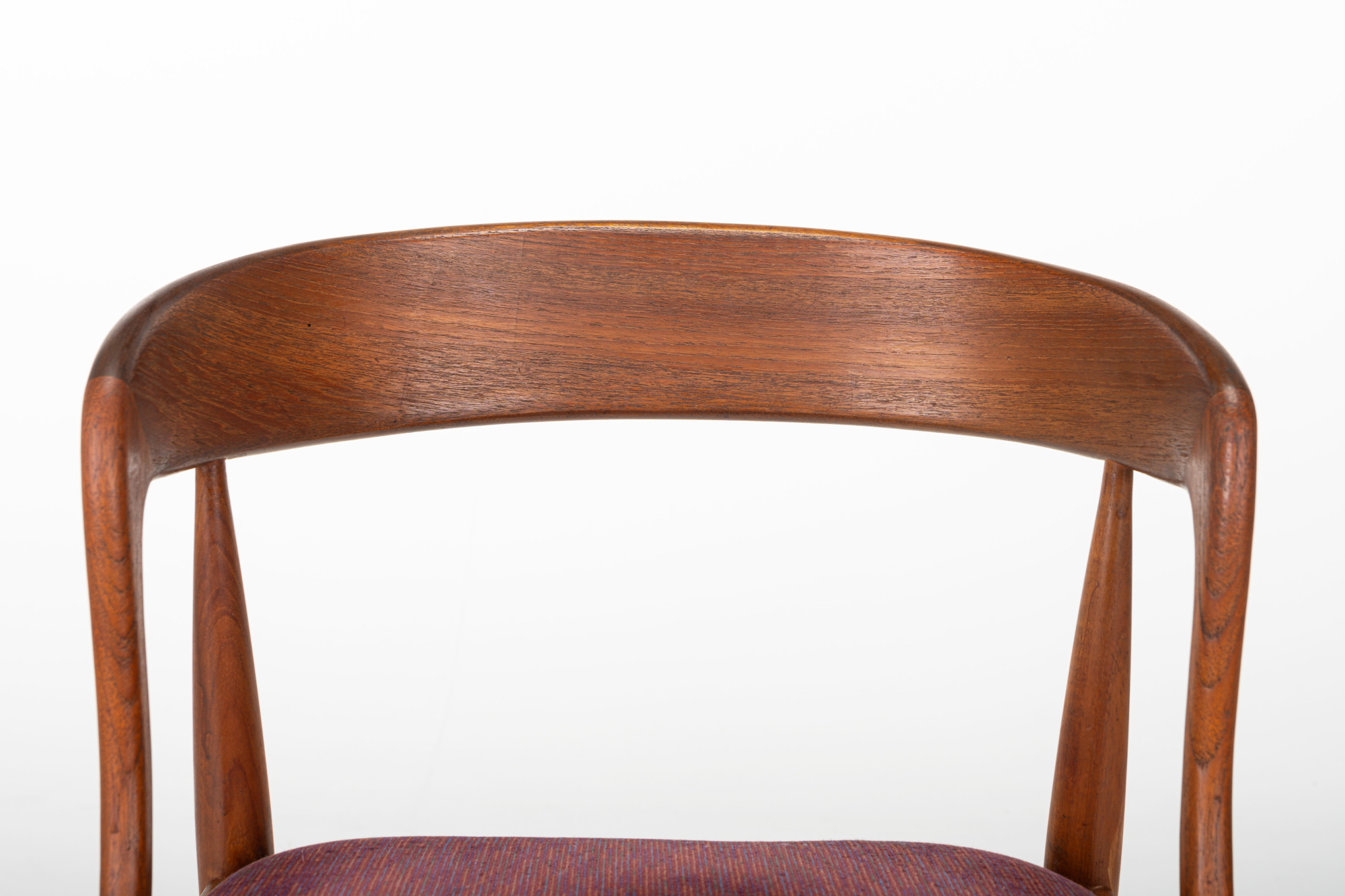 Set of eight vintage 'Model 16' dining room chairs. These chairs are designed by Johannes Andersen for Uldum Møbelfabrik in Denmark. They have a teak frame and a red-purple seat. The chairs are in very good condition.