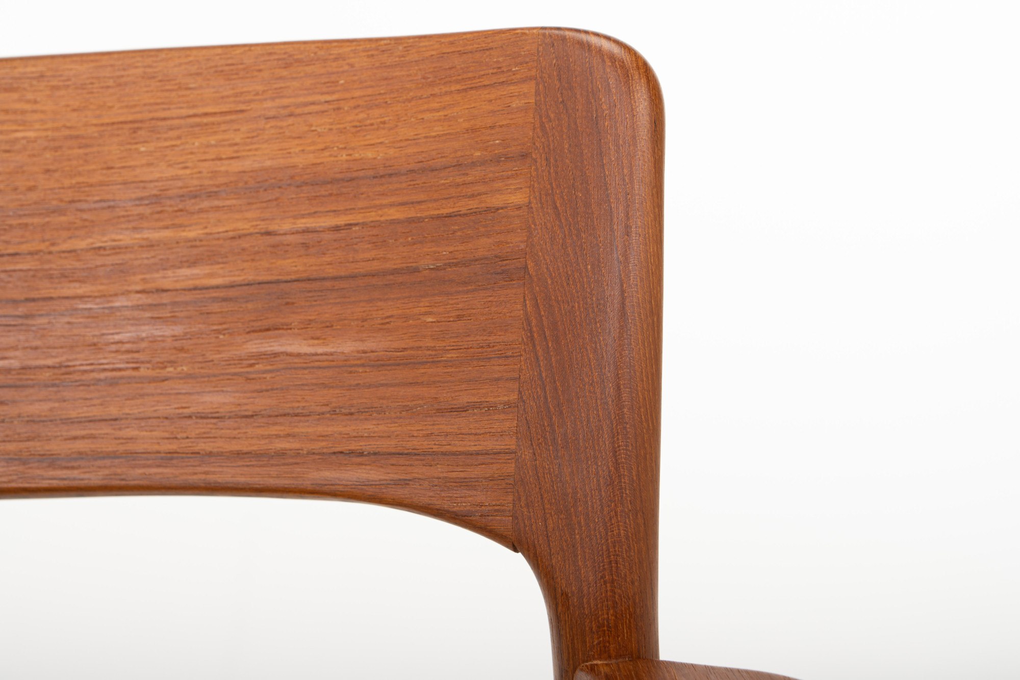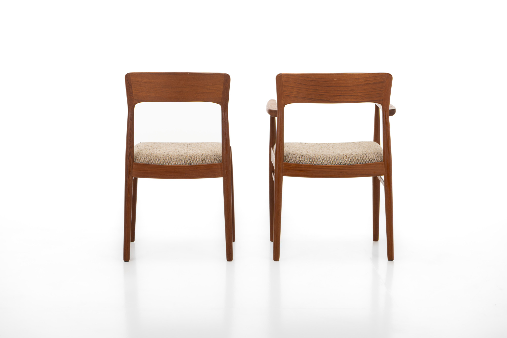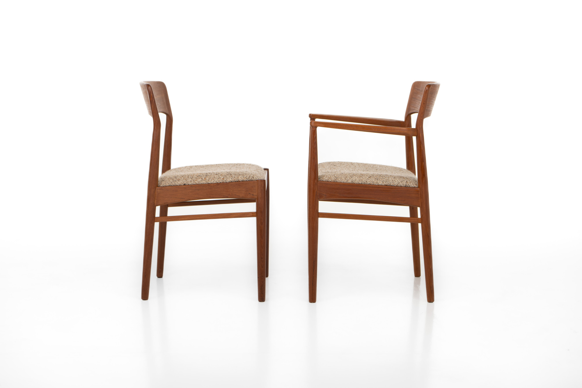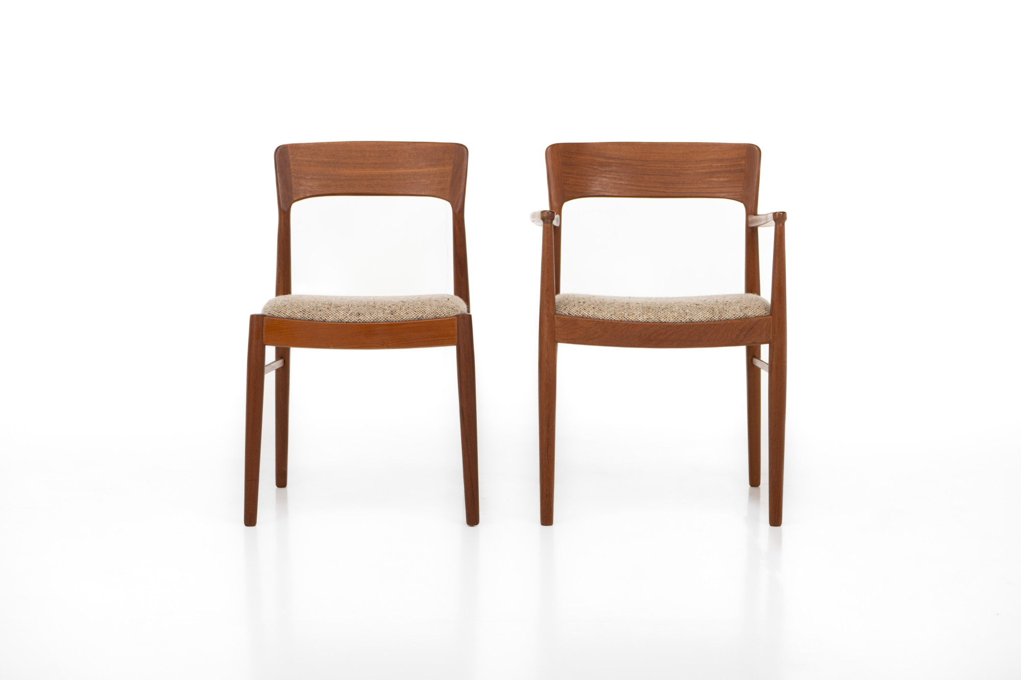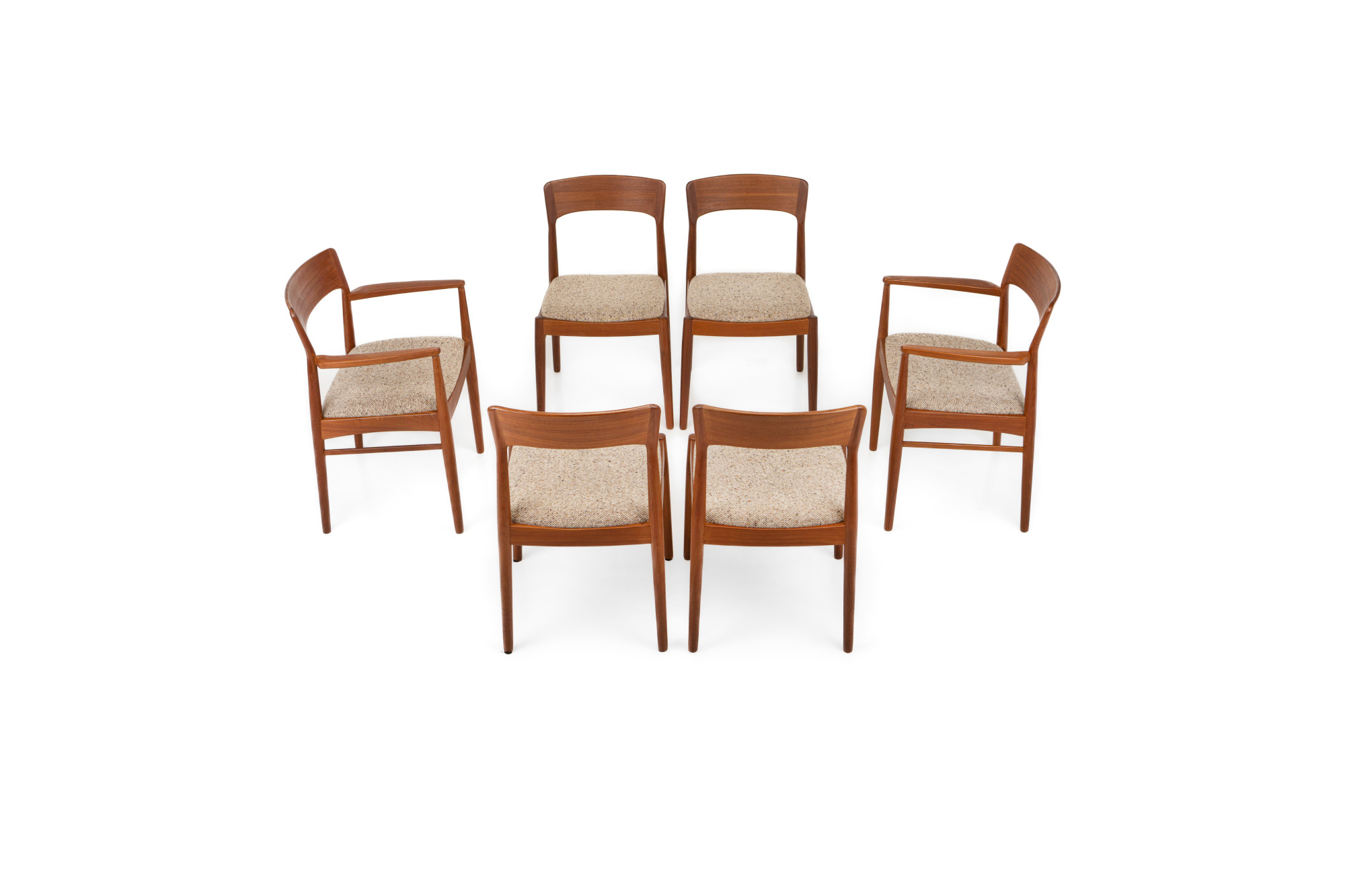 Set of 6 dining chairs in teak, designed by Henning Kjærnulf for Korup Stølefabrik in Denmark in the 1960s. The chairs still have the original 'Kvadrat' upholstery.