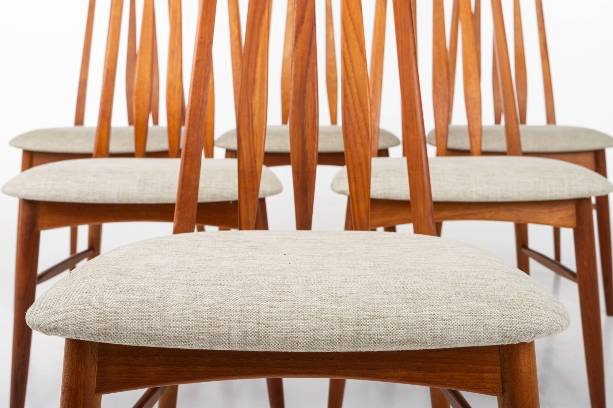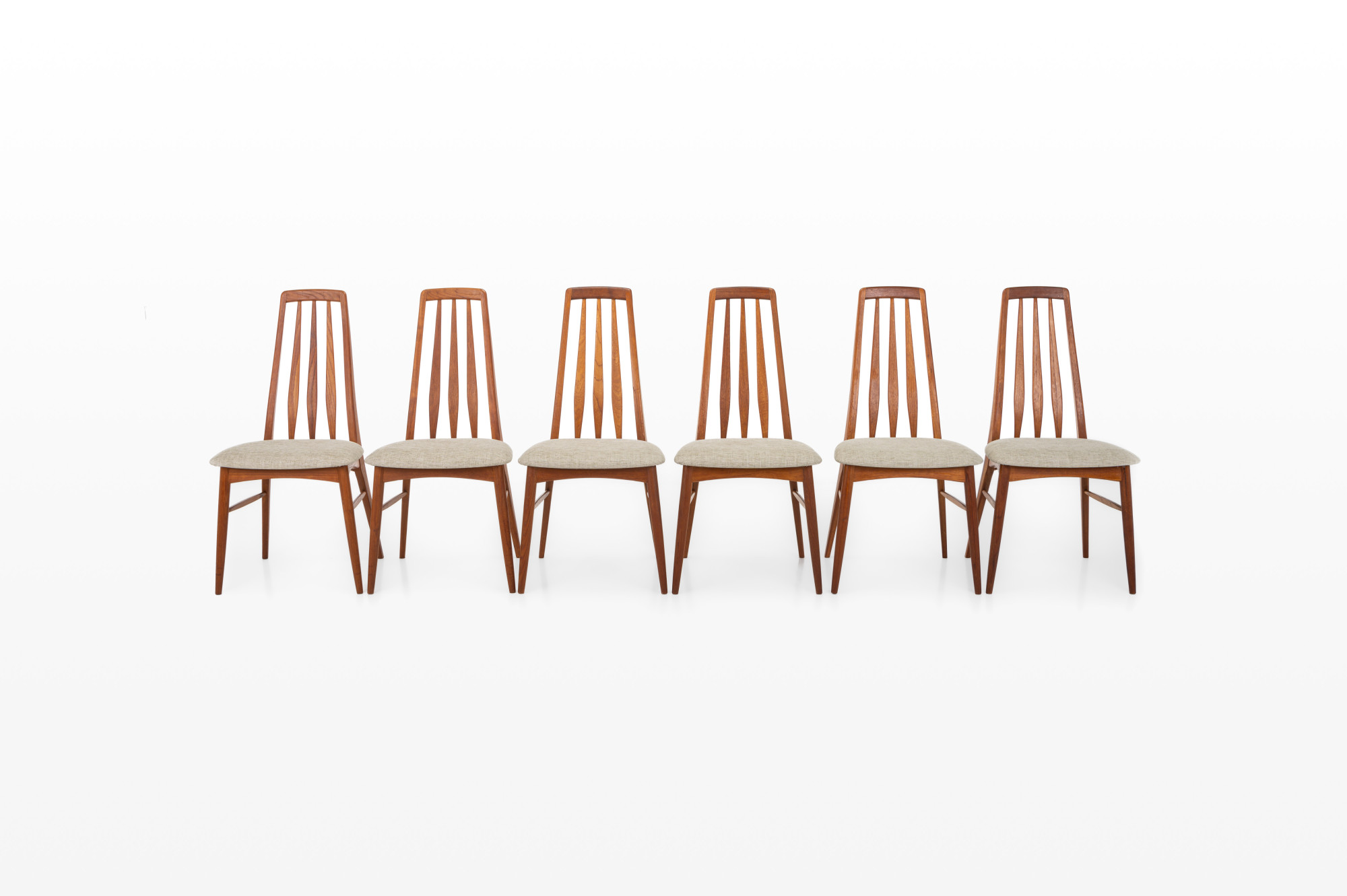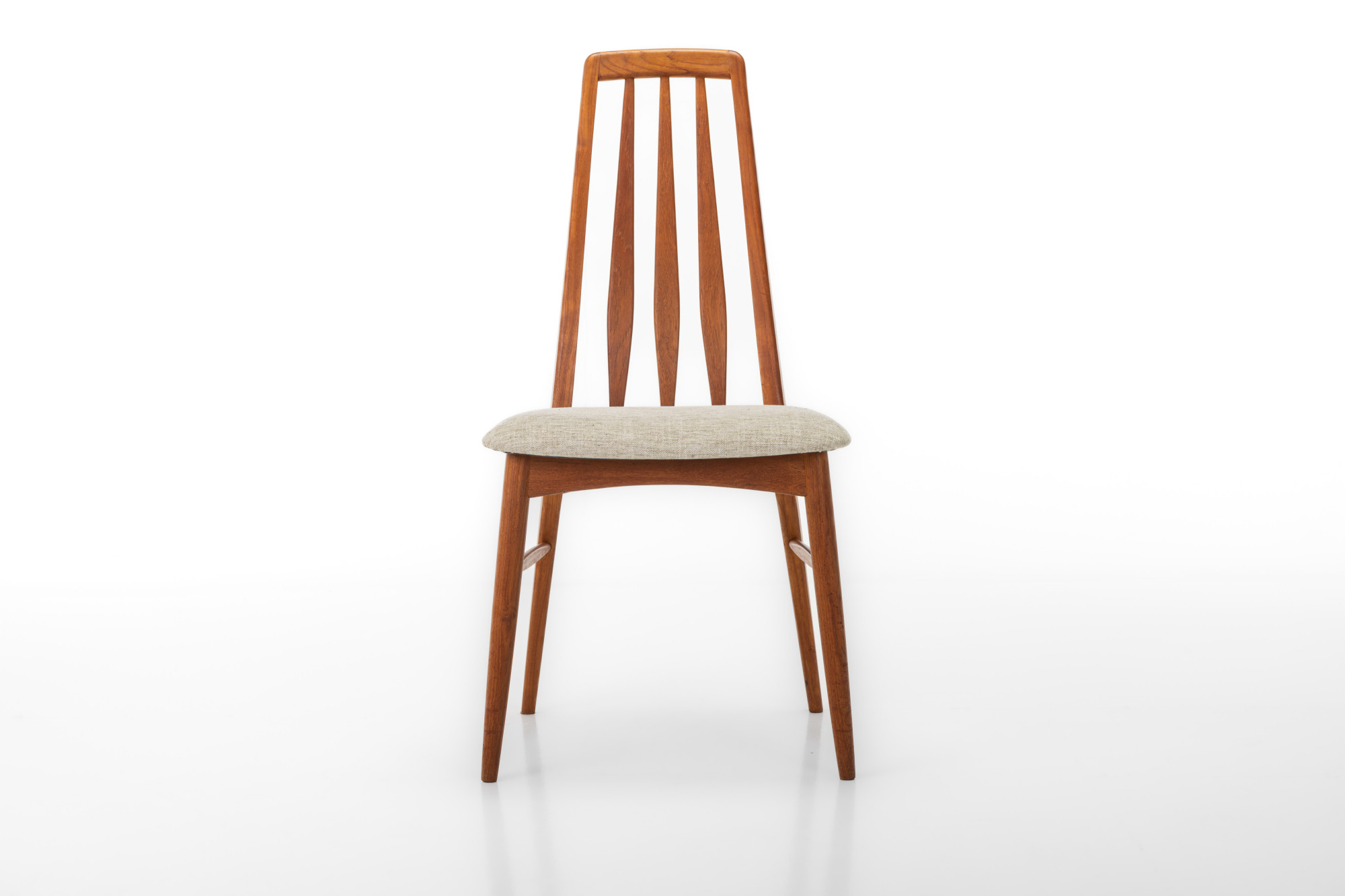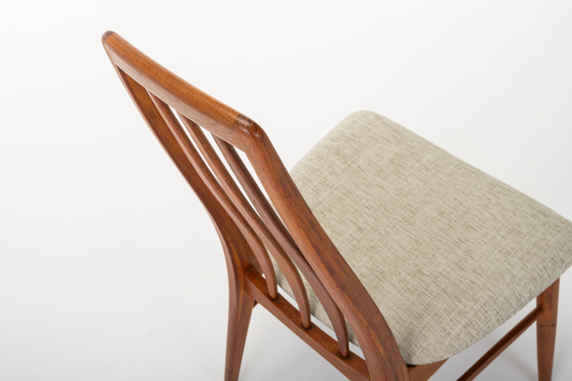 Very nice set of six vintage 'Eva' dining chairs. These chairs are designed by Niels Koefoed for Koefoeds Hornslet and manufactures in Denmark in the 1960s. The chairs have a teak frame and are reupholstered with a gray-green fabric. All chairs are marked by the manufacturer and with the Danish Furniture control mark.