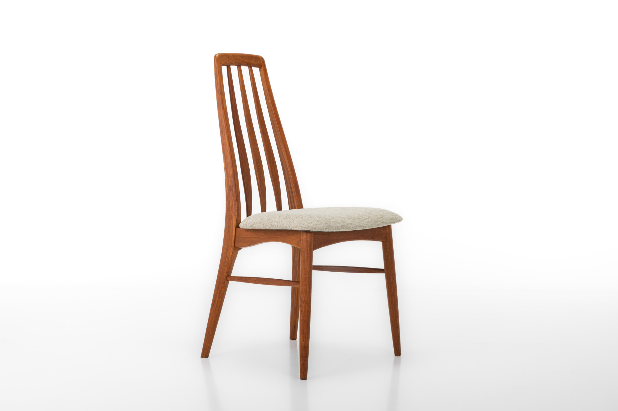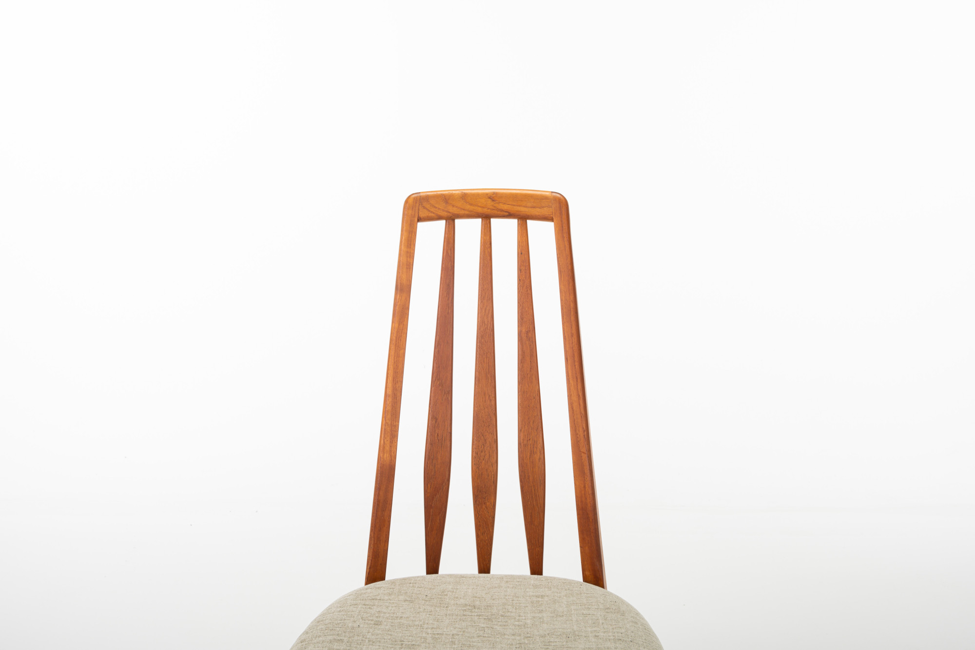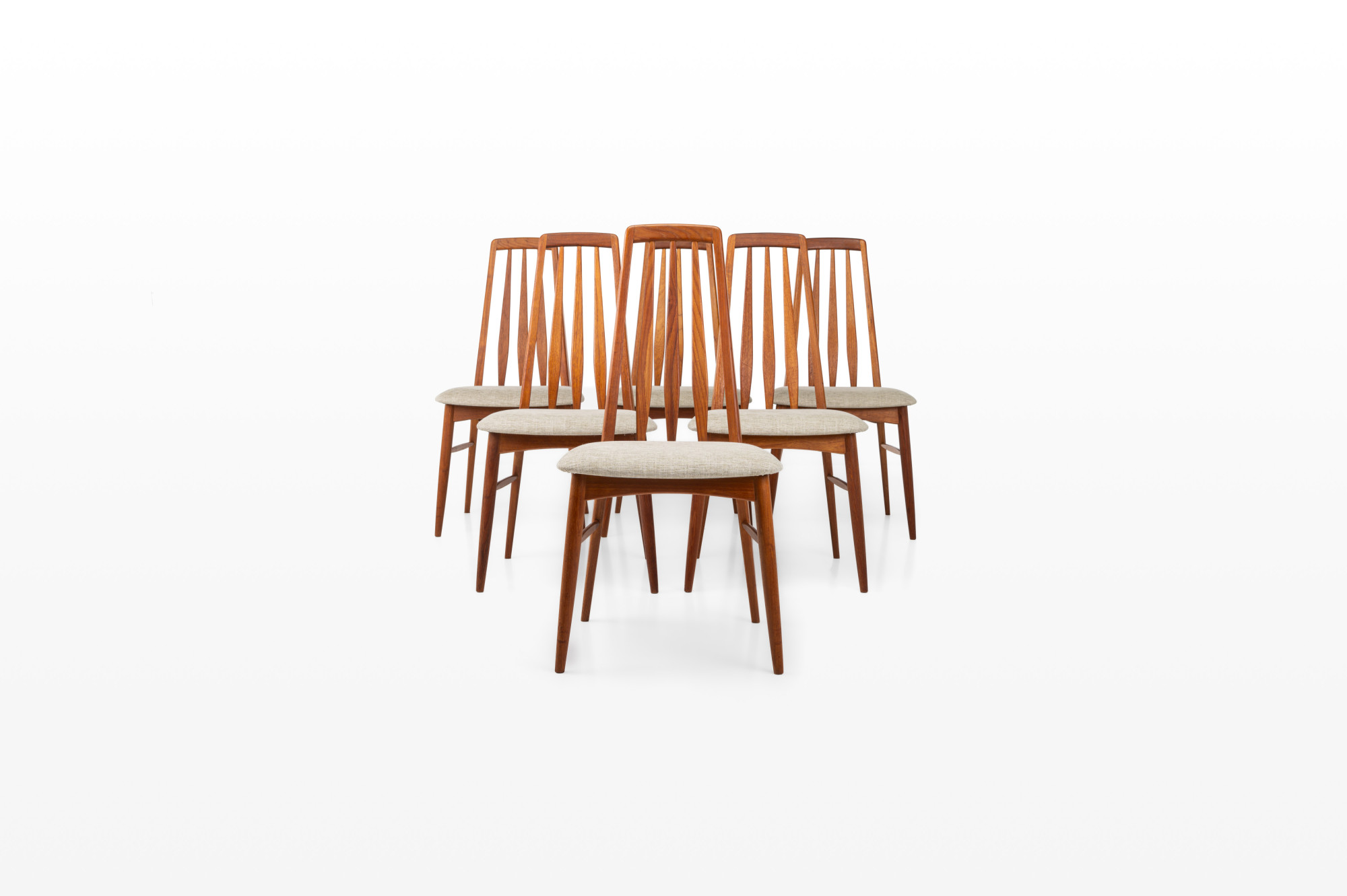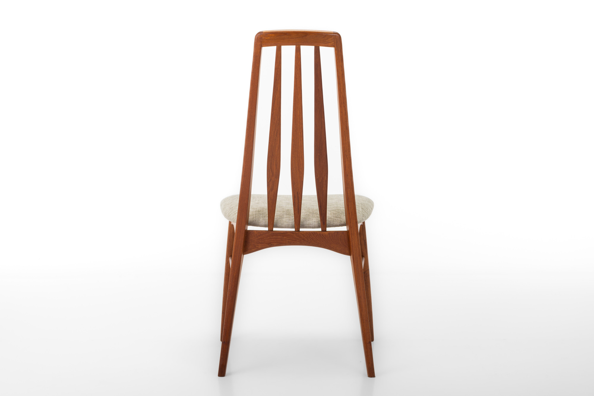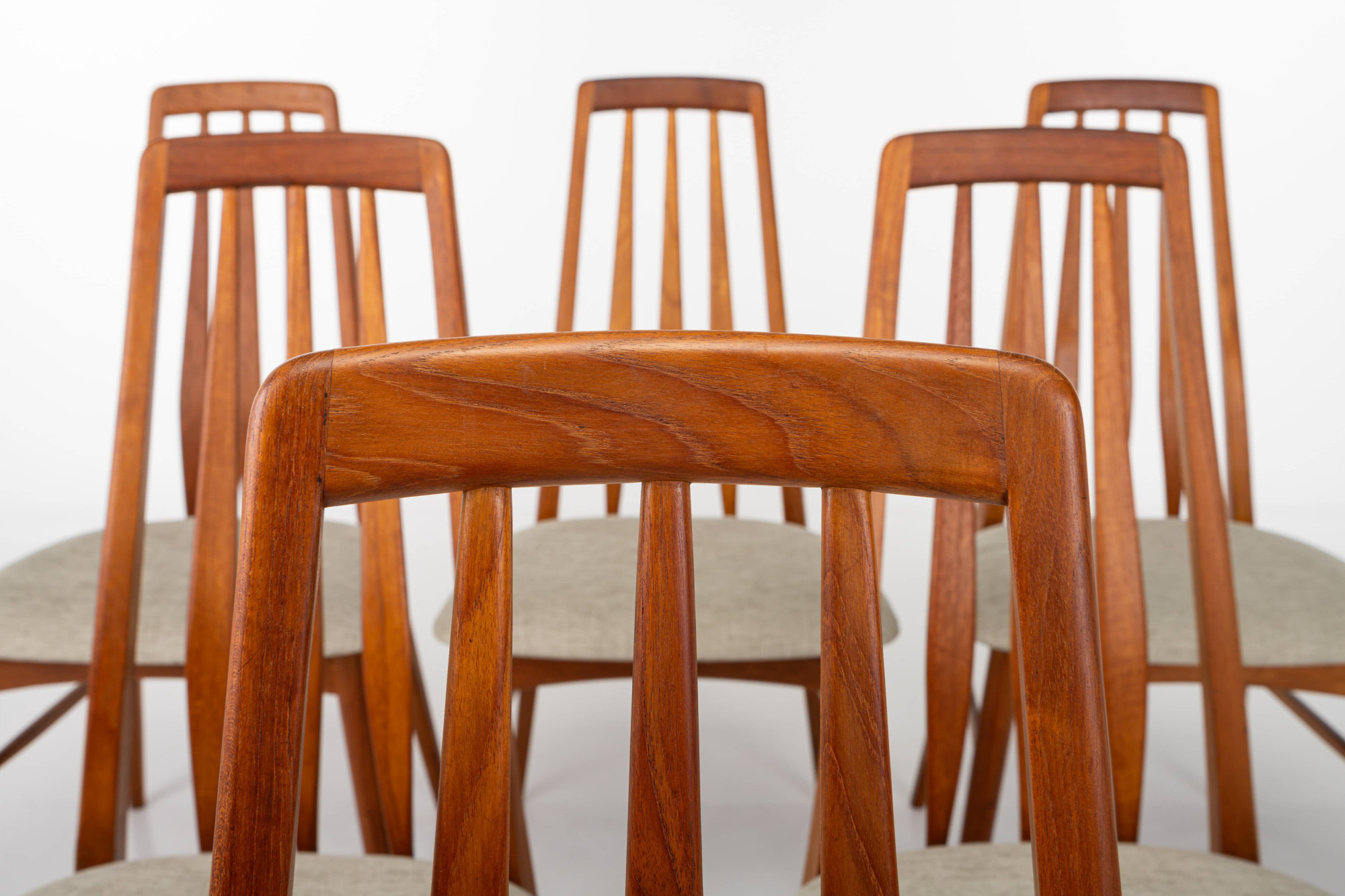 Very nice set of six vintage 'Eva' dining chairs. These chairs are designed by Niels Koefoed for Koefoeds Hornslet and manufactures in Denmark in the 1960s. The chairs have a teak frame and are reupholstered with a gray-green fabric. All chairs are marked by the manufacturer and with the Danish Furniture control mark.