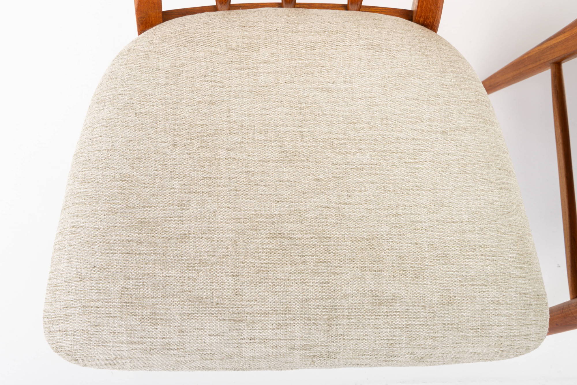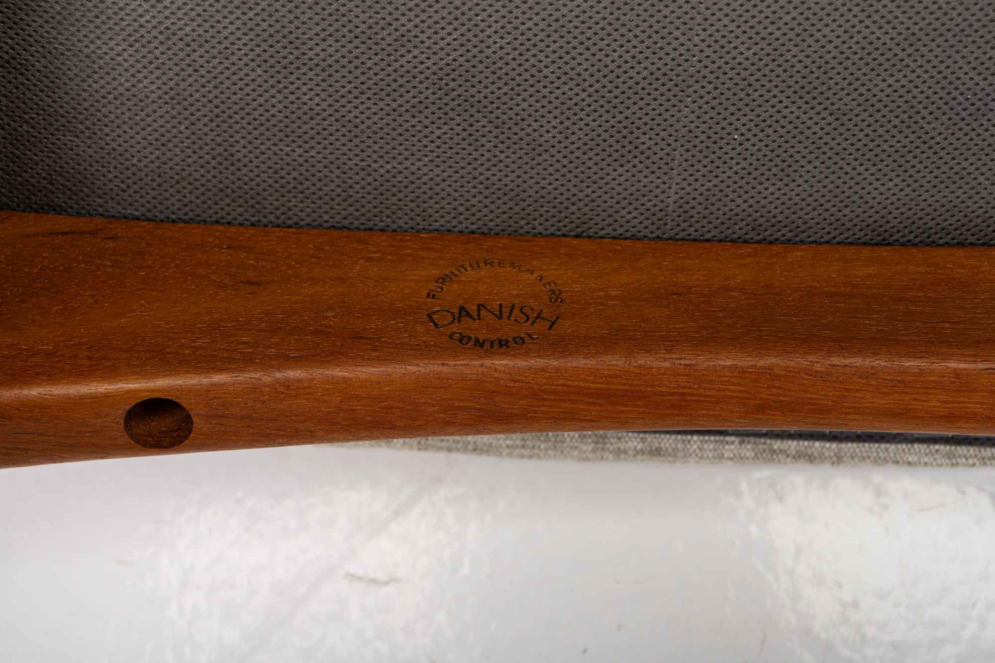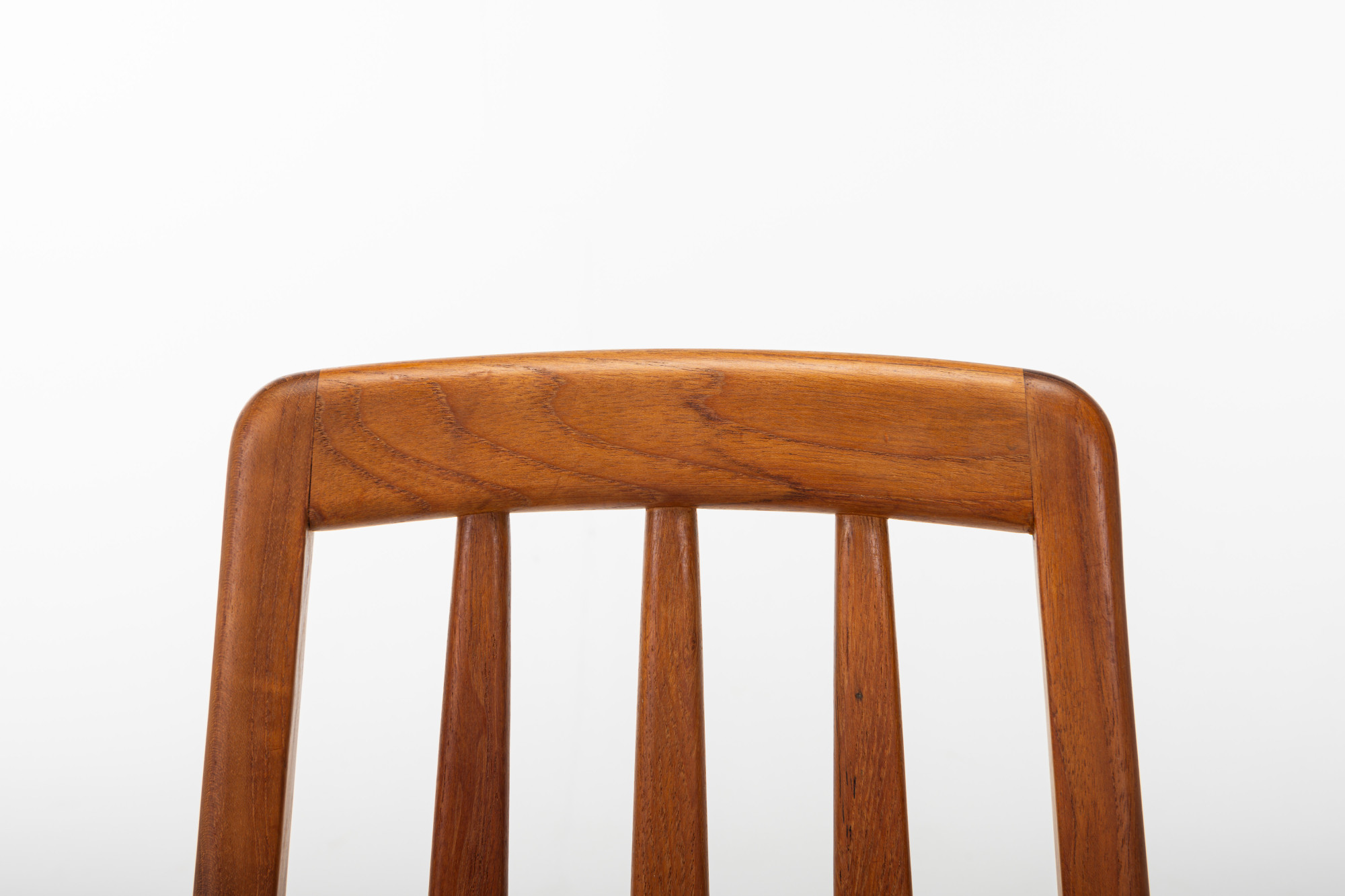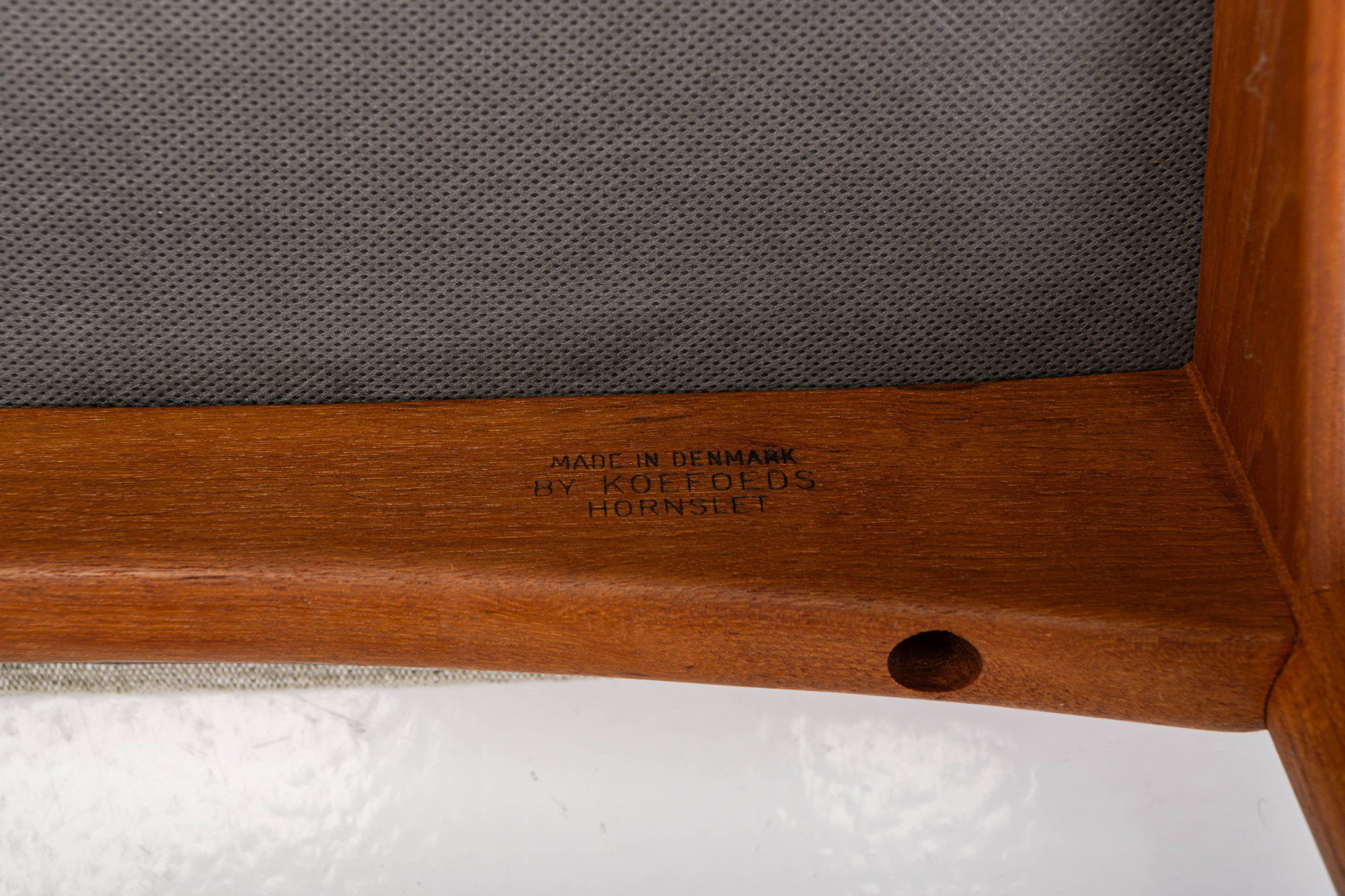 Very nice set of six vintage 'Eva' dining chairs. These chairs are designed by Niels Koefoed for Koefoeds Hornslet and manufactures in Denmark in the 1960s. The chairs have a teak frame and are reupholstered with a gray-green fabric. All chairs are marked by the manufacturer and with the Danish Furniture control mark.