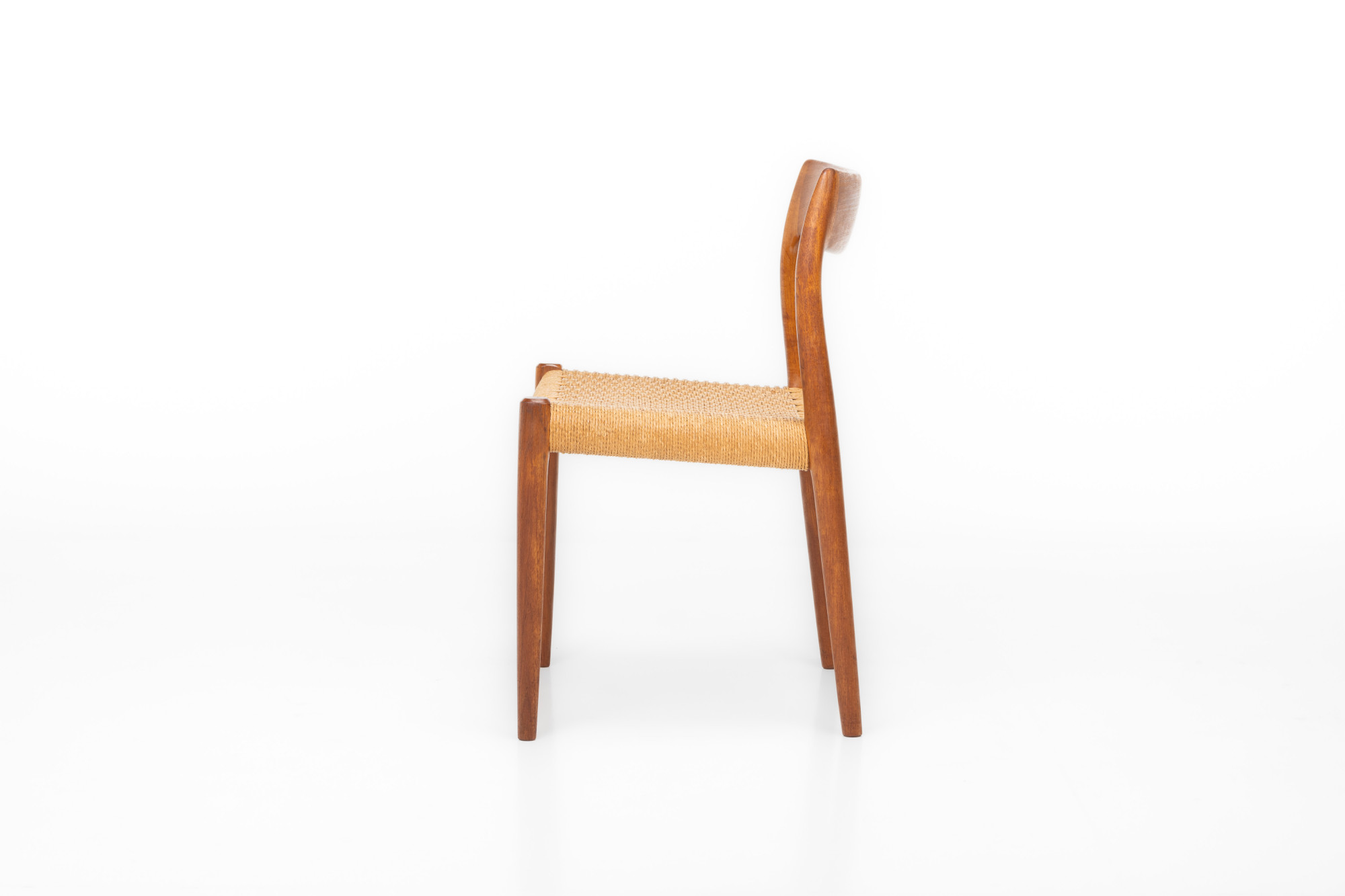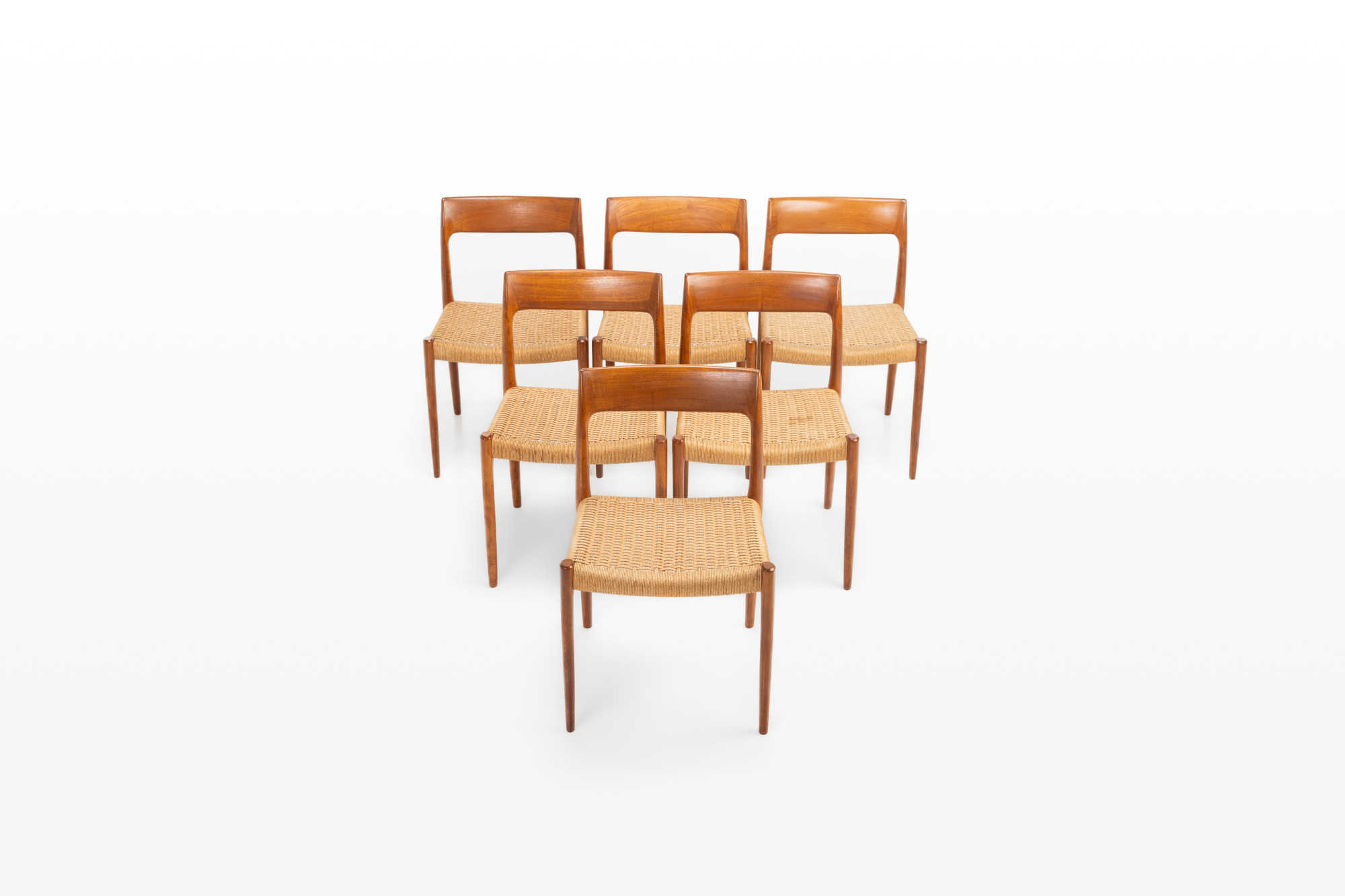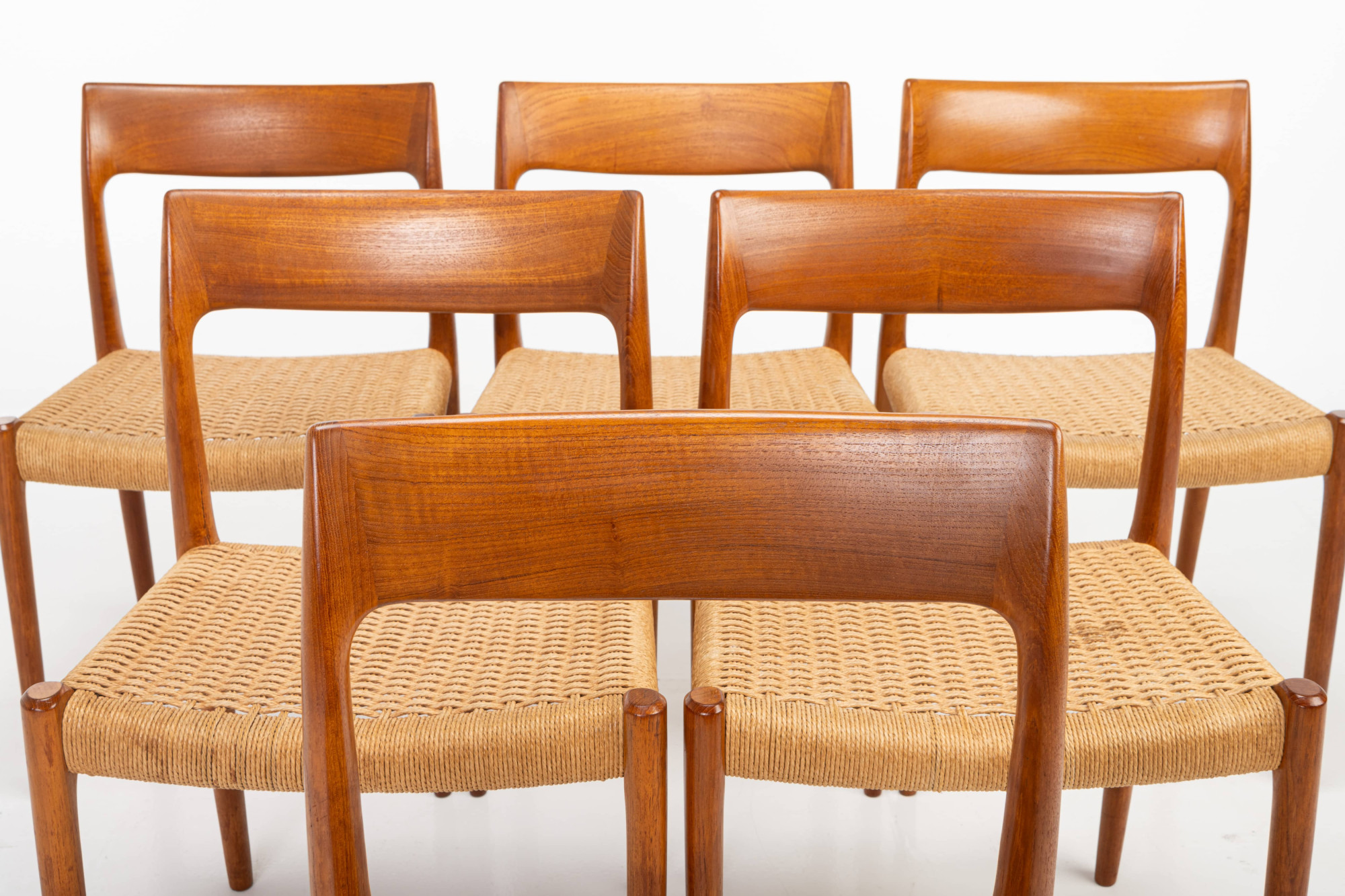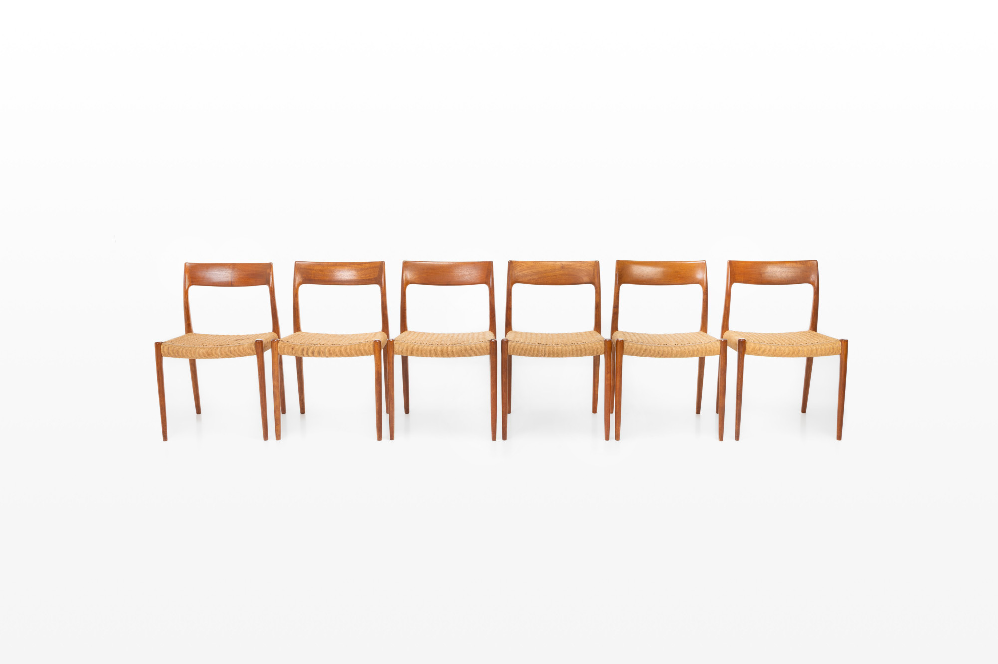 Set of six 'Model 77' dining chairs designed by Niels Otto Moller for J.L. Møllers Møbelfabrik, Denmark 1960s. The chairs have a teak frame and papercord seating.