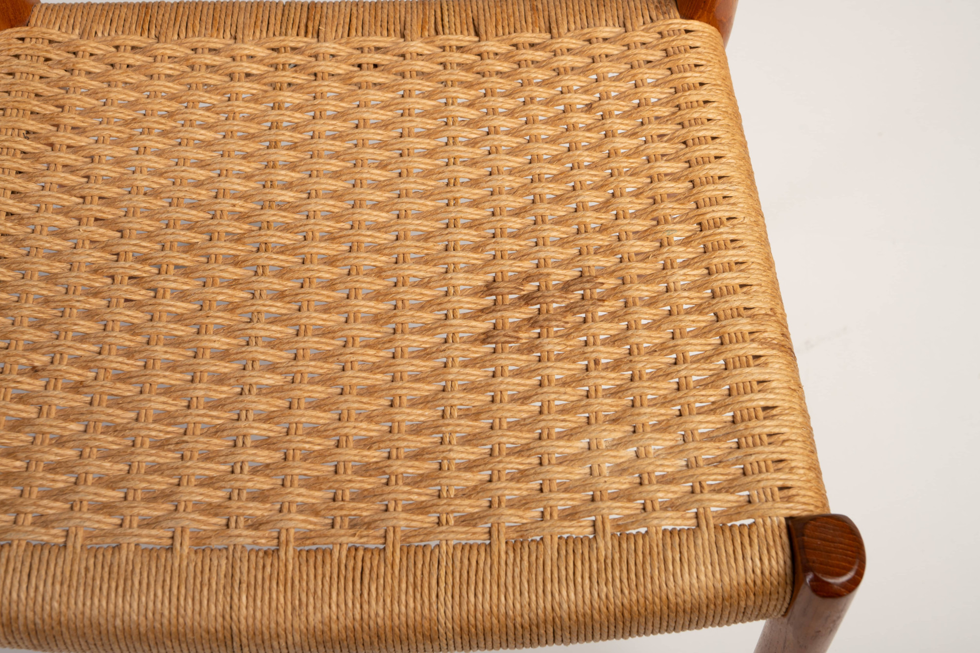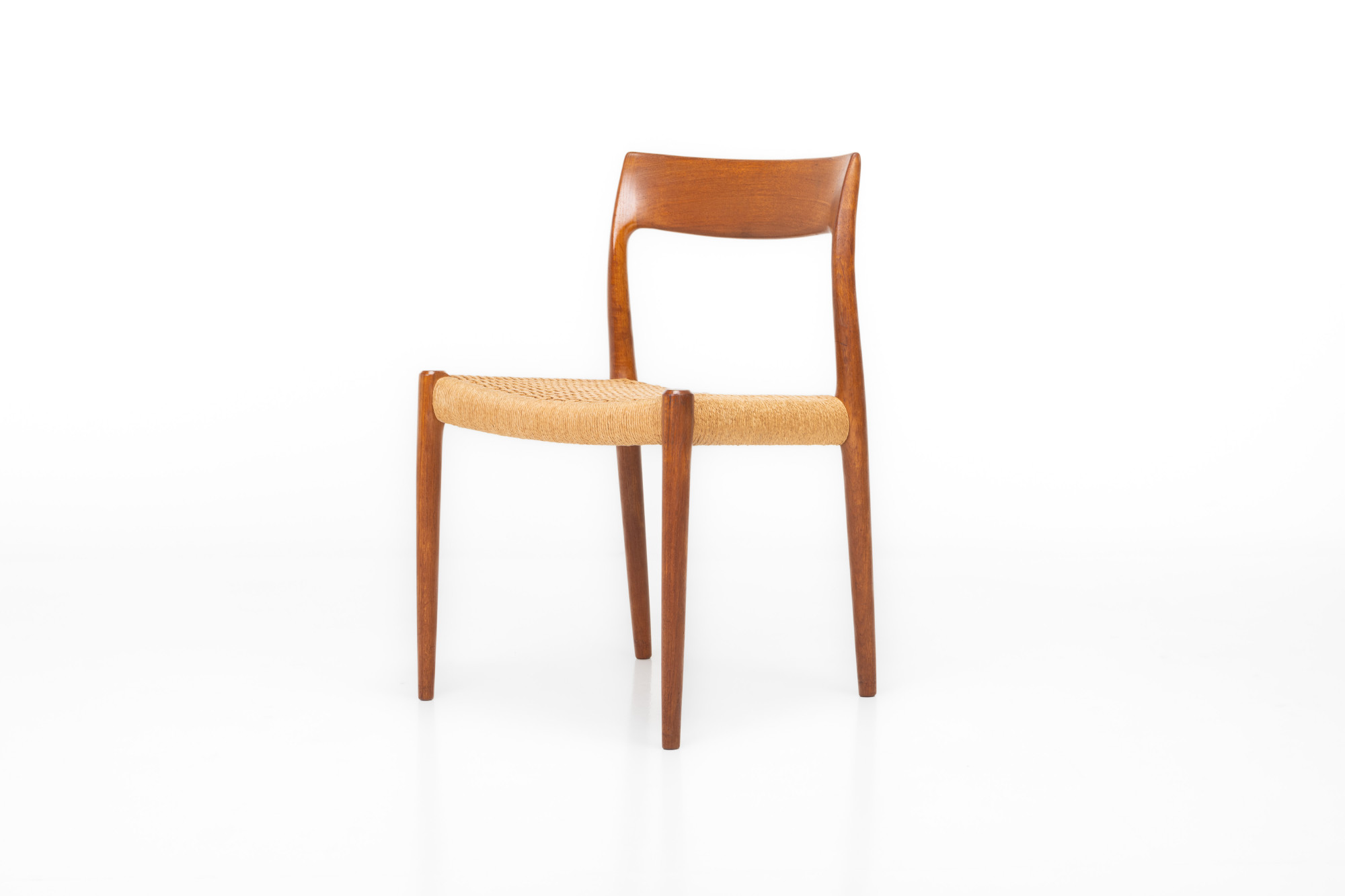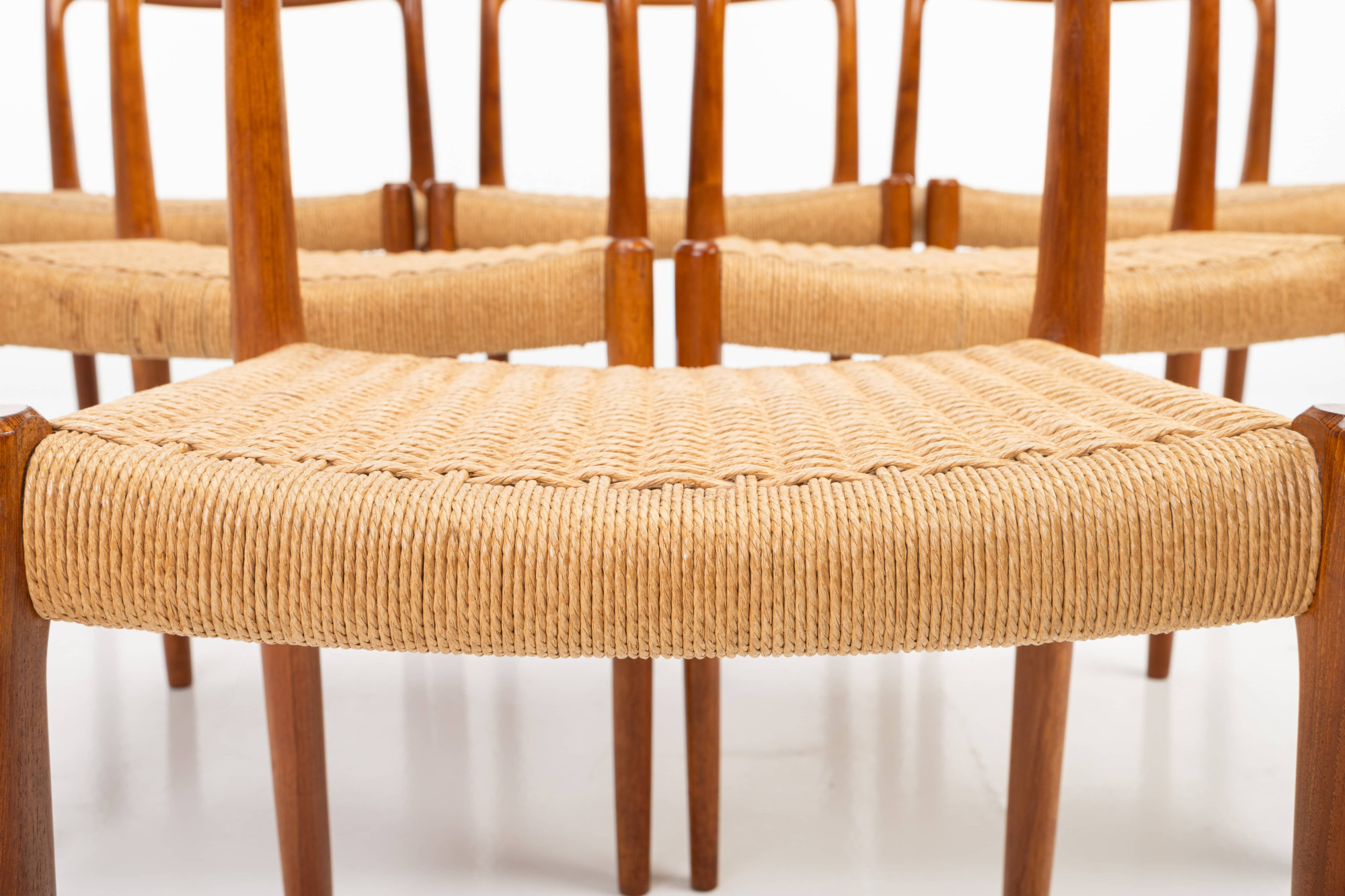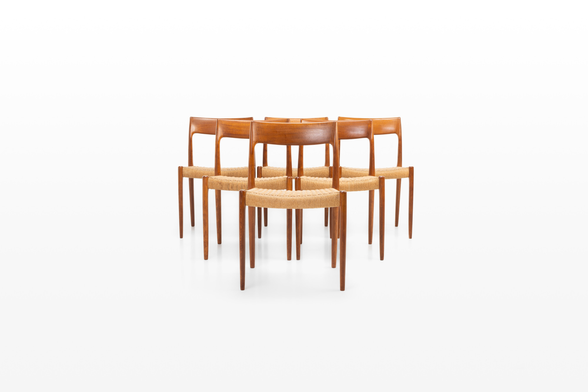 Set of six 'Model 77' dining chairs designed by Niels Otto Moller for J.L. Møllers Møbelfabrik, Denmark 1960s. The chairs have a teak frame and papercord seating.