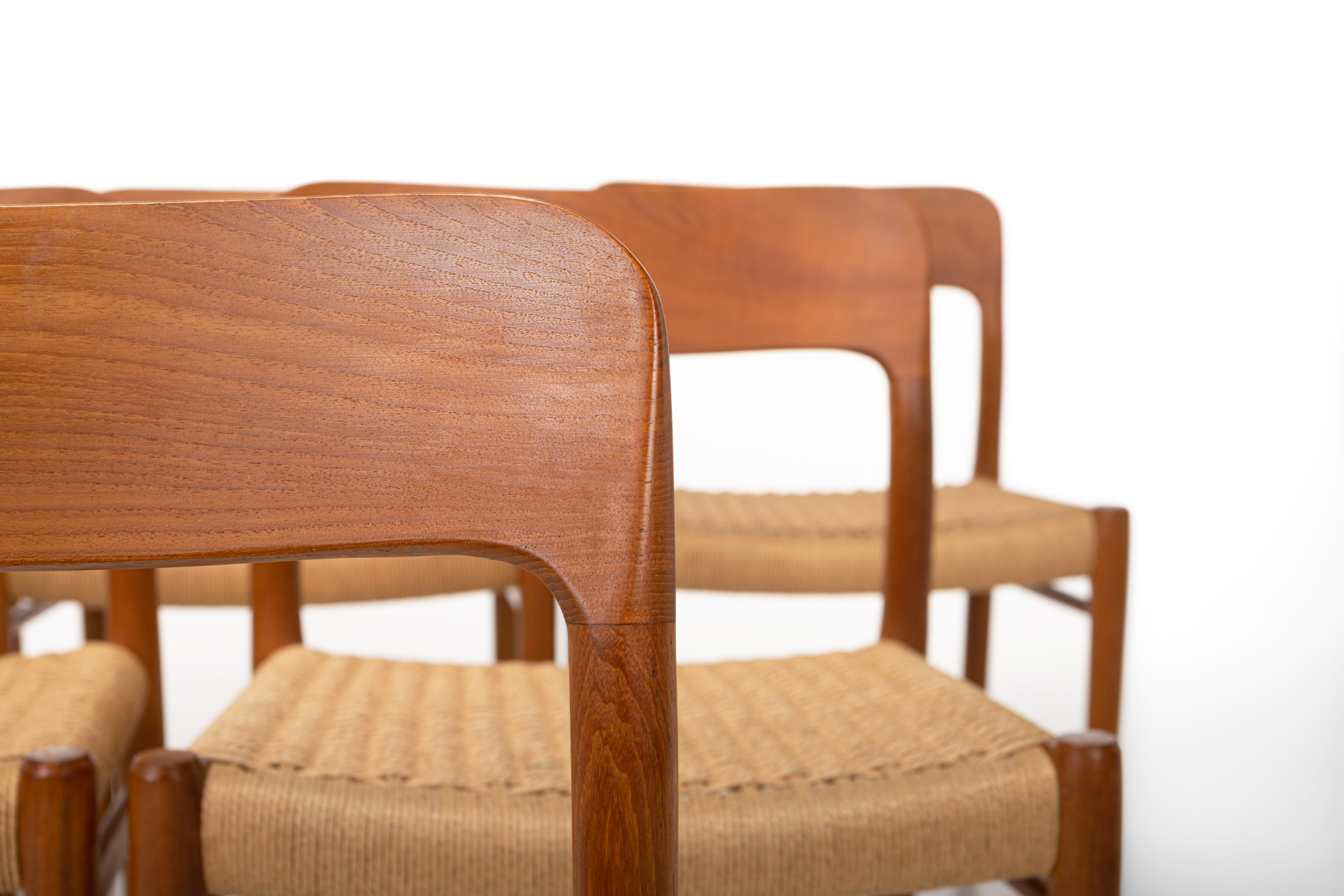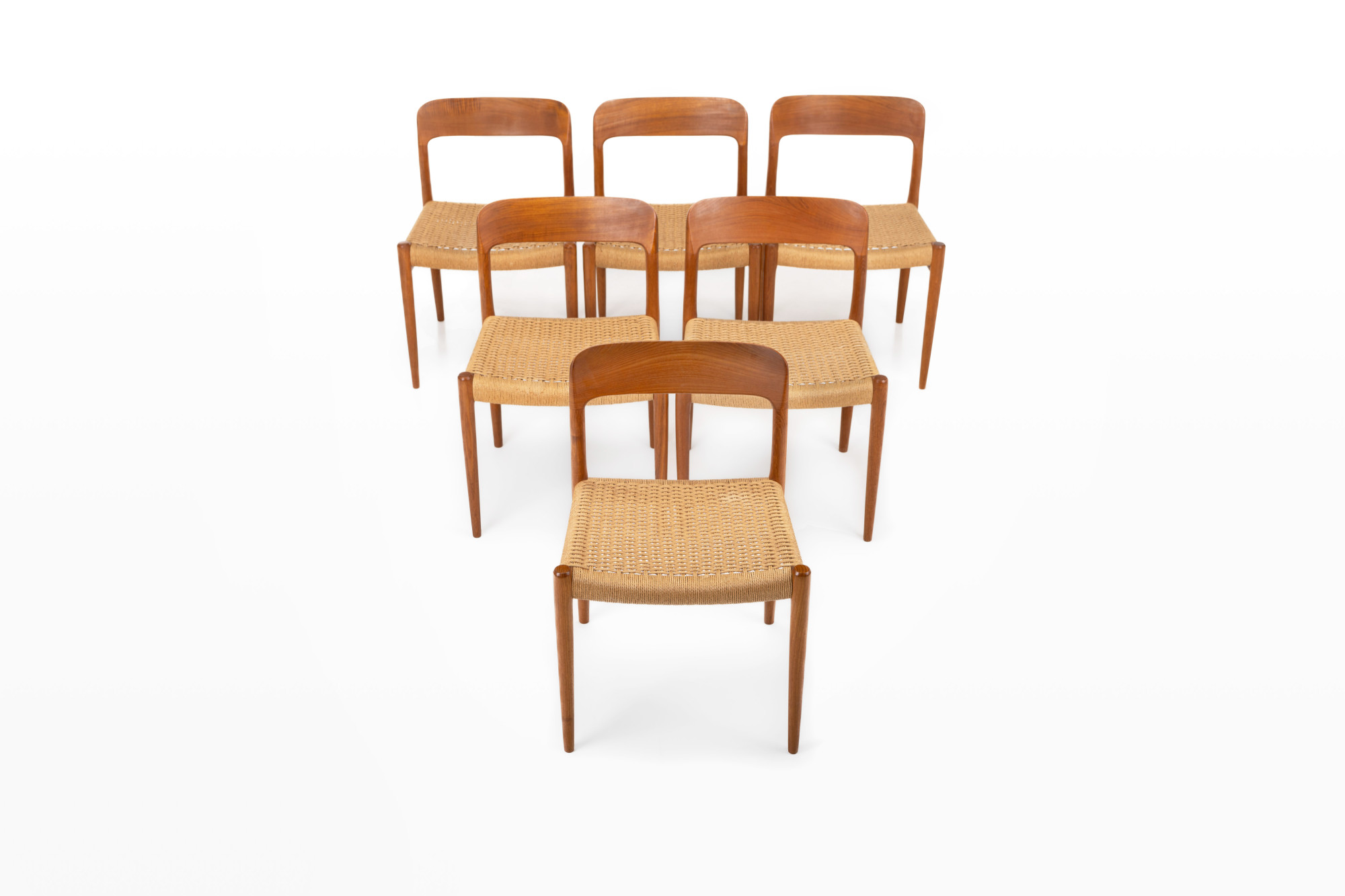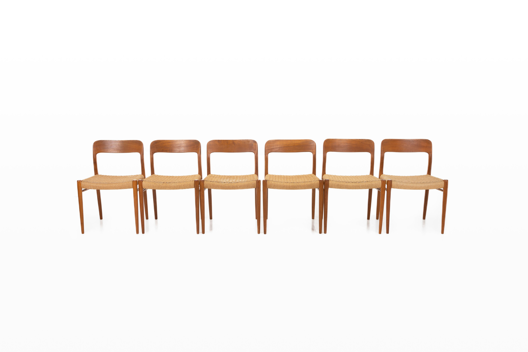 Set of six 'Model 75' dining chairs designed by Niels Otto Moller for J.L. Møllers Møbelfabrik, Denmark 1960s. The chairs have a teak frame and papercord seating