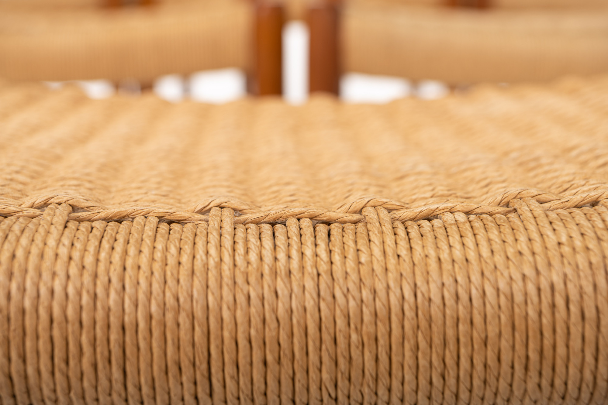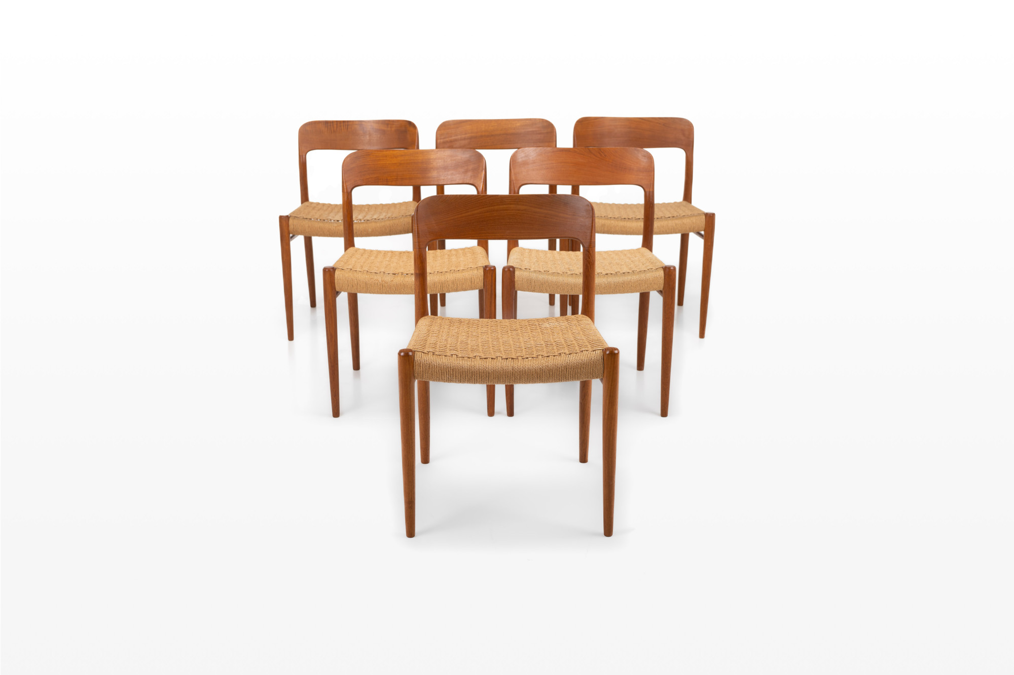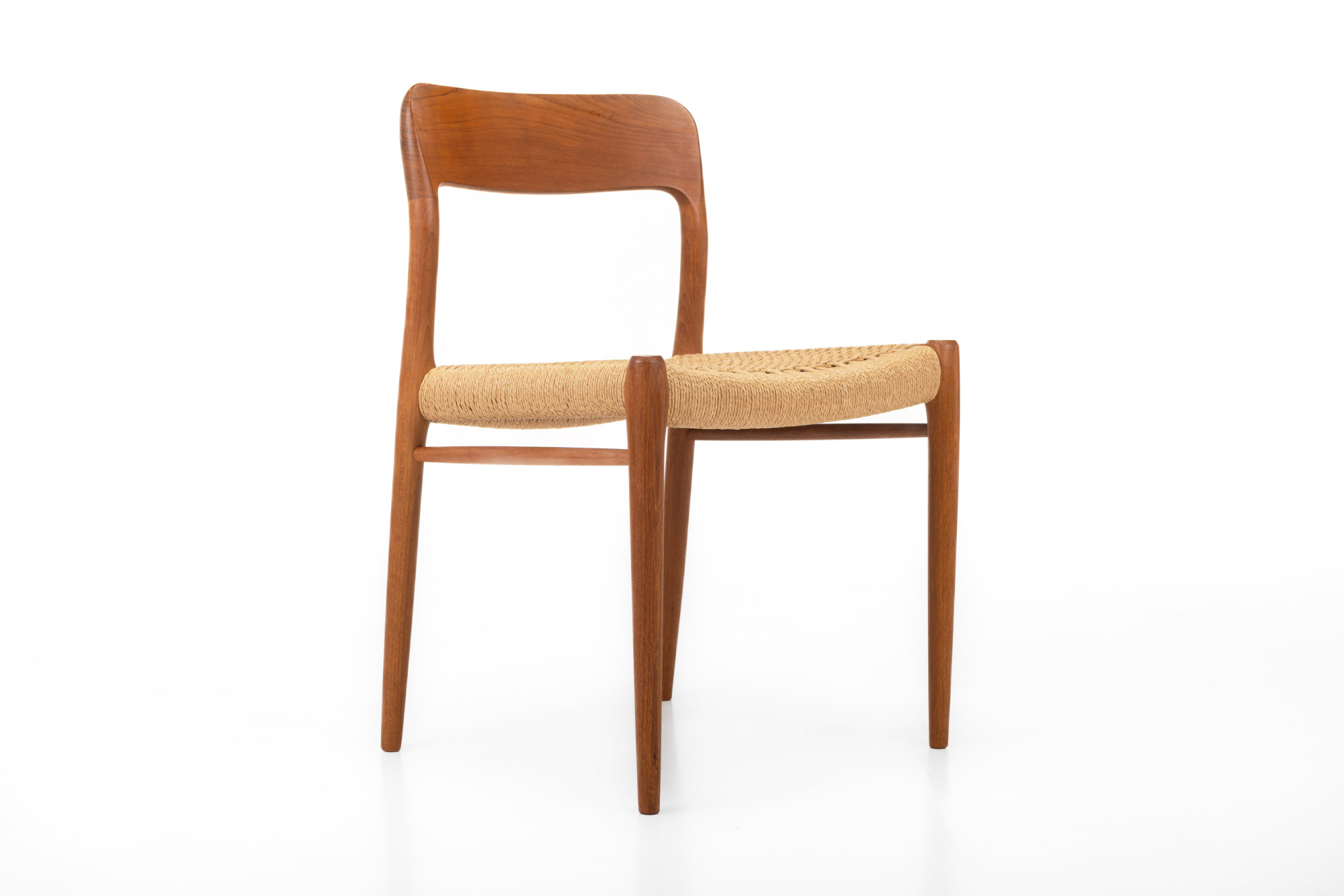 Set of six 'Model 75' dining chairs designed by Niels Otto Moller for J.L. Møllers Møbelfabrik, Denmark 1960s. The chairs have a teak frame and papercord seating