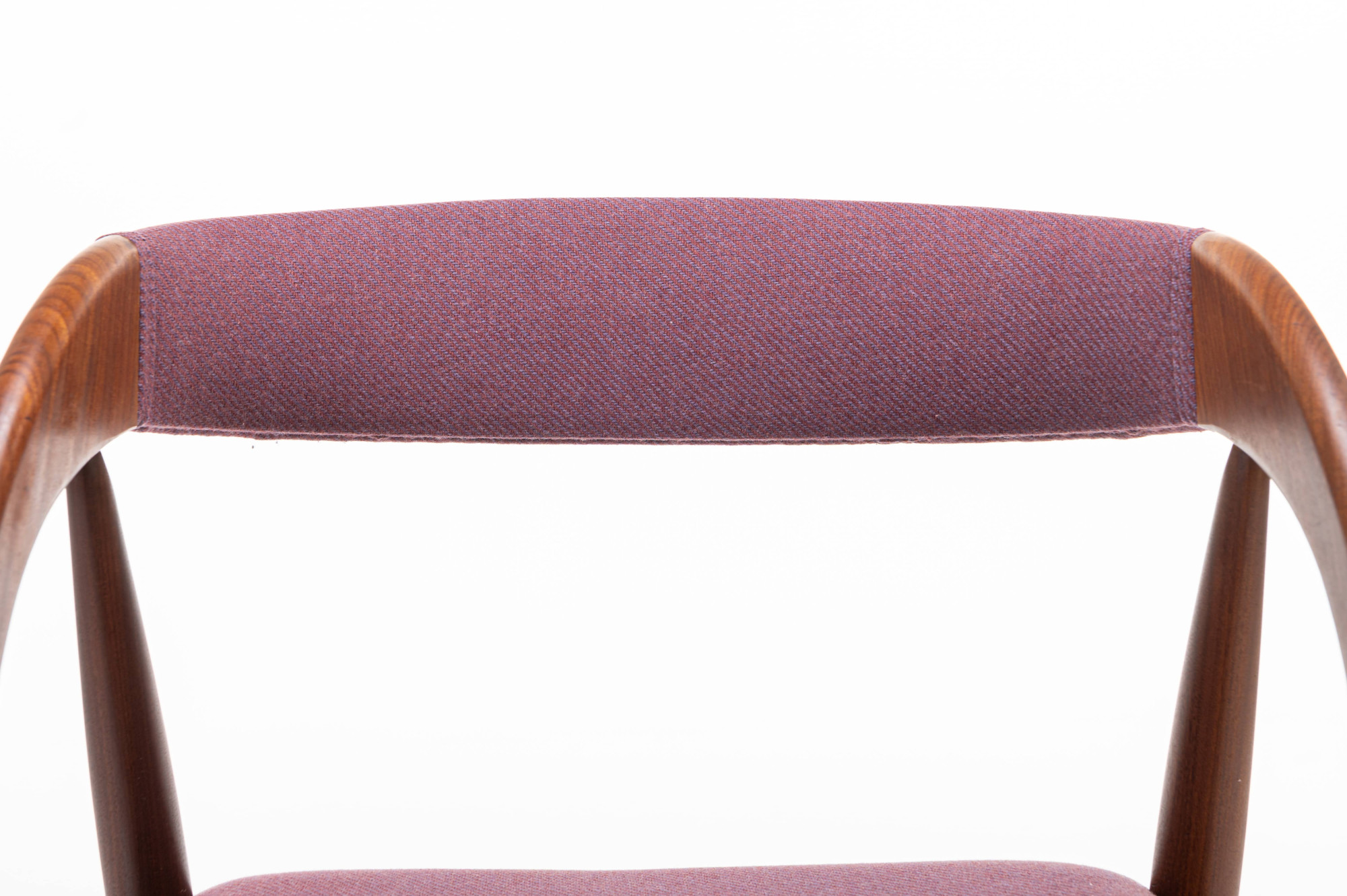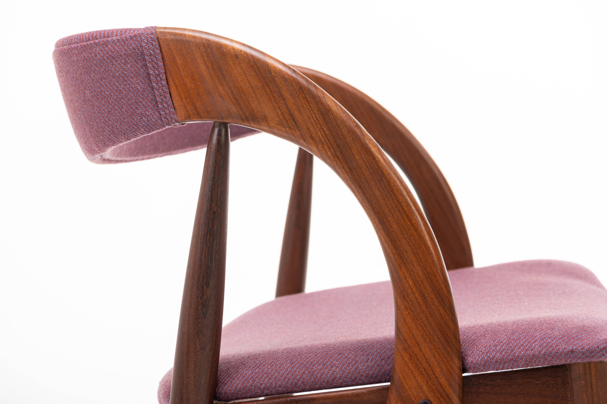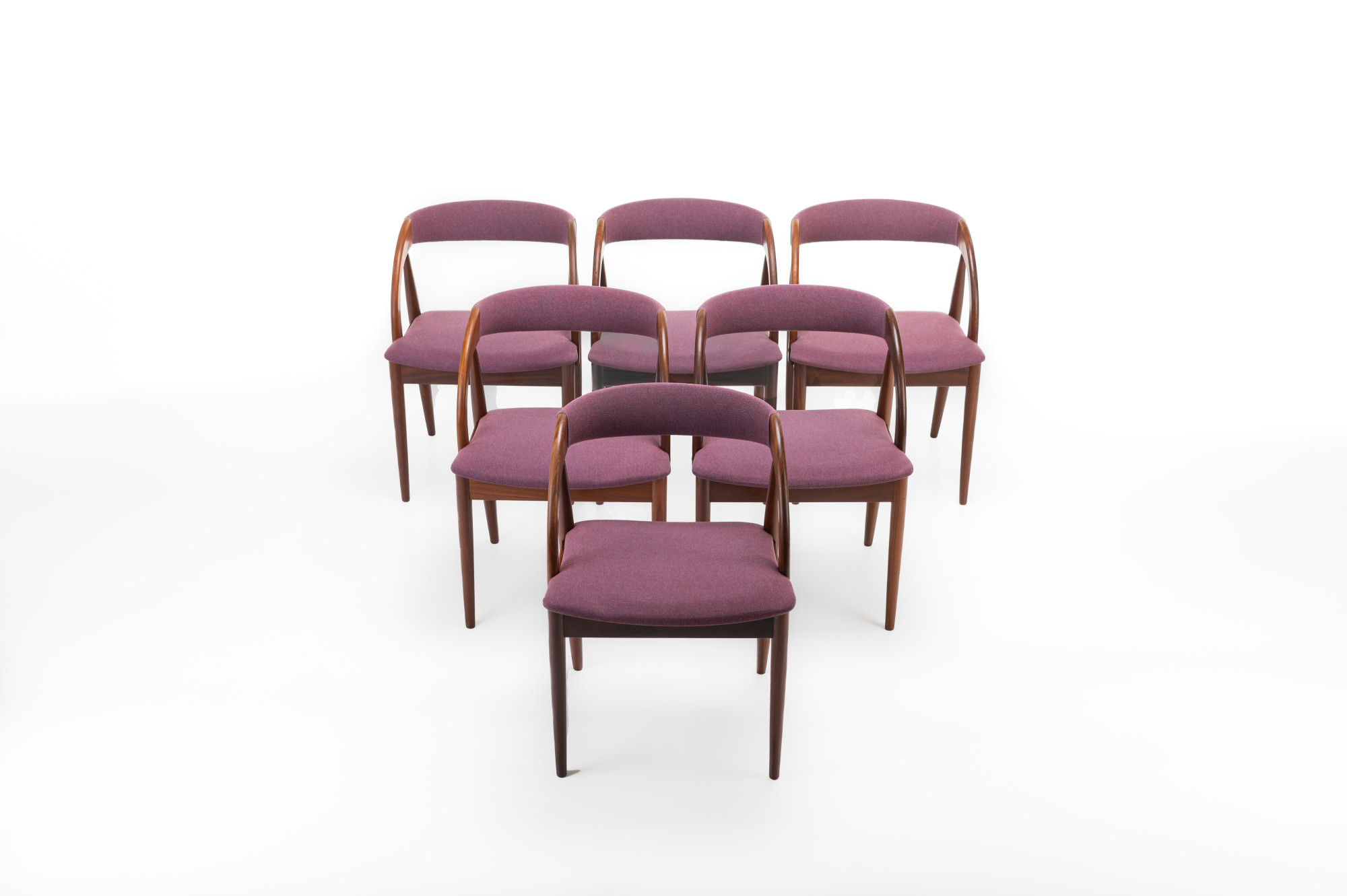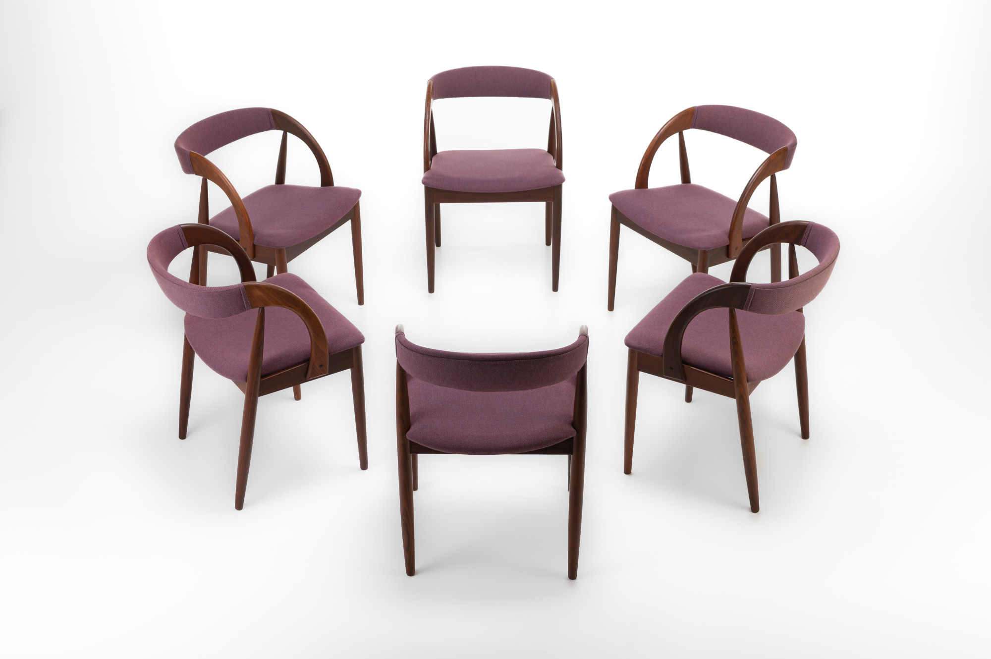 Set of 6 vintage Danish dining chairs. The chairs have a teak frame and purple upholstery.