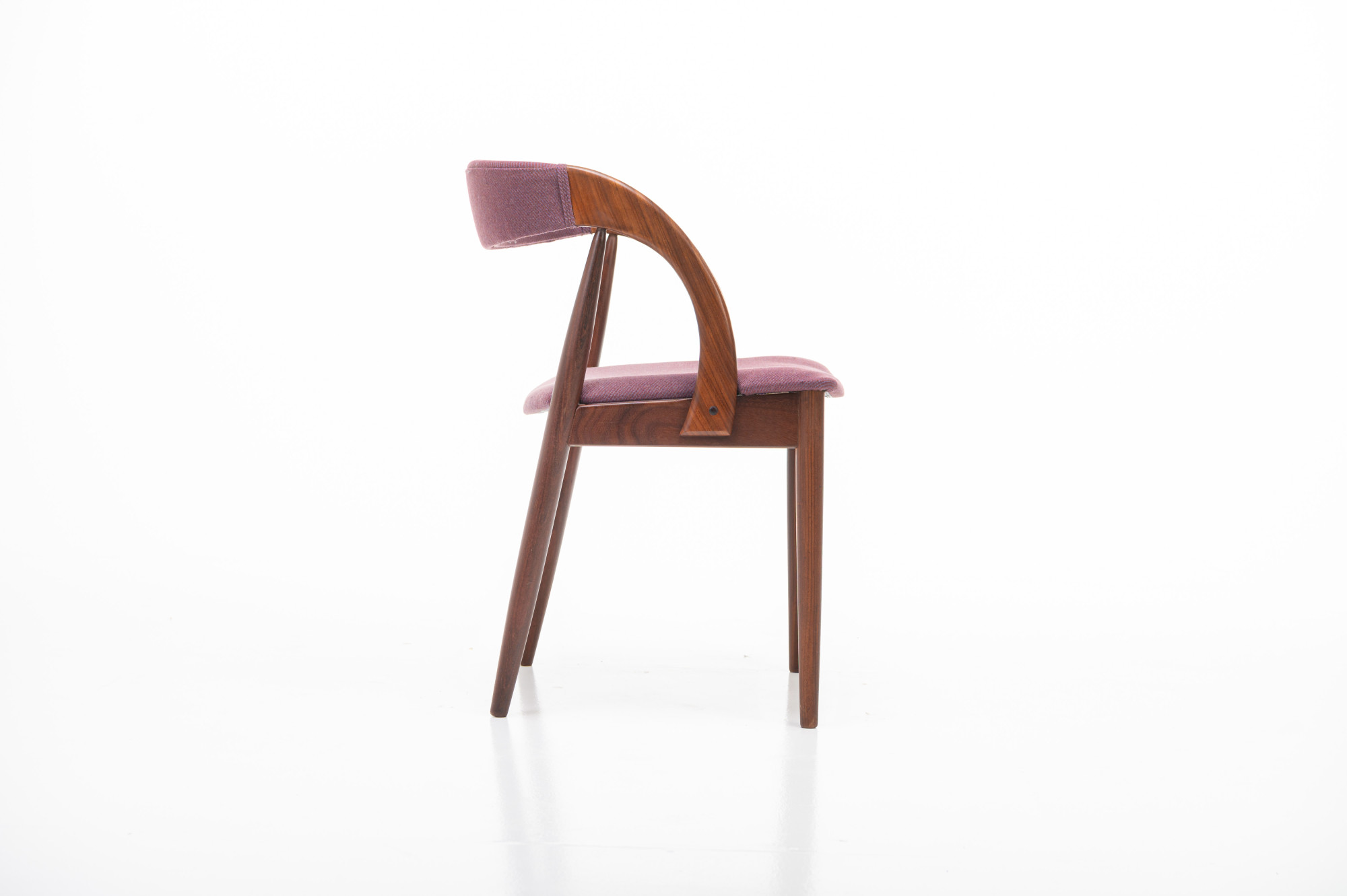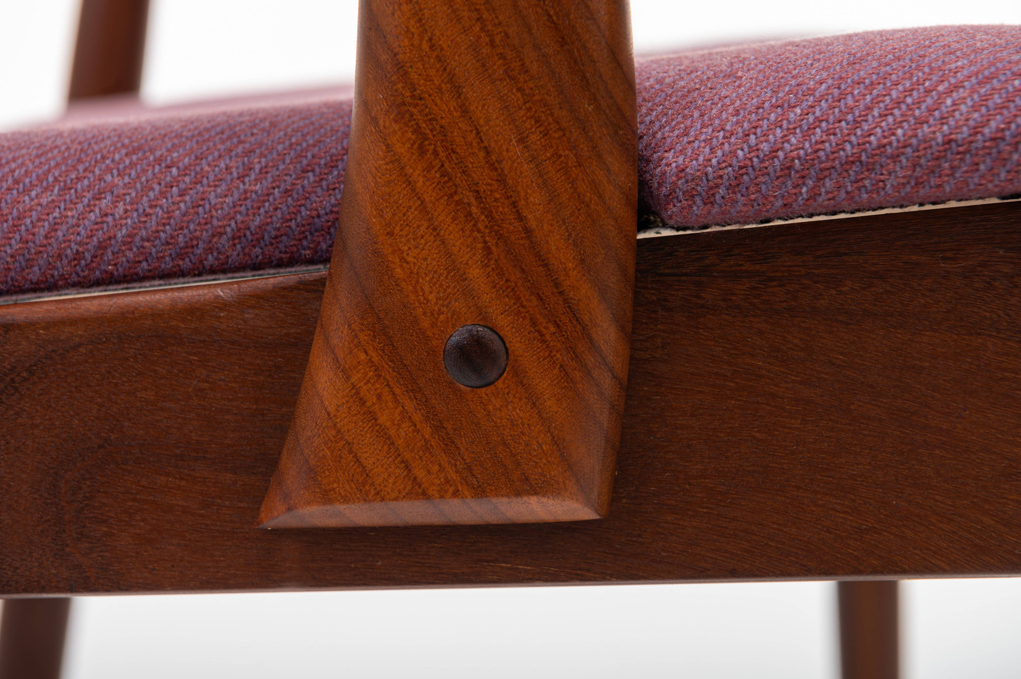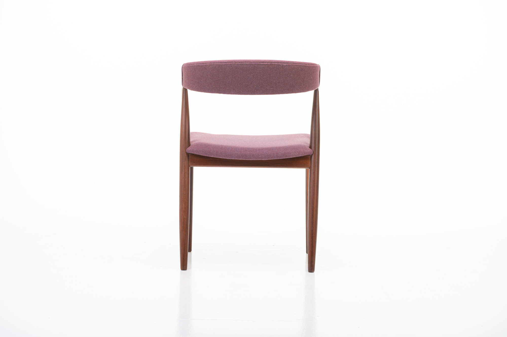 Set of 6 vintage Danish dining chairs. The chairs have a teak frame and purple upholstery.