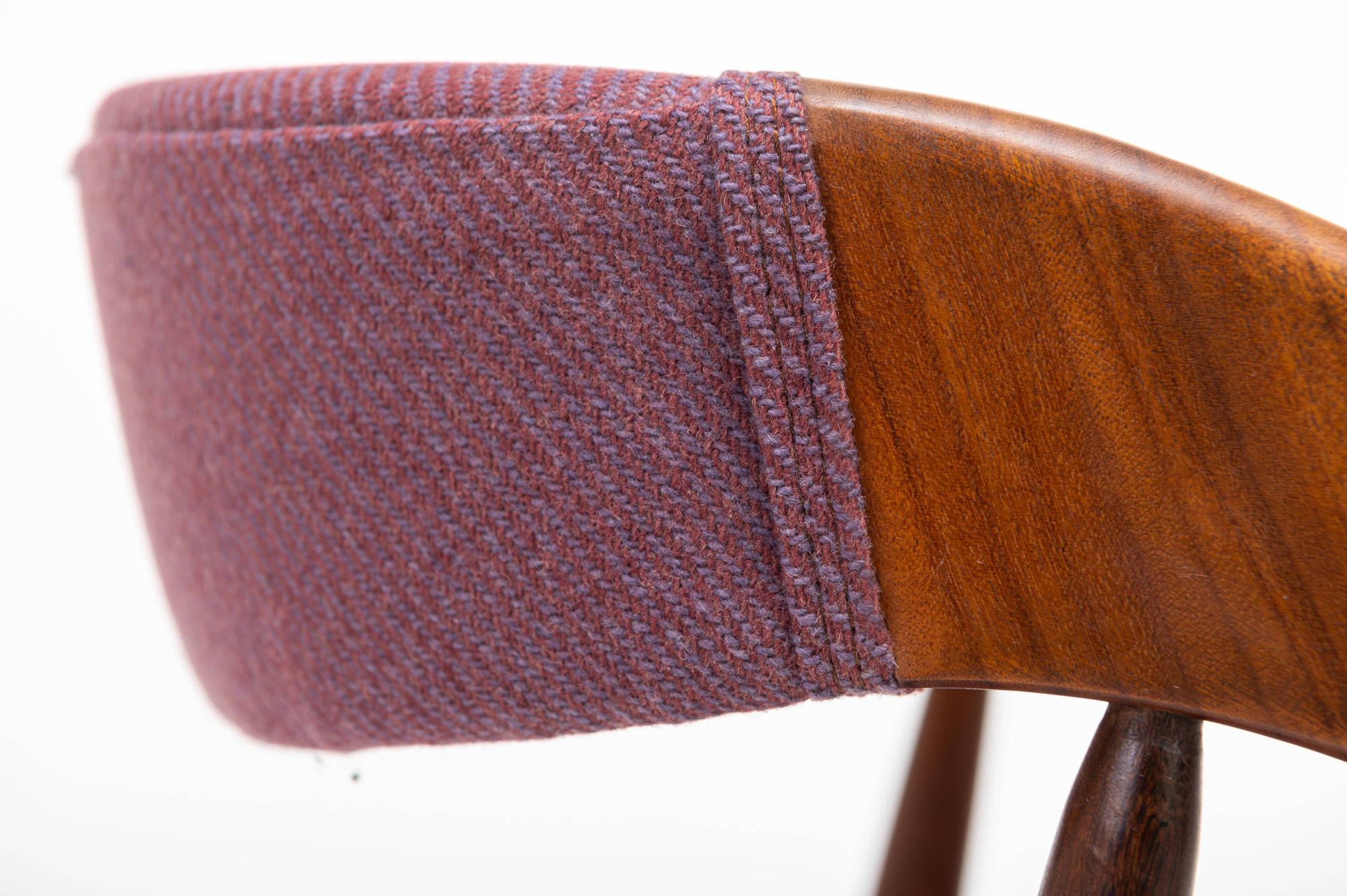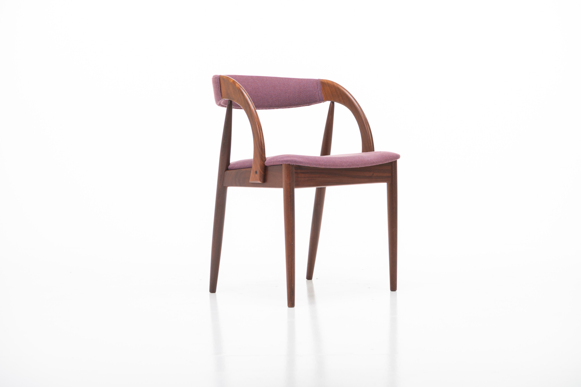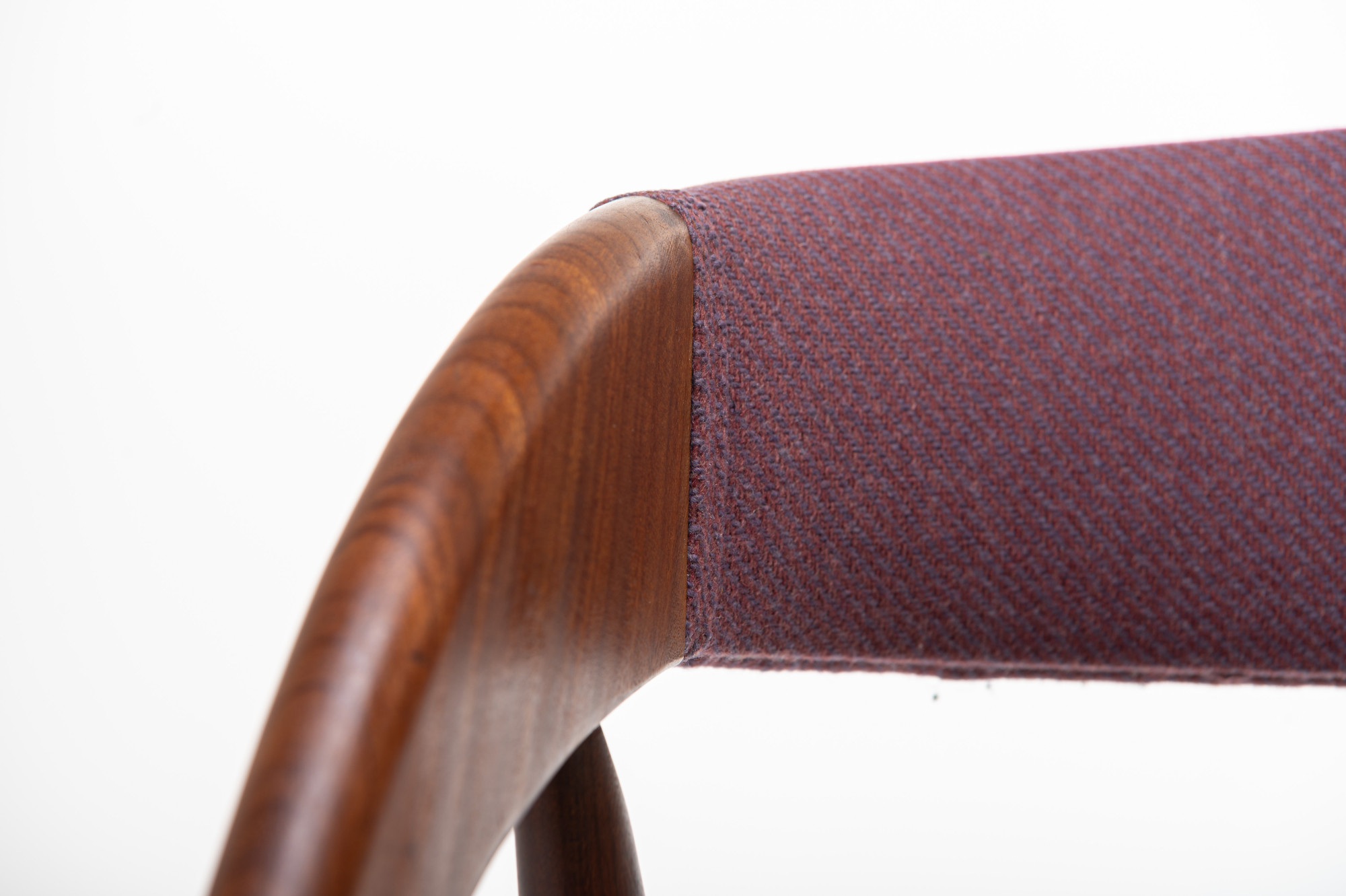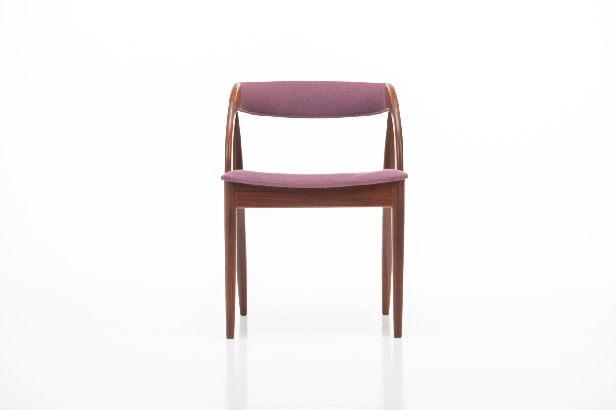 Set of 6 vintage Danish dining chairs. The chairs have a teak frame and purple upholstery.