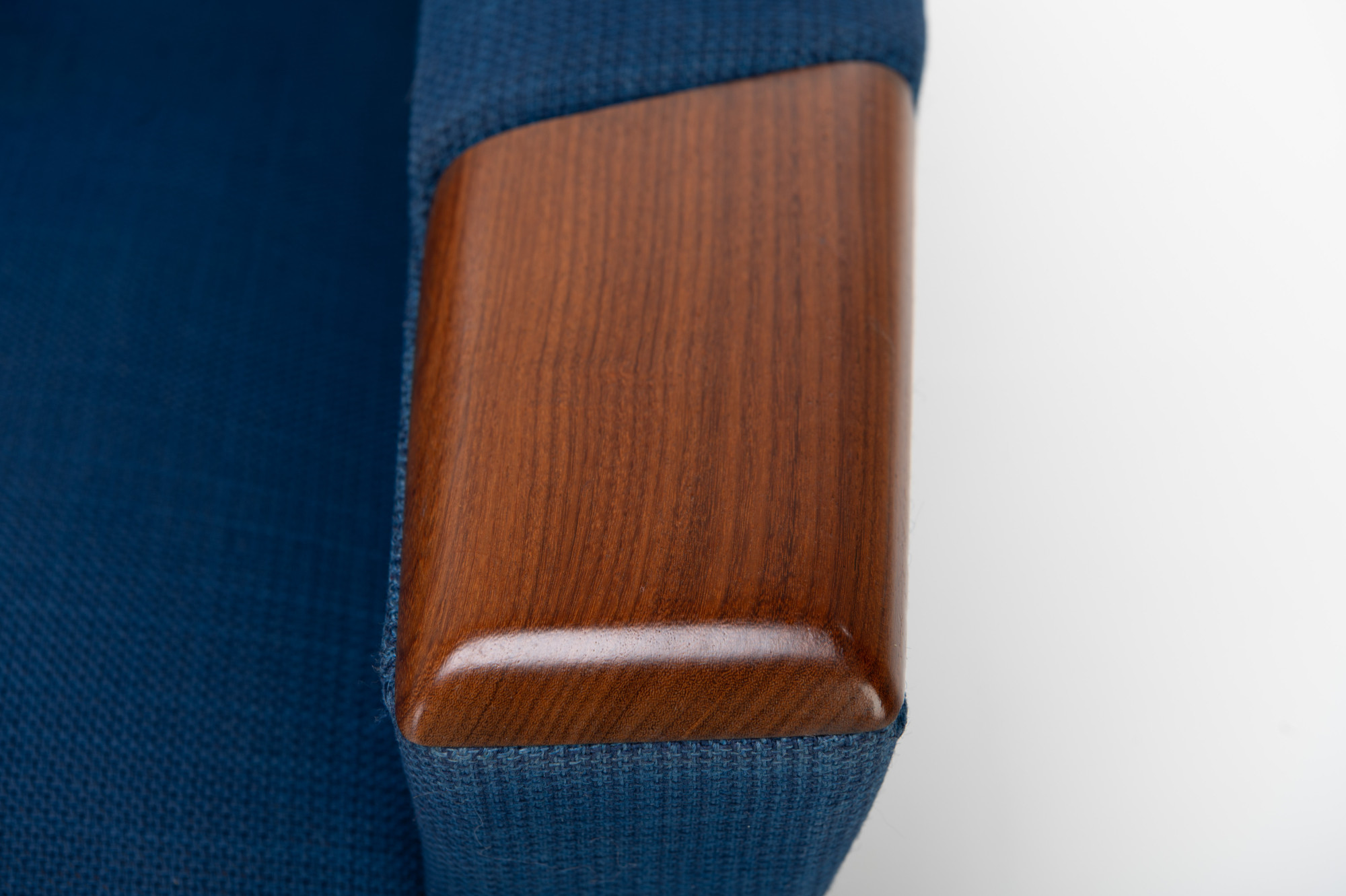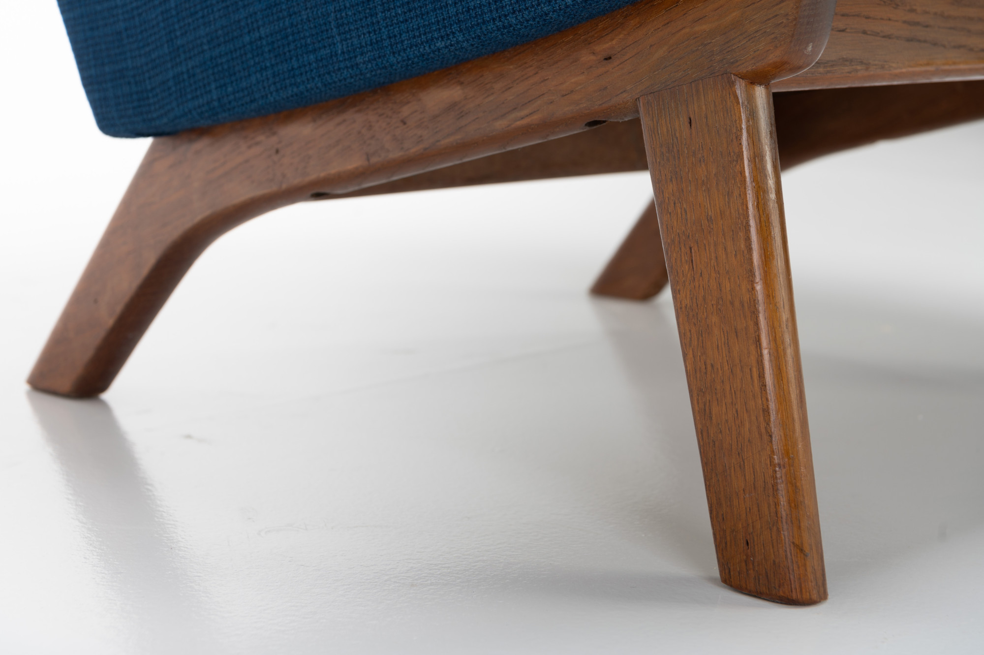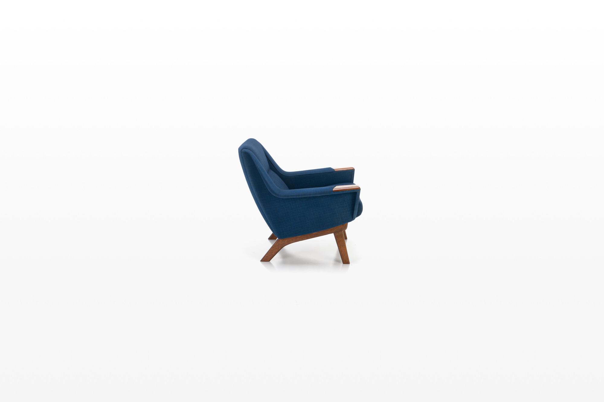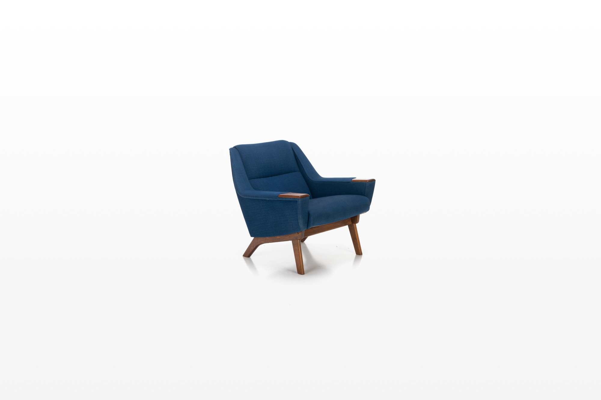 Danish vintage easy chair with a wooden frame and the original blue upholstery. The fabric of the easy chair has been completely cleaned. The chair is still in beautiful vintage condition with signs of wear.