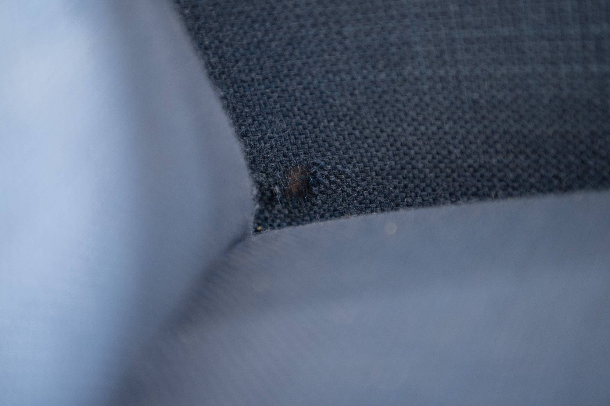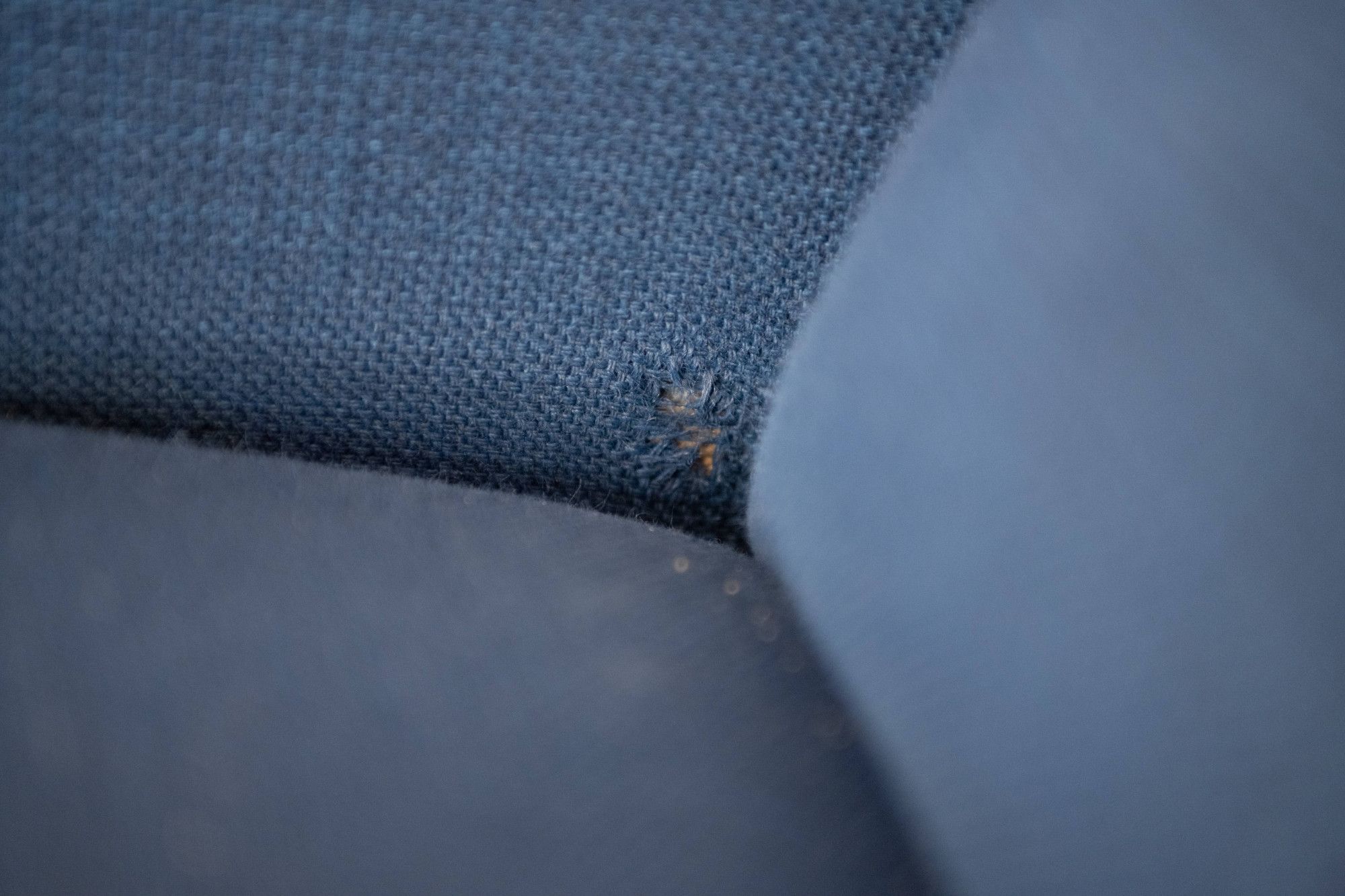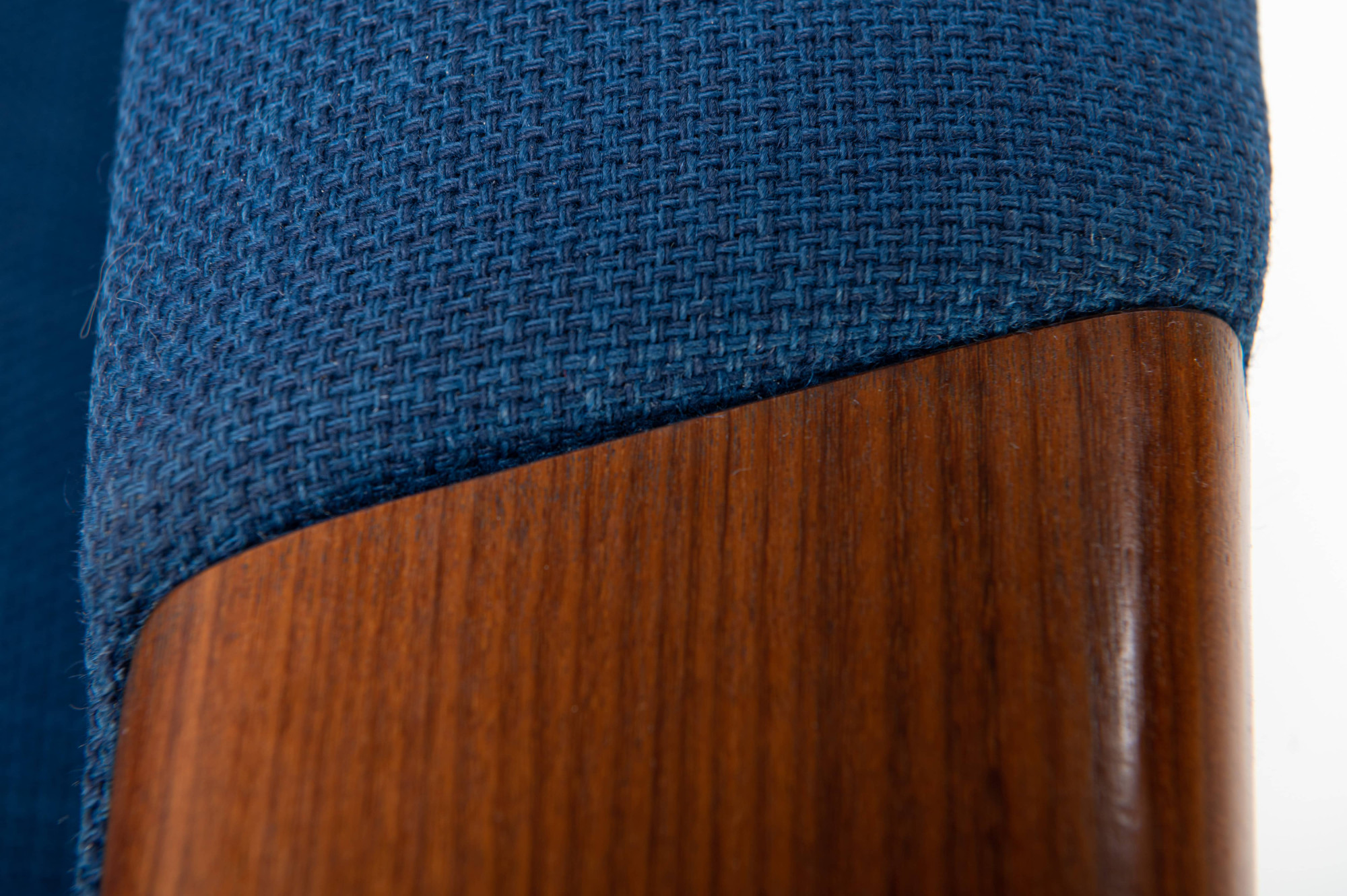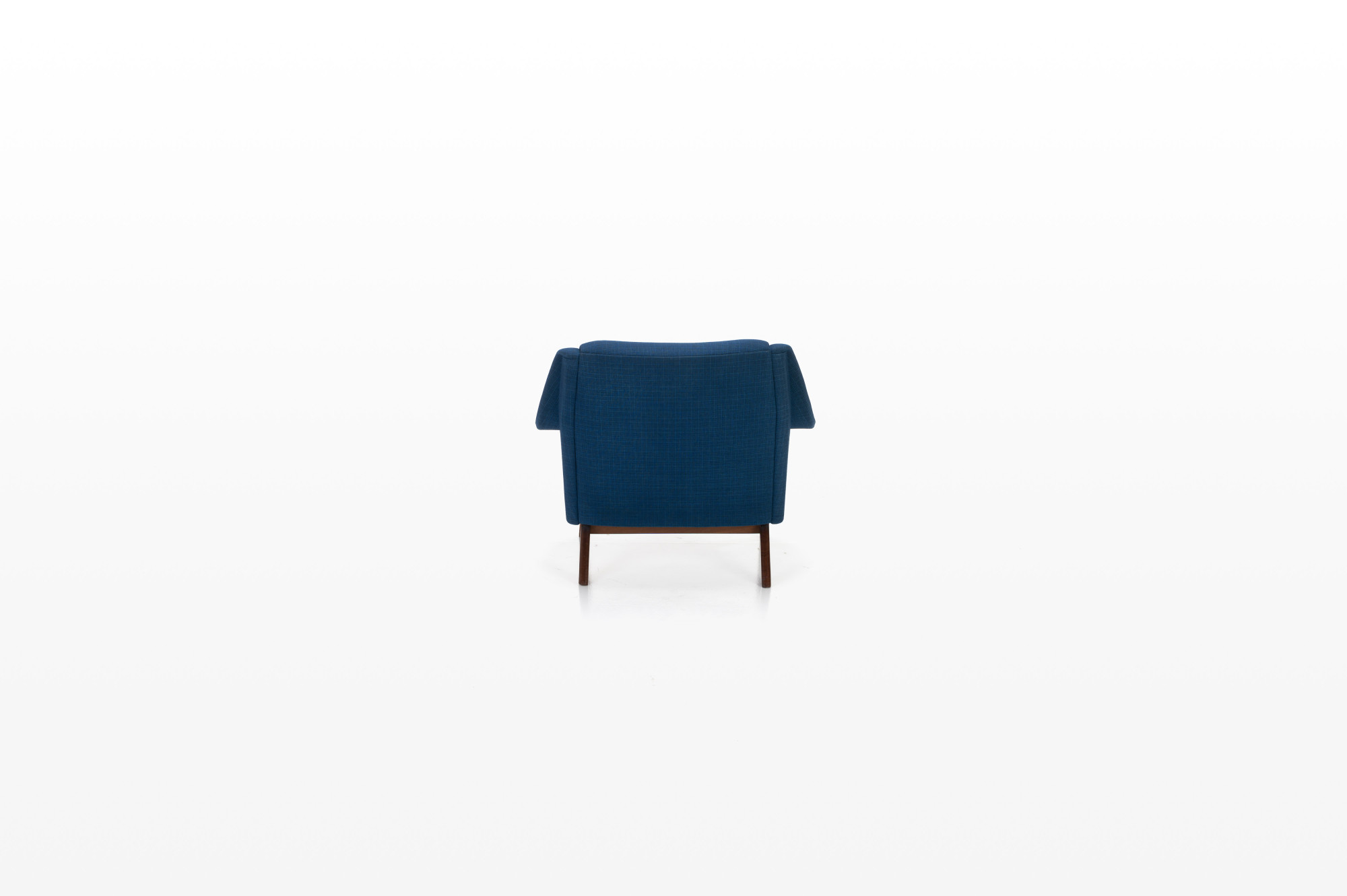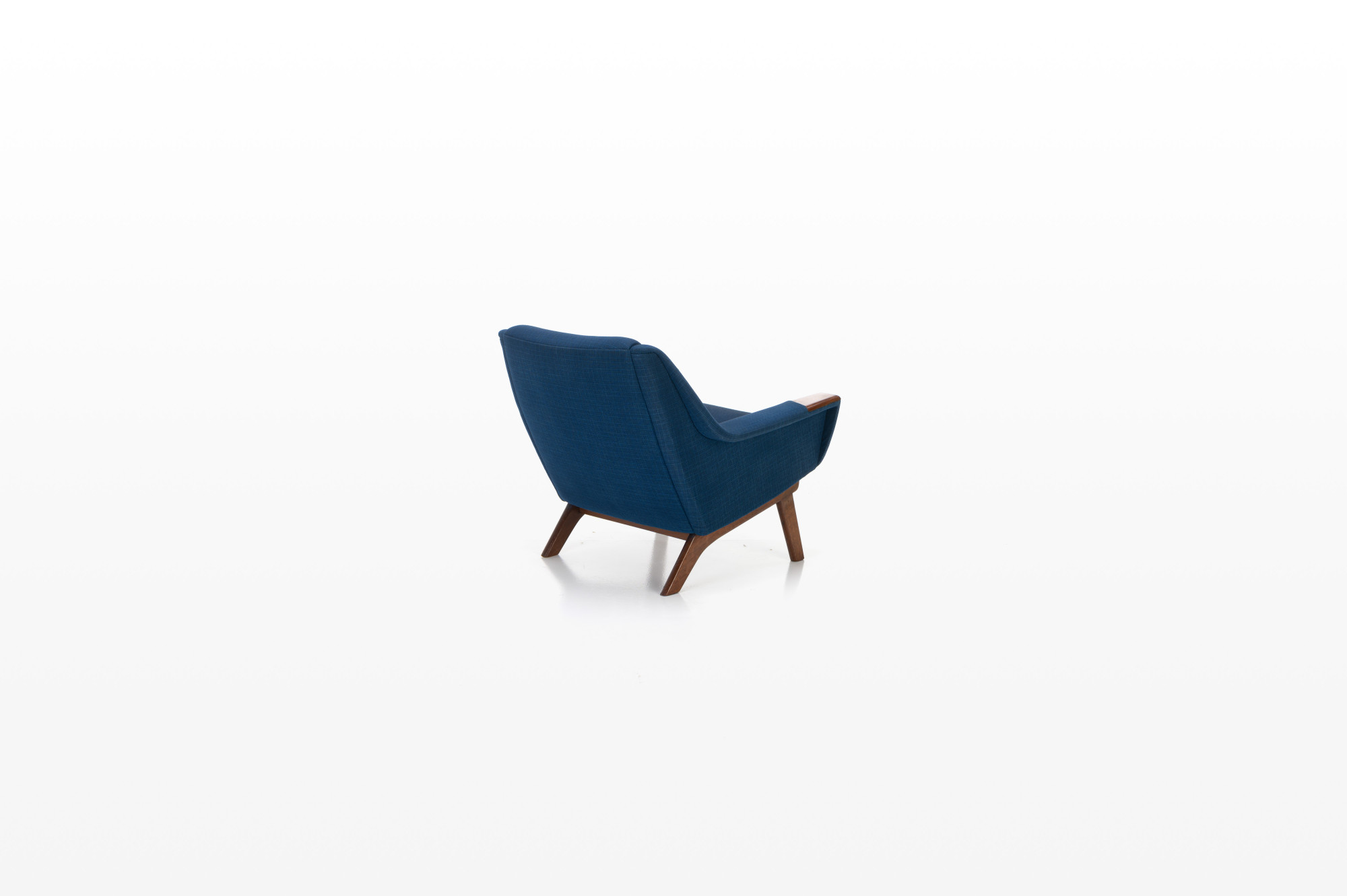 Danish vintage easy chair with a wooden frame and the original blue upholstery. The fabric of the easy chair has been completely cleaned. The chair is still in beautiful vintage condition with signs of wear.
