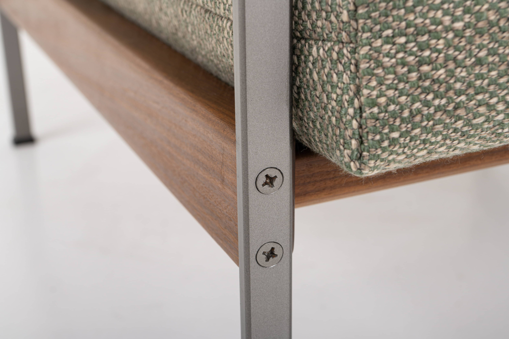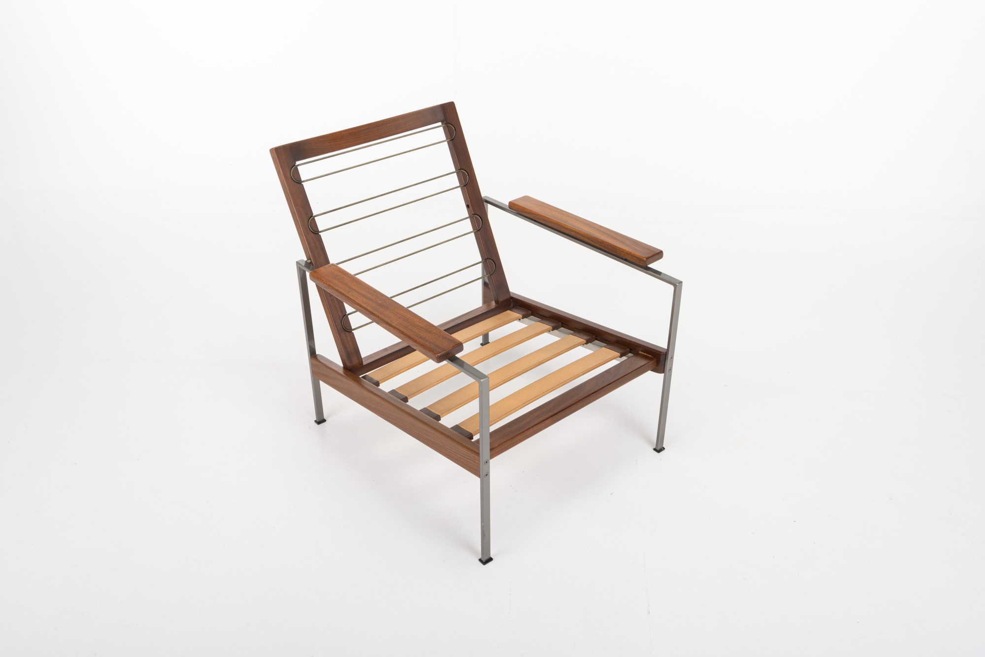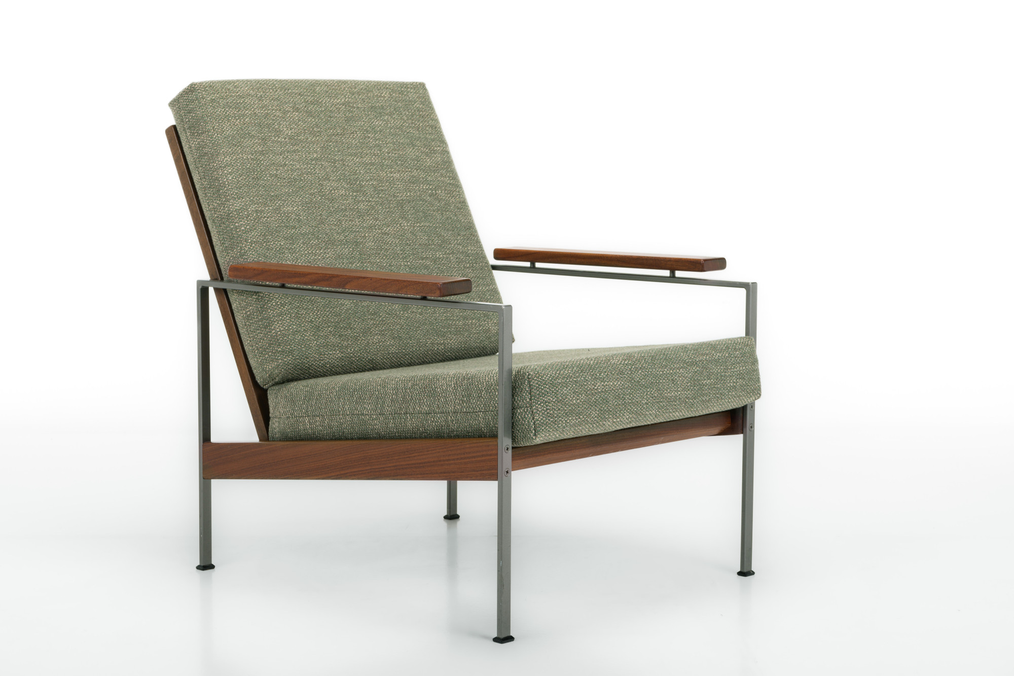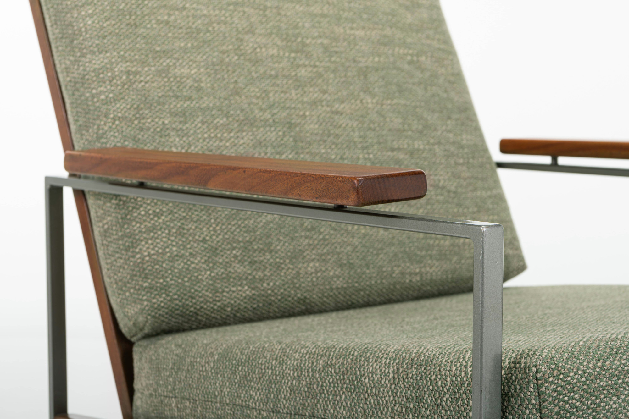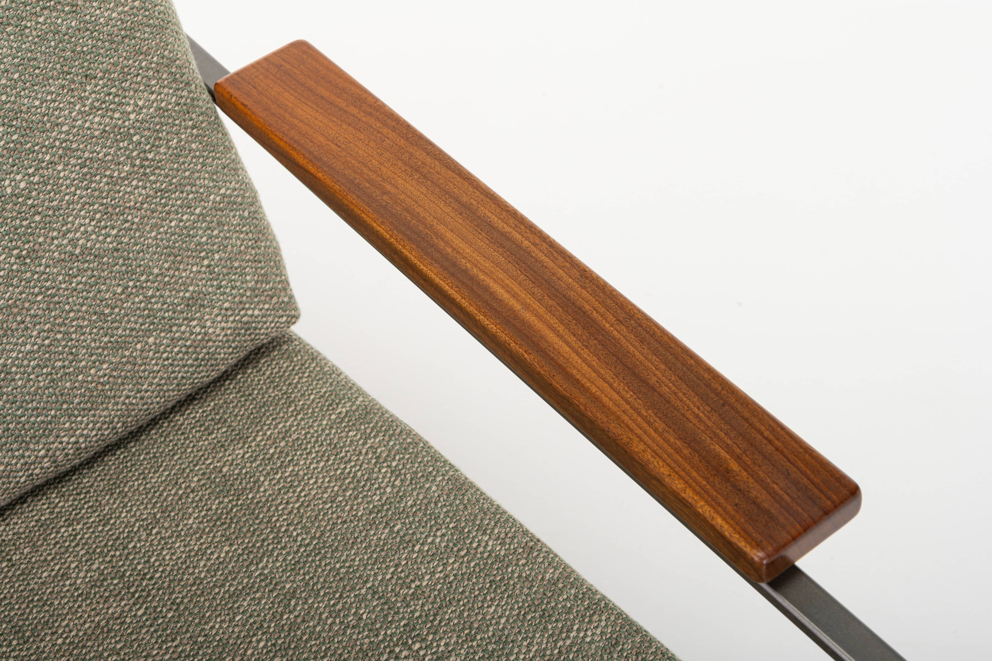 Minimalist easy chair designed by Rob Parry for Gelderland. Produced in the Netherlands in the 1960s. The armchair has an iron frame and a teak armrest. The cushions have been reupholstered in a gray-green fabric. We also have a matching sofa available, shown in the last pictures.