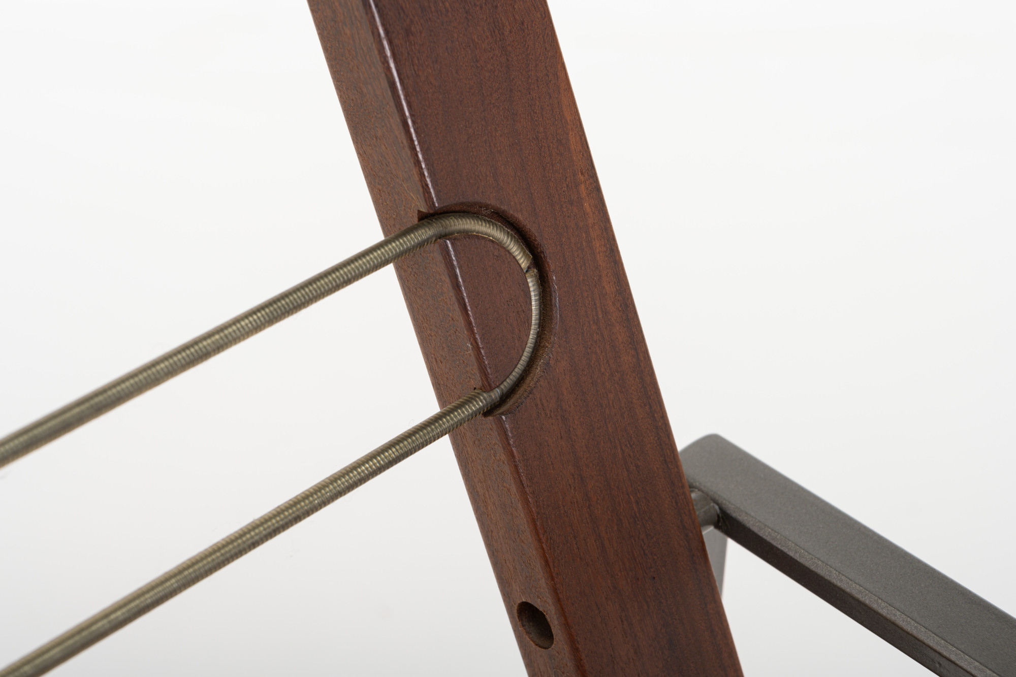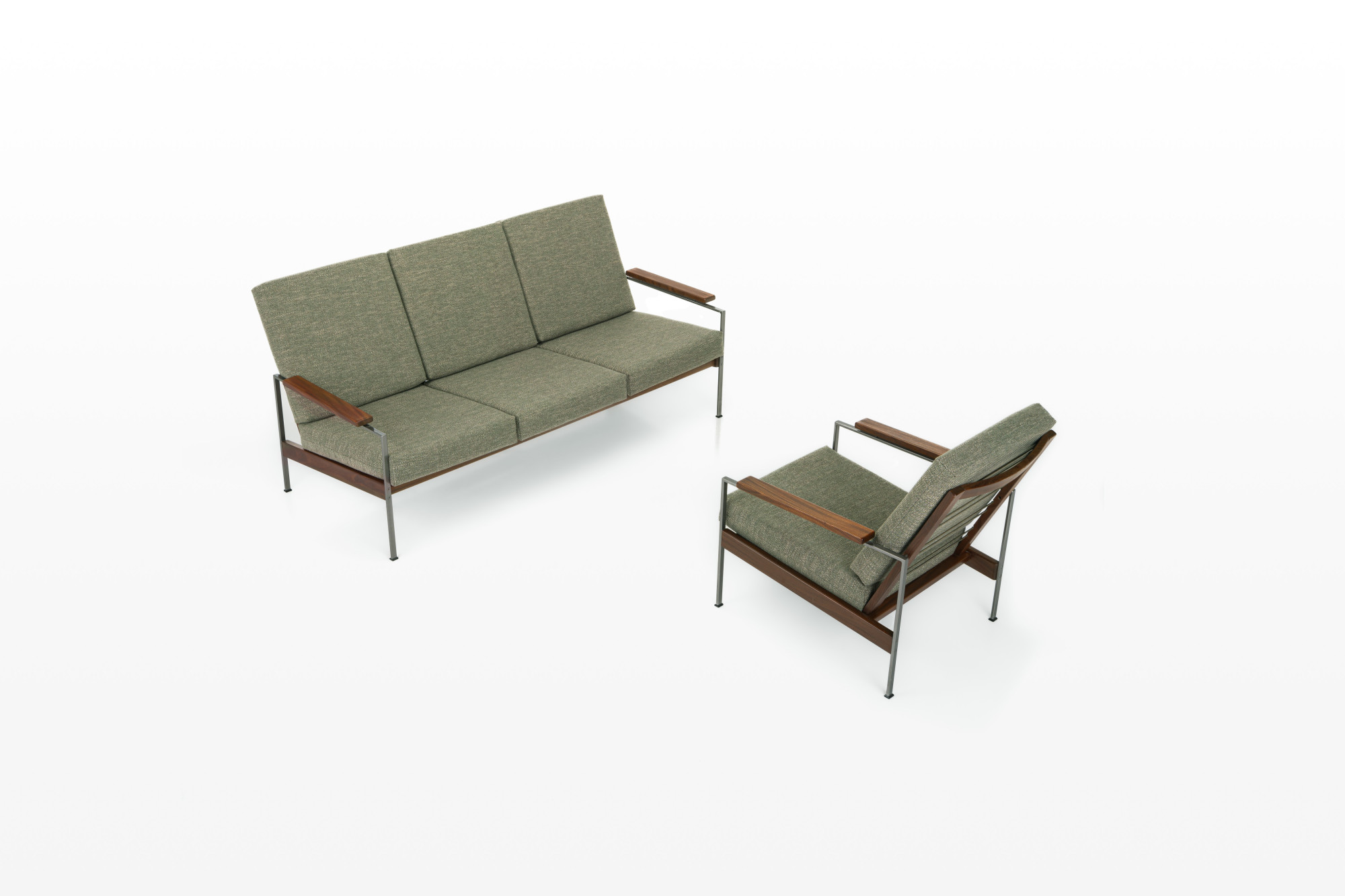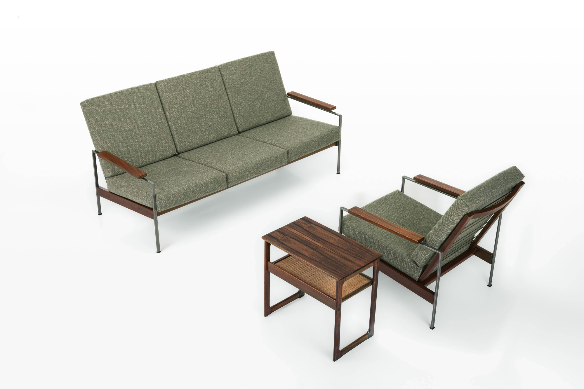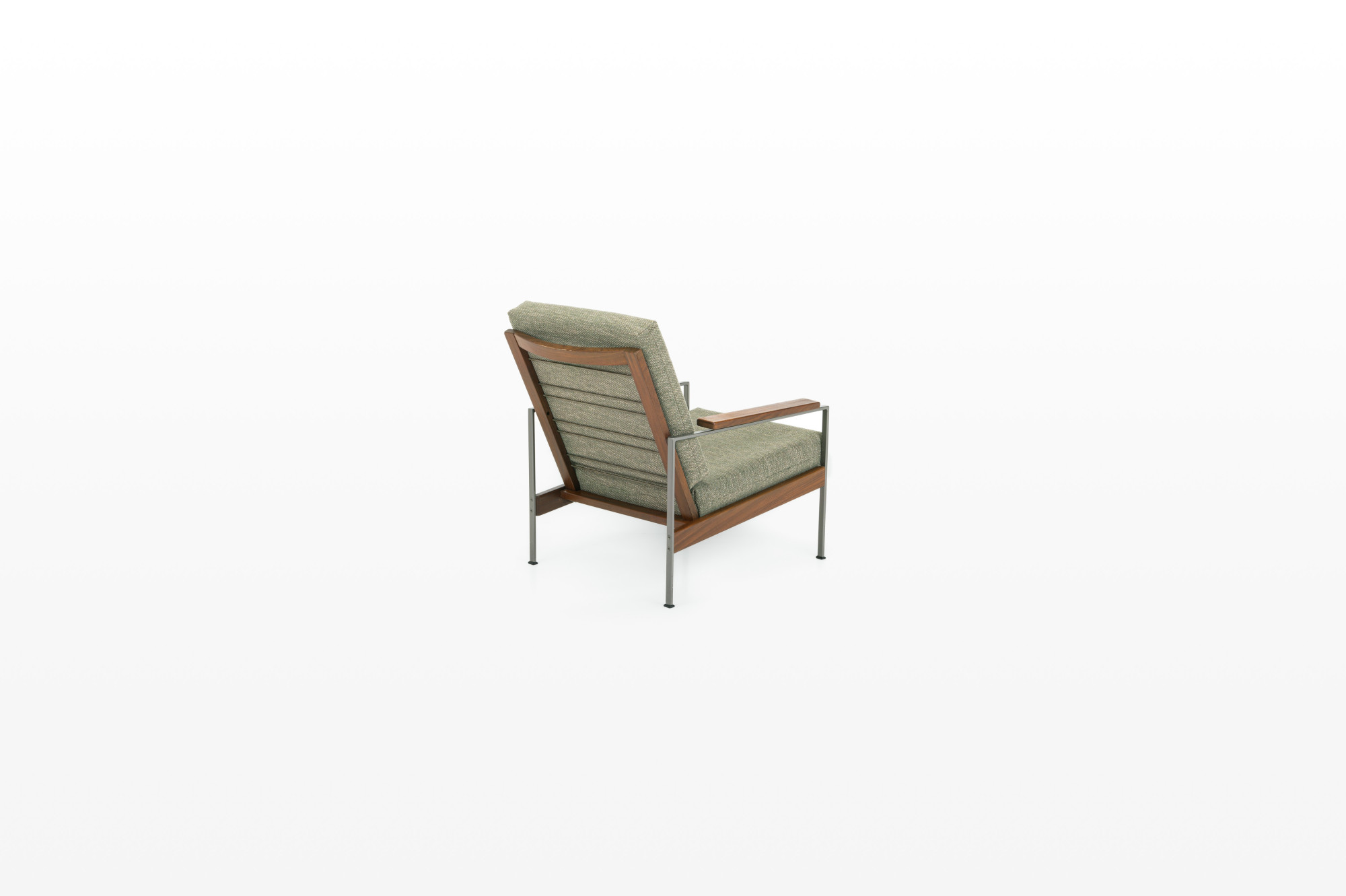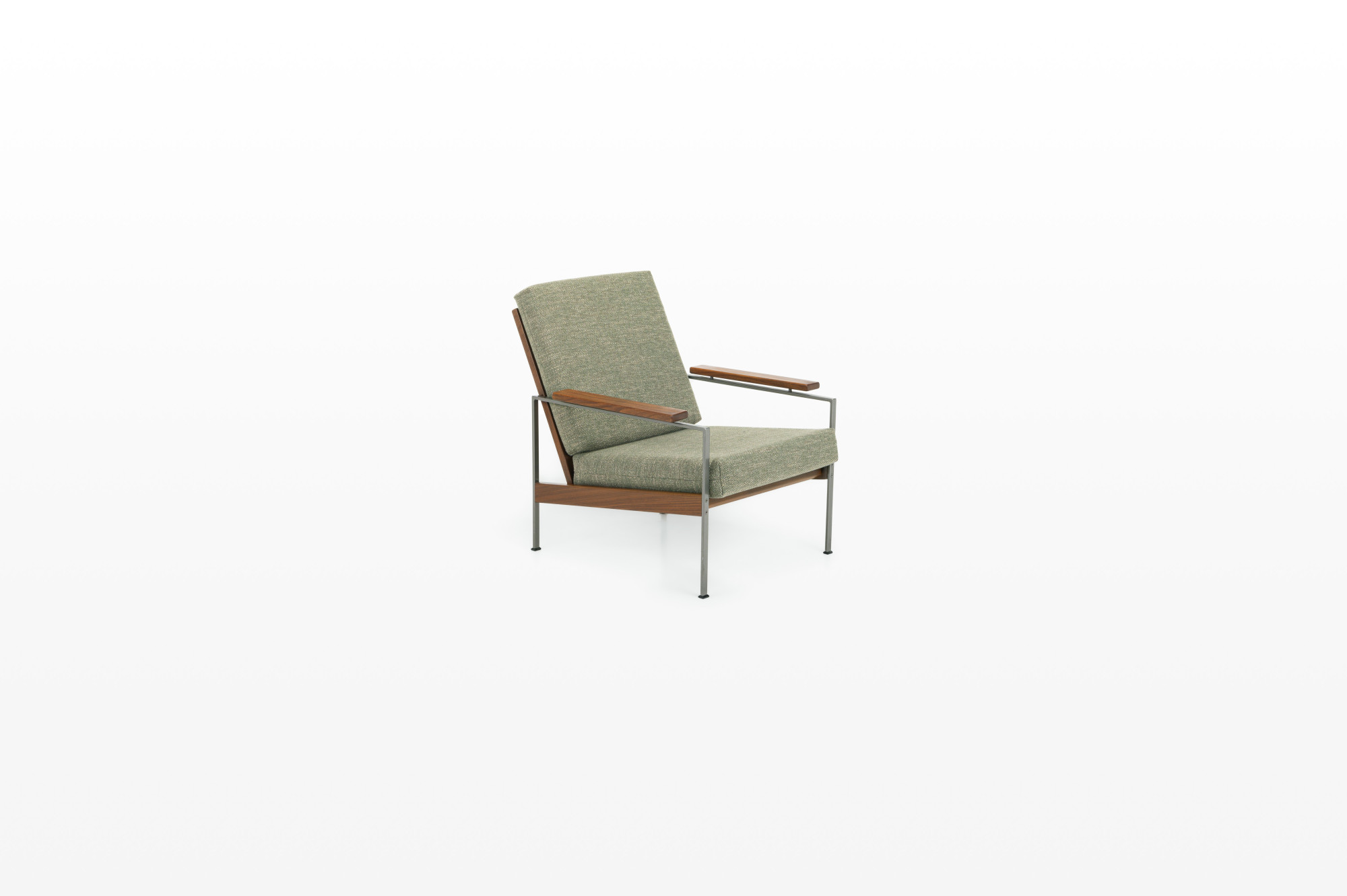 Minimalist easy chair designed by Rob Parry for Gelderland. Produced in the Netherlands in the 1960s. The armchair has an iron frame and a teak armrest. The cushions have been reupholstered in a gray-green fabric. We also have a matching sofa available, shown in the last pictures.