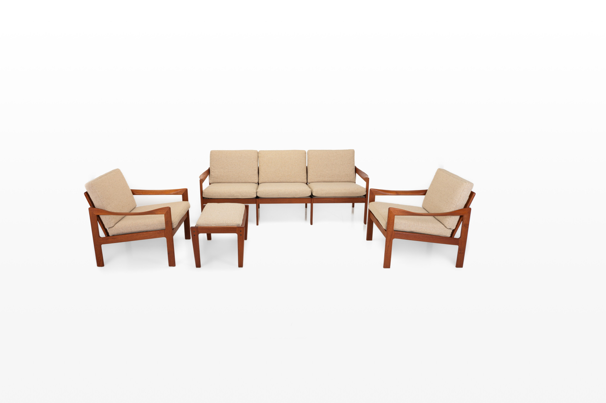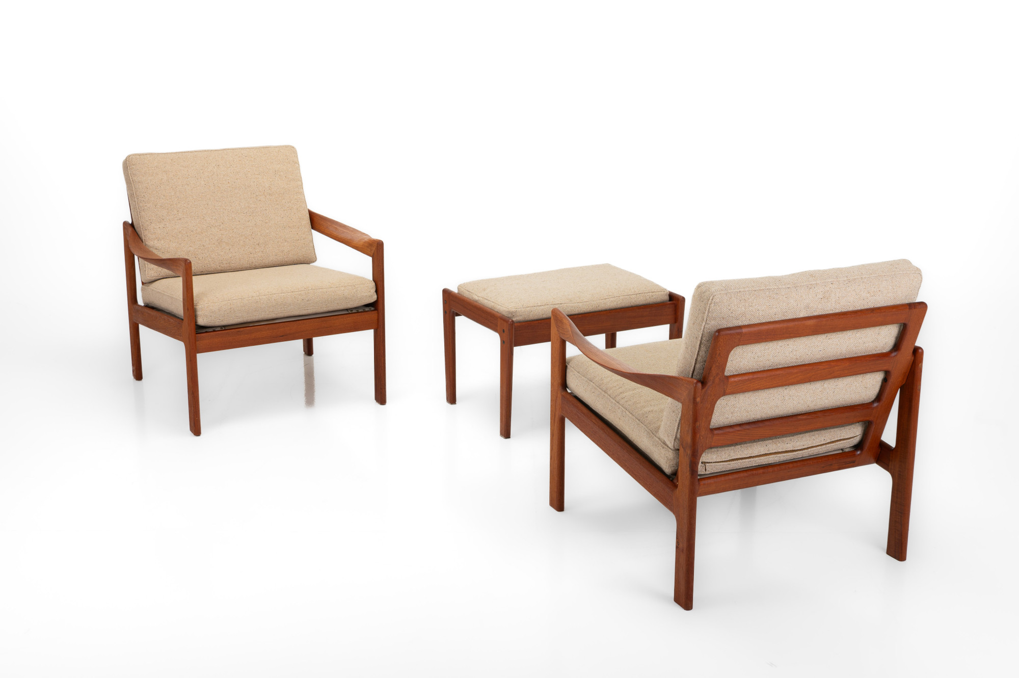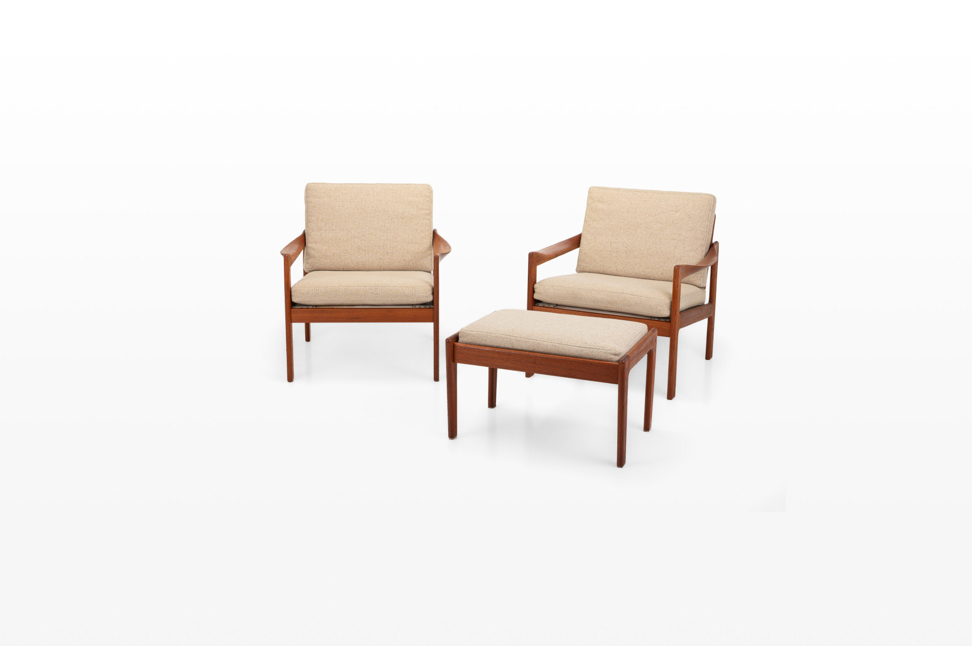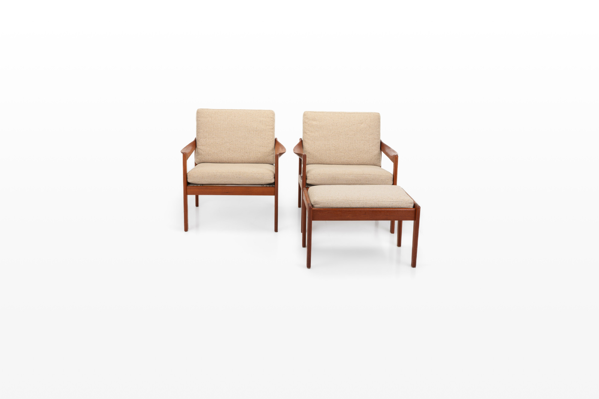 Beautiful pair of easy chairs + ottoman designed by Illum Wikkelsø for Niels Eilersen, Denmark 1960s. The easy chairs have a teak frame and the cushions have in a cream beige fabric. The armchairs an ottoman are in great condition.