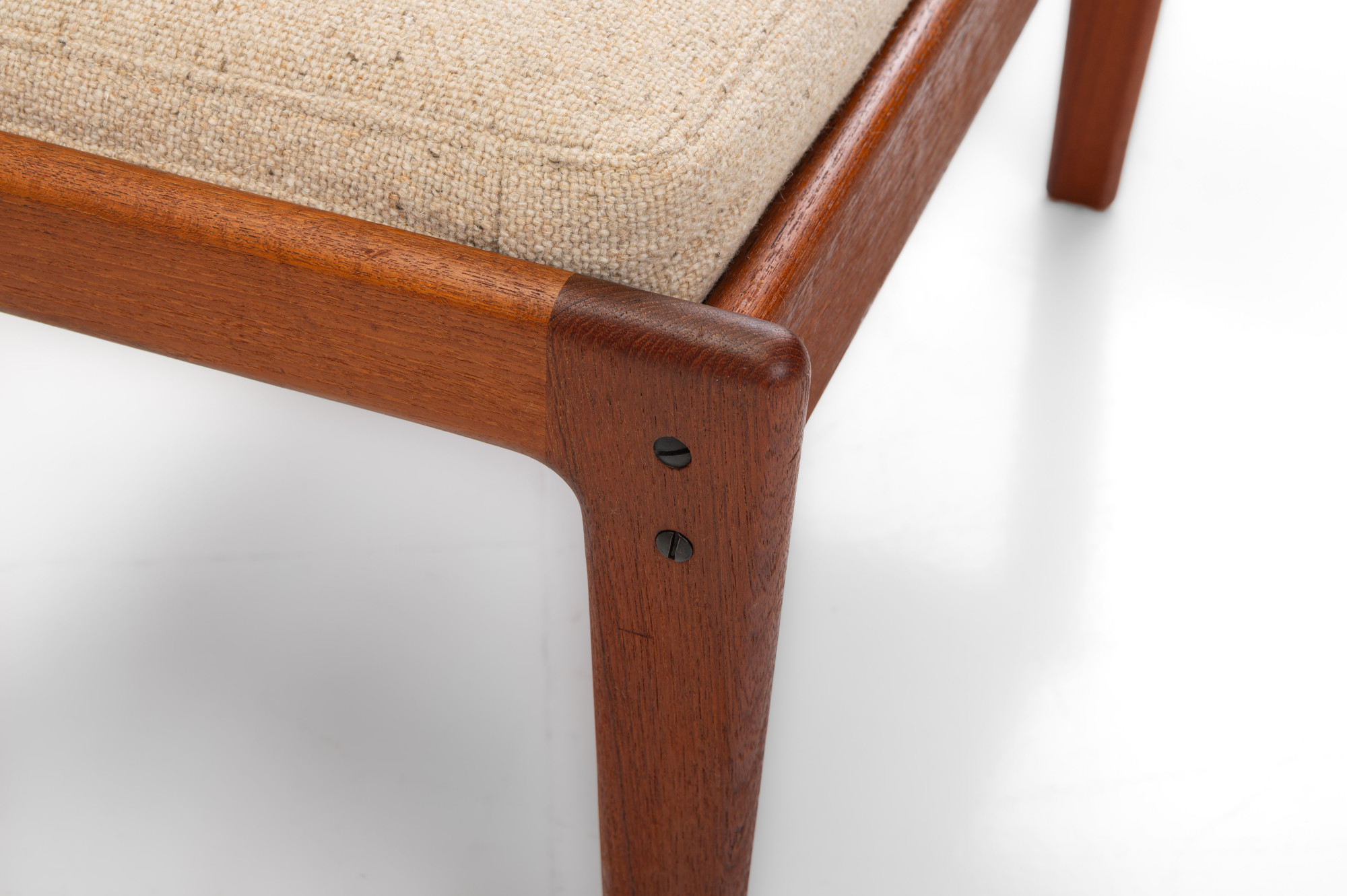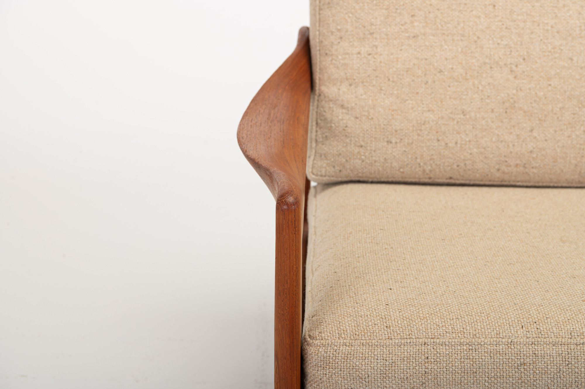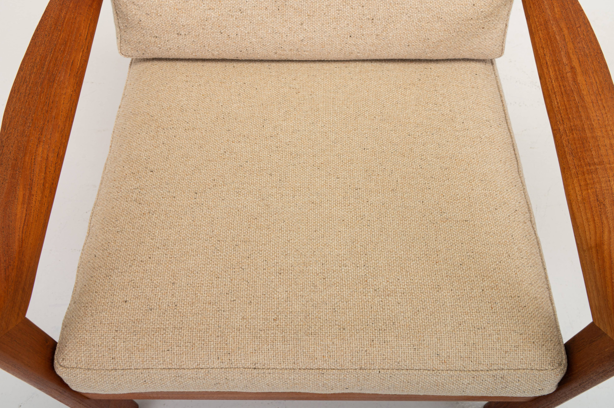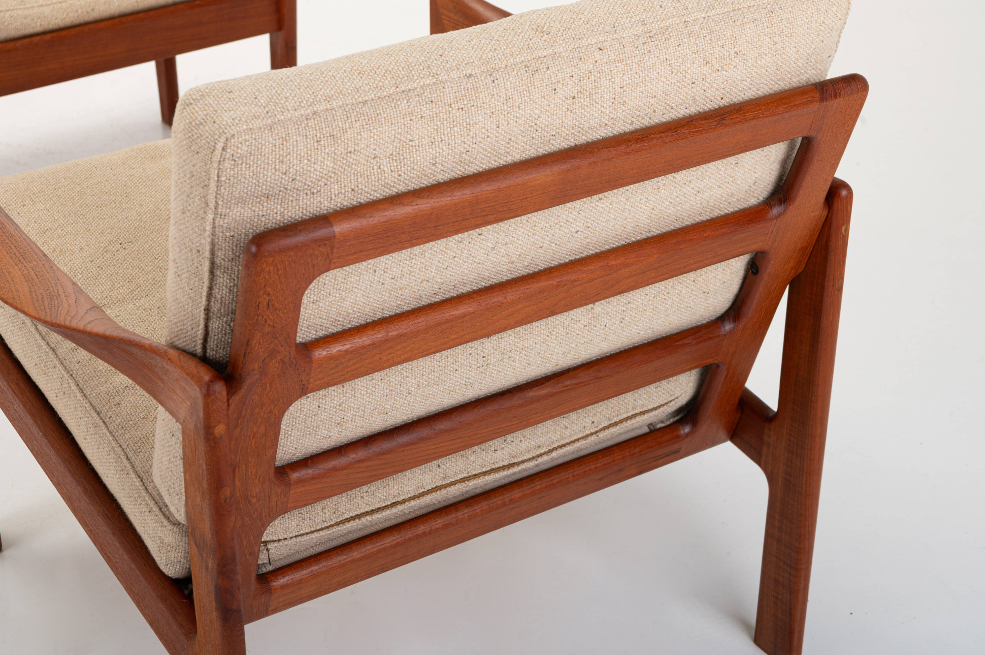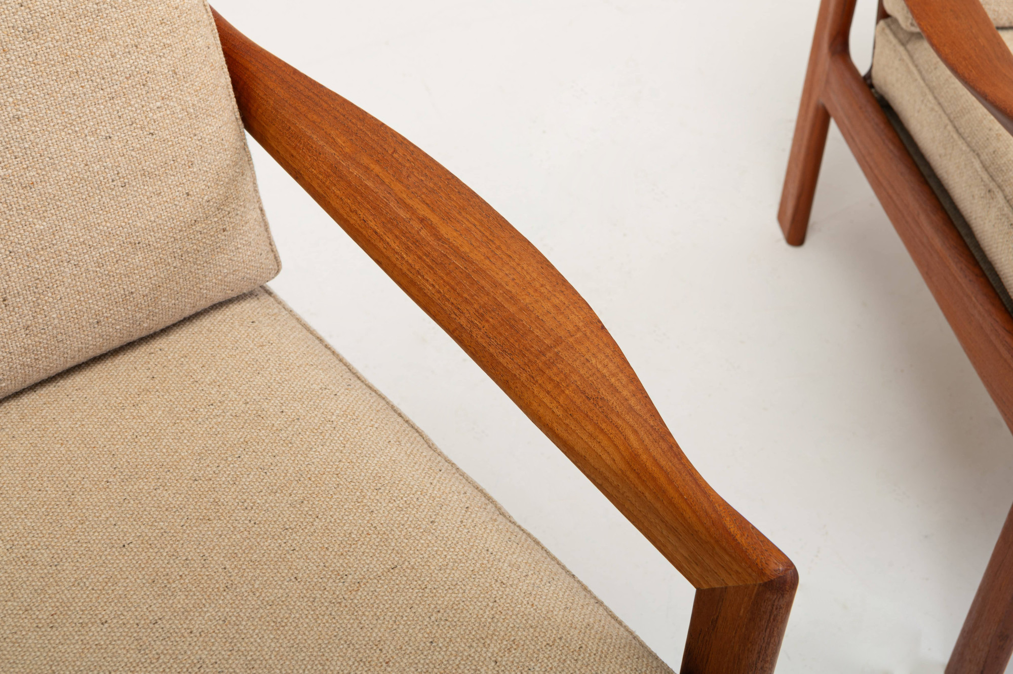 Beautiful pair of easy chairs + ottoman designed by Illum Wikkelsø for Niels Eilersen, Denmark 1960s. The easy chairs have a teak frame and the cushions have in a cream beige fabric. The armchairs an ottoman are in great condition.
