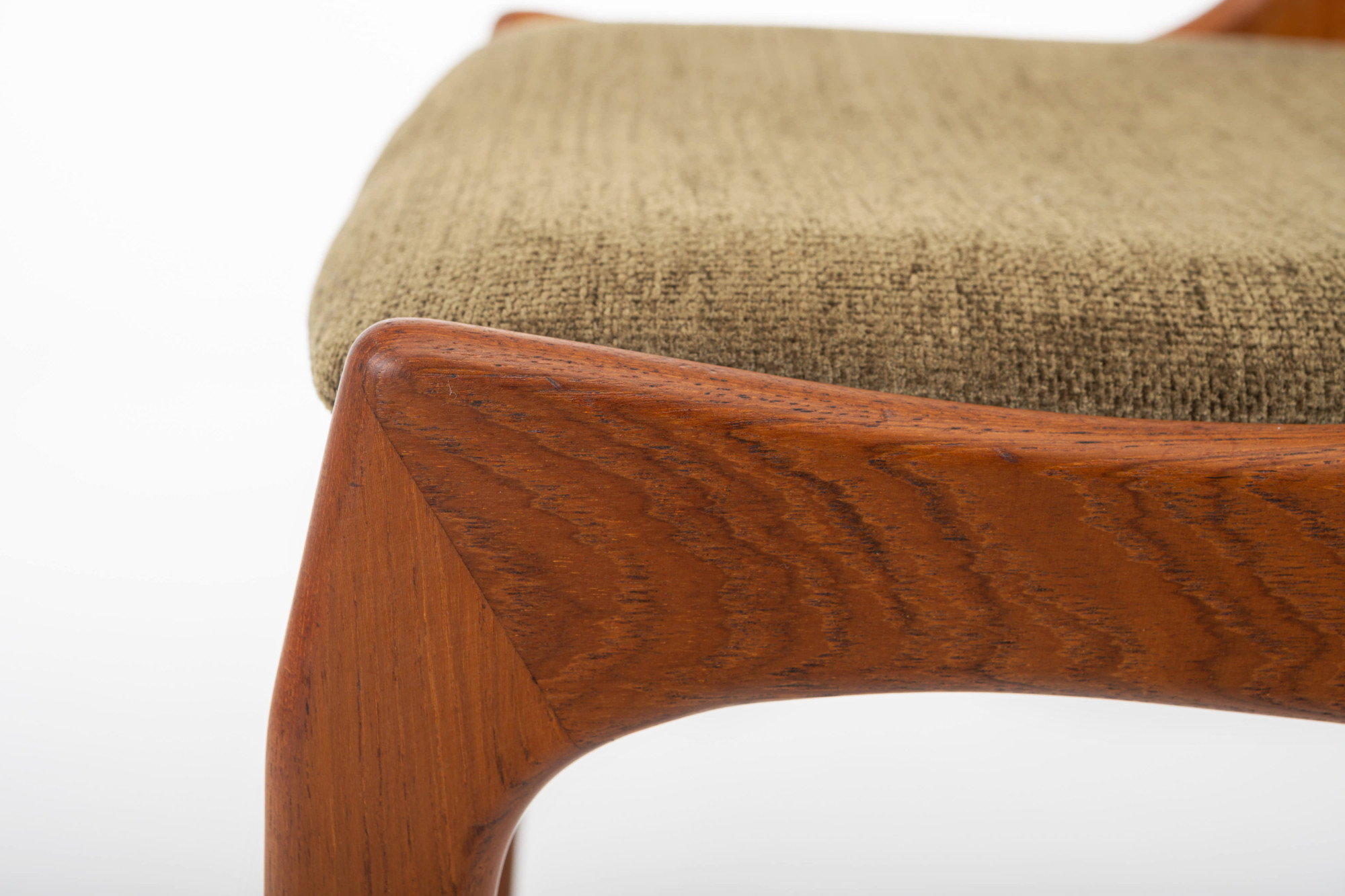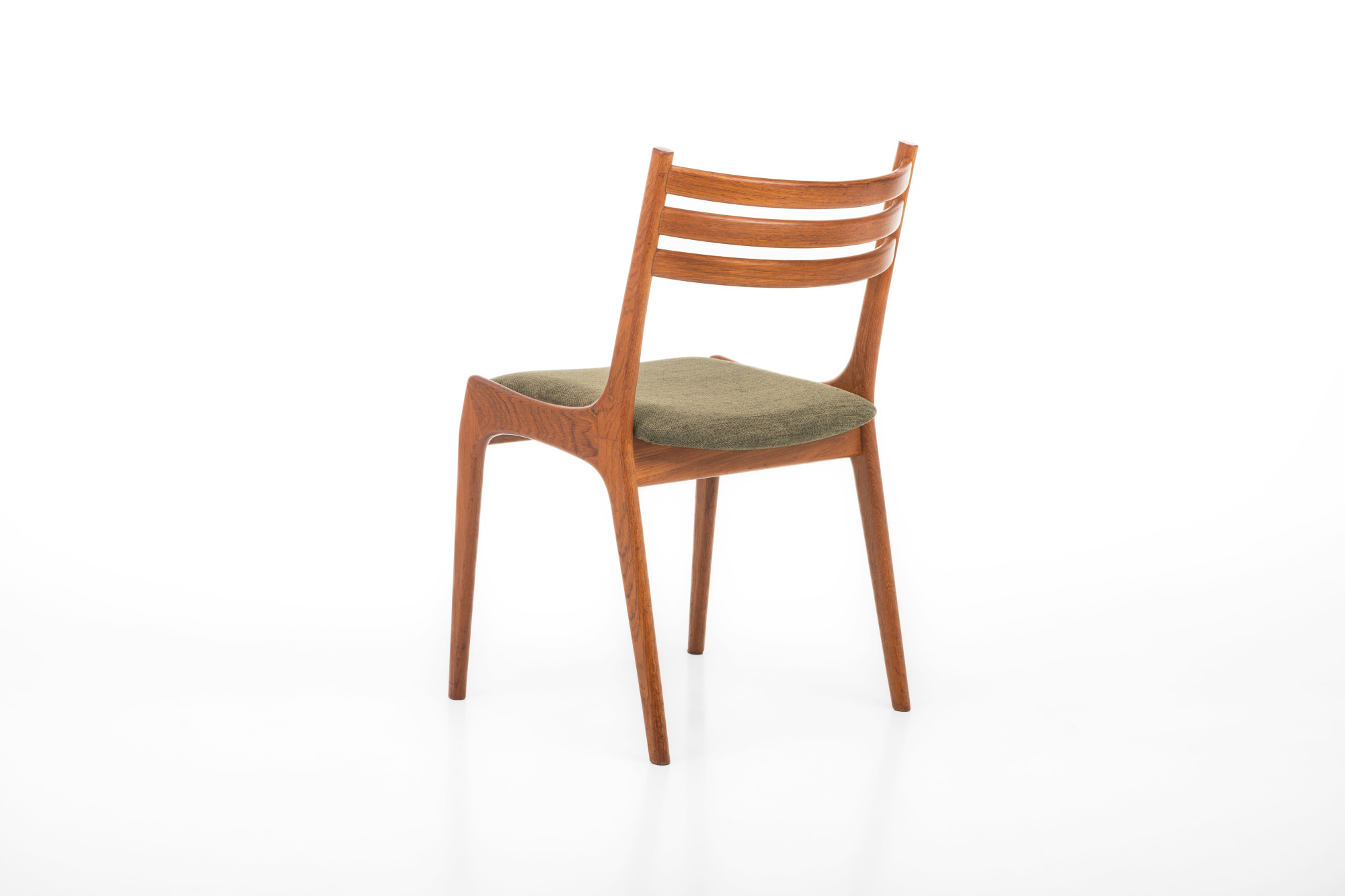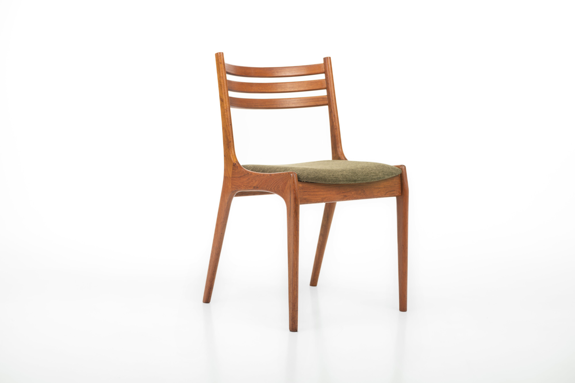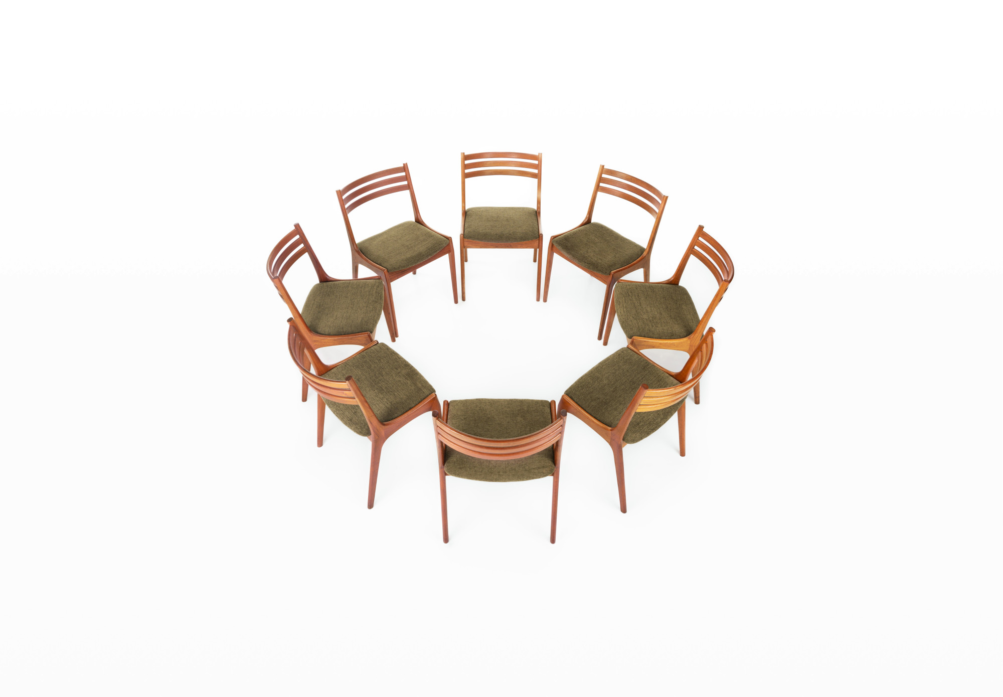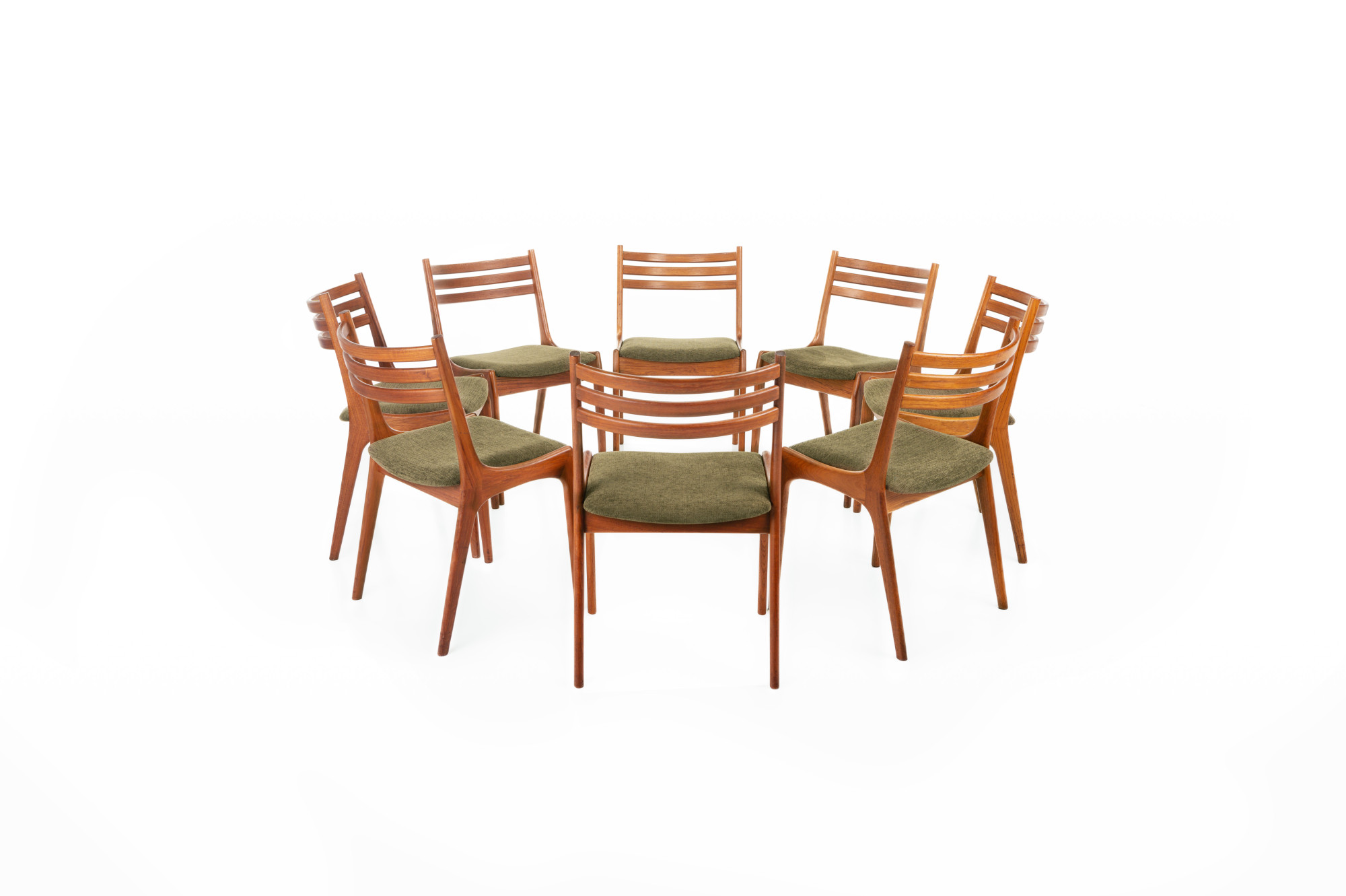 Set of eight dining chairs in teak designed by Henning Kjærnulf and produced by Korup Stølefabrik in Denmark in the 1960s. The chairs have been reupholstered with a khaki green fabric.