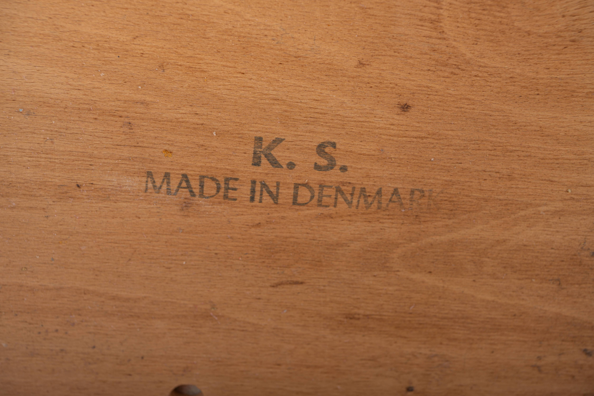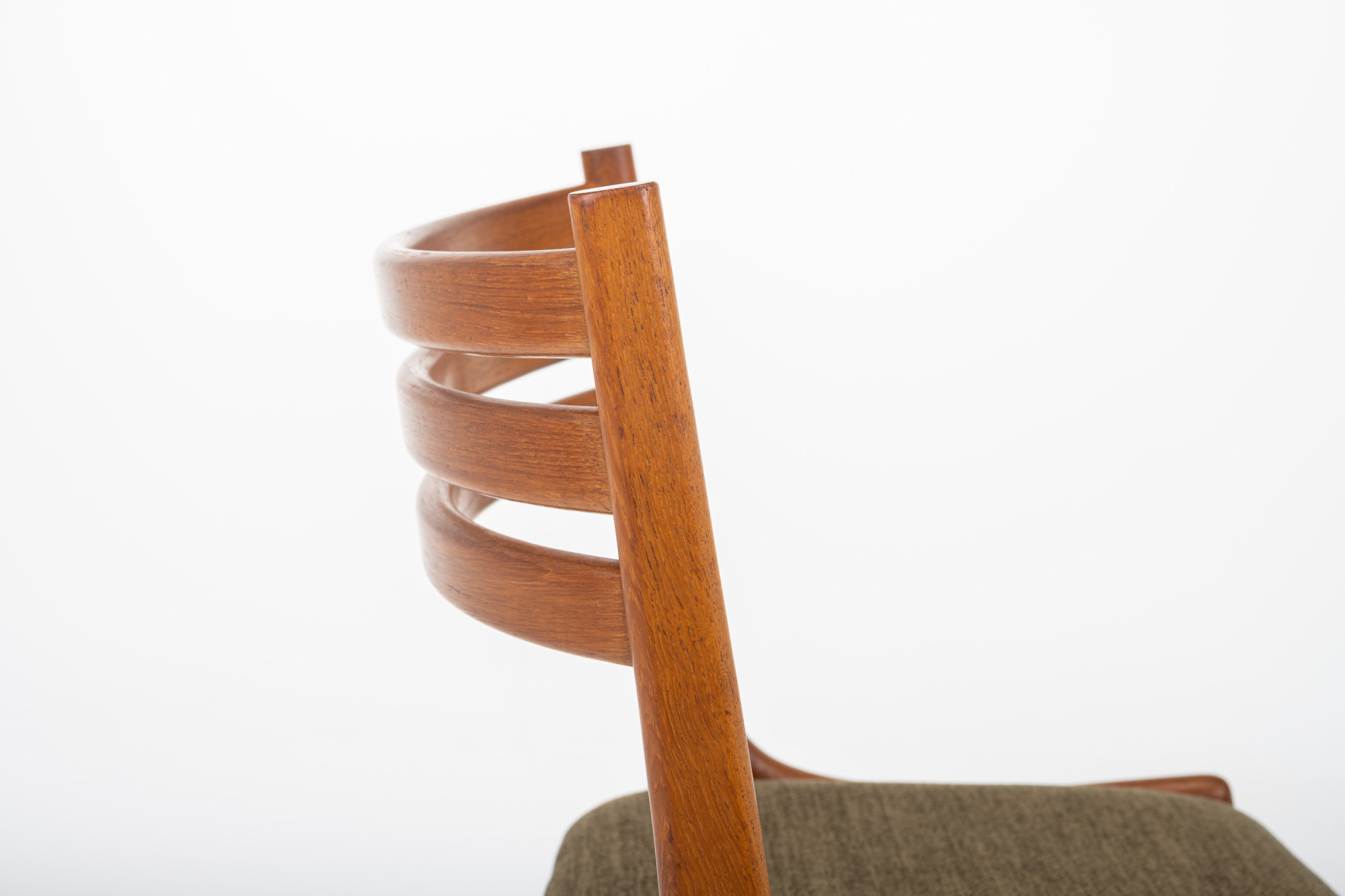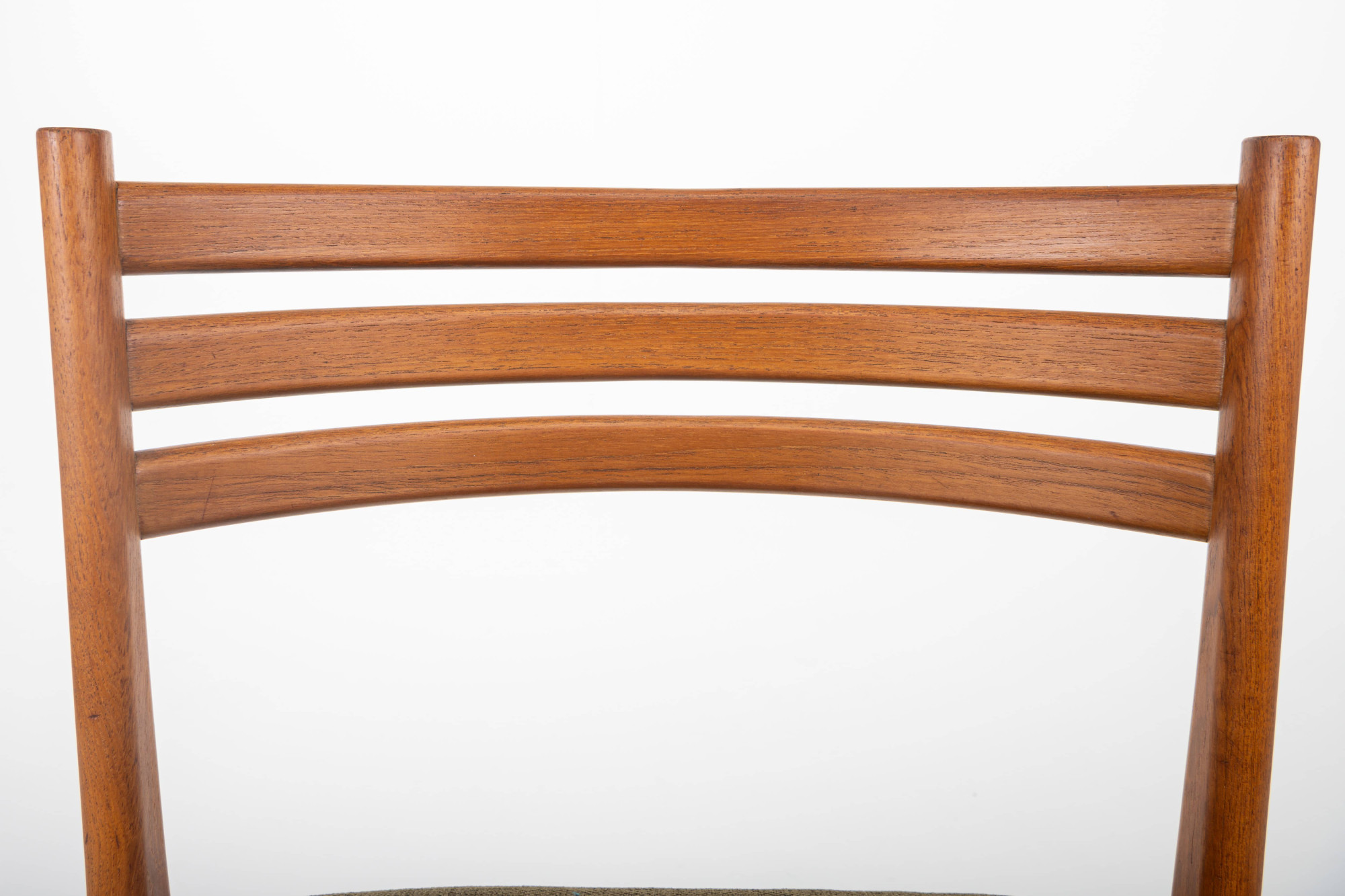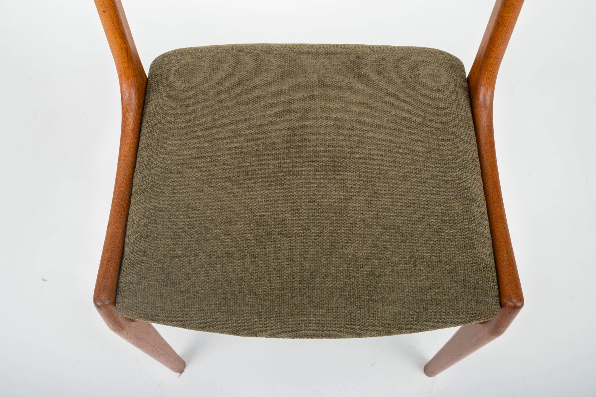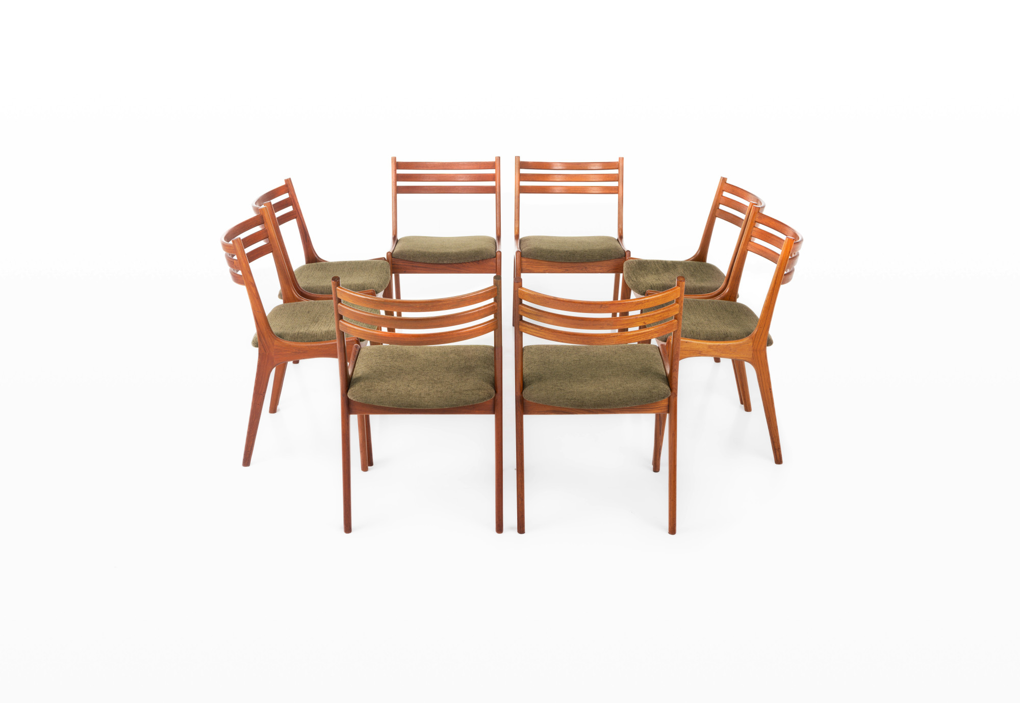 Set of eight dining chairs in teak designed by Henning Kjærnulf and produced by Korup Stølefabrik in Denmark in the 1960s. The chairs have been reupholstered with a khaki green fabric.