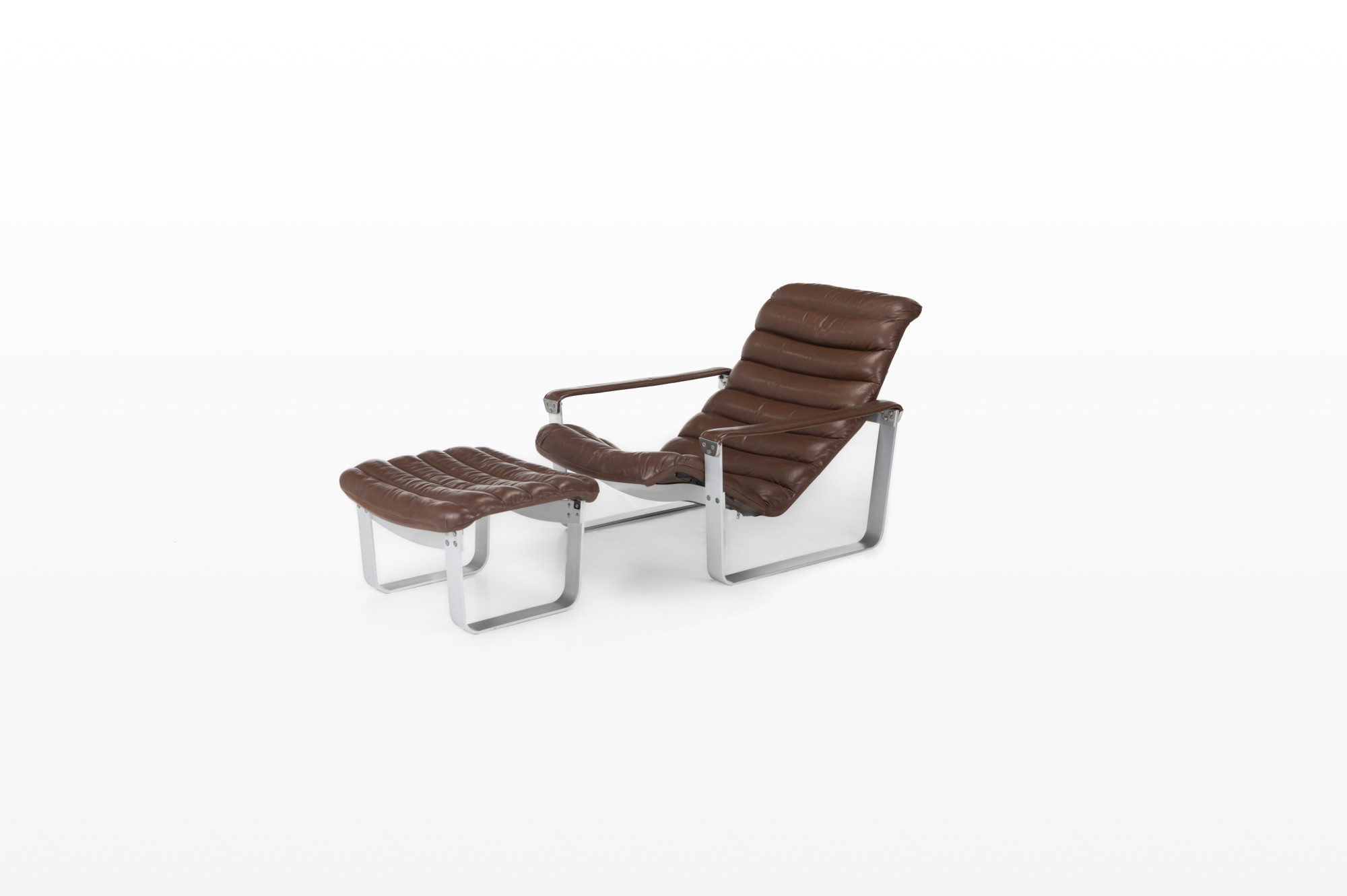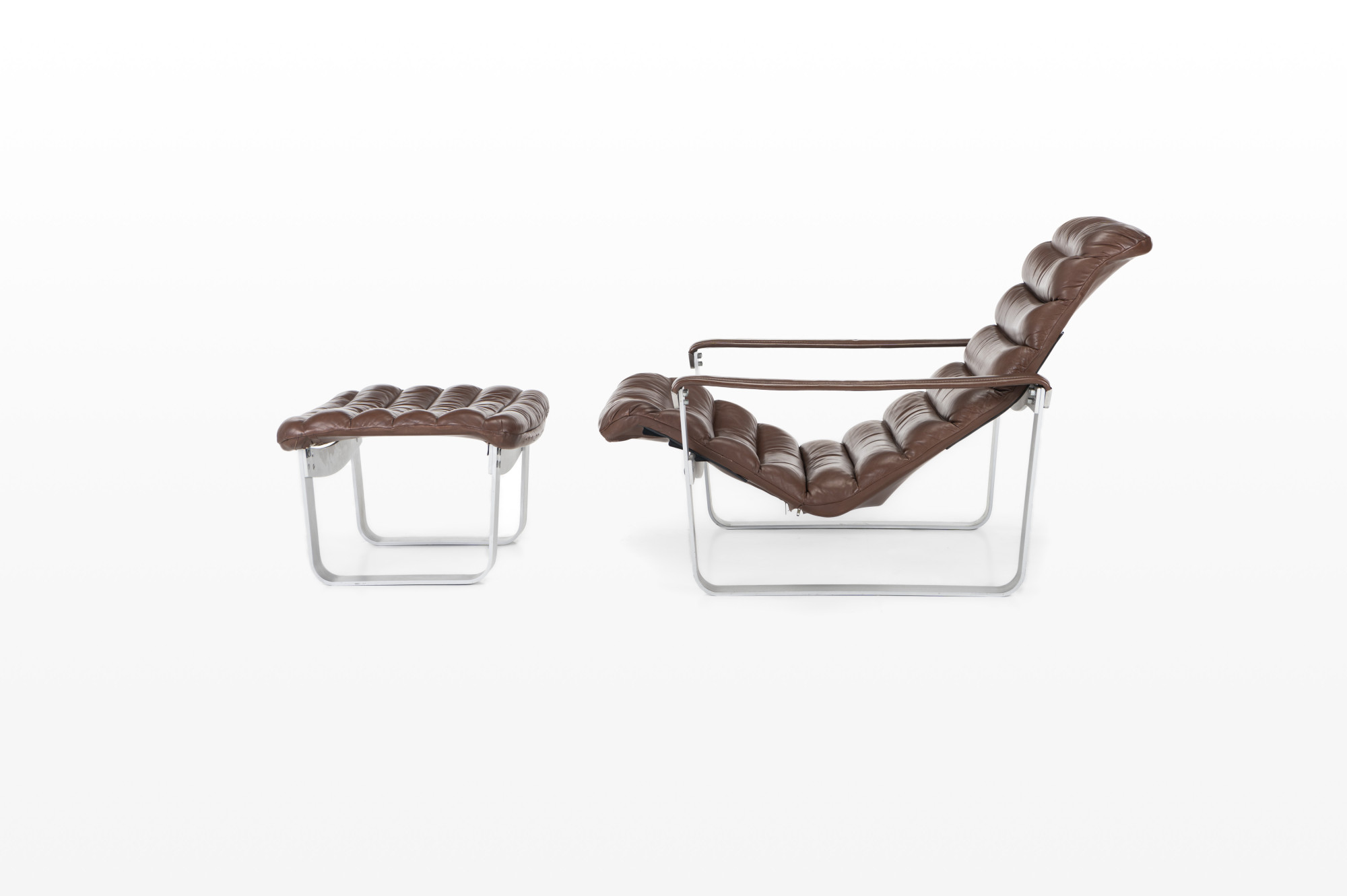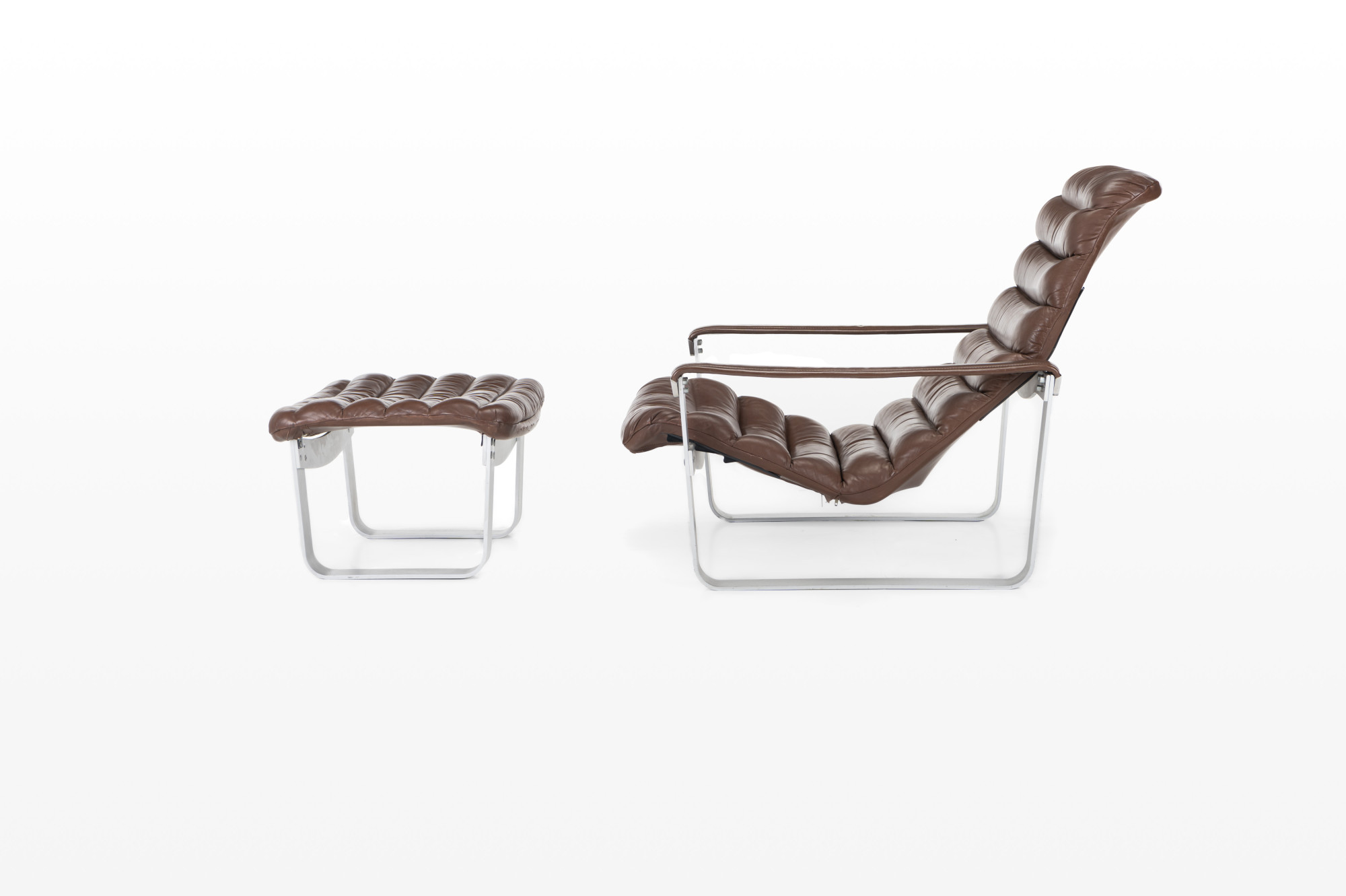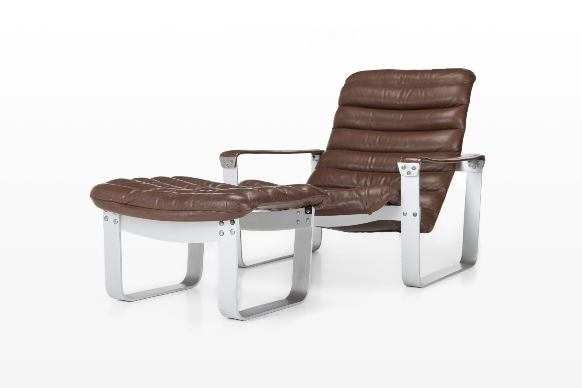 Lounge chair by Ilmari Lappalainen for Asko. The dark brown leather lounge chair remains in very good condition and comes with an ottoman. Marked by the producer.