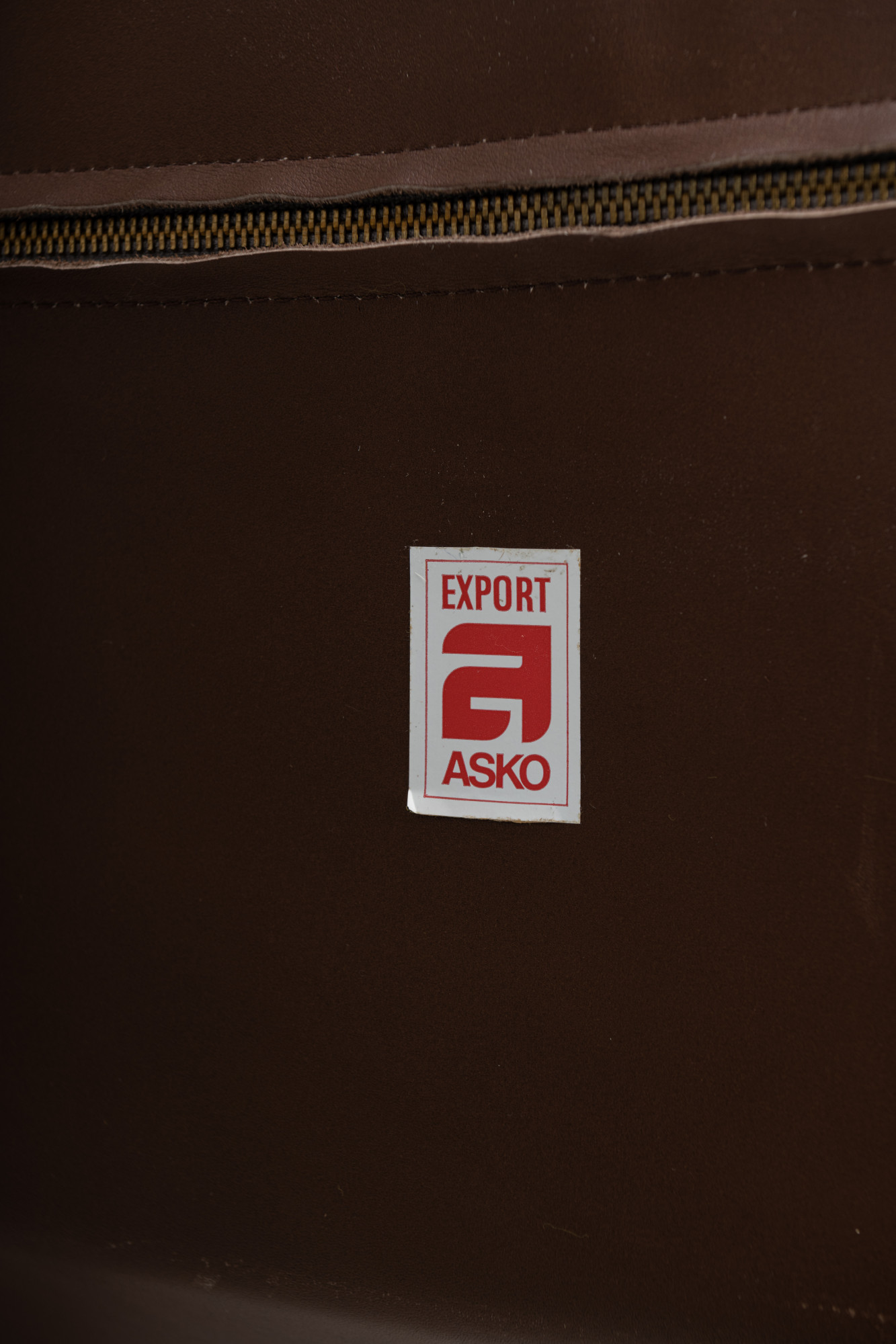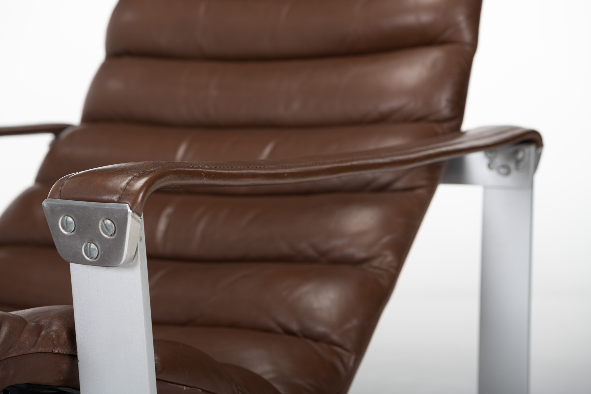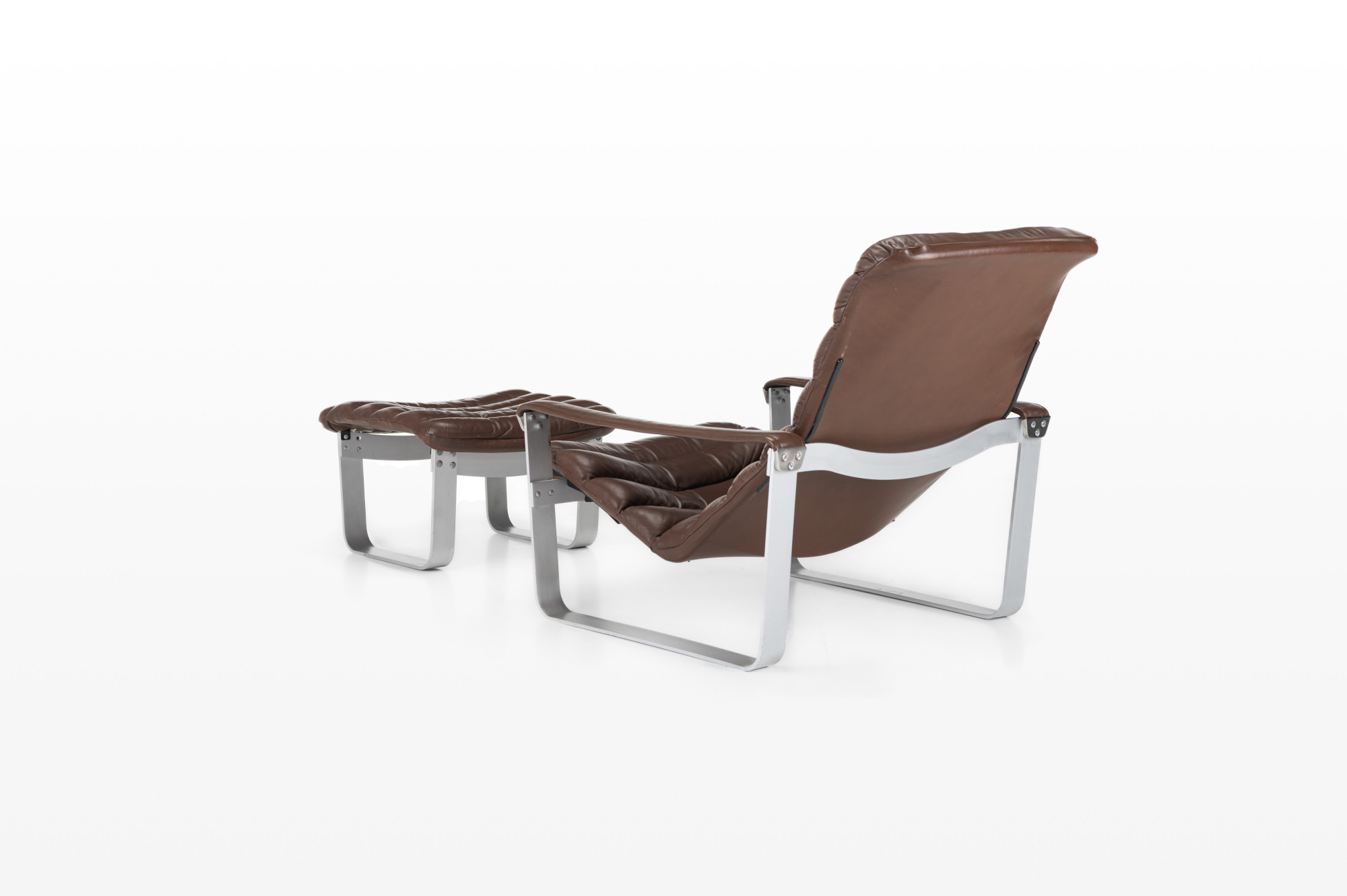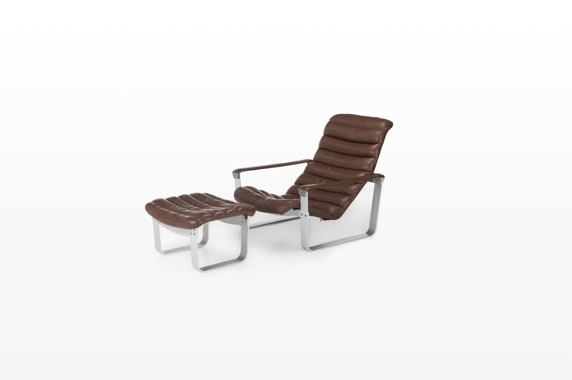 Lounge chair by Ilmari Lappalainen for Asko. The dark brown leather lounge chair remains in very good condition and comes with an ottoman. Marked by the producer.