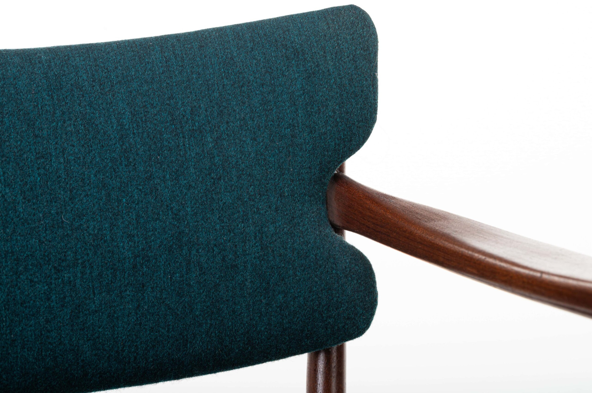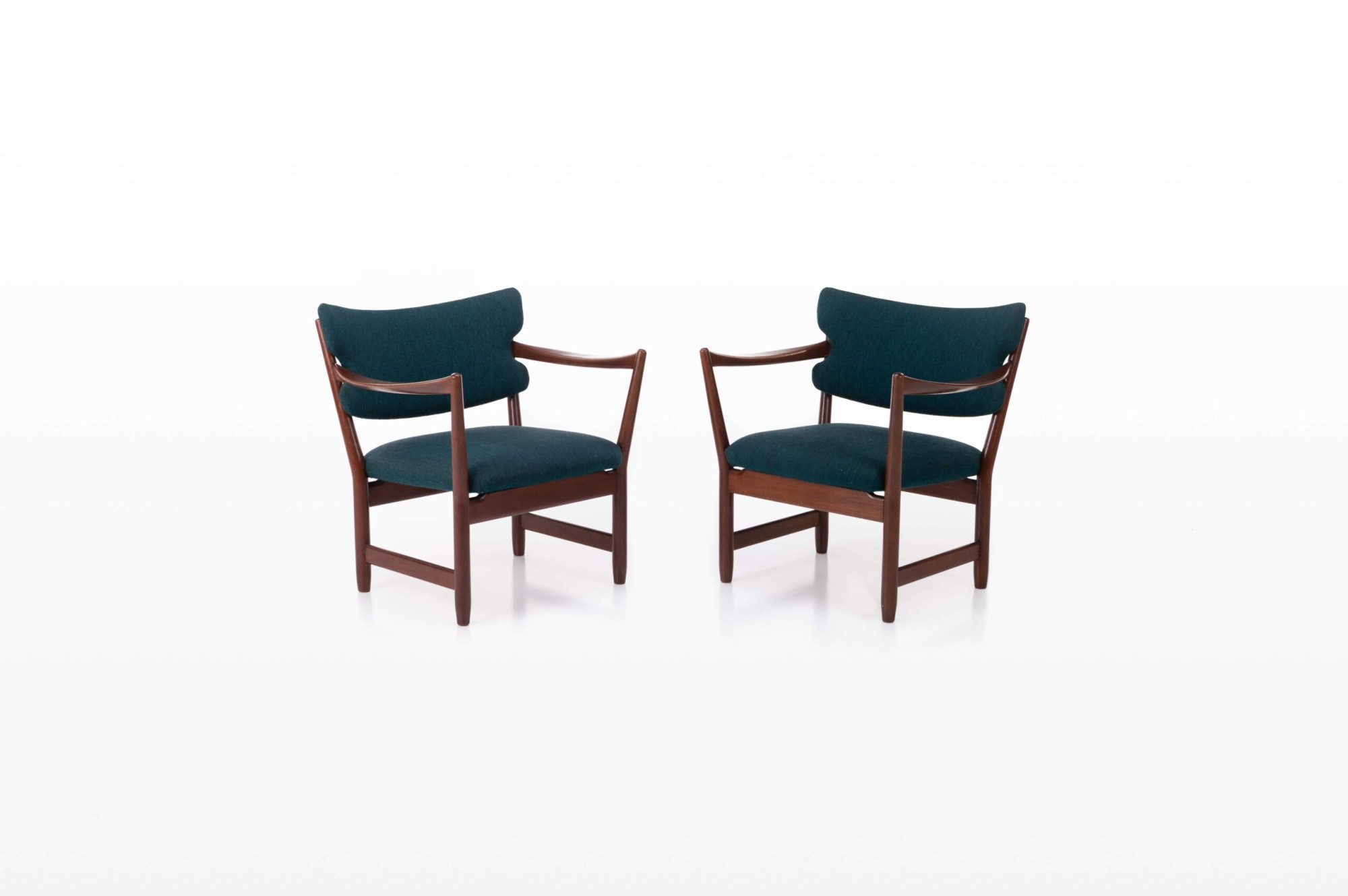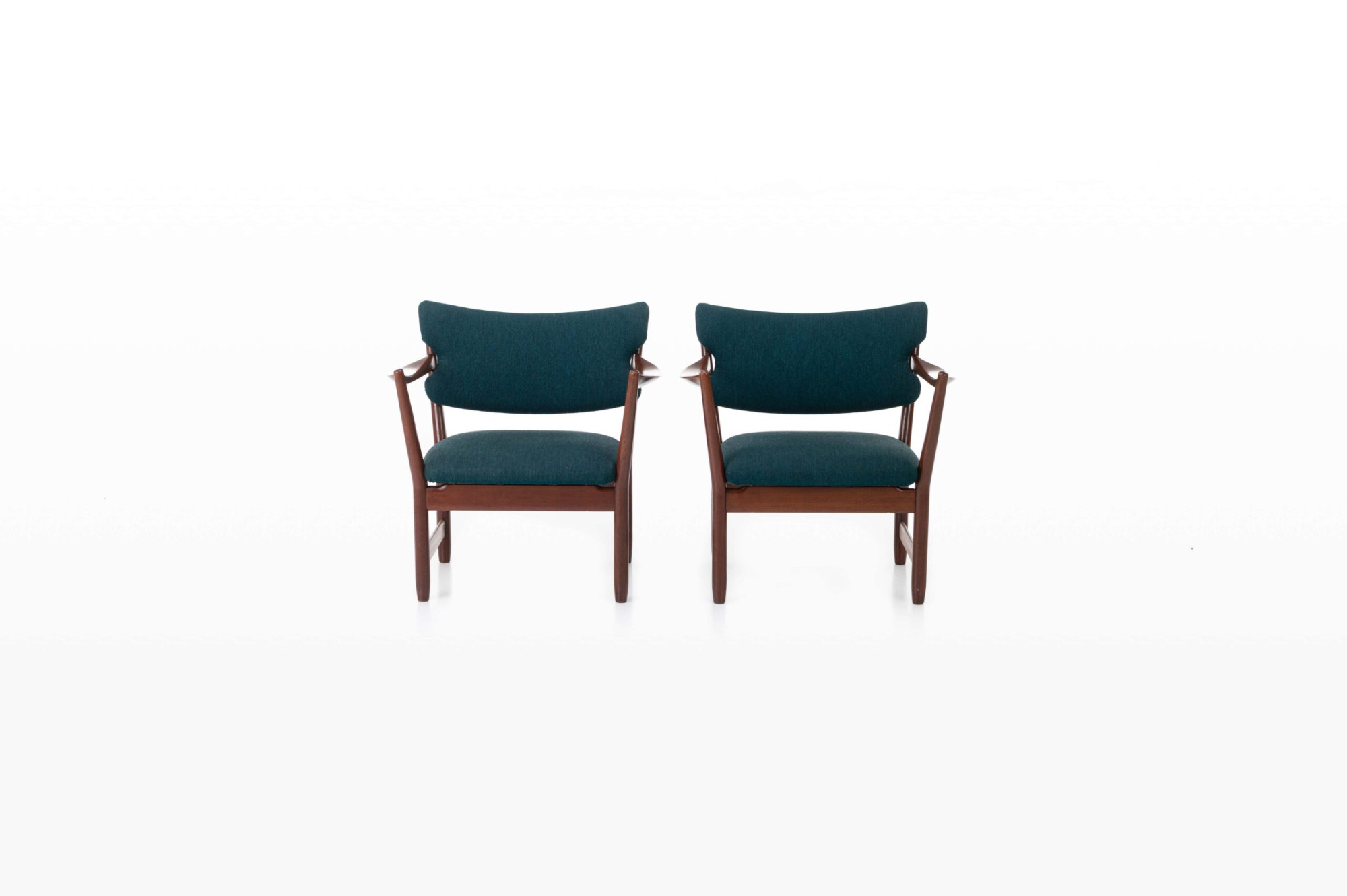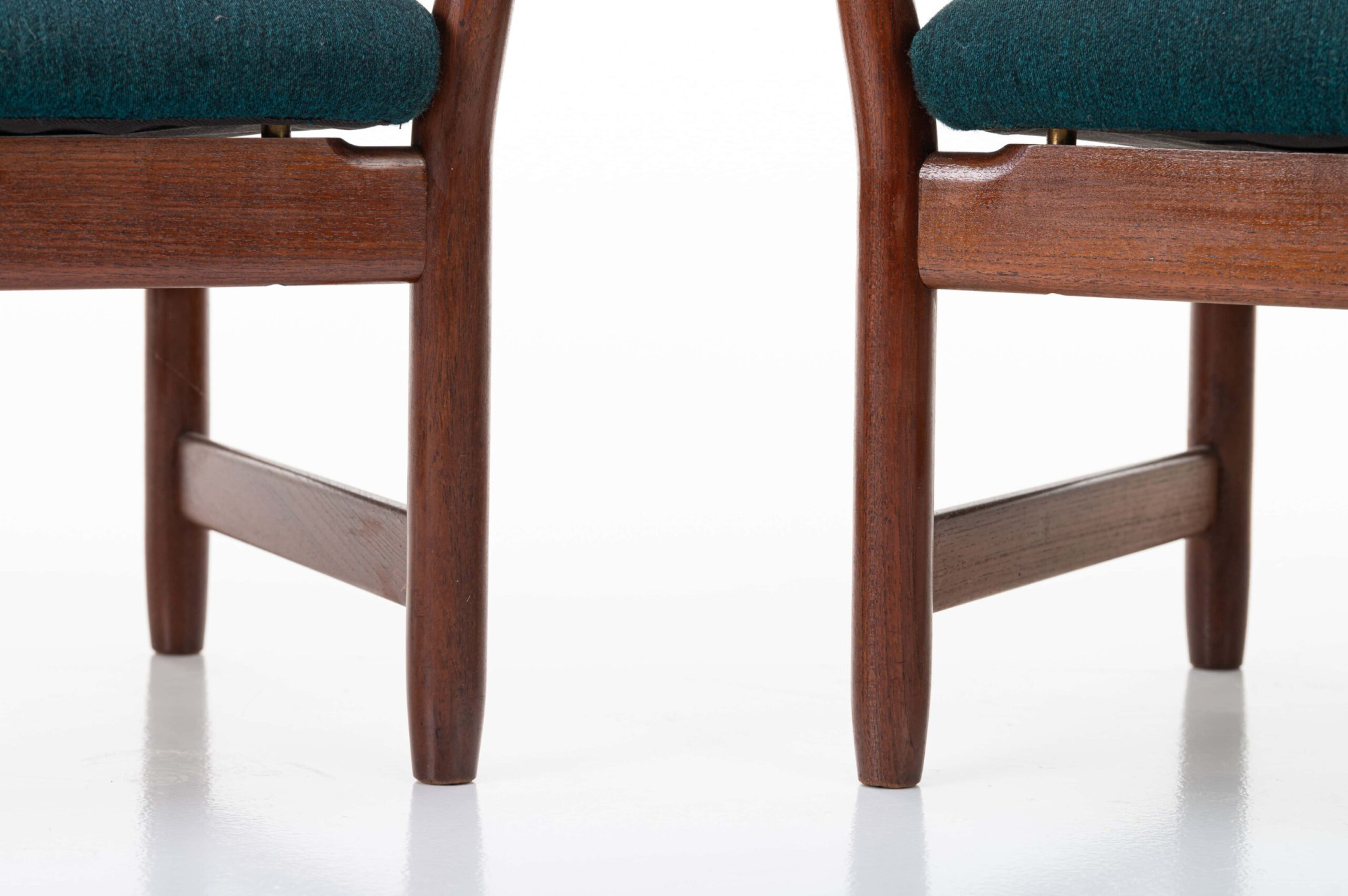 Beautiful set of two “Fire place” armchairs in teak. Designed by Fredrik Kayser and Adolf Relling for Dokka Møbler. Produced in Norway around 1958. The chairs have a teak frame and petrol blue upholstery.