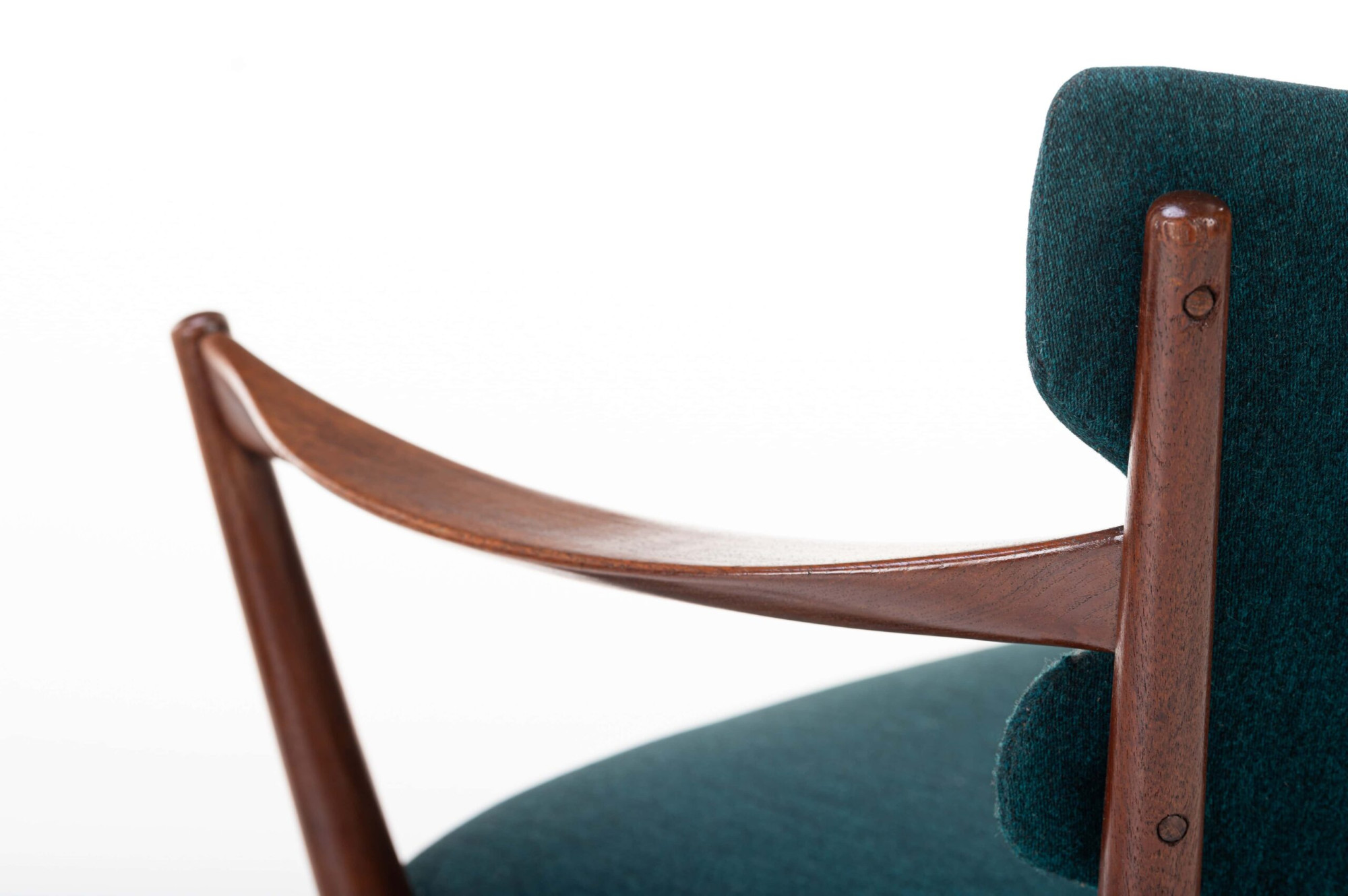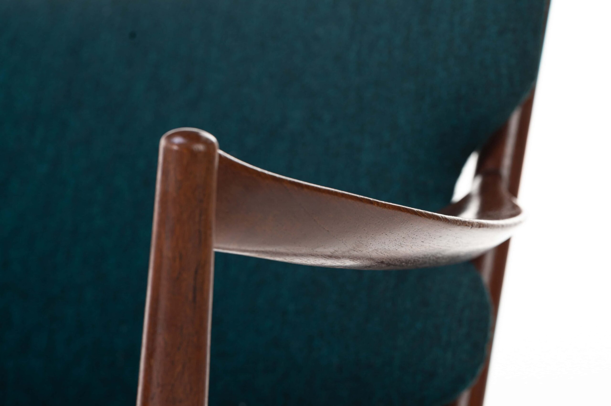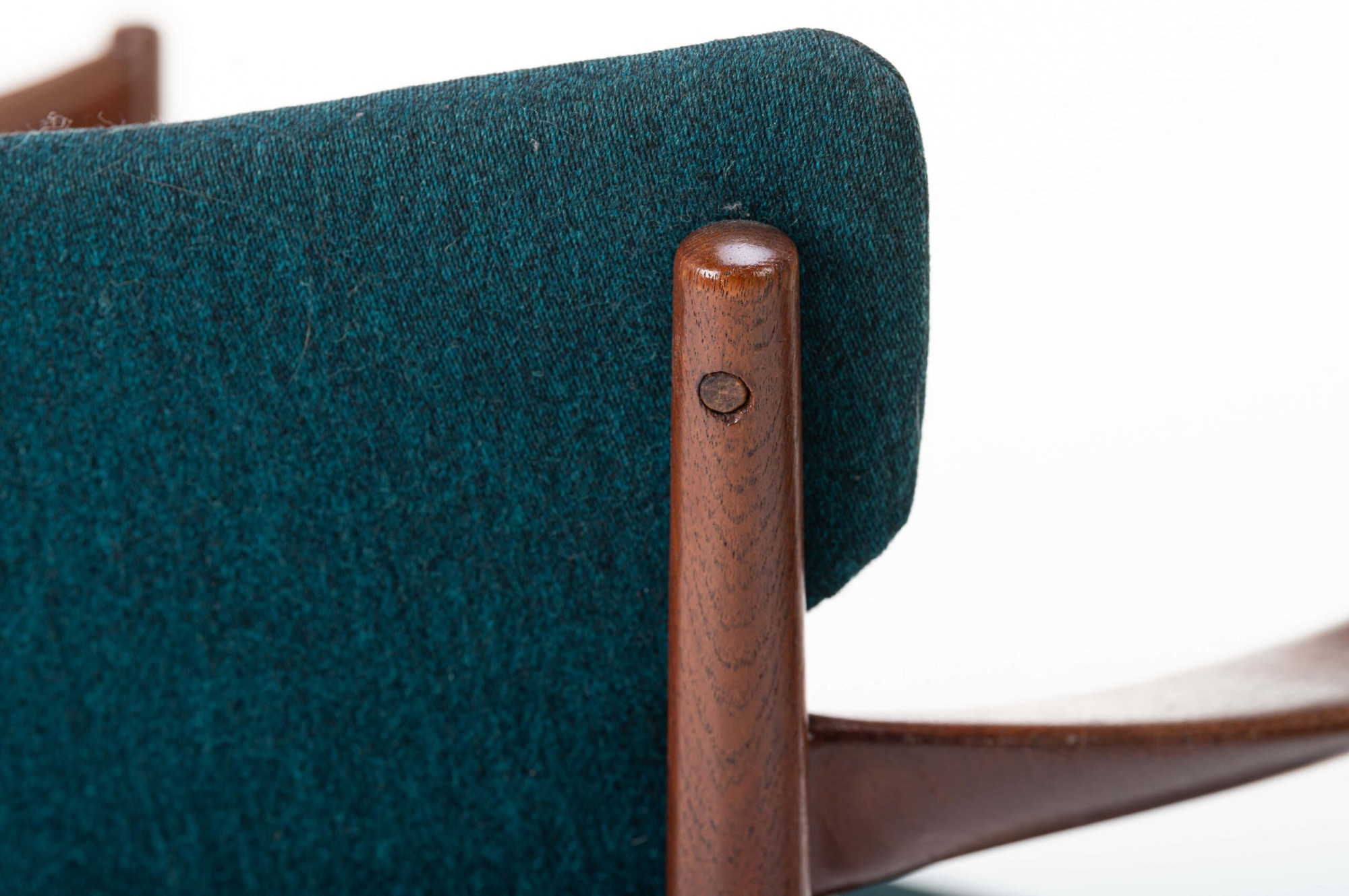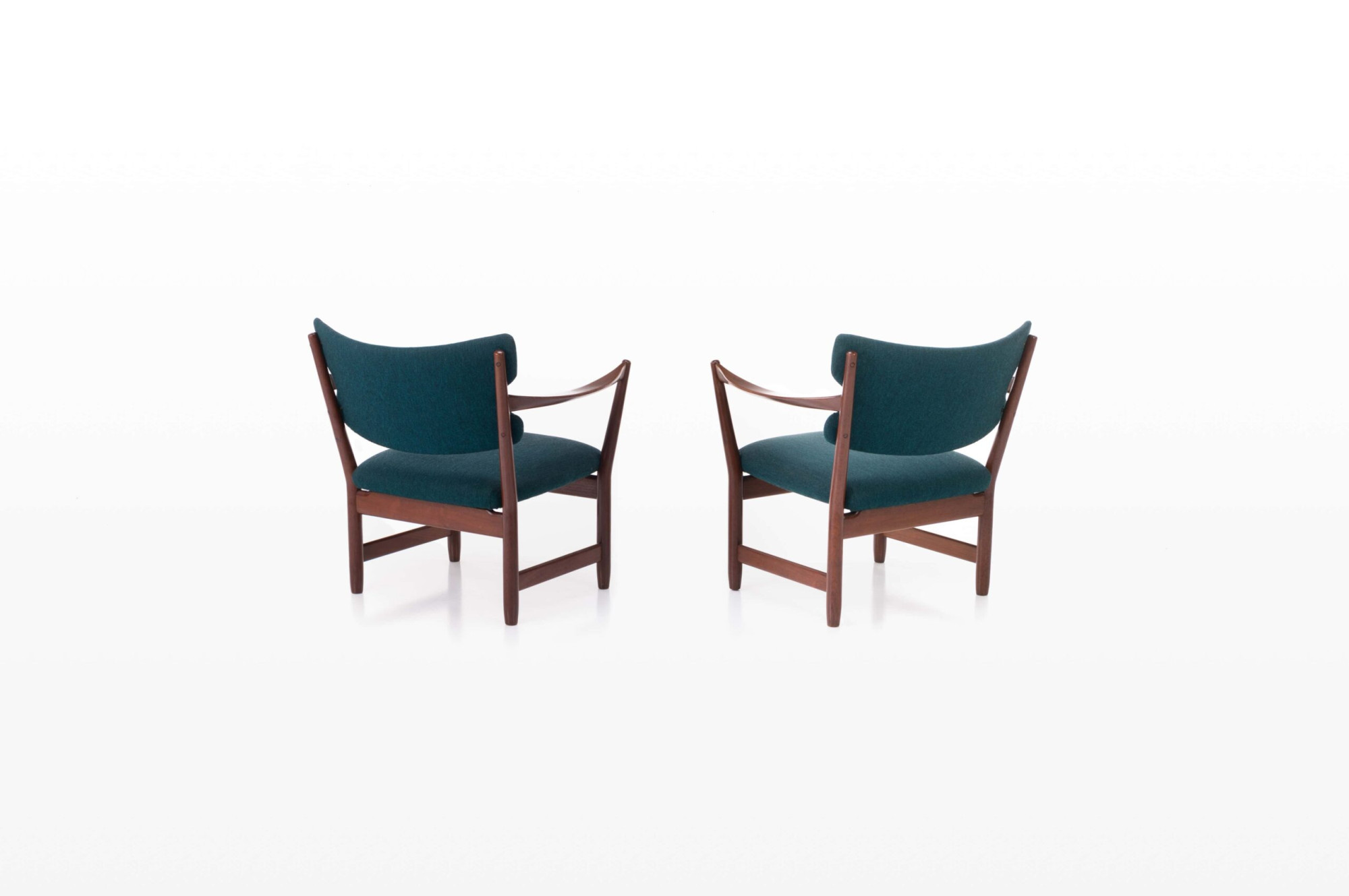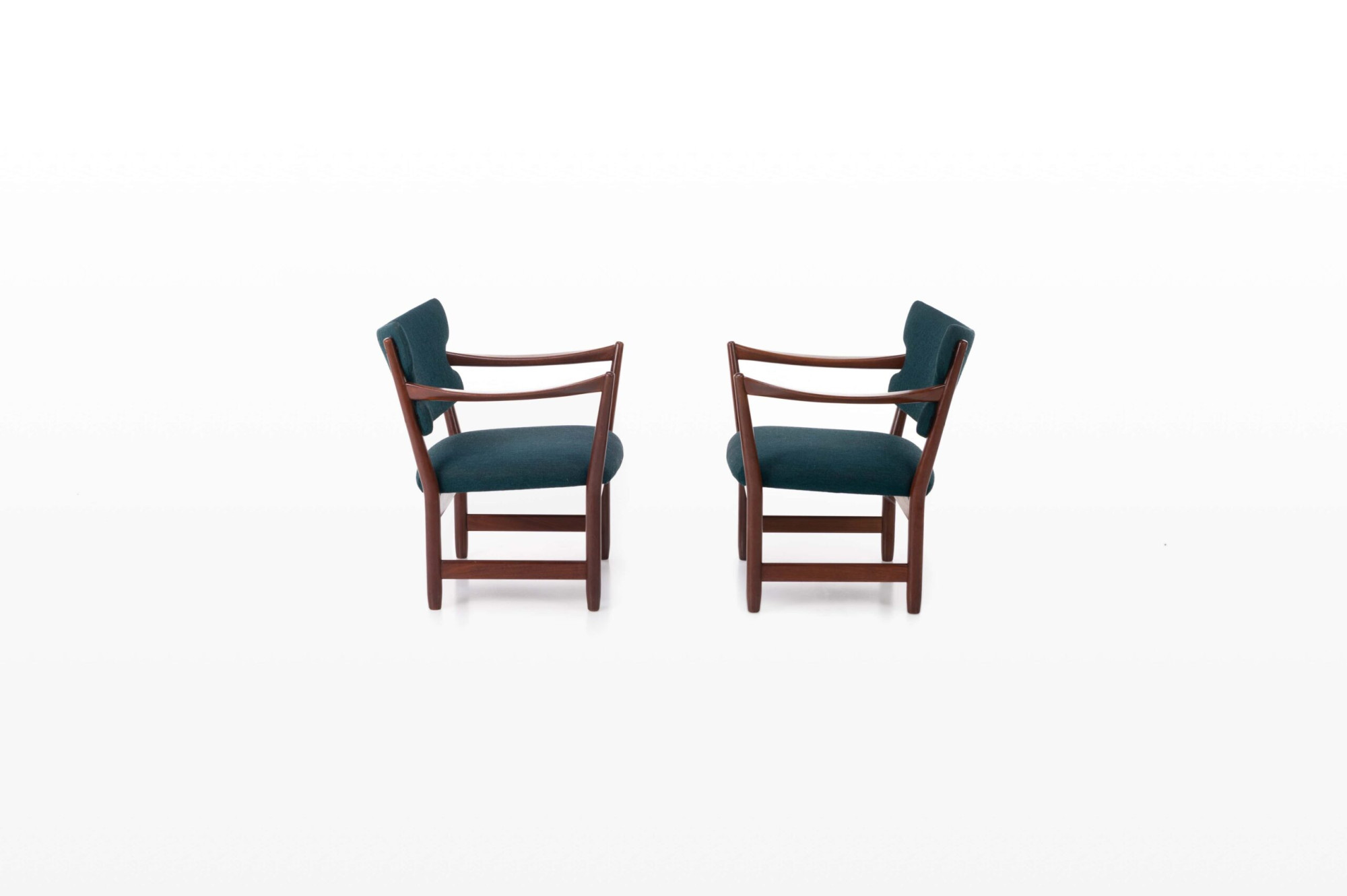 Beautiful set of two “Fire place” armchairs in teak. Designed by Fredrik Kayser and Adolf Relling for Dokka Møbler. Produced in Norway around 1958. The chairs have a teak frame and petrol blue upholstery.