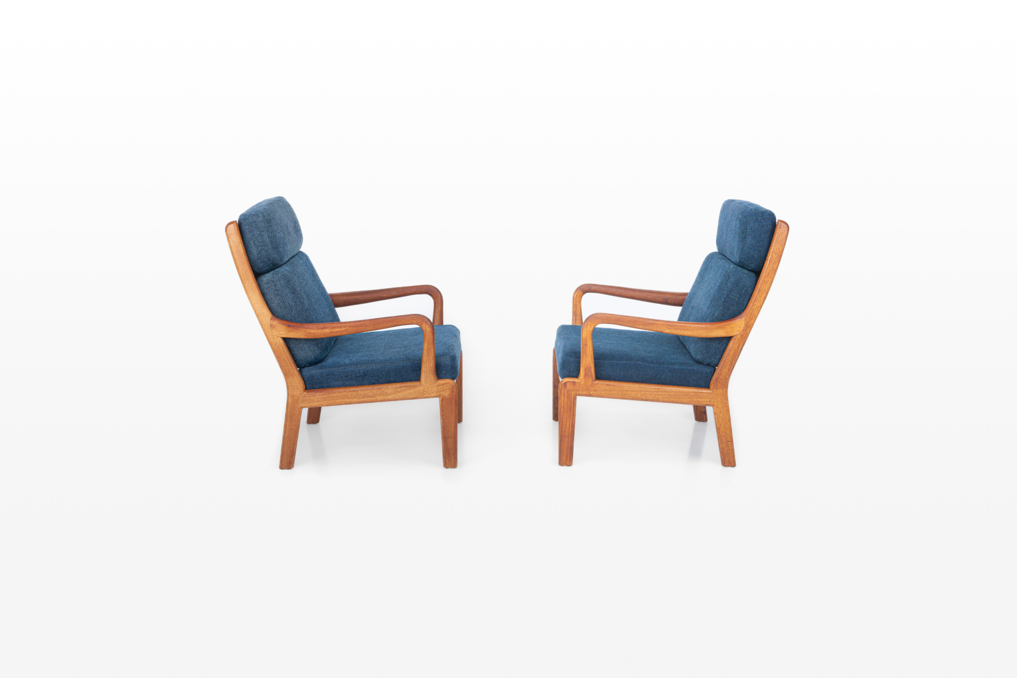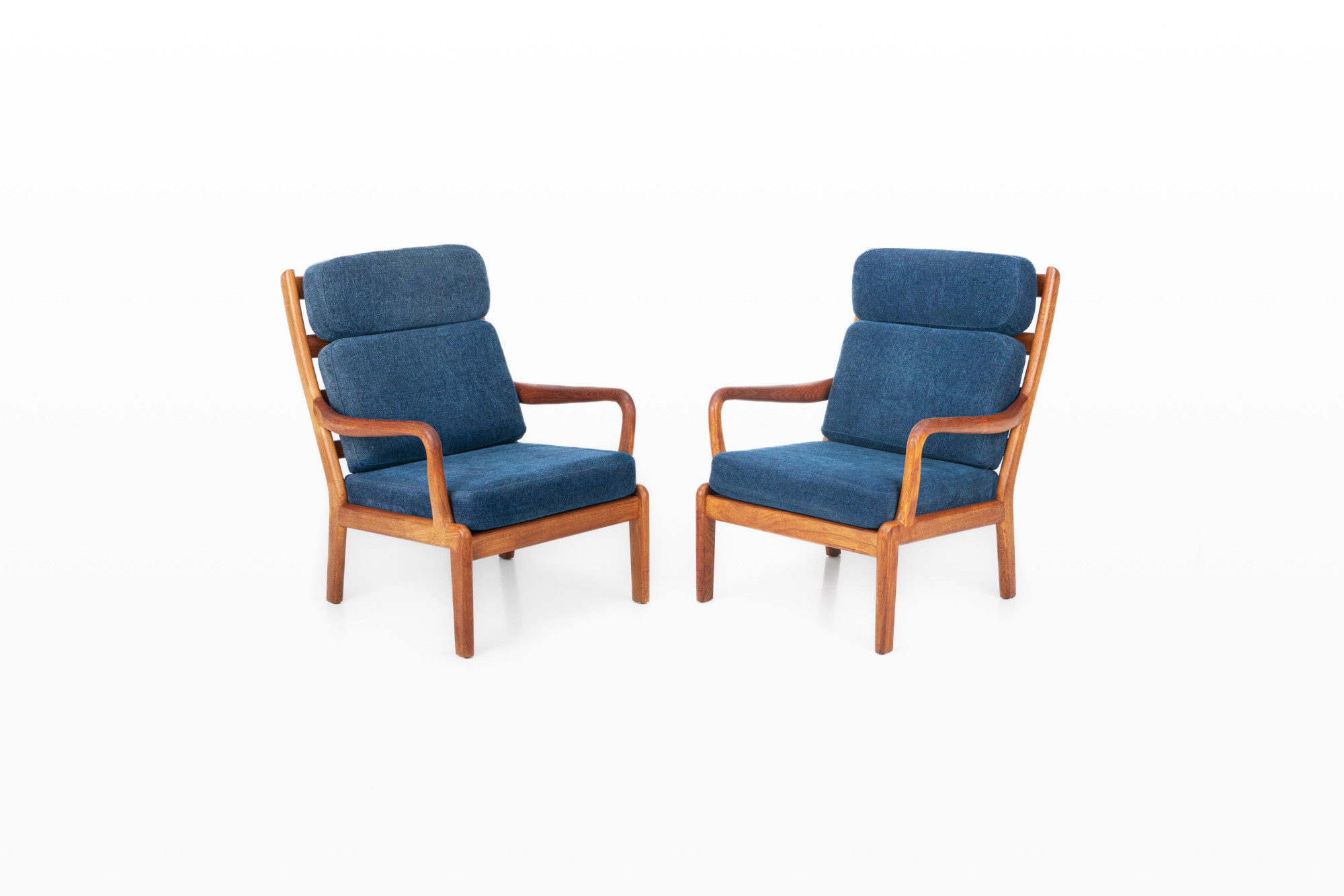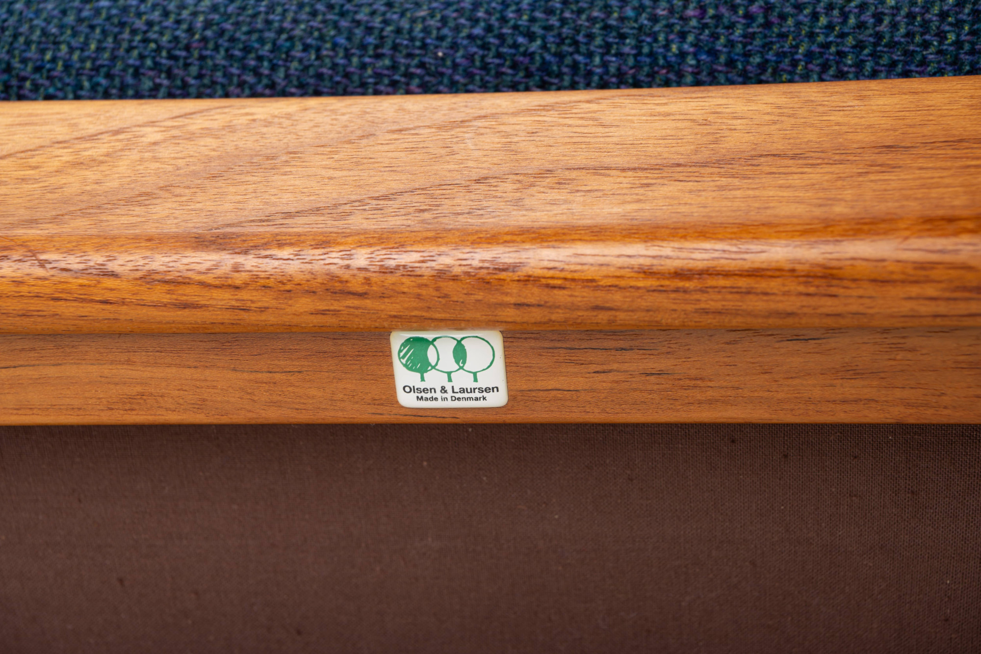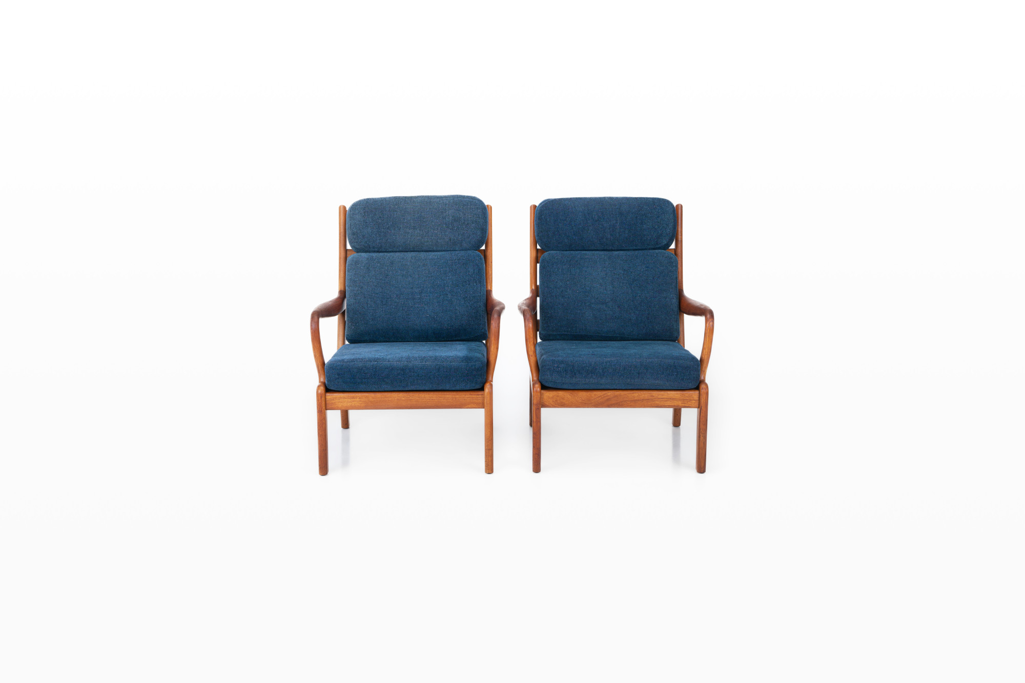 Set of two Scandinavian lounge chairs by L. Olsen & Søn, Denmark 1960s. These lounge chairs have a teak frame, blue upholstery and are in very good condition. The chairs are marked by the producer.