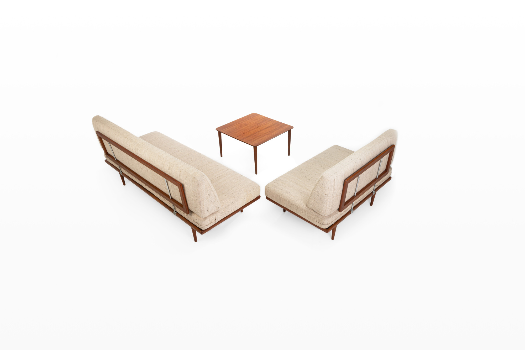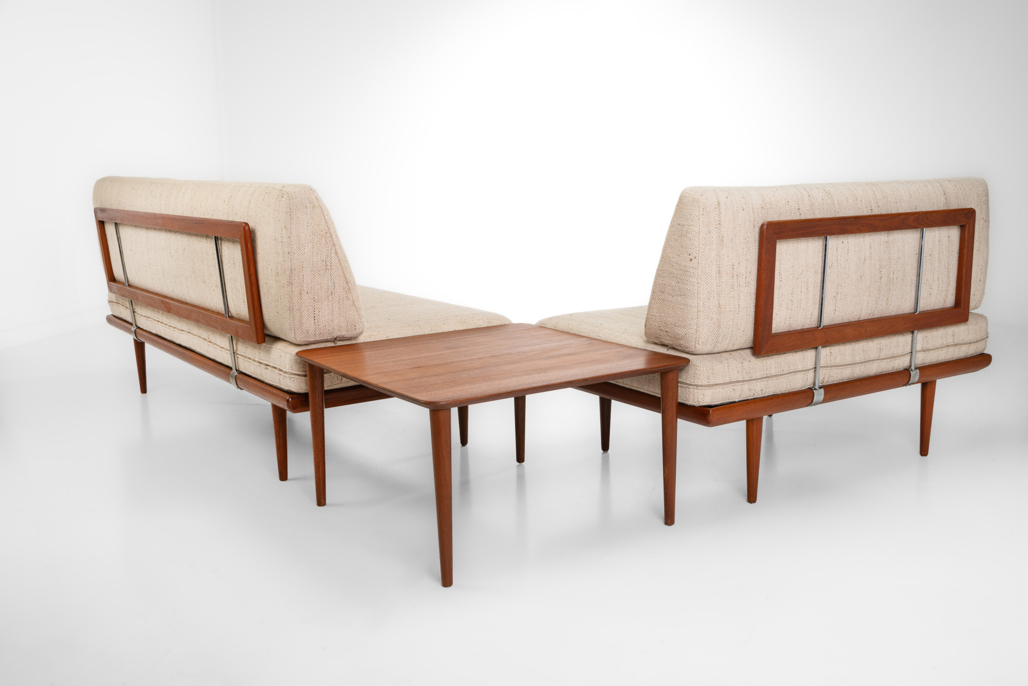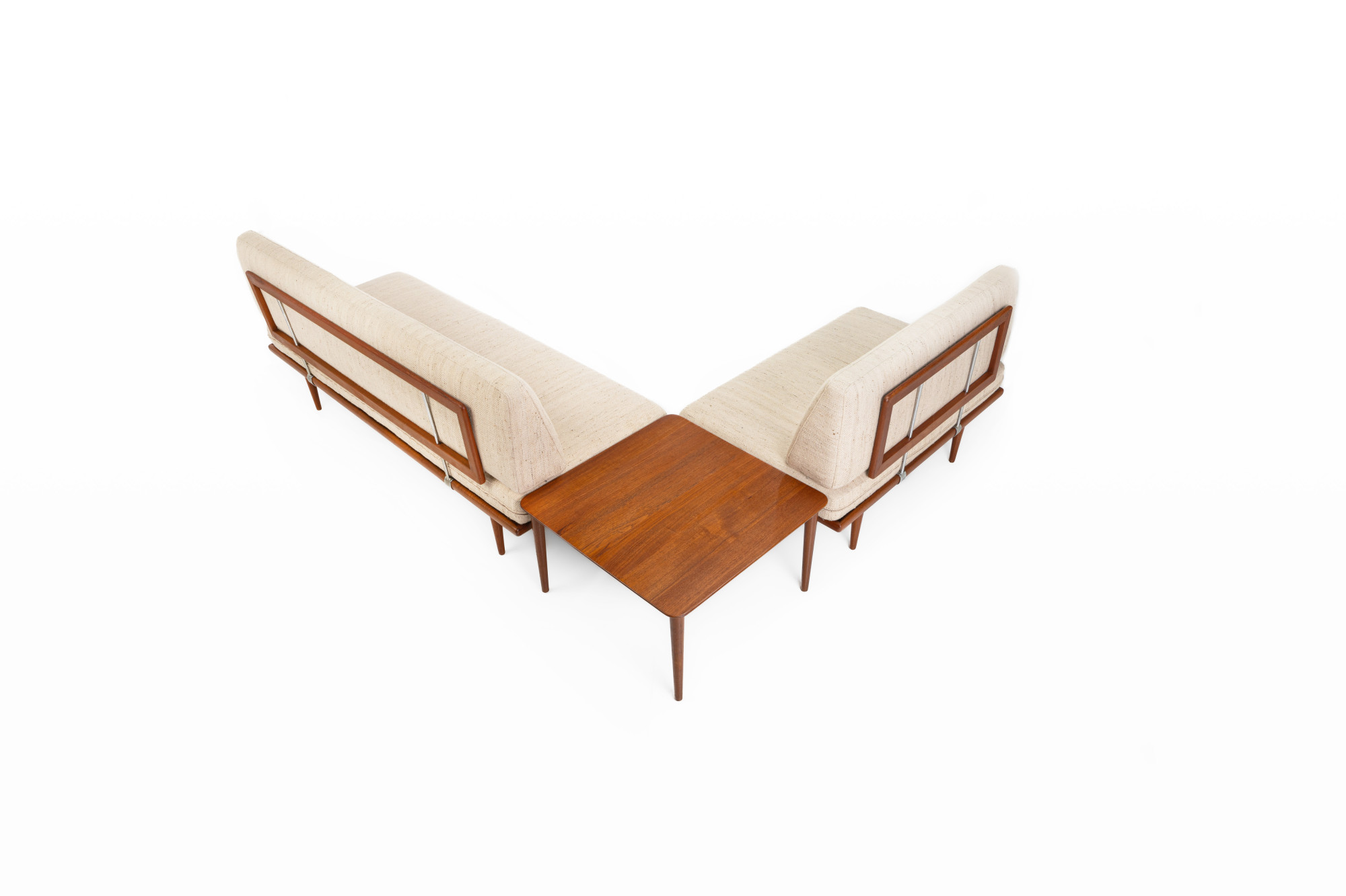 A stunning Minerva seating group designed by Peter Hvidt and Orla Mølgaard Nielsen for France & Daverkosen. The set includes a teak corner coffee table and three seater sofa and a two seater sofa.