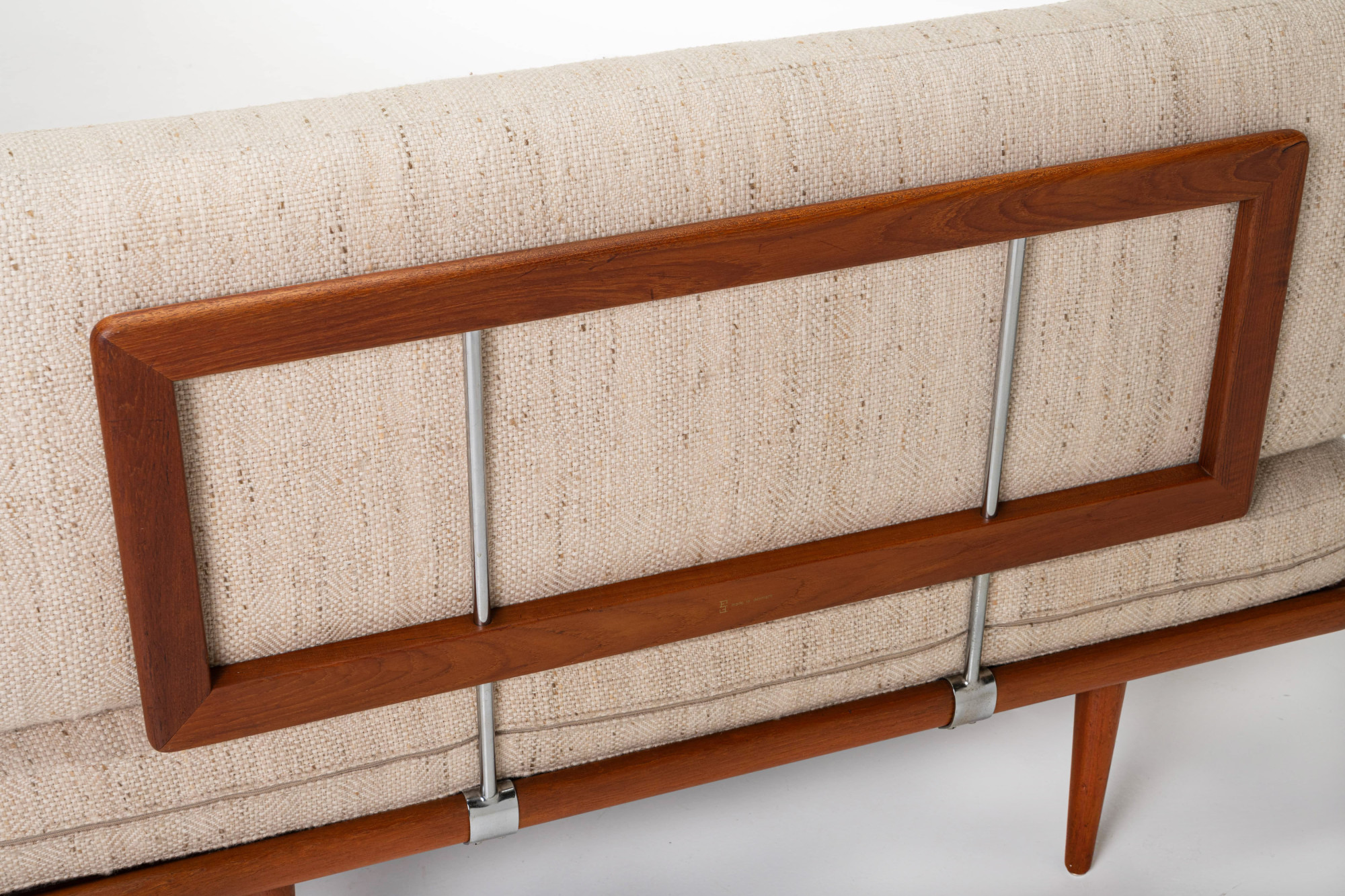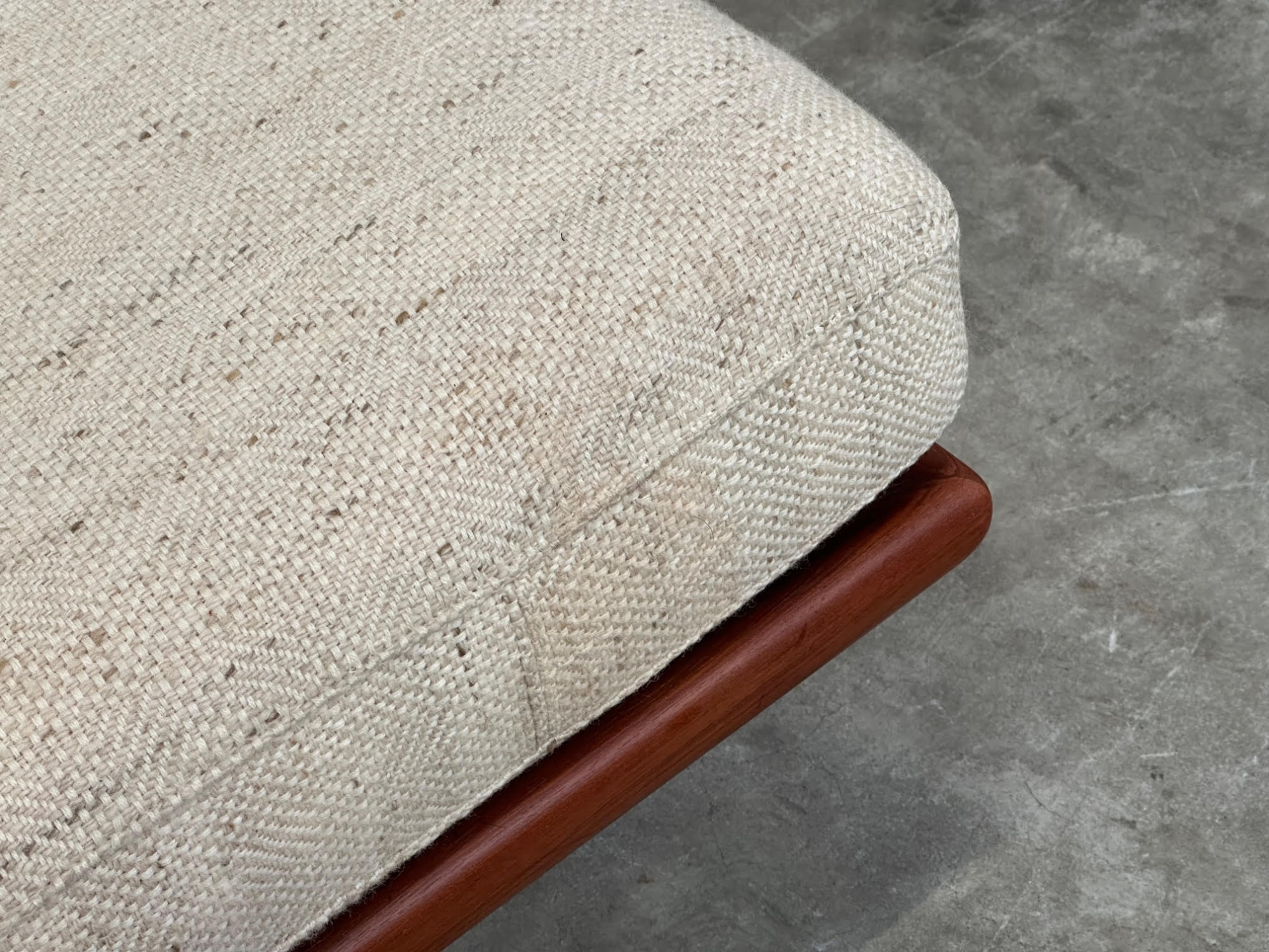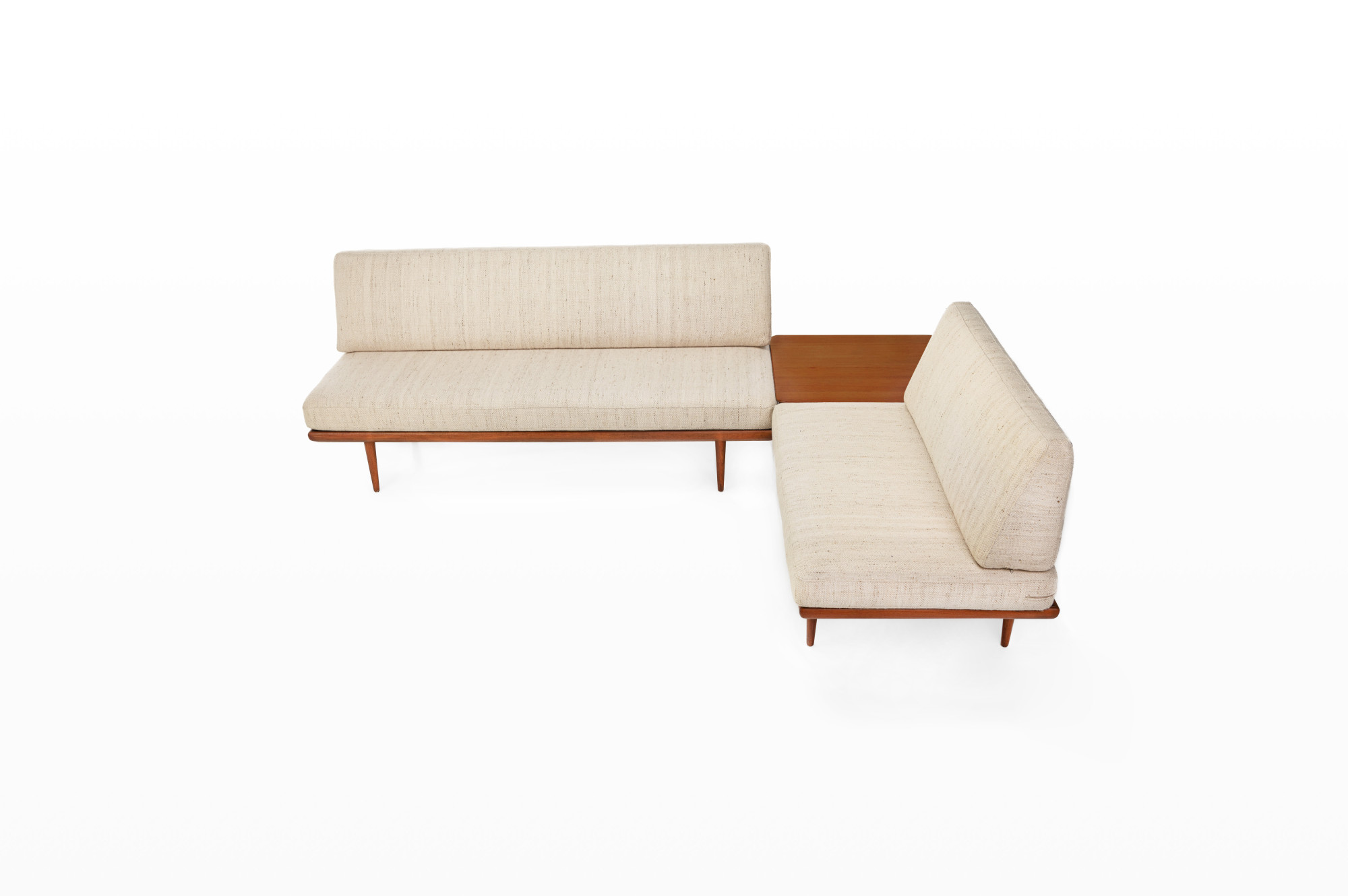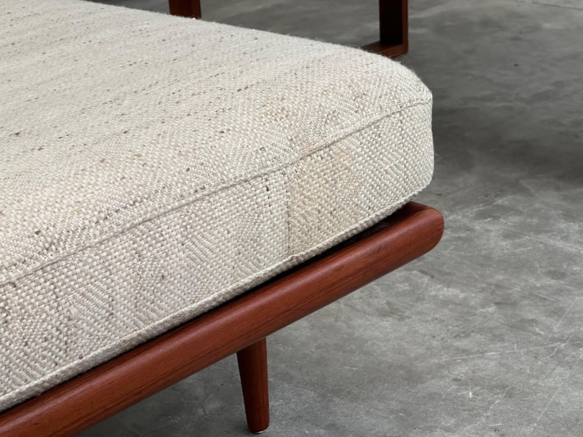 A stunning Minerva seating group designed by Peter Hvidt and Orla Mølgaard Nielsen for France & Daverkosen. The set includes a teak corner coffee table and three seater sofa and a two seater sofa.