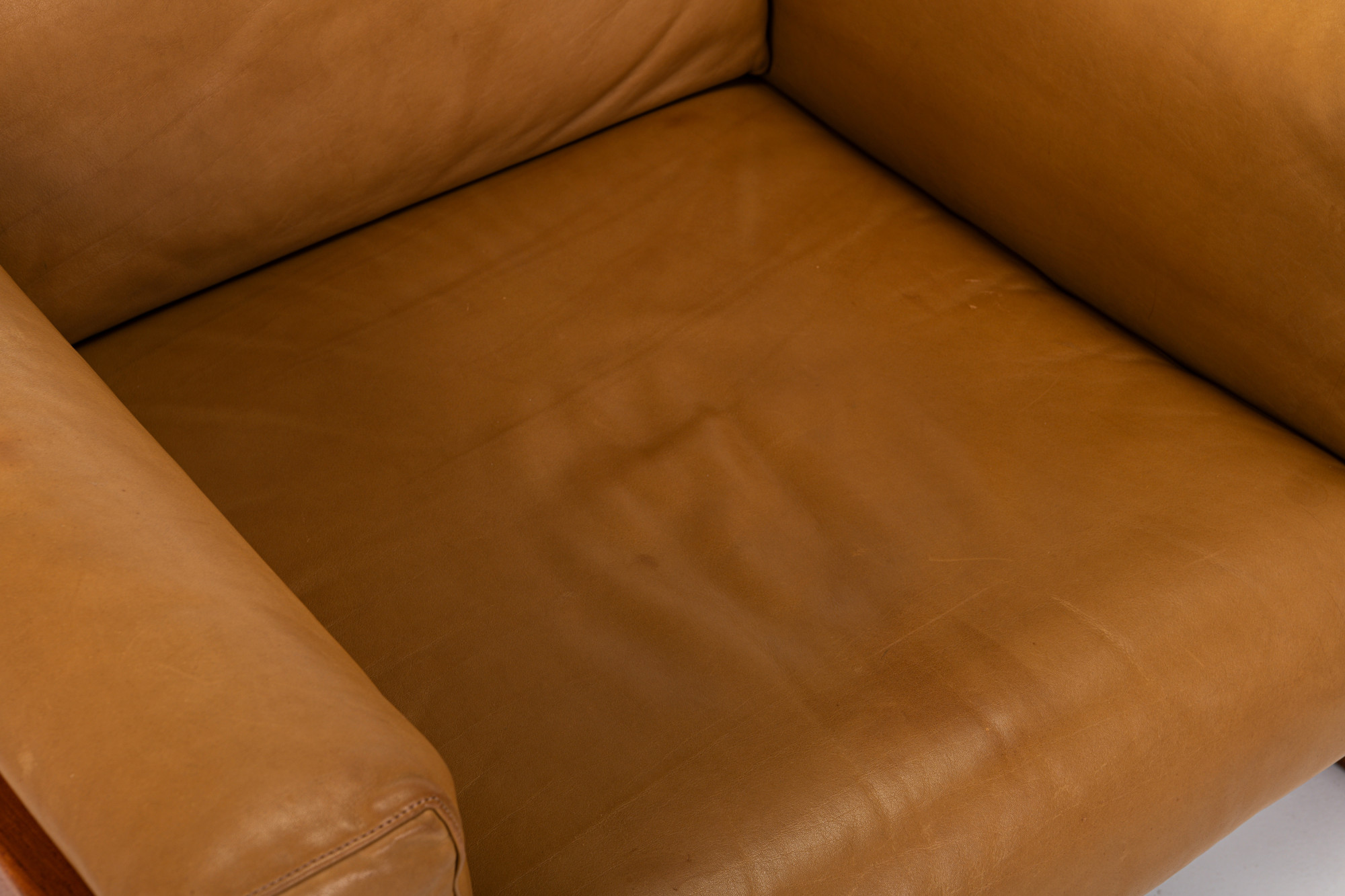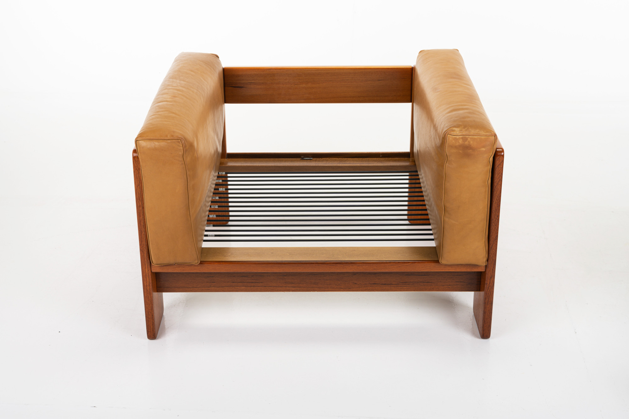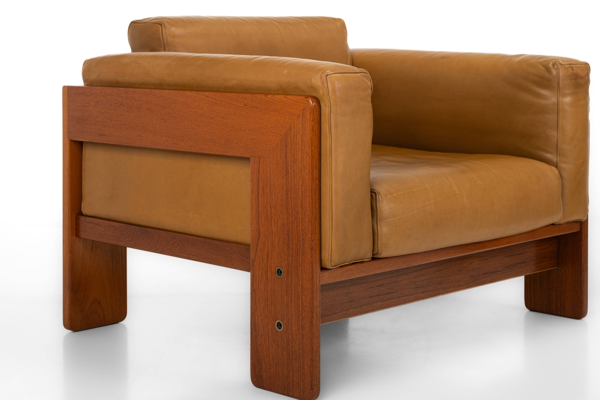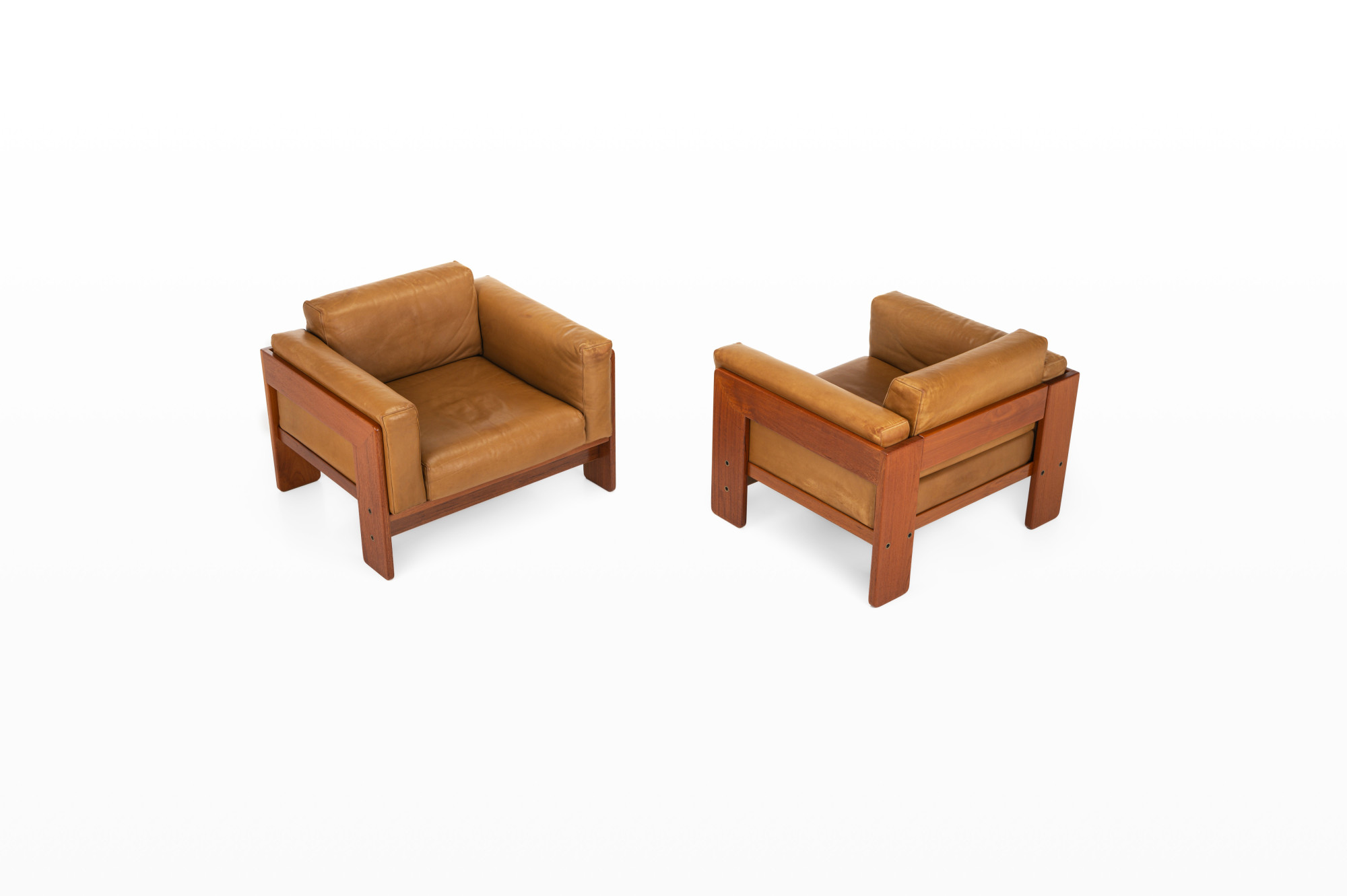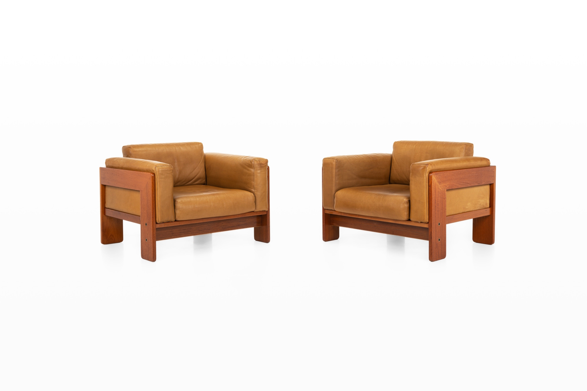 Beautiful pair of Bastiano lounge chairs designed by Tobia and Afra Scarpa for Gavina. This set is made of teak wood and cognac brown leather and was produced in Italy in the 1970s. The set is still in very nice condition and is marked by the maker. We also have a matching two-seater available, as shown in the last photo. The price is for the two armchairs.