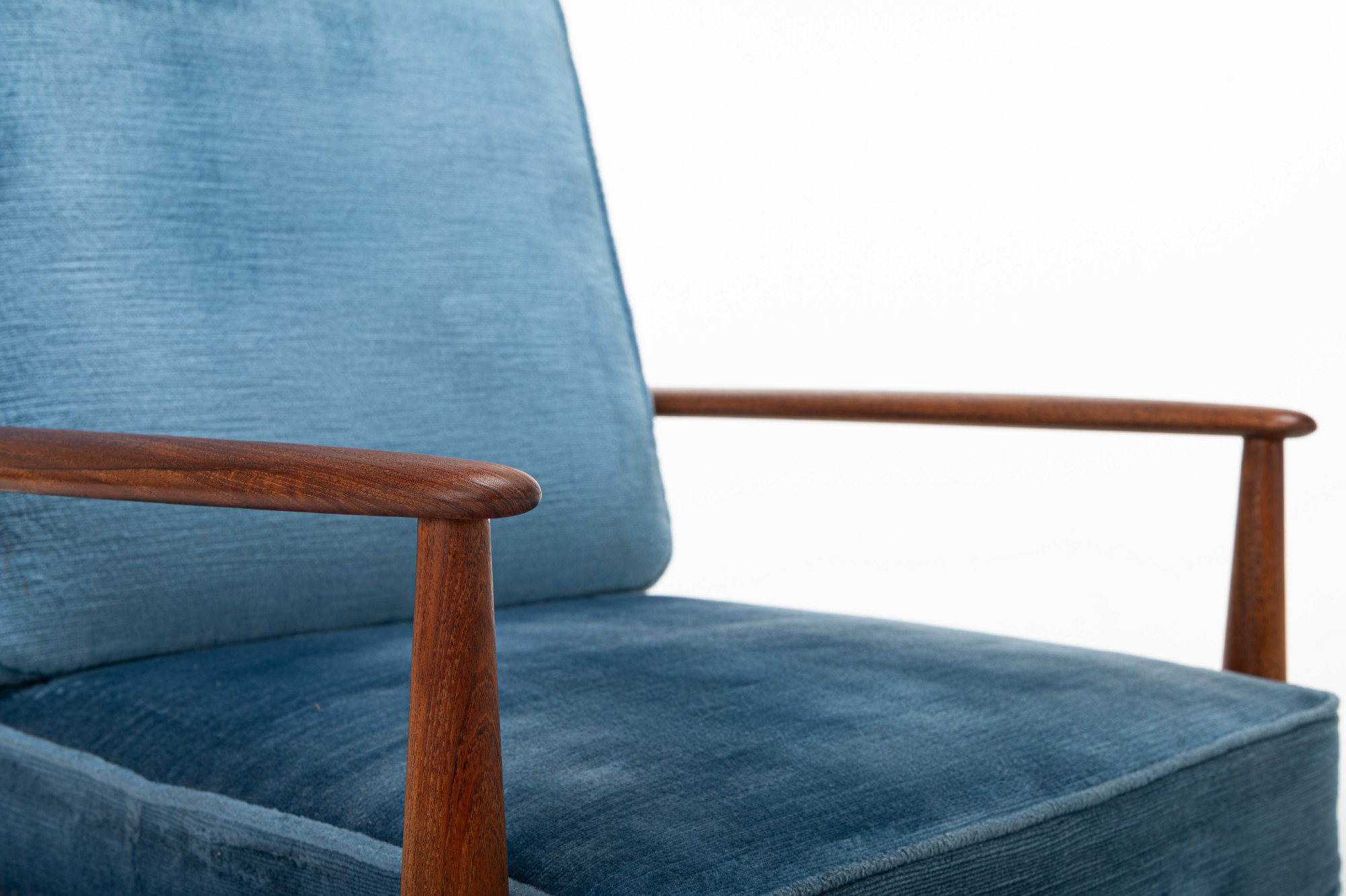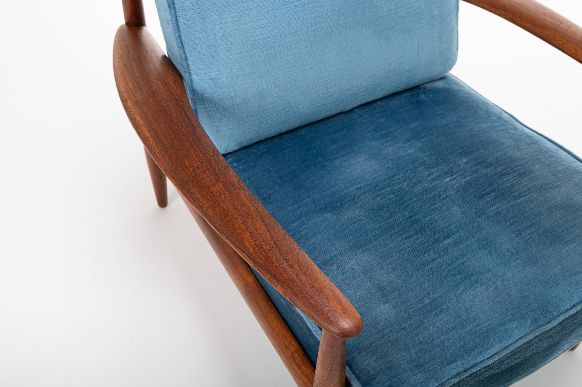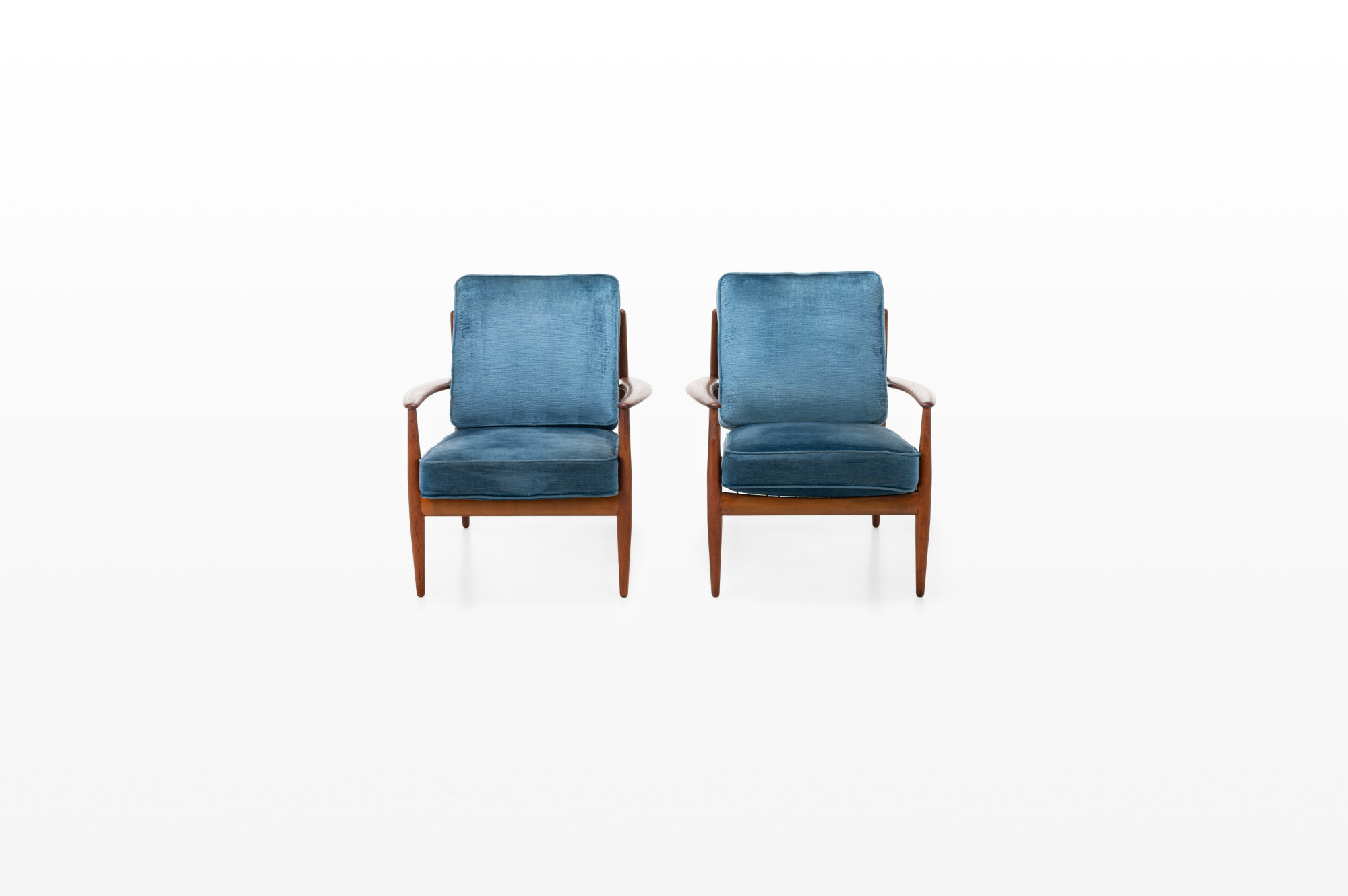 Danish vintage set of two armchairs in teak designed by Grete Jalk for France & Daverkosen in 1962. This easy chair has a teak frame, blue velvet fabric and is marked by the producer. The chairs are in very good condition.