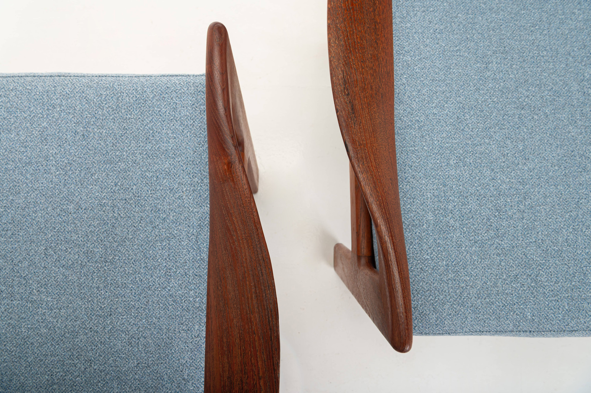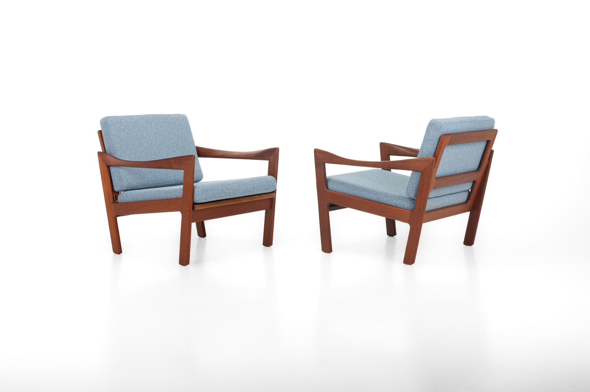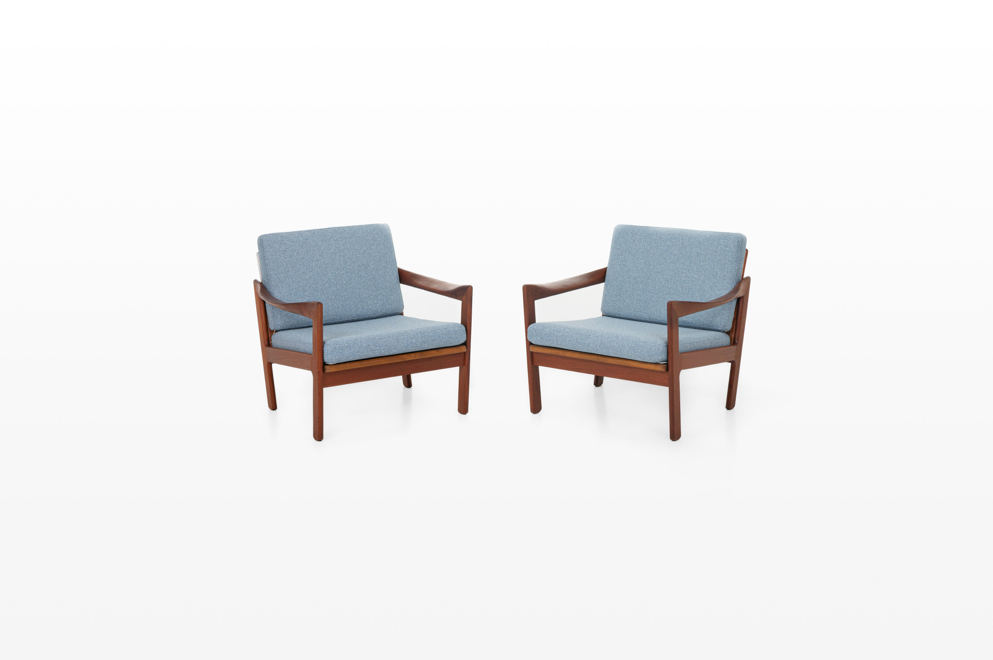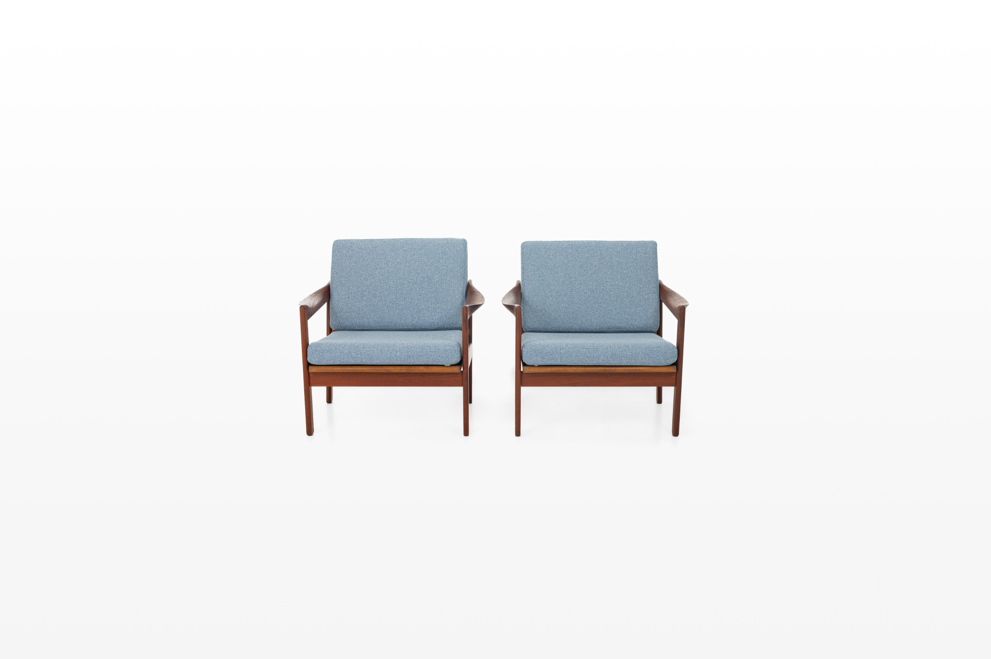 Beautiful pair of easy chairs designed by Illum Wikkelsø for Niels Eilersen, Denmark 1960s. The easy chairs have a teak frame and the cushions are reupholsted in a light blue fabric. The armchairs are in great condition.