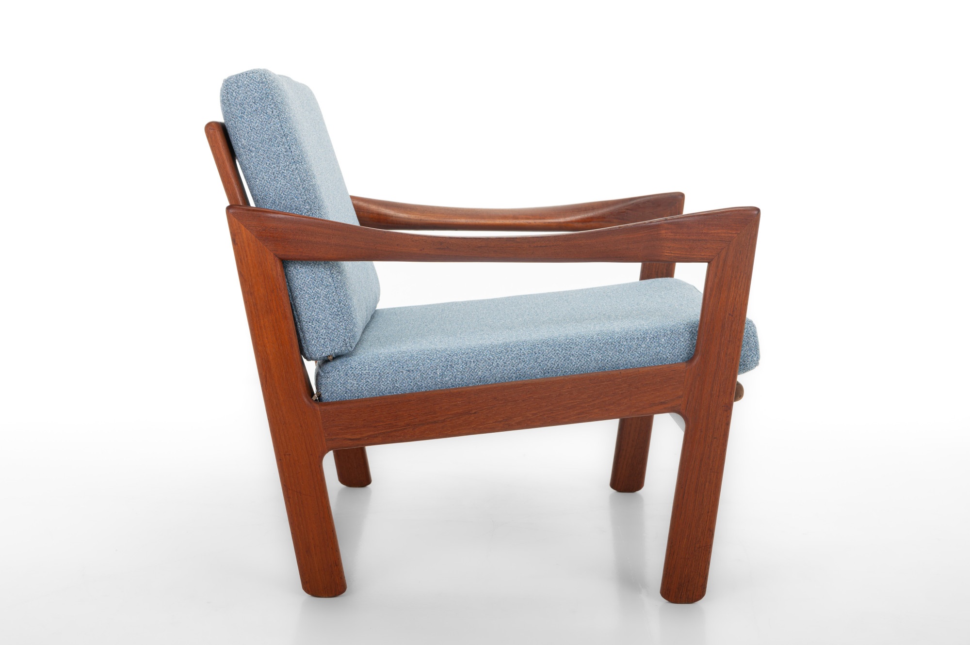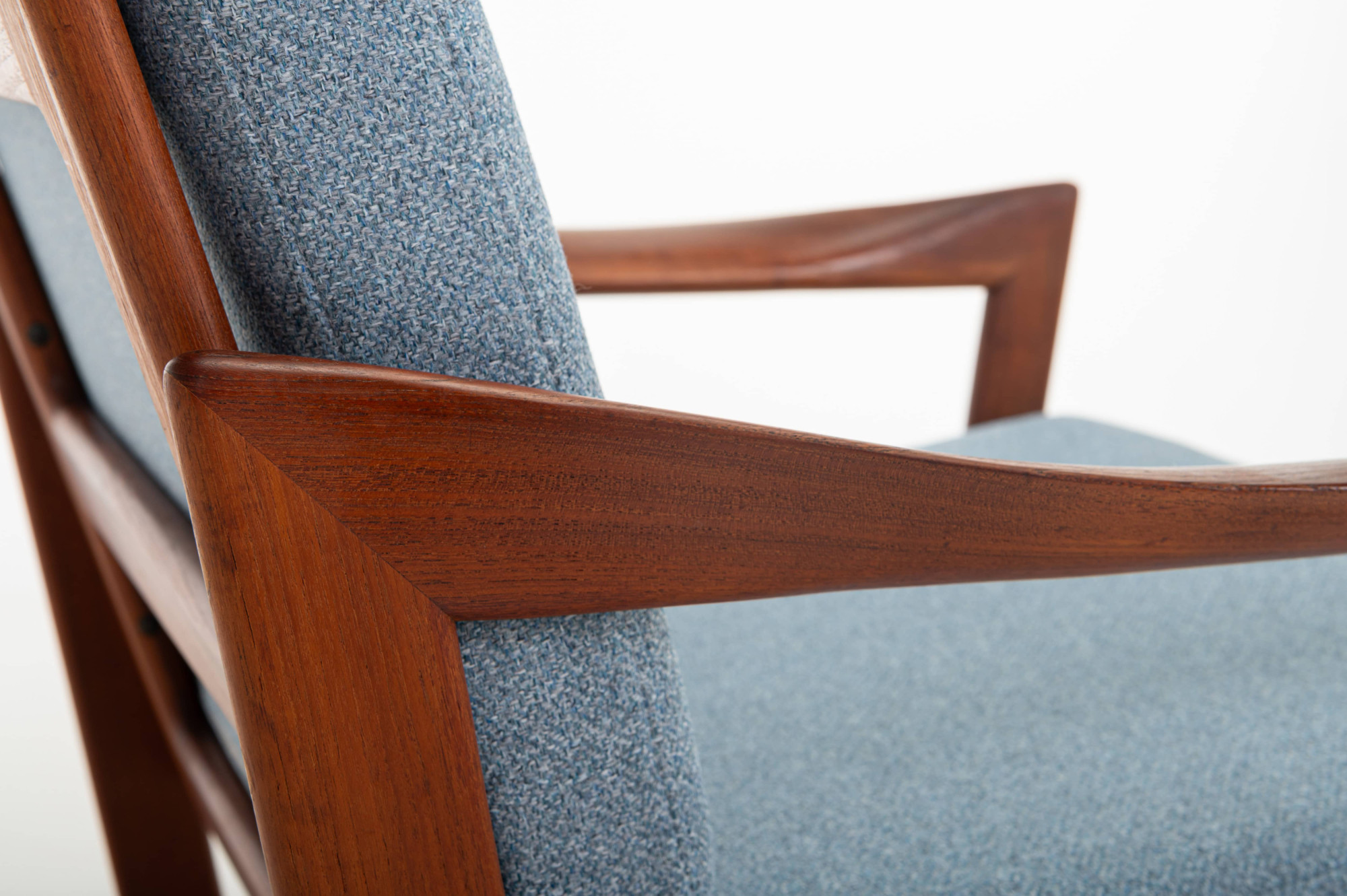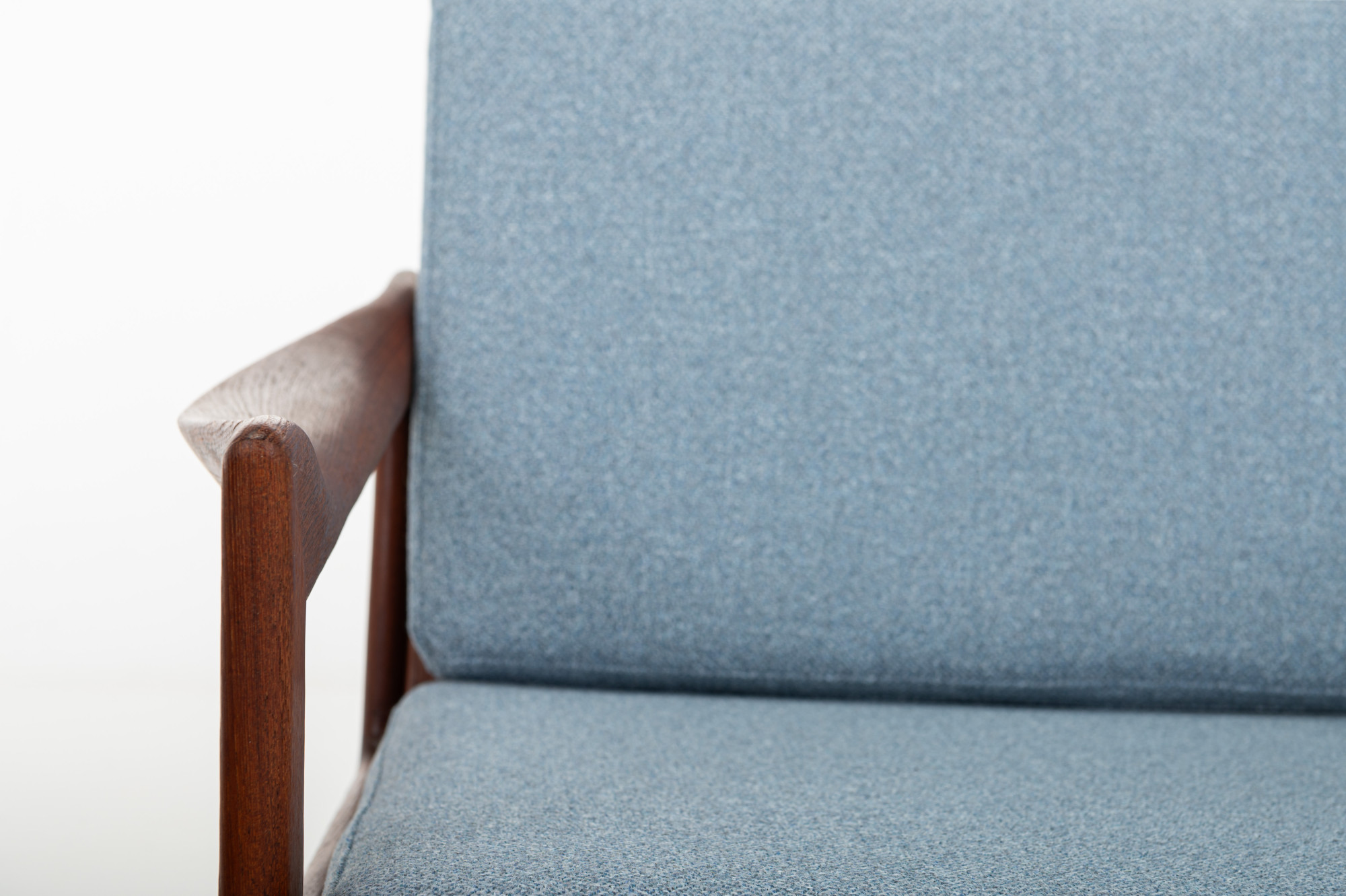 Beautiful pair of easy chairs designed by Illum Wikkelsø for Niels Eilersen, Denmark 1960s. The easy chairs have a teak frame and the cushions are reupholsted in a light blue fabric. The armchairs are in great condition.
