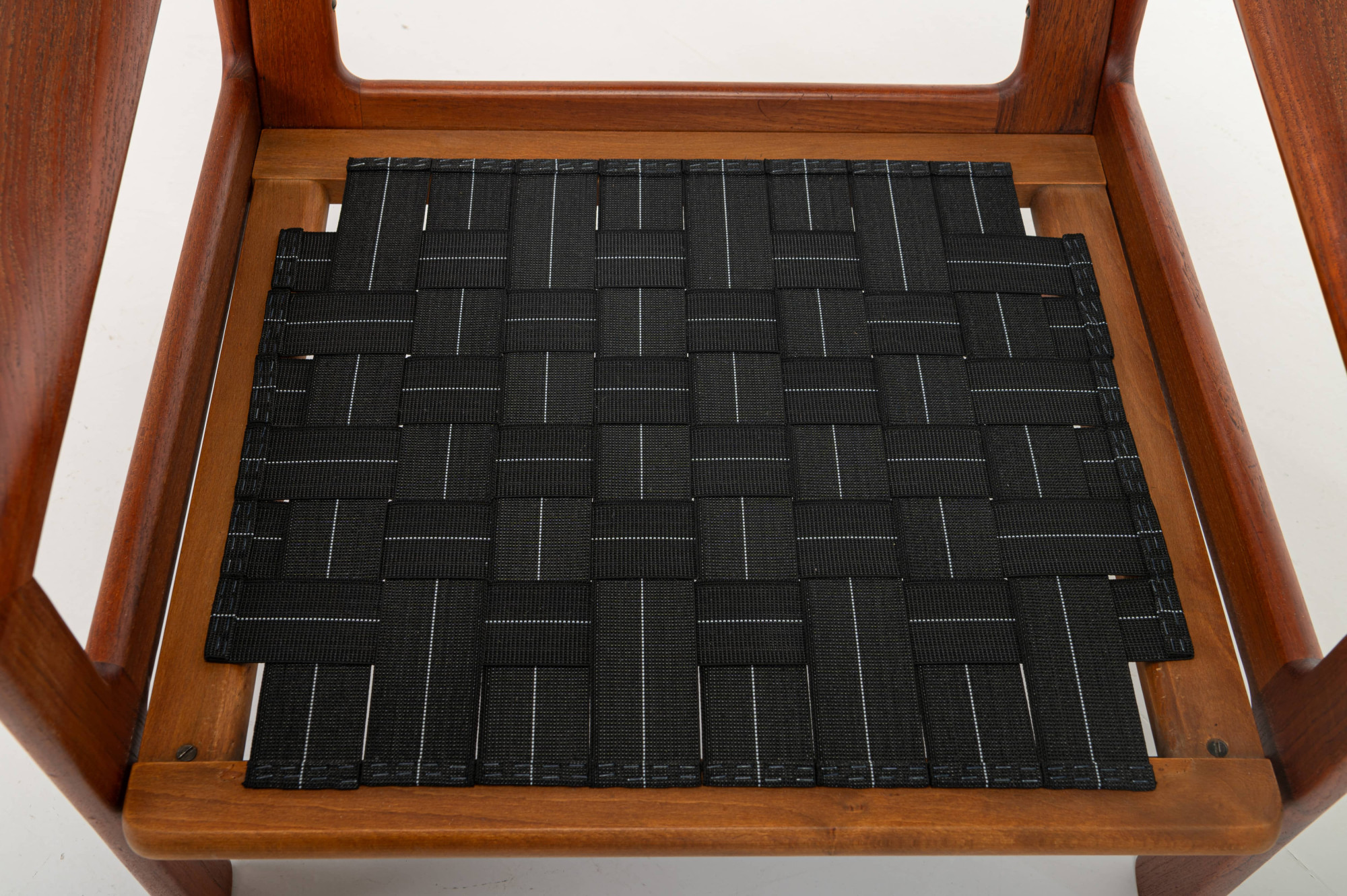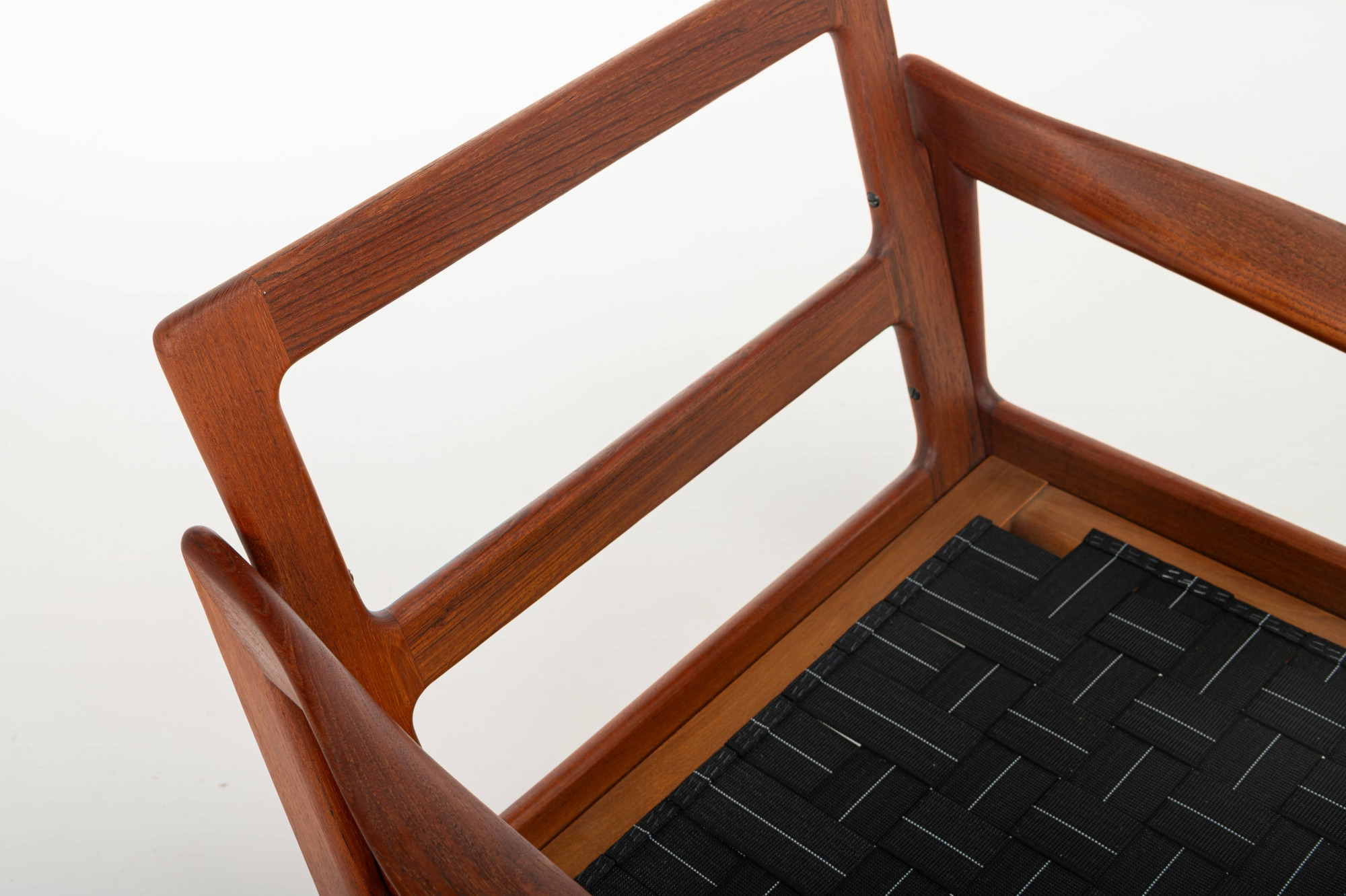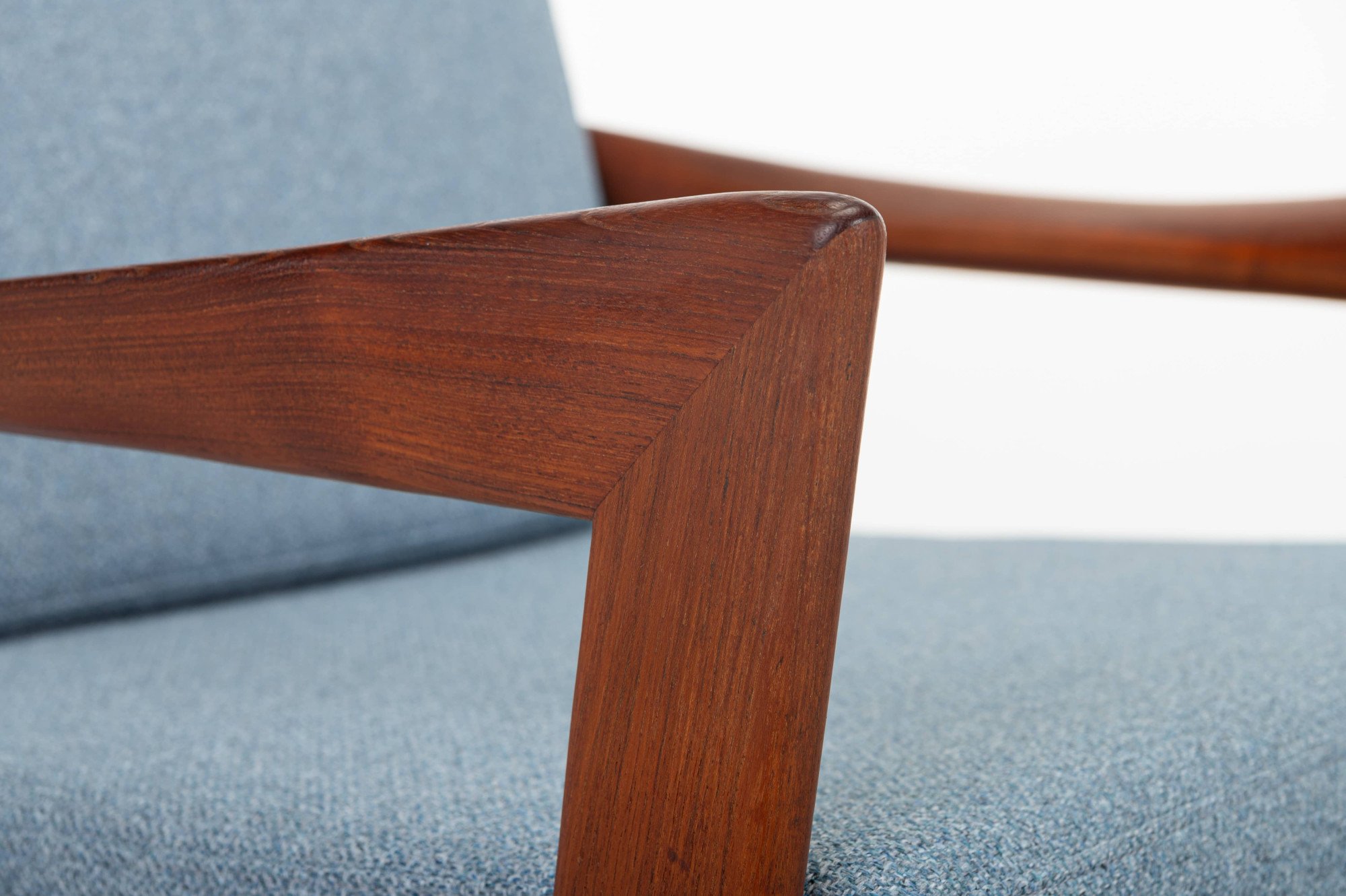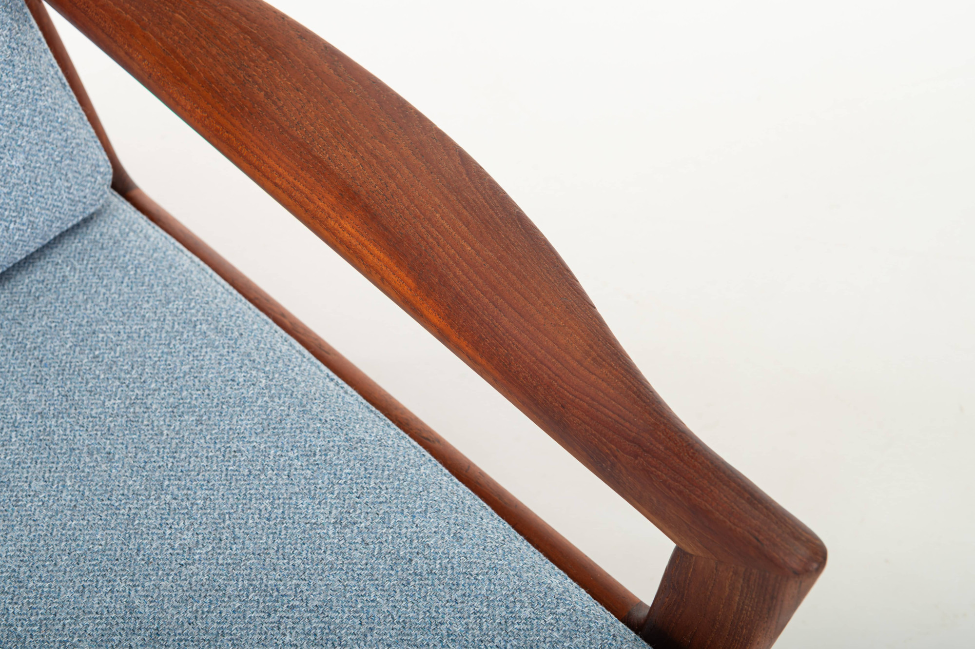 Beautiful pair of easy chairs designed by Illum Wikkelsø for Niels Eilersen, Denmark 1960s. The easy chairs have a teak frame and the cushions are reupholsted in a light blue fabric. The armchairs are in great condition.