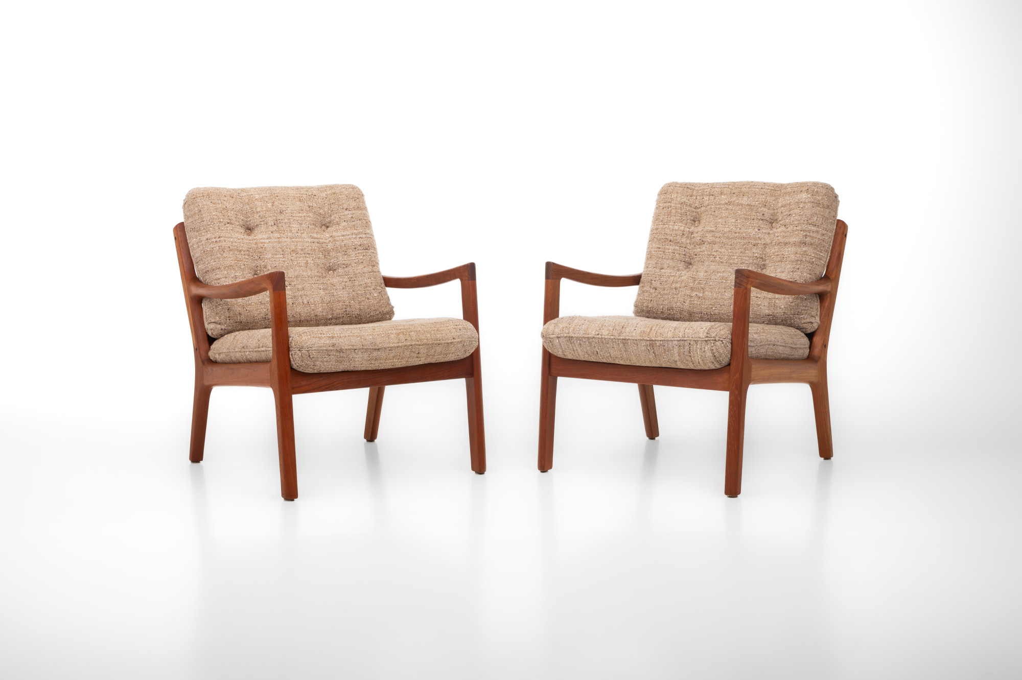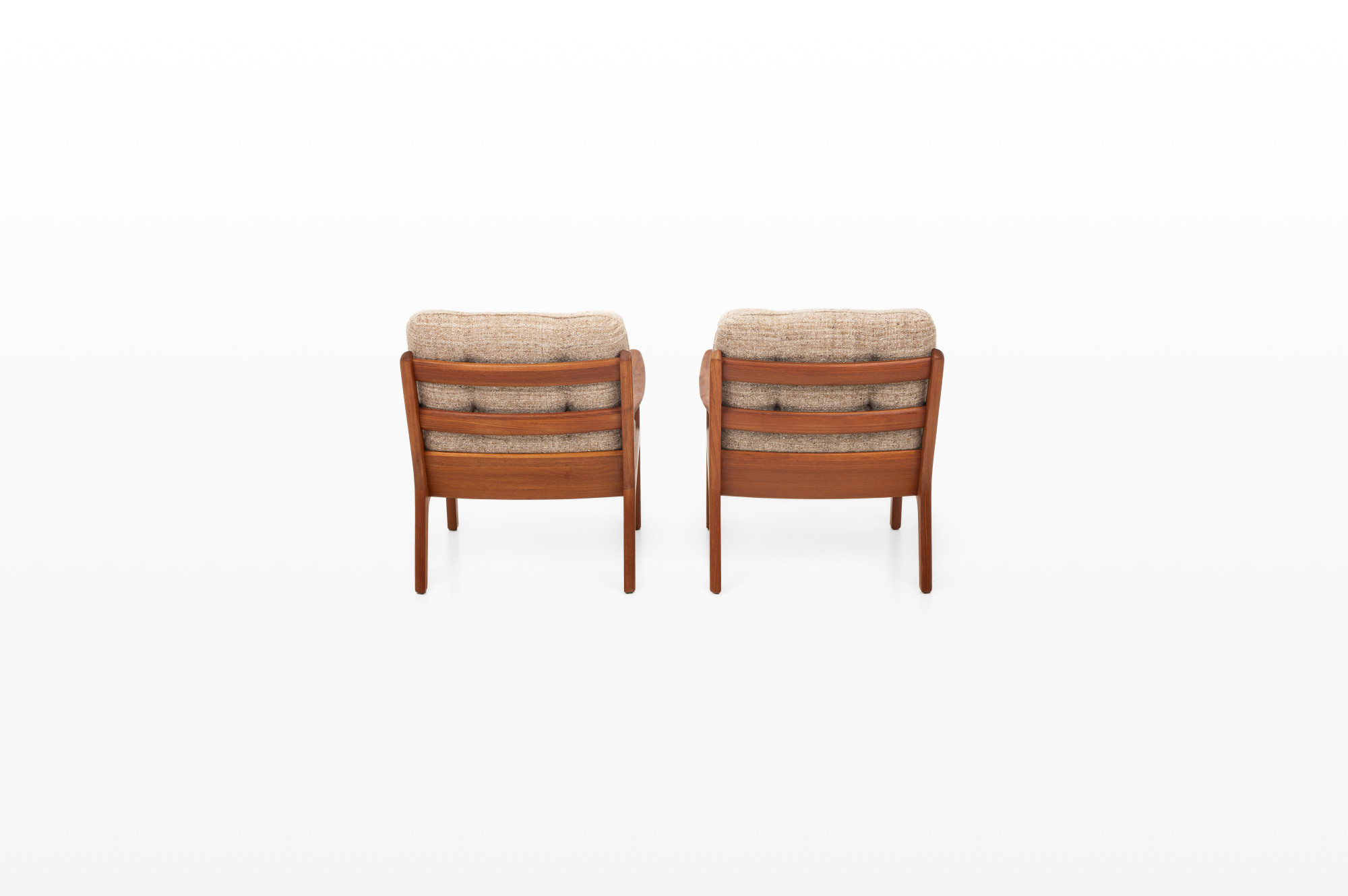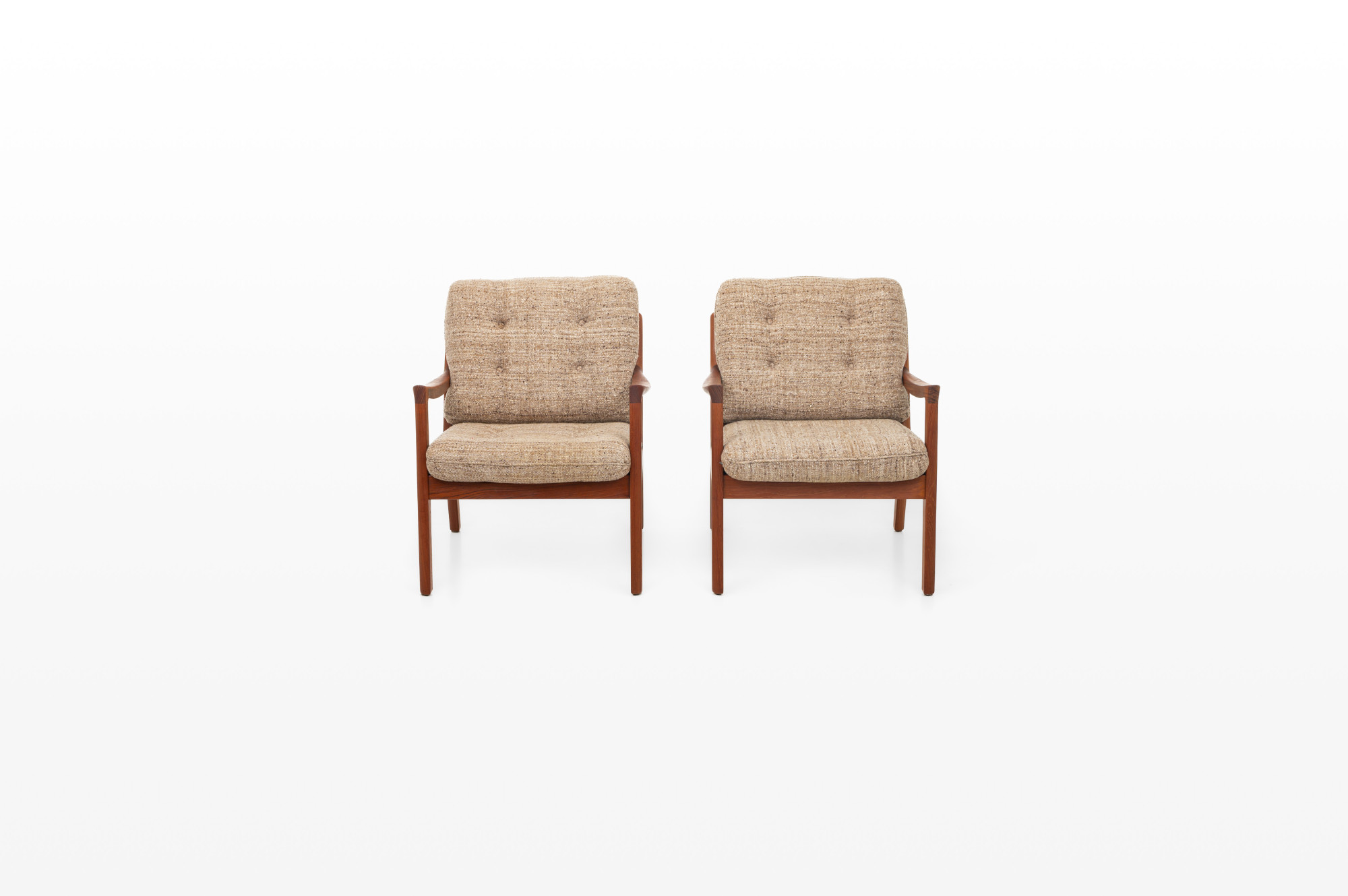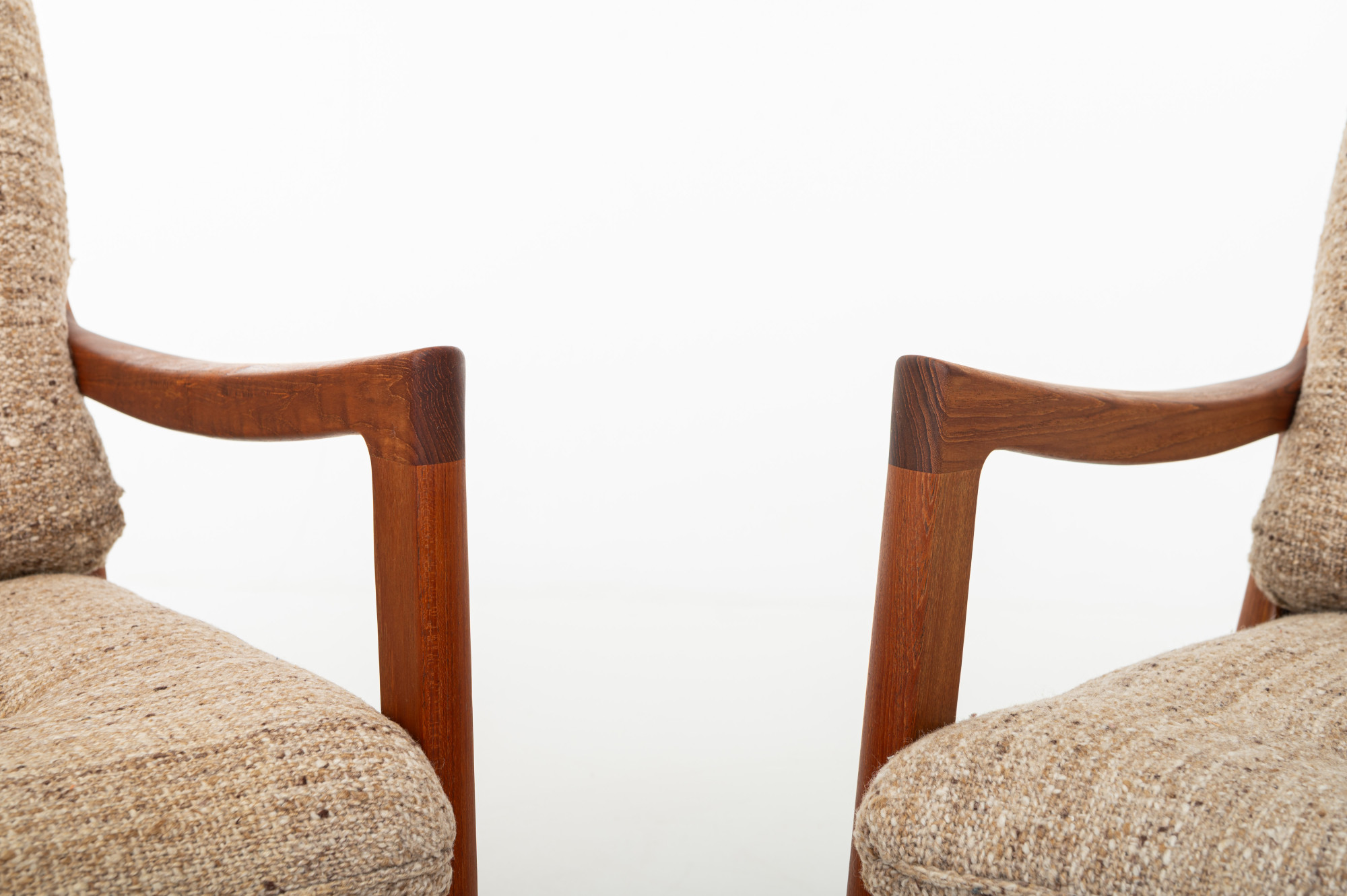 Pair of Danish vintage easy chairs designed by Professor Ole Wanscher for Cado Møbelfabrik, Denmark. The frame of the armchairs are in solid teak and the cushions are in beige wool. Very good condition and marked by the producer.