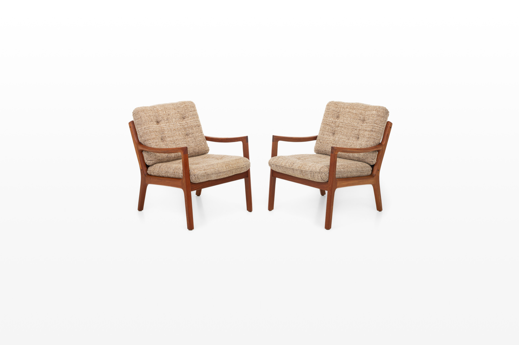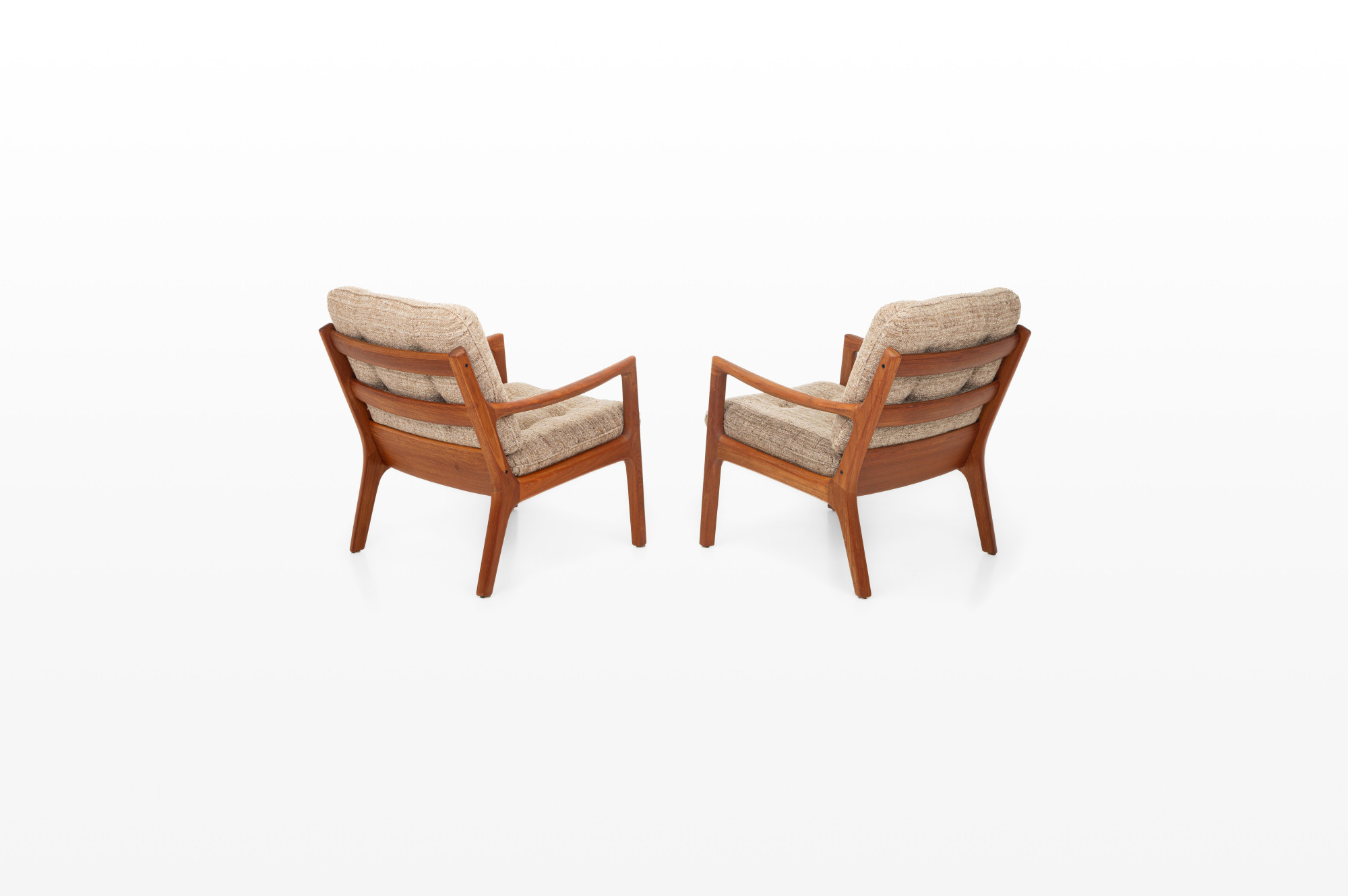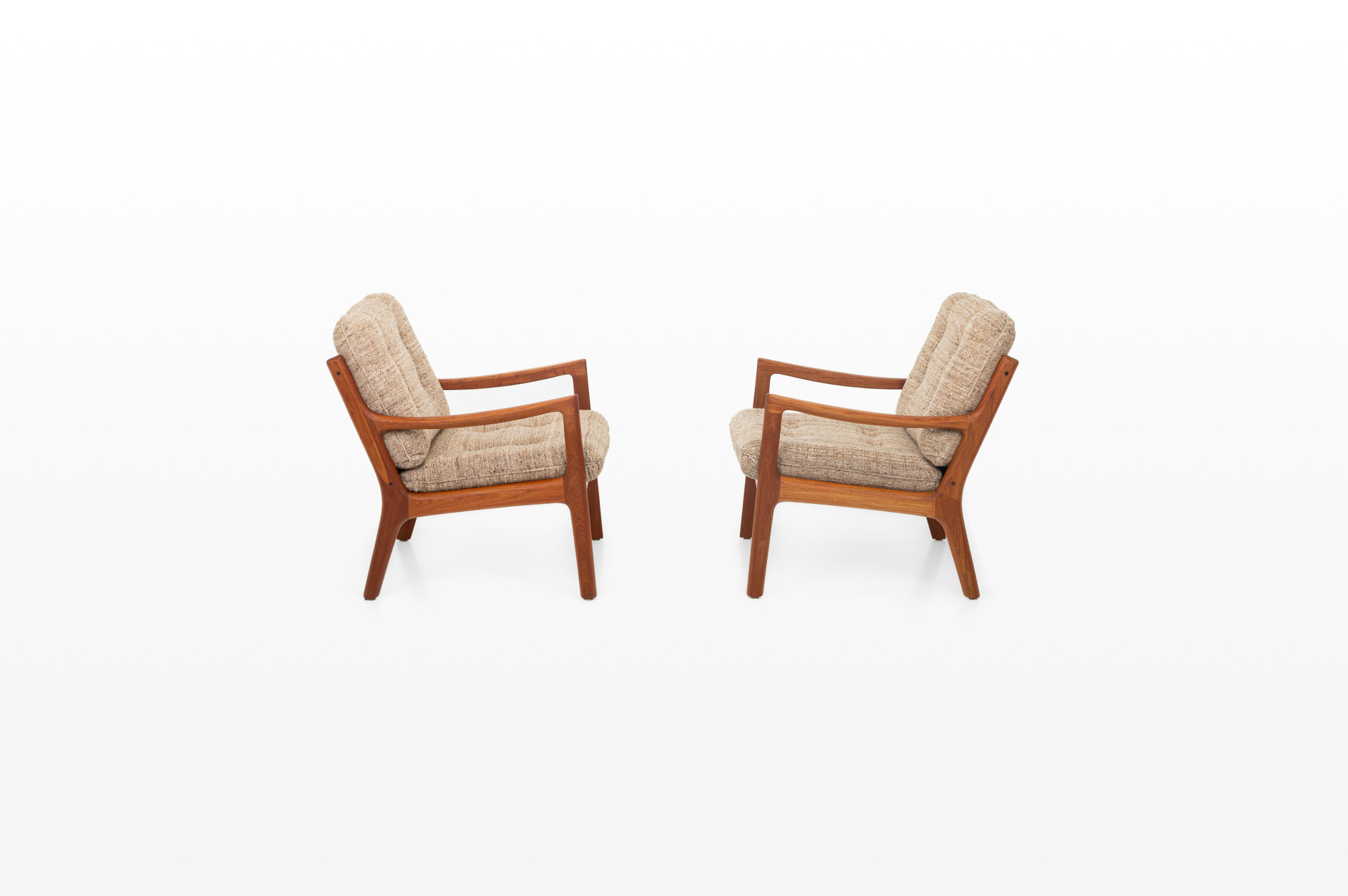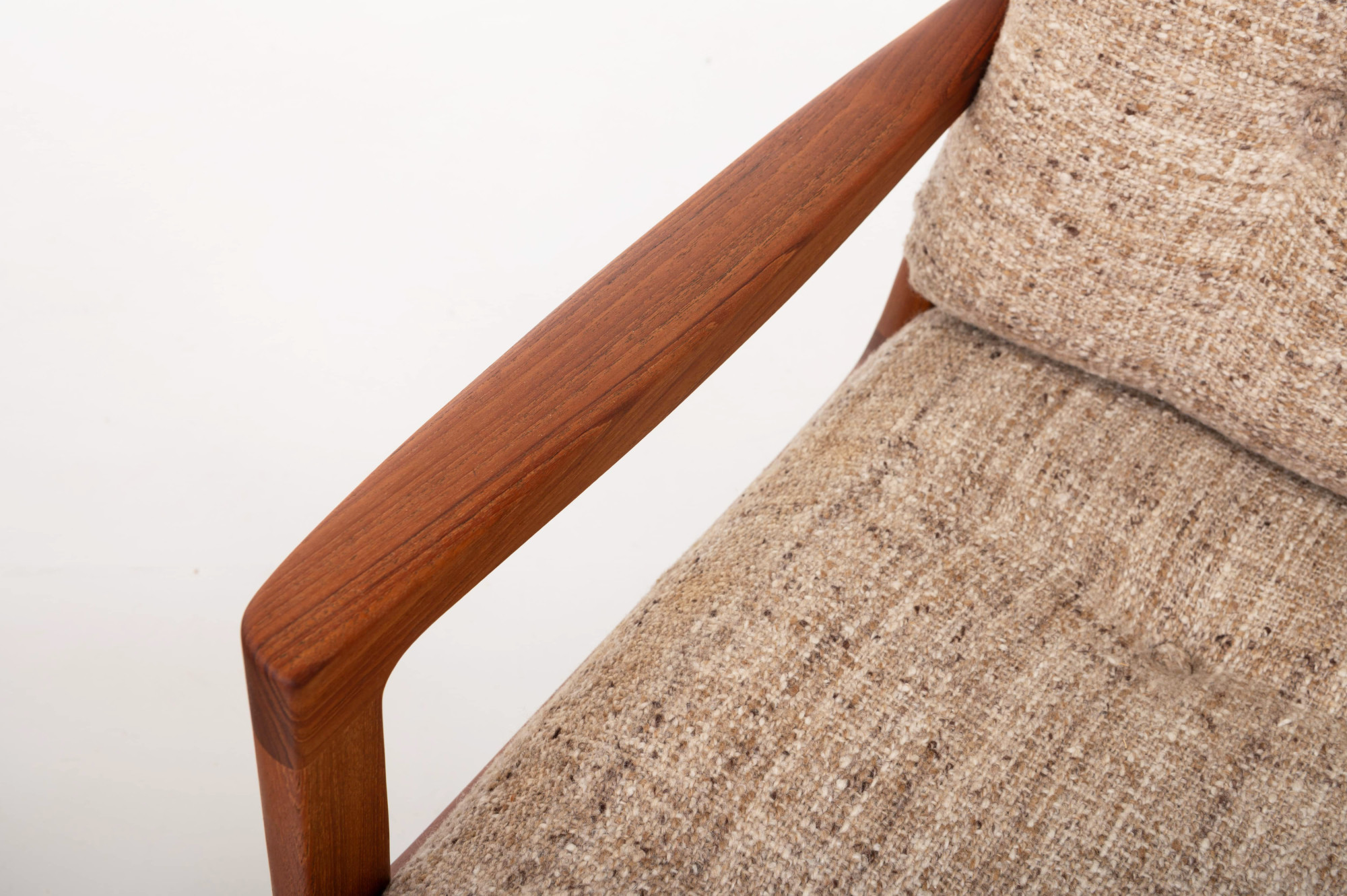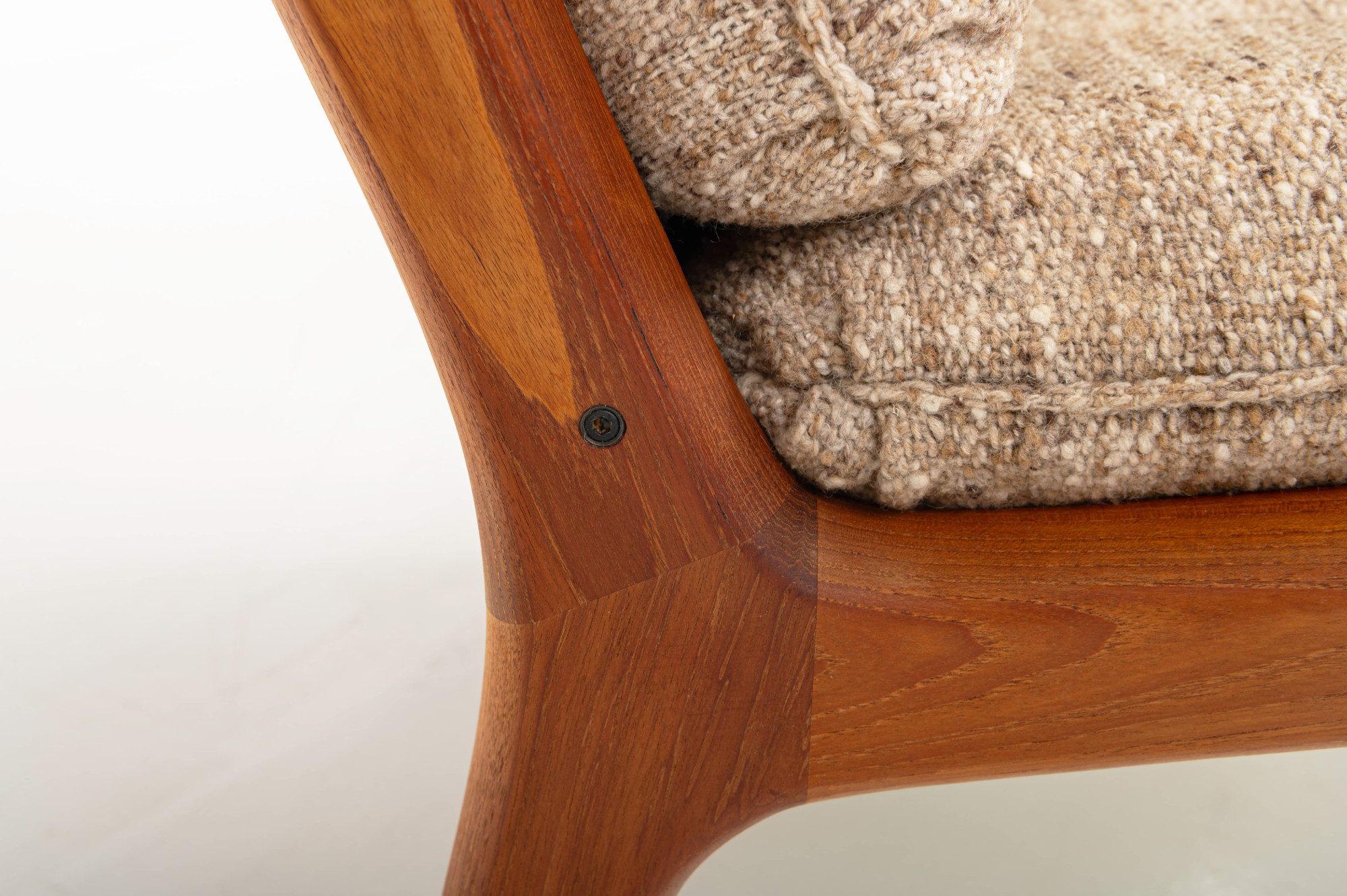 Pair of Danish vintage easy chairs designed by Professor Ole Wanscher for Cado Møbelfabrik, Denmark. The frame of the armchairs are in solid teak and the cushions are in beige wool. Very good condition and marked by the producer.