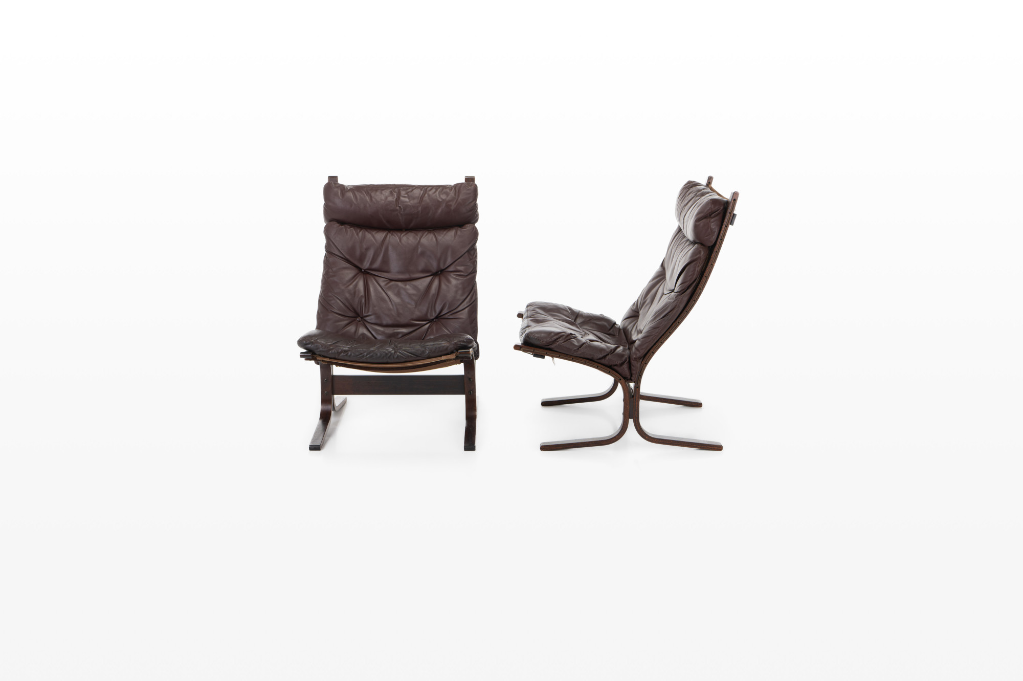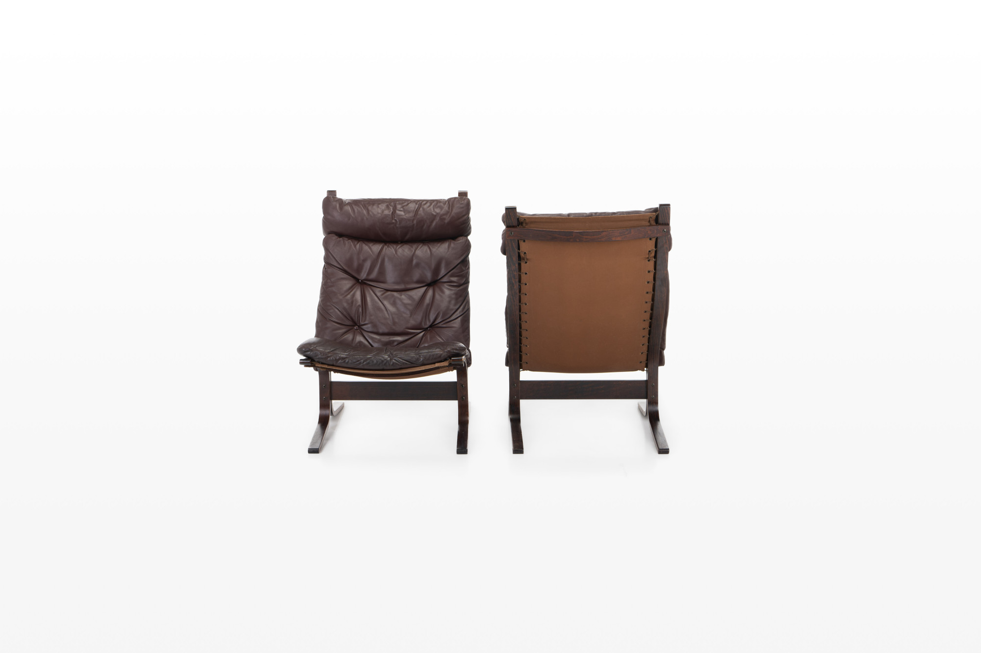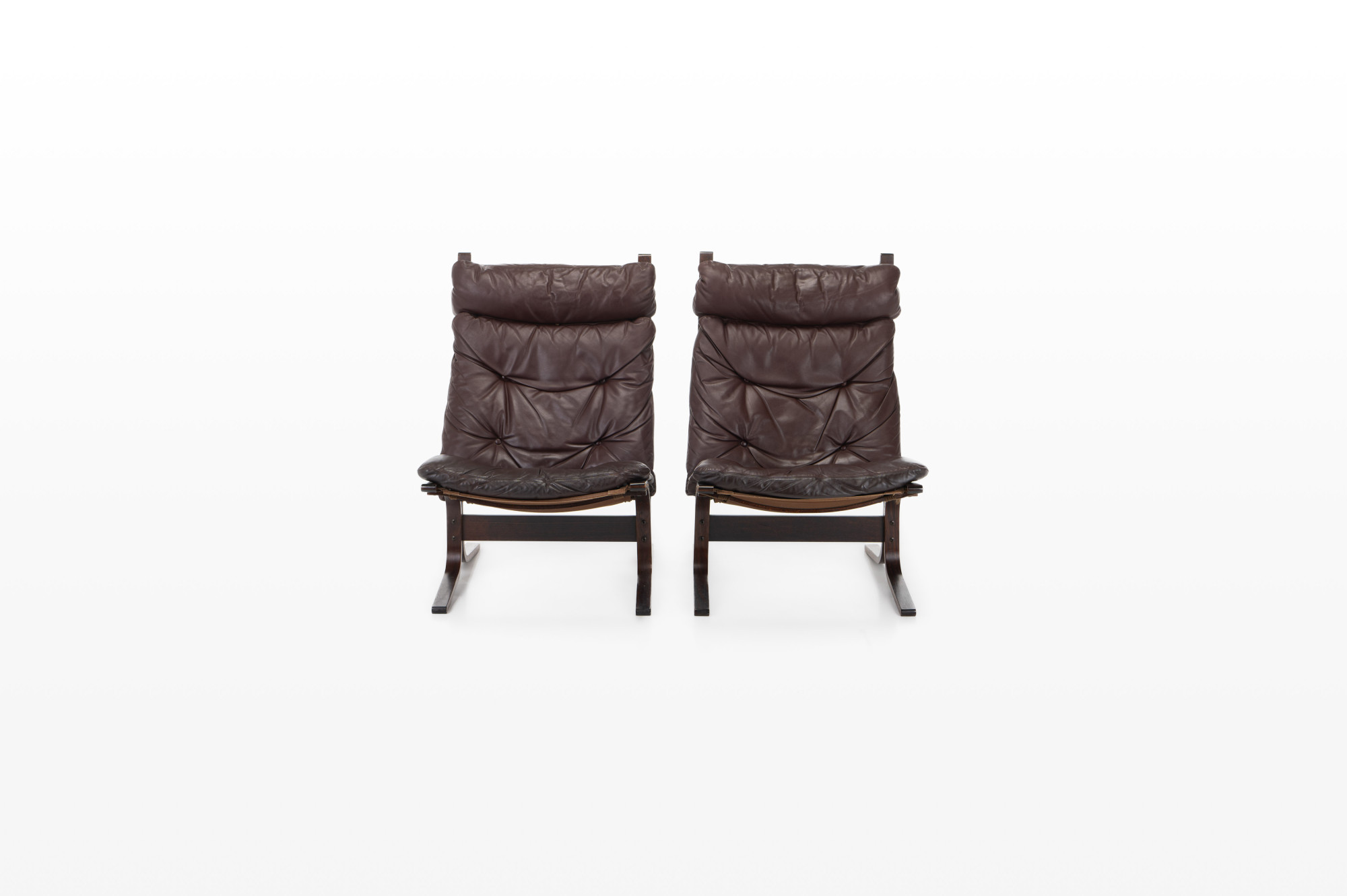 Great pair of vintage ‘Siesta' lounge chairs. These lounge chairs were designed by Ingmar Relling and manufactured by Westnofa, Norway. Bordeaux / brown leather in very good original condition.