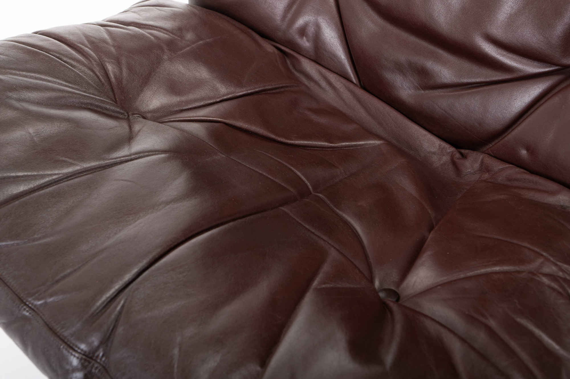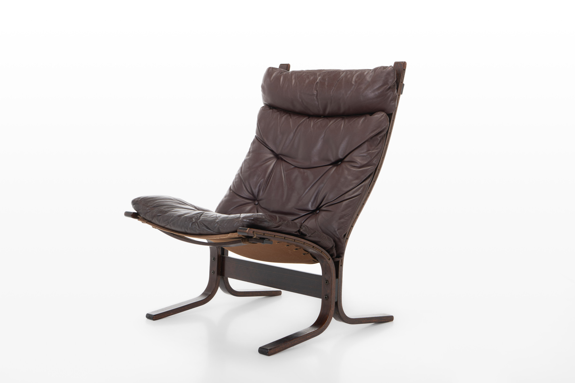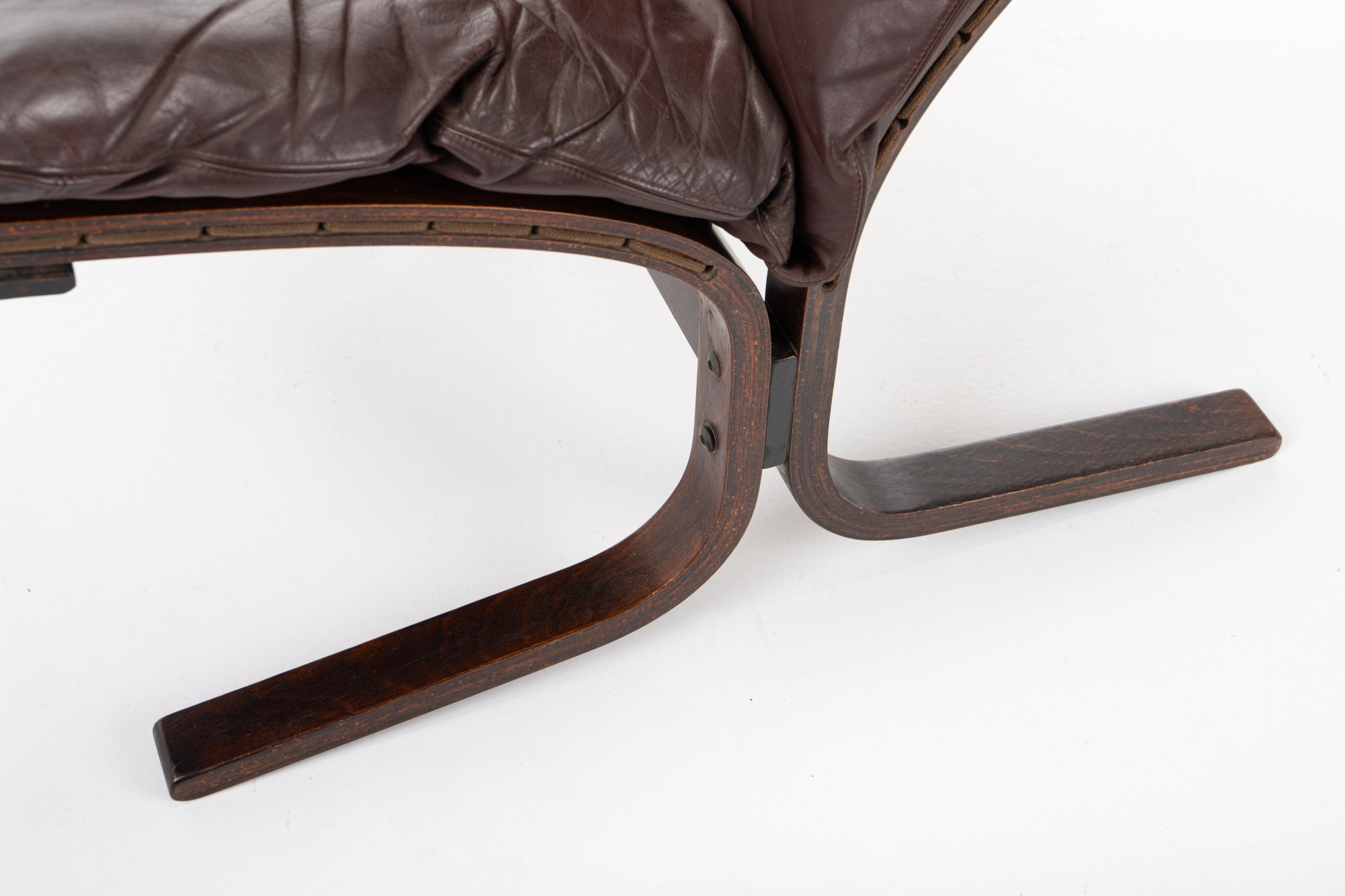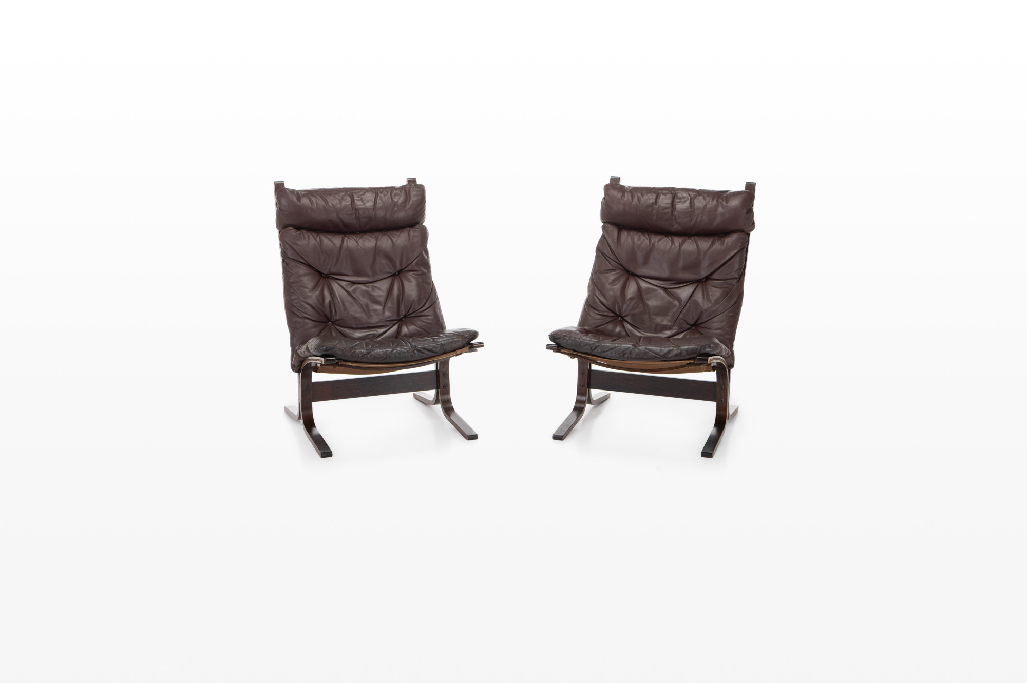 Great pair of vintage ‘Siesta' lounge chairs. These lounge chairs were designed by Ingmar Relling and manufactured by Westnofa, Norway. Bordeaux / brown leather in very good original condition.