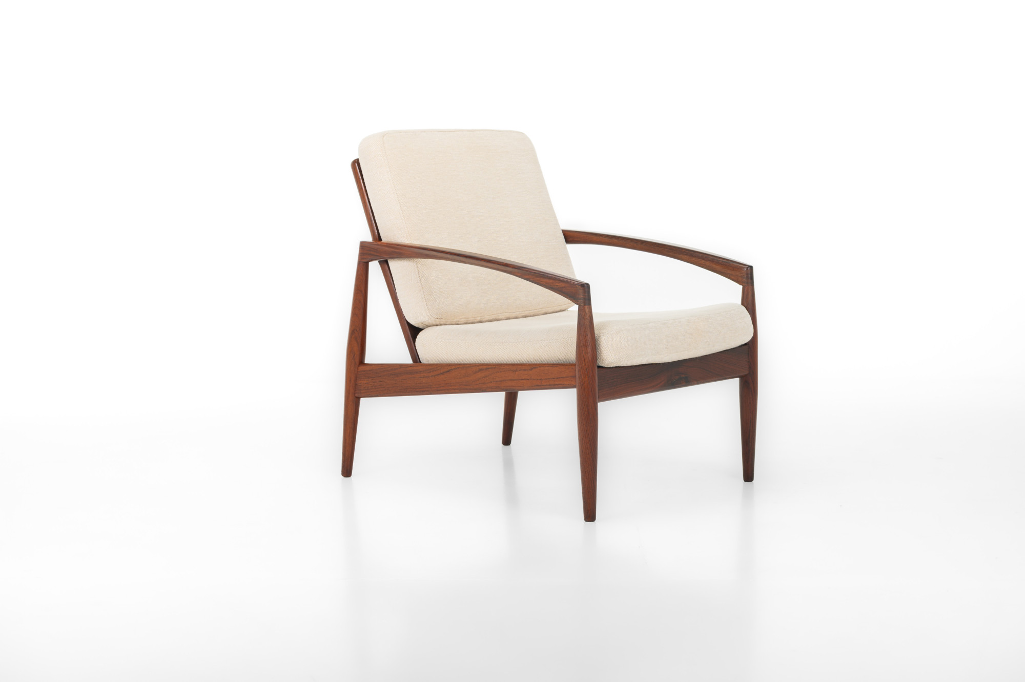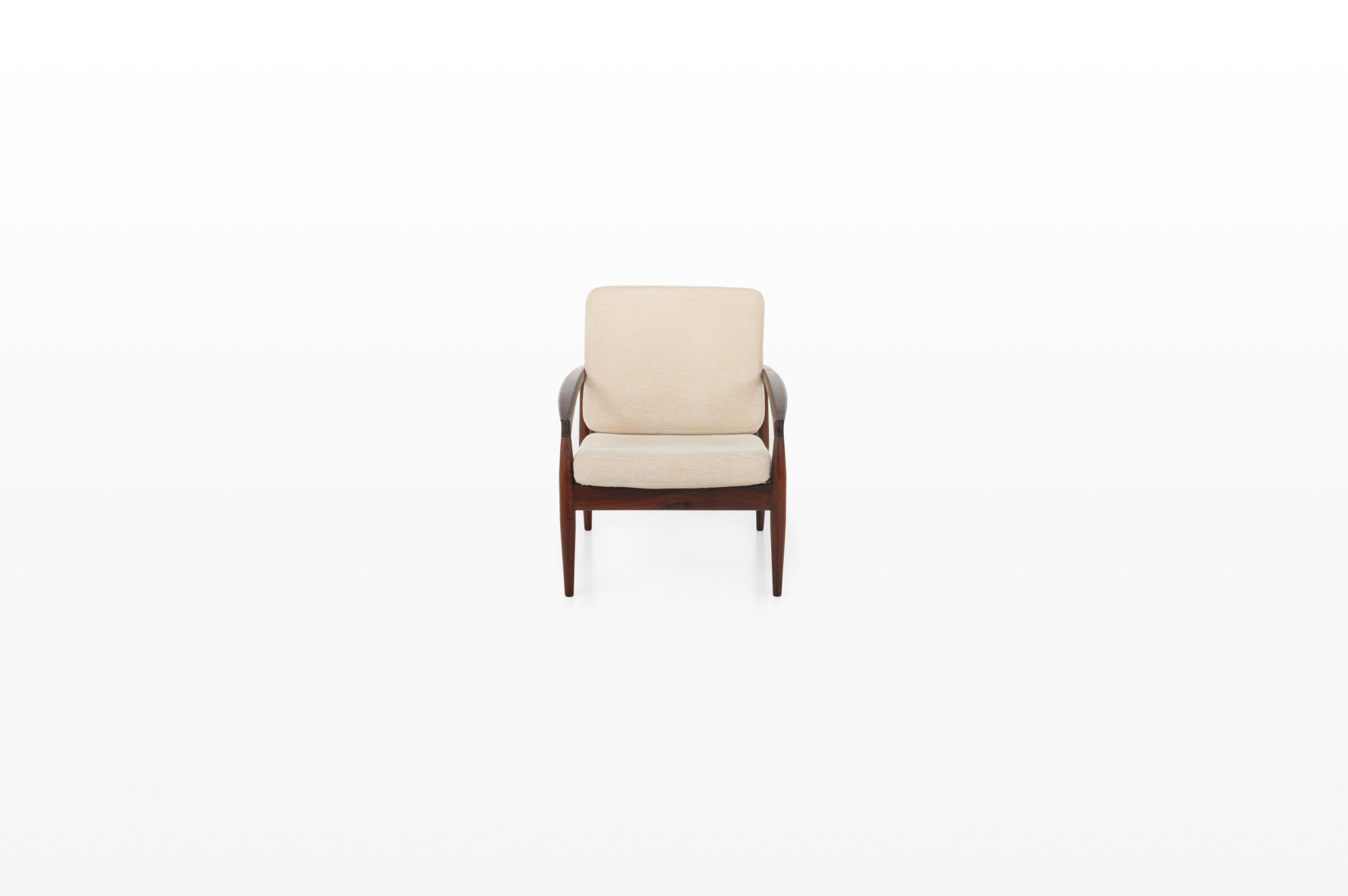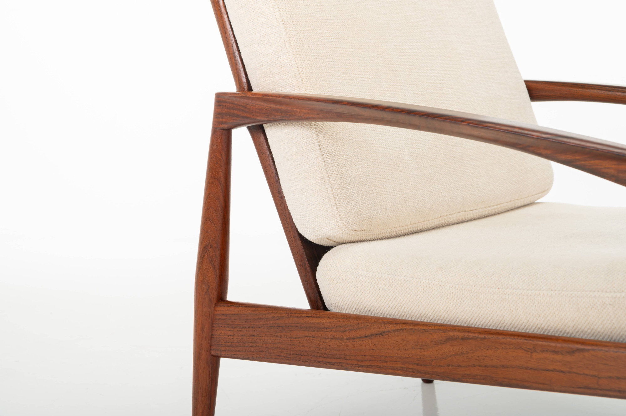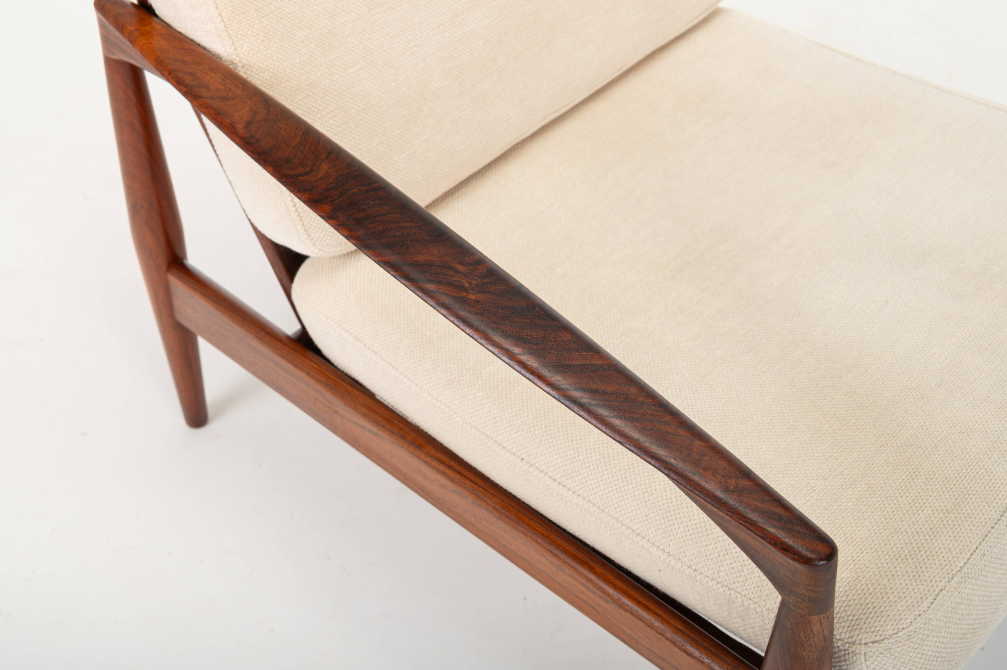 A ‘Model 121’ easy chair, designed by Kai Kristiansen in 1963 and made by Magnus Olesen in Denmark. Known as the ‘Paper Knife’ chair for its sharp-edged armrests. This easy chair is designed in 1955. It has a rosewood frame and a cream white fabric. We have a matching sofa available.