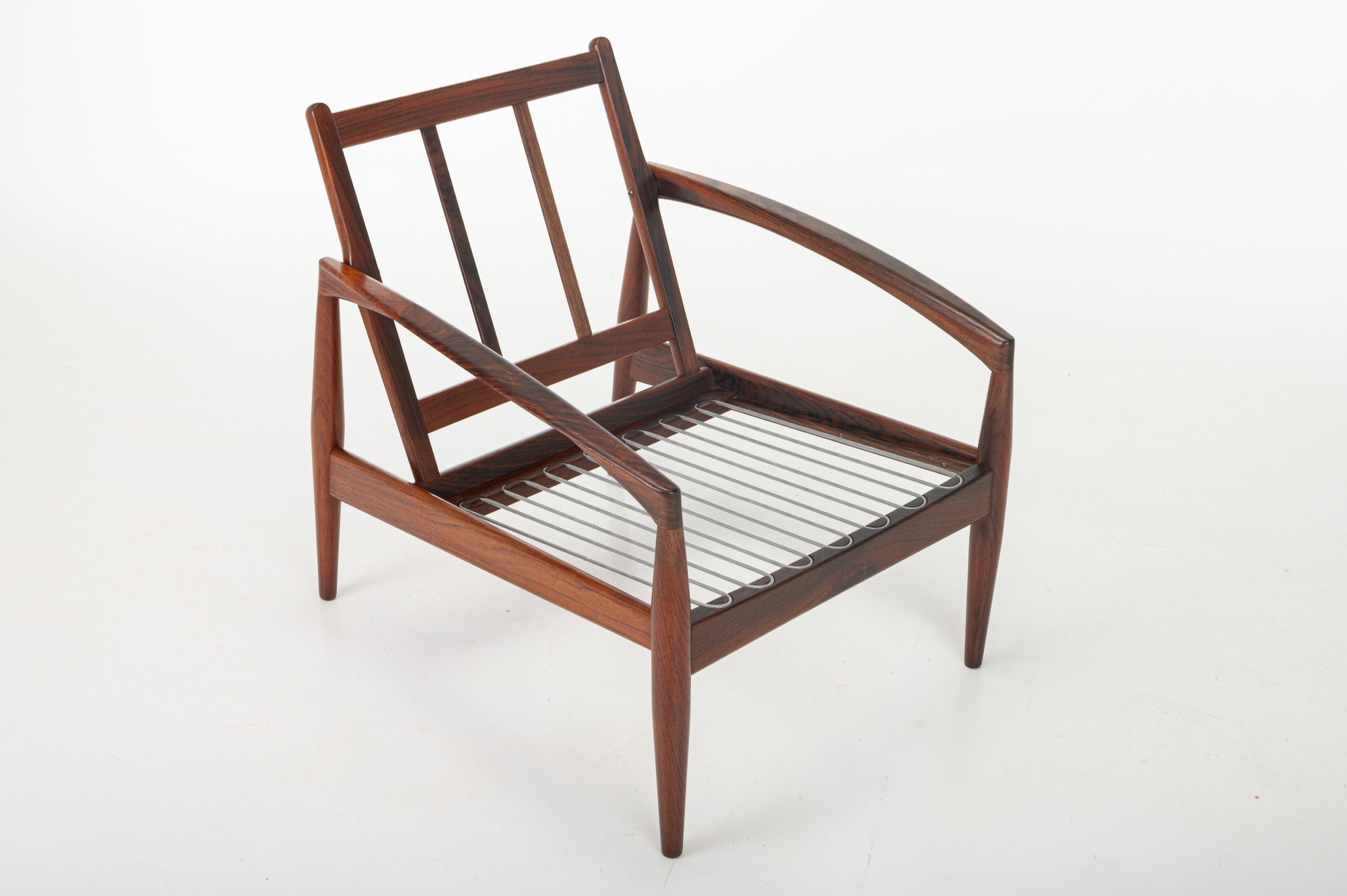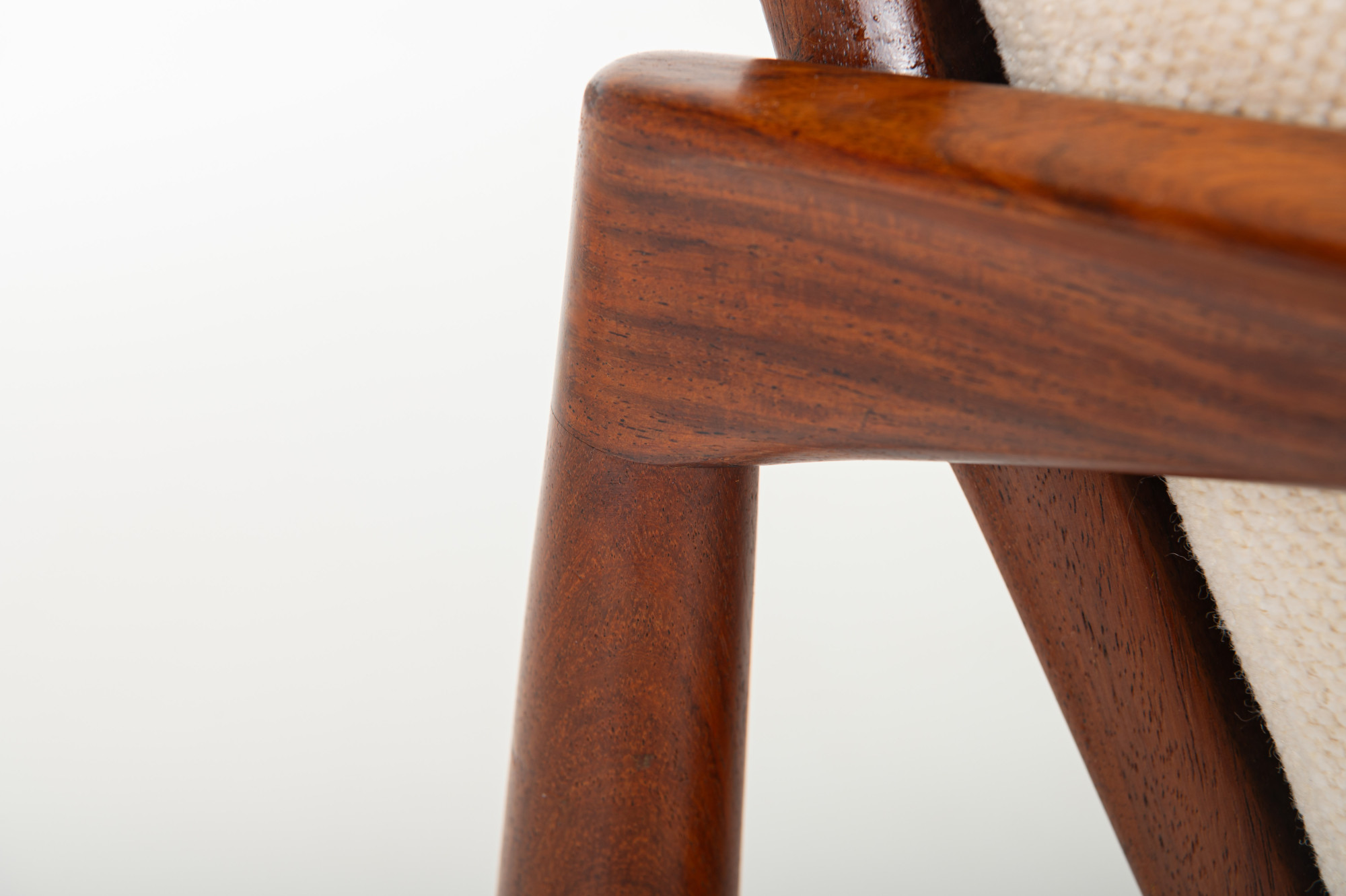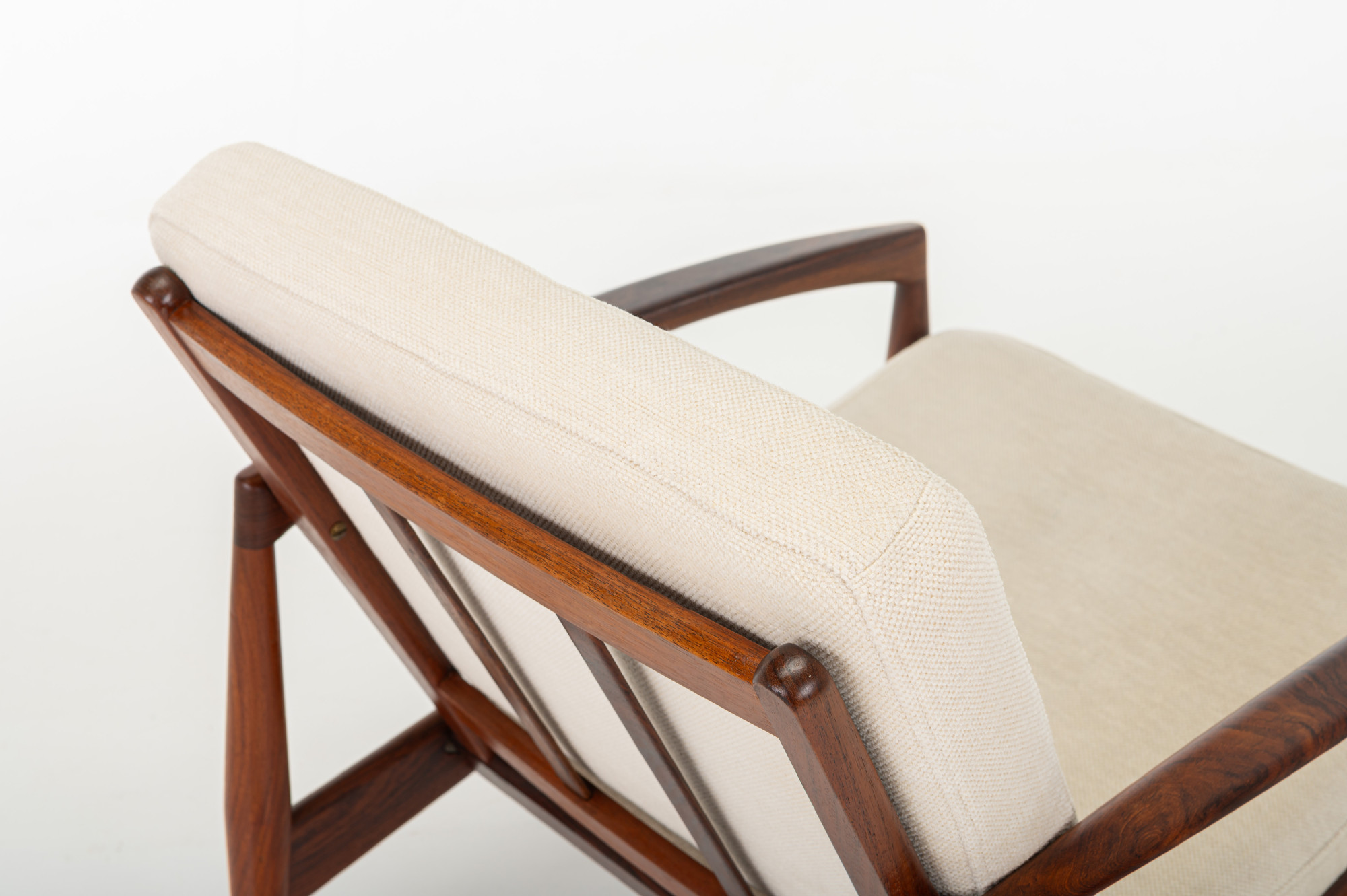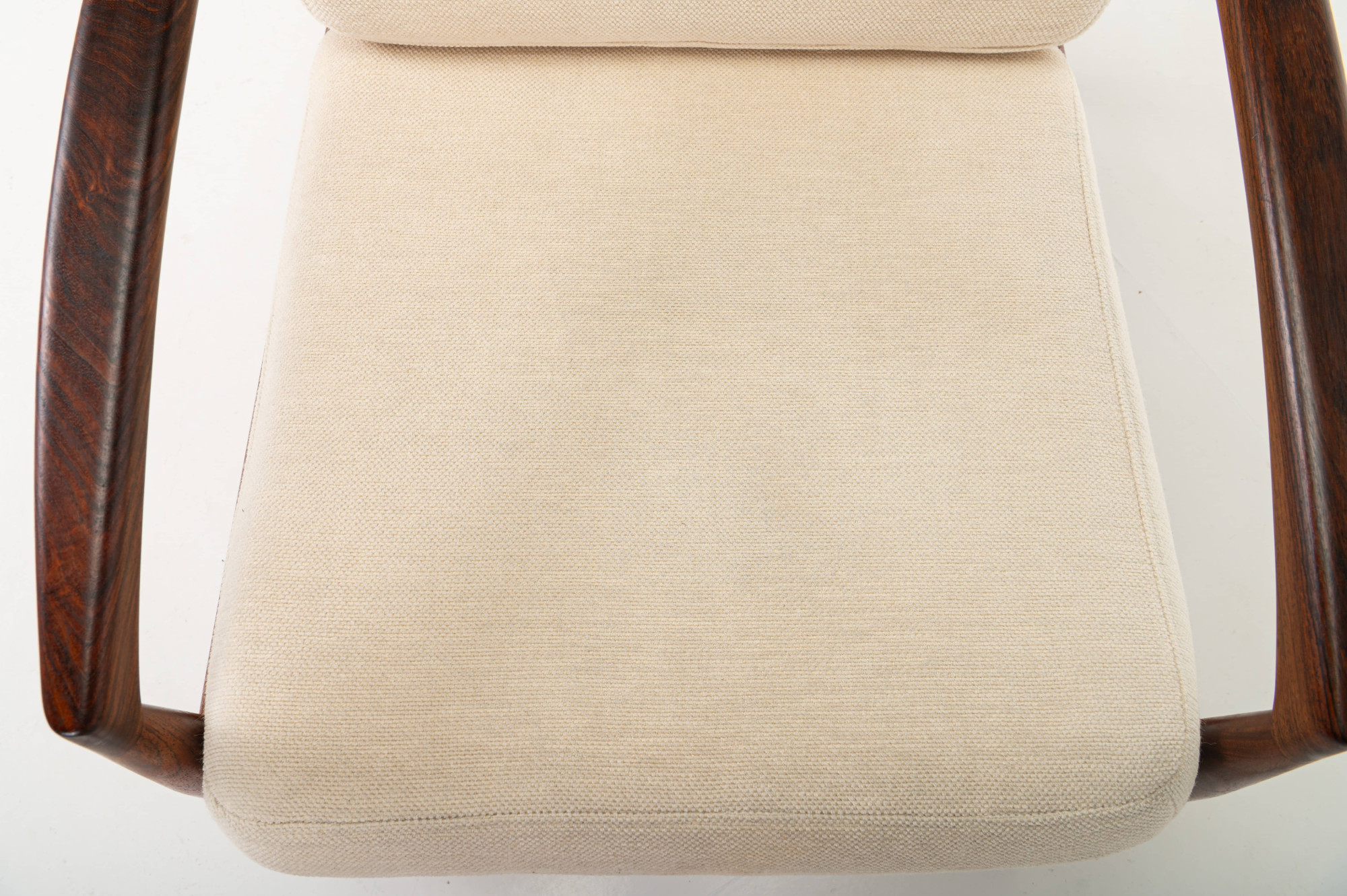 A ‘Model 121’ easy chair, designed by Kai Kristiansen in 1963 and made by Magnus Olesen in Denmark. Known as the ‘Paper Knife’ chair for its sharp-edged armrests. This easy chair is designed in 1955. It has a rosewood frame and a cream white fabric. We have a matching sofa available.